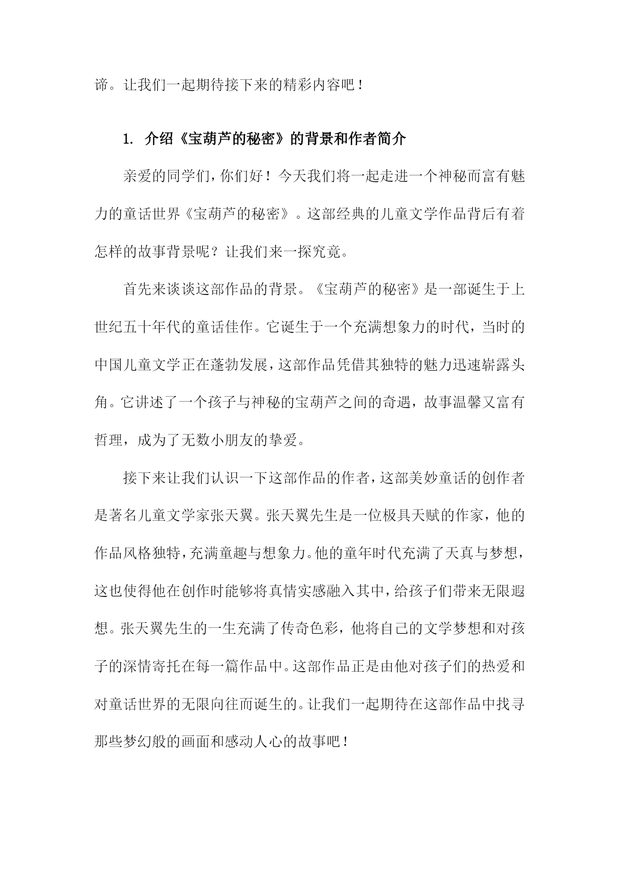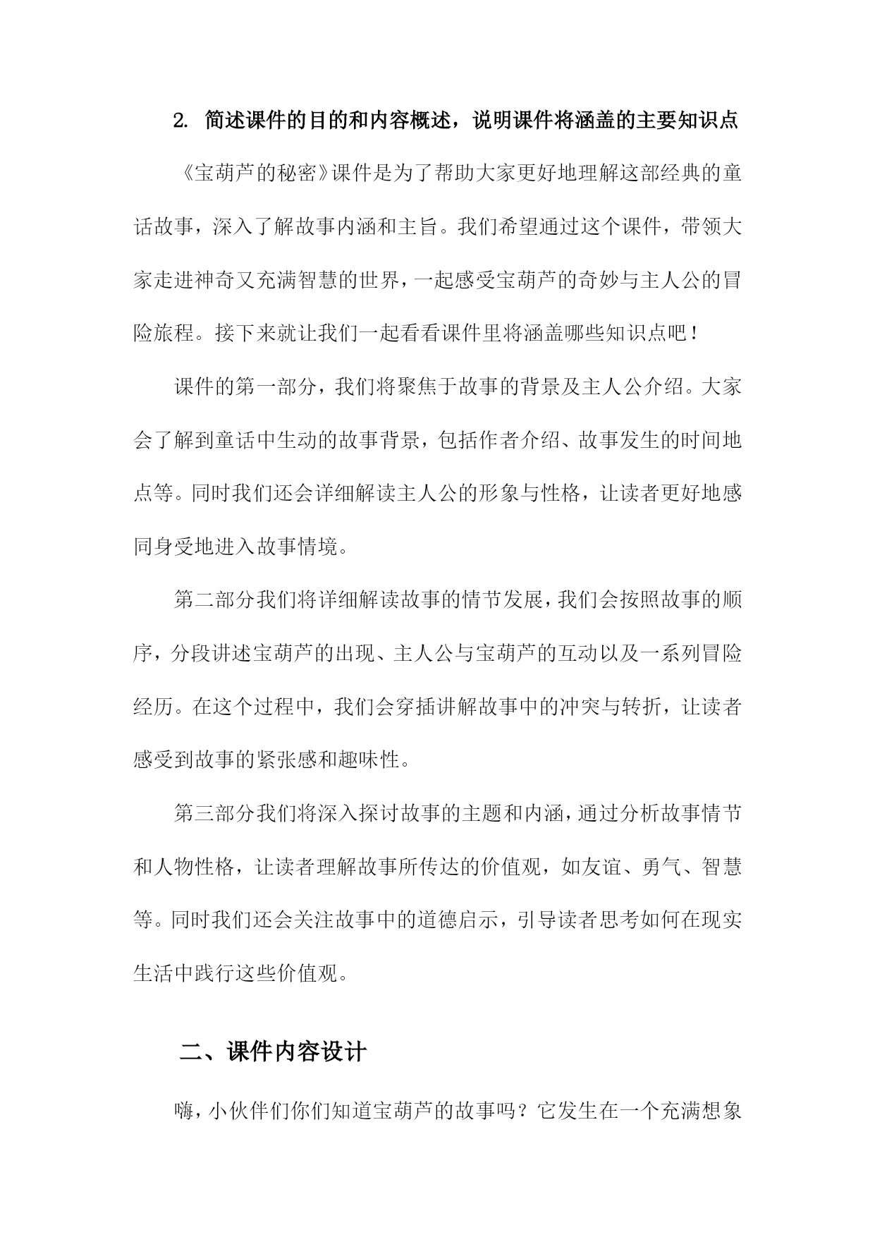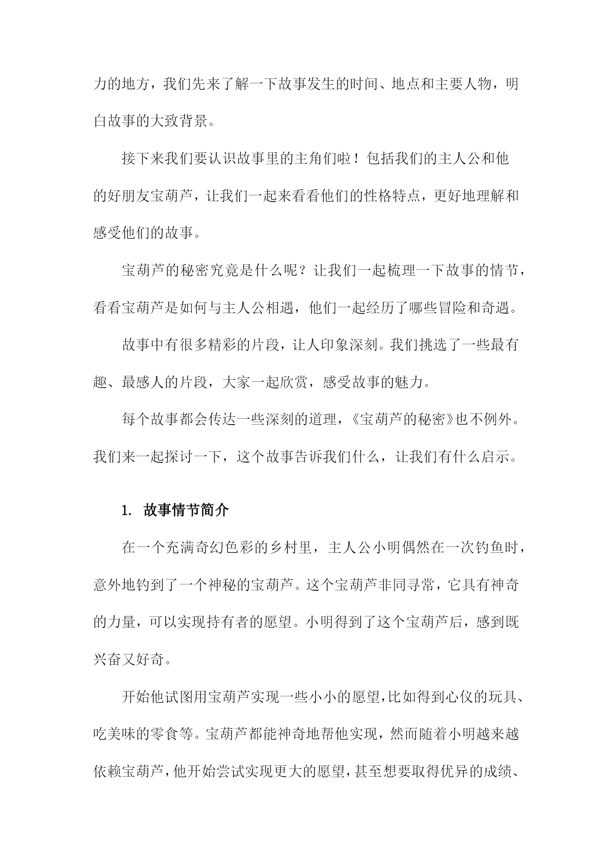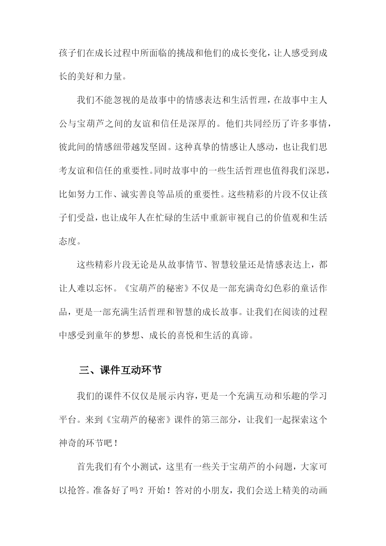 《宝葫芦的秘密》课件一、概要一提起《宝葫芦的秘密》,相信许多小伙伴都会眼前一亮,这部经典的儿童文学作品,伴随着一代又一代的孩子度过了美好的时光。今天我们就来一起回顾这部充满奇幻色彩的故事,探索它背后所隐藏的深层含义。《宝葫芦的秘密》不仅仅是一个关于神奇宝葫芦带给主人公张天翼神奇历险的故事,更是一部富含哲理的寓言。故事中的张天翼,偶然得到了一个会帮他实现愿望的宝葫芦,从此生活发生了翻天覆地的变化。但随着时间的推移,张天翼渐渐发现宝葫芦带来的并非全是惊喜和欢乐,也伴随着不少困扰和烦恼。在这个课件中,我们将带领大家走进《宝葫芦的秘密》的世界一起探寻故事中的奥秘。我们会从故事的背景、主要人物、情节发展等方面,简要介绍这部文学作品的精华所在。同时也会结合现实生活中的一些案例,引导大家思考宝葫芦背后的深层含义,以及它给我们生活带来的启示。接下来让我们一同踏上这次神秘的探索之旅吧!相信在这个旅程中,大家不仅能感受到故事的魅力,还能从中领悟到一些人生的真谛。让我们一起期待接下来的精彩内容吧!1.介绍《宝葫芦的秘密》的背景和作者简介亲爱的同学们,你们好!今天我们将一起走进一个神秘而富有魅力的童话世界《宝葫芦的秘密》。这部经典的儿童文学作品背后有着怎样的故事背景呢?让我们来一探究竟。首先来谈谈这部作品的背景。《宝葫芦的秘密》是一部诞生于上世纪五十年代的童话佳作。它诞生于一个充满想象力的时代,当时的中国儿童文学正在蓬勃发展,这部作品凭借其独特的魅力迅速崭露头角。它讲述了一个孩子与神秘的宝葫芦之间的奇遇,故事温馨又富有哲理,成为了无数小朋友的挚爱。接下来让我们认识一下这部作品的作者,这部美妙童话的创作者是著名儿童文学家张天翼。张天翼先生是一位极具天赋的作家,他的作品风格独特,充满童趣与想象力。他的童年时代充满了天真与梦想,这也使得他在创作时能够将真情实感融入其中,给孩子们带来无限遐想。张天翼先生的一生充满了传奇色彩,他将自己的文学梦想和对孩子的深情寄托在每一篇作品中。这部作品正是由他对孩子们的热爱和对童话世界的无限向往而诞生的。让我们一起期待在这部作品中找寻那些梦幻般的画面和感动人心的故事吧!2.简述课件的目的和内容概述,说明课件将涵盖的主要知识点《宝葫芦的秘密》课件是为了帮助大家更好地理解这部经典的童话故事,深入了解故事内涵和主旨。我们希望通过这个课件,带领大家走进神奇又充满智慧的世界,一起感受宝葫芦的奇妙与主人公的冒险旅程。接下来就让我们一起看看课件里将涵盖哪些知识点吧!课件的第一部分,我们将聚焦于故事的背景及主人公介绍。大家会了解到童话中生动的故事背景,包括作者介绍、故事发生的时间地点等。同时我们还会详细解读主人公的形象与性格,让读者更好地感同身受地进入故事情境。第二部分我们将详细解读故事的情节发展,我们会按照故事的顺序,分段讲述宝葫芦的出现、主人公与宝葫芦的互动以及一系列冒险经历。在这个过程中,我们会穿插讲解故事中的冲突与转折,让读者感受到故事的紧张感和趣味性。第三部分我们将深入探讨故事的主题和内涵,通过分析故事情节和人物性格,让读者理解故事所传达的价值观,如友谊、勇气、智慧等。同时我们还会关注故事中的道德启示,引导读者思考如何在现实生活中践行这些价值观。二、课件内容设计嗨,小伙伴们你们知道宝葫芦的故事吗?它发生在一个充满想象力的地方,我们先来了解一下故事发生的时间、地点和主要人物,明白故事的大致背景。接下来我们要认识故事里的主角们啦!包括我们的主人公和他的好朋友宝葫芦,让我们一起来看看他们的性格特点,更好地理解和感受他们的故事。宝葫芦的秘密究竟是什么呢?让我们一起梳理一下故事的情节,看看宝葫芦是如何与主人公相遇,他们一起经历了哪些冒险和奇遇。故事中有很多精彩的片段,让人印象深刻。我们挑选了一些最有趣、最感人的片段,大家一起欣赏,感受故事的魅力。每个故事都会传达一些深刻的道理,《宝葫芦的秘密》也不例外。我们来一起探讨一下,这个故事告诉我们什么,让我们有什么启示。1.故事情节简介在一个充满奇幻色彩的乡村里,主人公小明偶然在一次钓鱼时,意外地钓到了一个神秘的宝葫芦。这个宝葫芦非同寻常,它具有神奇的力量,可以实现持有者的愿望。小明得到了这个宝葫芦后,感到既兴奋又好奇。开始他试图用宝葫芦实现一些小小的愿望,比如得到心仪的玩具、吃美味的零食等。宝葫芦都能神奇地帮他实现,然而随着小明越来越依赖宝葫芦,他开始尝试实现更大的愿望,甚至想要取得优异的成绩、赢得比赛等。渐渐地小明发现宝葫芦虽然神奇,却并非万能。在实现愿望的过程中,他也经历了一些困扰和挫折。他意识到过度依赖宝葫芦并不能真正解决问题,反而会让自己失去努力的动力和成长的机会。于是小明开始思考如何正确使用宝葫芦的力量,以及与他人的相处之道。2.主题思想分