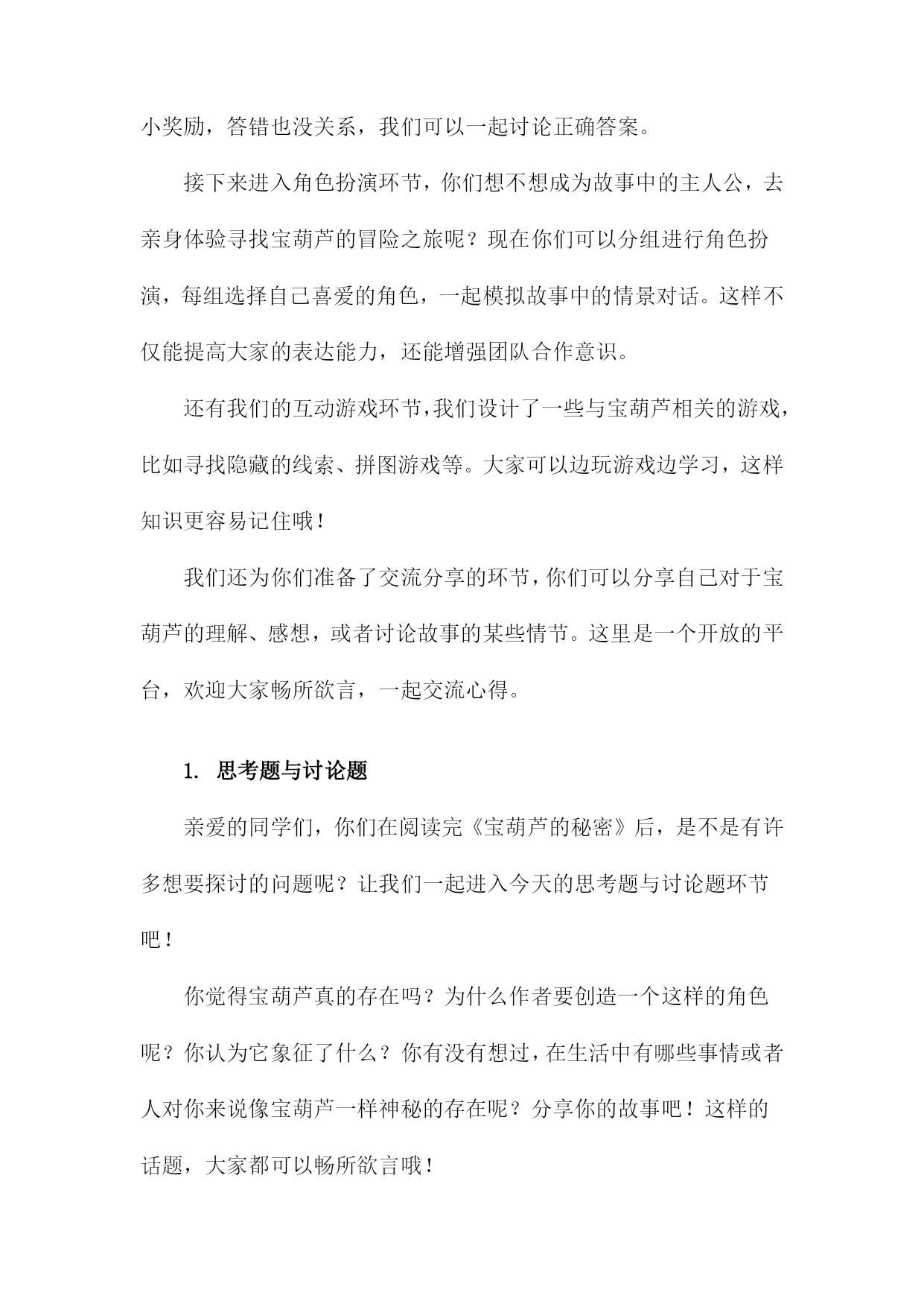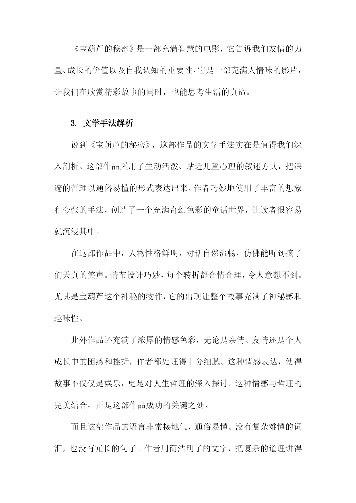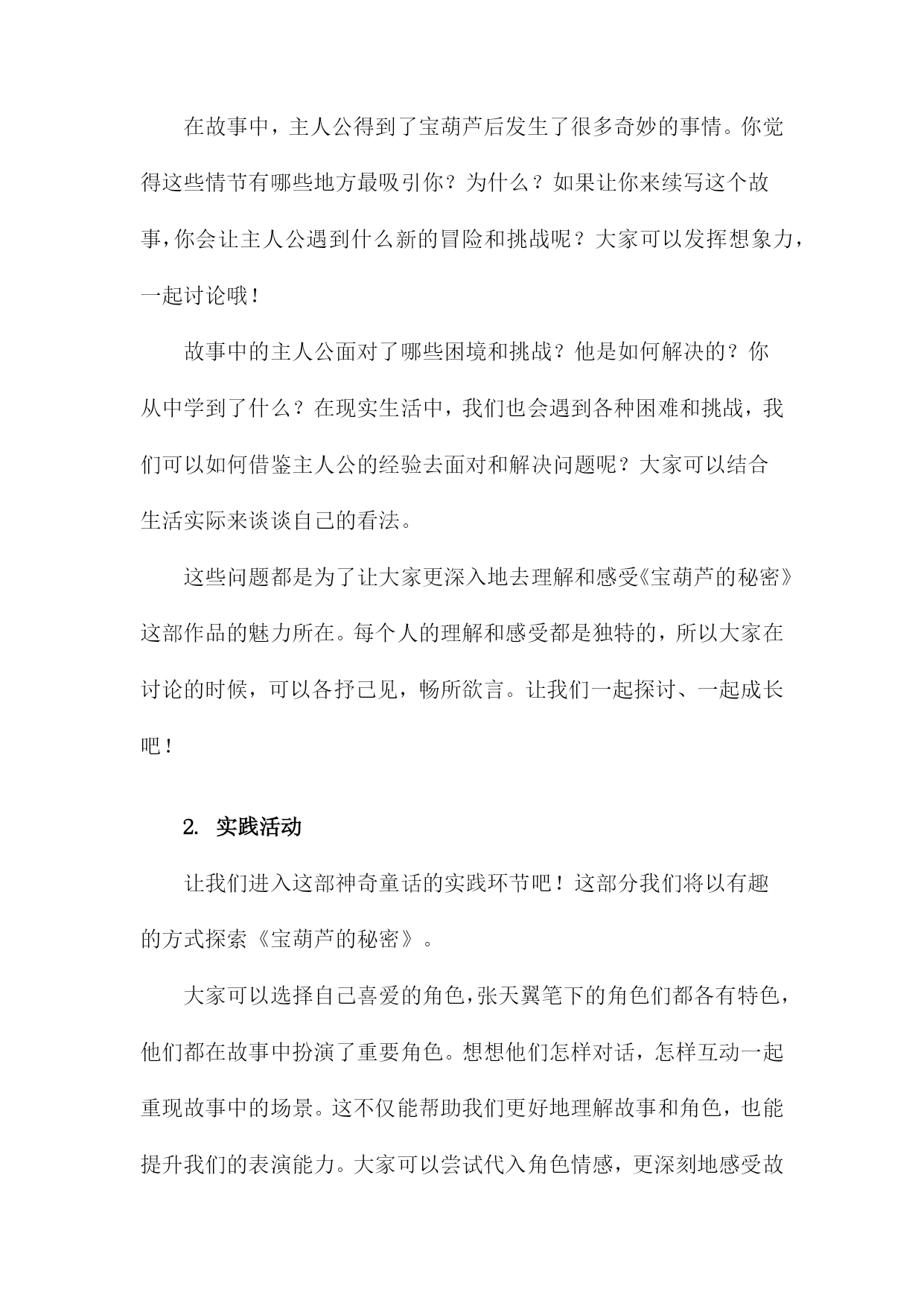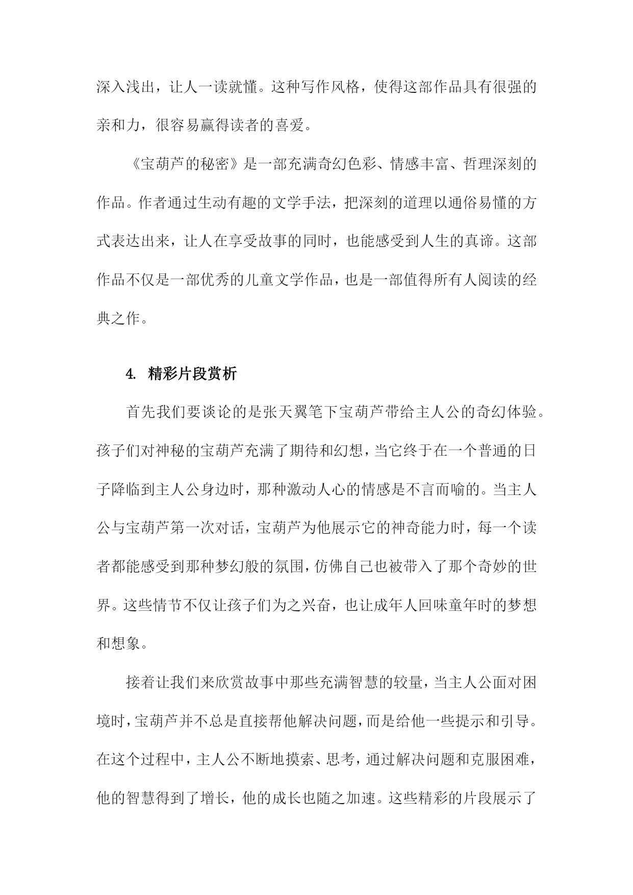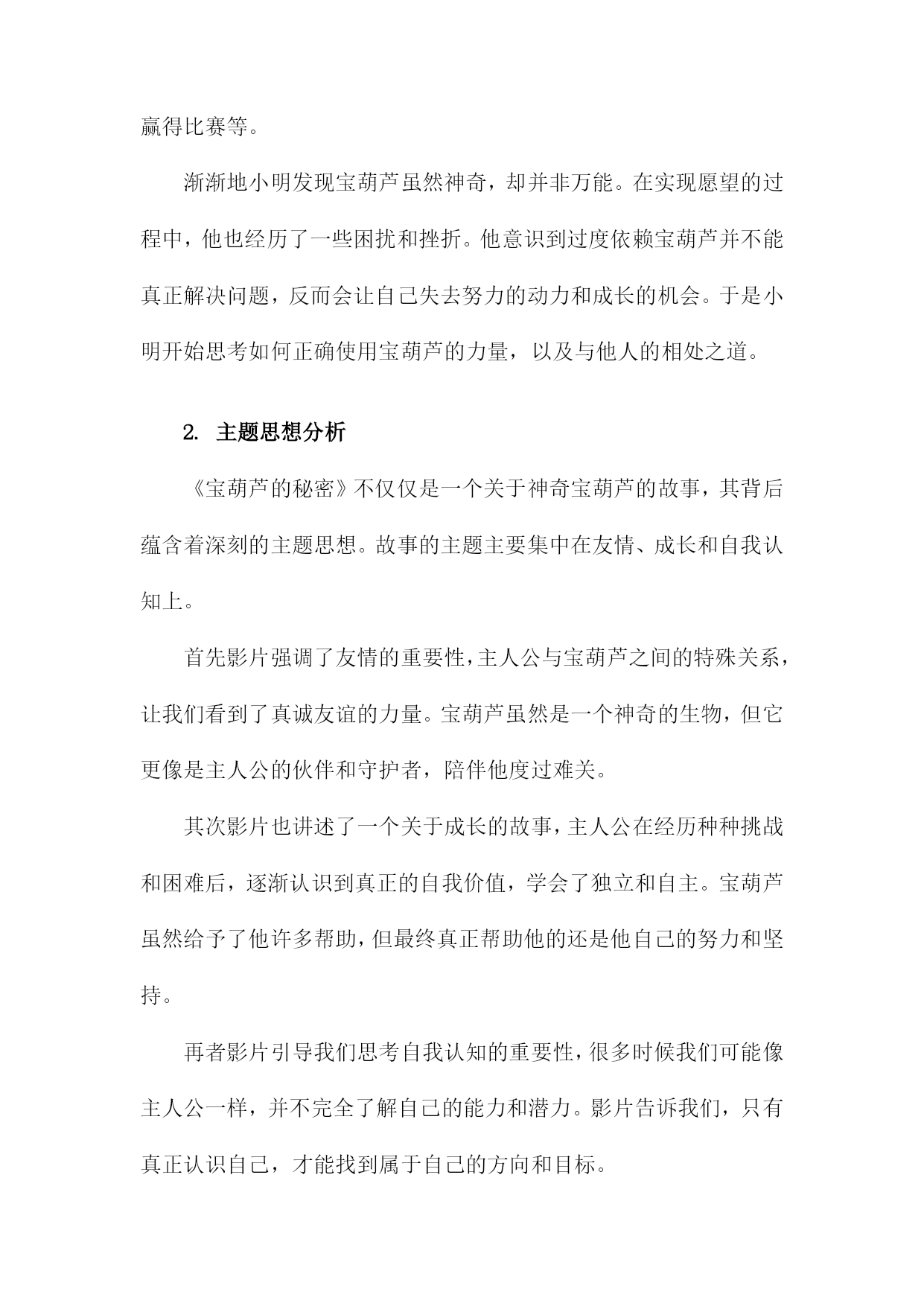 《宝葫芦的秘密》课件一、概要一提起《宝葫芦的秘密》,相信许多小伙伴都会眼前一亮,这部经典的儿童文学作品,伴随着一代又一代的孩子度过了美好的时光。今天我们就来一起回顾这部充满奇幻色彩的故事,探索它背后所隐藏的深层含义。《宝葫芦的秘密》不仅仅是一个关于神奇宝葫芦带给主人公张天翼神奇历险的故事,更是一部富含哲理的寓言。故事中的张天翼,偶然得到了一个会帮他实现愿望的宝葫芦,从此生活发生了翻天覆地的变化。但随着时间的推移,张天翼渐渐发现宝葫芦带来的并非全是惊喜和欢乐,也伴随着不少困扰和烦恼。在这个课件中,我们将带领大家走进《宝葫芦的秘密》的世界一起探寻故事中的奥秘。我们会从故事的背景、主要人物、情节发展等方面,简要介绍这部文学作品的精华所在。同时也会结合现实生活中的一些案例,引导大家思考宝葫芦背后的深层含义,以及它给我们生活带来的启示。接下来让我们一同踏上这次神秘的探索之旅吧!相信在这个旅程中,大家不仅能感受到故事的魅力,还能从中领悟到一些人生的真谛。让我们一起期待接下来的精彩内容吧!1.介绍《宝葫芦的秘密》的背景和作者简介亲爱的同学们,你们好!今天我们将一起走进一个神秘而富有魅力的童话世界《宝葫芦的秘密》。这部经典的儿童文学作品背后有着怎样的故事背景呢?让我们来一探究竟。首先来谈谈这部作品的背景。《宝葫芦的秘密》是一部诞生于上世纪五十年代的童话佳作。它诞生于一个充满想象力的时代,当时的中国儿童文学正在蓬勃发展,这部作品凭借其独特的魅力迅速崭露头角。它讲述了一个孩子与神秘的宝葫芦之间的奇遇,故事温馨又富有哲理,成为了无数小朋友的挚爱。接下来让我们认识一下这部作品的作者,这部美妙童话的创作者是著名儿童文学家张天翼。张天翼先生是一位极具天赋的作家,他的作品风格独特,充满童趣与想象力。他的童年时代充满了天真与梦想,这也使得他在创作时能够将真情实感融入其中,给孩子们带来无限遐想。张天翼先生的一生充满了传奇色彩,他将自己的文学梦想和对孩子的深情寄托在每一篇作品中。这部作品正是由他对孩子们的热爱和对童话世界的无限向往而诞生的。让我们一起期待在这部作品中找寻那些梦幻般的画面和感动人心的故事吧!2.简述课件的目的和内容概述,说明课件将涵盖的主要知识点《宝葫芦的秘密》课件是为了帮助大家更好地理解这部经典的童话故事,深入了解故事内涵和主旨。我们希望通过这个课件,带领大家走进神奇又充满智慧的世界,一起感受宝葫芦的奇妙与主人公的冒险旅程。接下来就让我们一起看看课件里将涵盖哪些知识点吧!课件的第一部分,我们将聚焦于故事的背景及主人公介绍。大家会了解到童话中生动的故事背景,包括作者介绍、故事发生的时间地点等。同时我们还会详细解读主人公的形象与性格,让读者更好地感同身受地进入故事情境。第二部分我们将详细解读故事的情节发展,我们会按照故事的顺序,分段讲述宝葫芦的出现、主人公与宝葫芦的互动以及一系列冒险经历。在这个过程中,我们会穿插讲解故事中的冲突与转折,让读者感受到故事的紧张感和趣味性。第三部分我们将深入探讨故事的主题和内涵,通过分析故事情节和人物性格,让读者理解故事所传达的价值观,如友谊、勇气、智慧等。同时我们还会关注故事中的道德启示,引导读者思考如何在现实生活中践行这些价值观。二、课件内容设计嗨,小伙伴们你们知道宝葫芦的故事吗?它发生在一个充满想象力的地方,我们先来了解一下故事发生的时间、地点和主要人物,明白故事的大致背景。接下来我们要认识故事里的主角们啦!包括我们的主人公和他的好朋友宝葫芦,让我们一起来看看他们的性格特点,更好地理解和感受他们的故事。宝葫芦的秘密究竟是什么呢?让我们一起梳理一下故事的情节,看看宝葫芦是如何与主人公相遇,他们一起经历了哪些冒险和奇遇。故事中有很多精彩的片段,让人印象深刻。我们挑选了一些最有趣、最感人的片段,大家一起欣赏,感受故事的魅力。每个故事都会传达一些深刻的道理,《宝葫芦的秘密》也不例外。我们来一起探讨一下,这个故事告诉我们什么,让我们有什么启示。1.故事情节简介在一个充满奇幻色彩的乡村里,主人公小明偶然在一次钓鱼时,意外地钓到了一个神秘的宝葫芦。这个宝葫芦非同寻常,它具有神奇的力量,可以实现持有者的愿望。小明得到了这个宝葫芦后,感到既兴奋又好奇。开始他试图用宝葫芦实现一些小小的愿望,比如得到心仪的玩具、吃美味的零食等。宝葫芦都能神奇地帮他实现,然而随着小明越来越依赖宝葫芦,他开始尝试实现更大的愿望,甚至想要取得优异的成绩、赢得比赛等。渐渐地小明发现宝葫芦虽然神奇,却并非万能。在实现愿望的过程中,他也经历了一些困扰和挫折。他意识到过度依赖宝葫芦并不能真正解决问题,反而会让自己失去努力的动力和成长的机会。于是小明开始思考如何正确使用宝葫芦的力量,以及与他人的相处之道。2.主题思想分