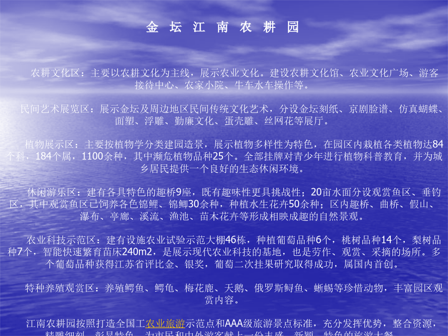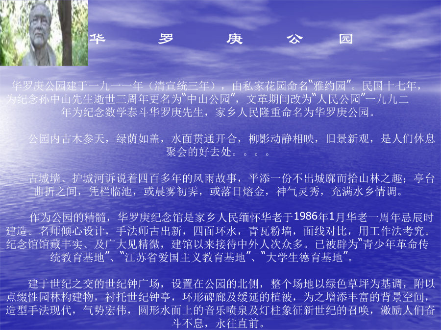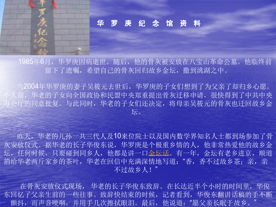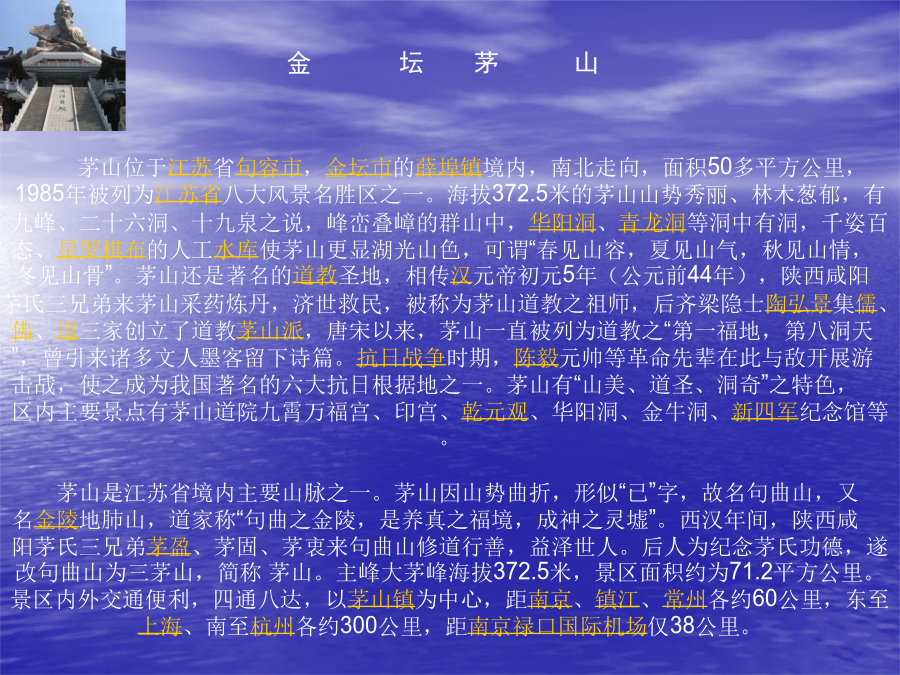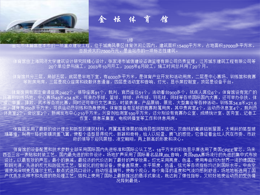 金坛的旅游业茅山位于江苏省句容市,金坛市的薛埠镇境内,南北走向,面积50多平方公里,1985年被列为江苏省八大风景名胜区之一。海拔372.5米的茅山山势秀丽、林木葱郁,有九峰、二十六洞、十九泉之说,峰峦叠嶂的群山中,华阳洞、青龙洞等洞中有洞,千姿百态、星罗棋布的人工水库使茅山更显湖光山色,可谓“春见山容,夏见山气,秋见山情,冬见山骨”。茅山还是著名的道教圣地,相传汉元帝初元5年(公元前44年),陕西咸阳茅氏三兄弟来茅山采药炼丹,济世救民,被称为茅山道教之祖师,后齐梁隐士陶弘景集儒、佛、道三家创立了道教茅山派,唐宋以来,茅山一直被列为道教之“第一福地,第八洞天”,曾引来诸多文人墨客留下诗篇。抗日战争时期,陈毅元帅等革命先辈在此与敌开展游击战,使之成为我国著名的六大抗日根据地之一。茅山有“山美、道圣、洞奇”之特色,区内主要景点有茅山道院九霄万福宫、印宫、乾元观、华阳洞、金牛洞、新四军纪念馆等。茅山是江苏省境内主要山脉之一。茅山因山势曲折,形似“已”字,故名句曲山,又名金陵地肺山,道家称“句曲之金陵,是养真之福境,成神之灵墟”。西汉年间,陕西咸阳茅氏三兄弟茅盈、茅固、茅衷来句曲山修道行善,益泽世人。后人为纪念茅氏功德,遂改句曲山为三茅山,简称茅山。主峰大茅峰海拔372.5米,景区面积约为71.2平方公里。景区内外交通便利,四通八达,以茅山镇为中心,距南京、镇江、常州各约60公里,东至上海、南至杭州各约300公里,距南京禄口国际机场仅38公里。1985年6月,华罗庚因病逝世。随后,他的骨灰被安放在八宝山革命公墓。他临终前留下了遗嘱,希望自己的骨灰回归故乡金坛,撒到洮湖之中。当2004年华罗庚的妻子吴筱元去世后,华罗庚的子女们想到了为父亲了却归乡心愿。不久前,华老的子女向全国政协和民盟中央郑重提出骨灰迁移申请,很快得到了中共中央办公厅的同意批复。与此同时,华老的子女们还决定,将母亲吴筱元的骨灰也迁回故乡金坛。昨天,华老的儿孙一共三代人及10来位院士以及国内数学界知名人士都到场参加了骨灰安放仪式。据华老的长子华俊东说,华罗庚是个极重乡情的人,他非常热爱他的故乡金坛,任何时候,只要碰到同乡人,他都是讲一口金坛话。有一年,金坛有老乡进京,顺道捎给华老两斤家乡的茶叶,华老在回信中充满深情地写道:“香,香不过故乡茶;亲,亲不过故乡人!”在骨灰安放仪式现场,华老的长子华俊东致辞。在长达近半个小时的时间里,华俊东回忆了父亲生前的一些往事。致辞快结束的时候,记者看到,华俊东翻讲话稿的手不断颤抖,而声音哽咽,并用手几次擦拭眼泪。最后,他说道:“愿父亲长眠于故乡。”1楼金坛市体育馆是本市的一项重点建设工程,位于城南风景区体育休闲公园内,建筑面积15400平方米,占地面积37000多平方米,总投资大约7500万元,是金坛市的一项标志性建筑。体育馆由上海同济大学建筑设计研究院精心设计,张家港市诚信建设咨询监理有限公司负责监理,江苏城东建筑工程有限公司等20个单位参与施工,2003年10月开工,2005年6月竣工,施工时间总共用了20个月。体育馆共分三层,局部五层,底层是半地下室,有6000多平方米,是体育产业开发和活动用房,二层是中心赛场、训练馆和竞赛等附房用房,三层是观众座席和疏散休息通道,四层是活动室和音响、灯光、显示屏控制室,顶层是设备平台。体育馆拥有固定普通座席2462个,领导座席91个,裁判、官员座位51个,活动看台900多个,残疾人席位6个。体育馆设有宽广的比赛和训练场地,中心赛场48米×34.8米,可承办手球、篮球、排球、乒乓球、羽毛球、网球等各项国际国内大赛,还可举办杂技、体操、举重、摔跤、武术等各项比赛,同时还可举行文艺演出、时装表演、产品展销、展览、大型集会等各种活动。训练馆34.8米×21.6米,健身房200多平方米,可供运动员训练和热身使用。体育馆备有足够的竞赛附属用房,其中贵宾室4个,运动员休息室4个,裁判员休息室2个,会议室2个,新闻发布中心210平方米,兴奋剂检测室100平方米,还分别设有竞赛办公室、成绩统计室、医务室、记者工作室、信息采集室、电视转播室等工作和休息用房。体育馆采用了最新的设计理念和新型的建筑材料,两翼高高伸展的独特异型网架结构,双曲线的氟碳铝板屋面,大倾斜的弧型玻璃幕墙,别具一格的索膜顶盖飞翼,使整个造型显得现代、新颖和奇特,给人以轻盈、腾飞的感觉,它像征着金坛人民在市委、市政府的领导下迎风展翅、凌空翱翔,再上新高的形象和决心。体育馆的设备配置和技术参数全部采用国际国内先进标准和国际公认工艺。18平方米的彩色显示屏选用了美国CREE管芯,马来西亚三合一表贴和封装工艺,国内最先进的软件设计。场地扩声采用了国际著名品牌JBL音响,美国NBA赛场流行的先进的集中式布放设计,以最有效的声压,最小的衰减,最经