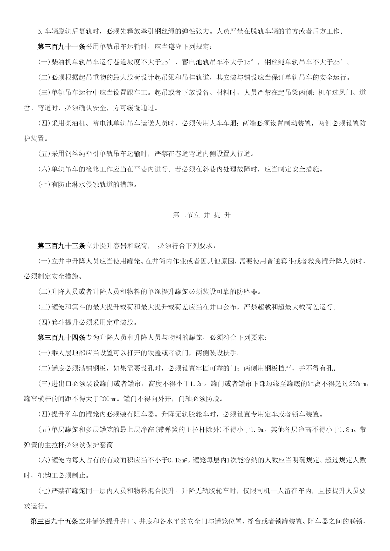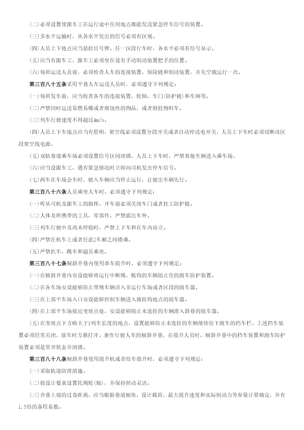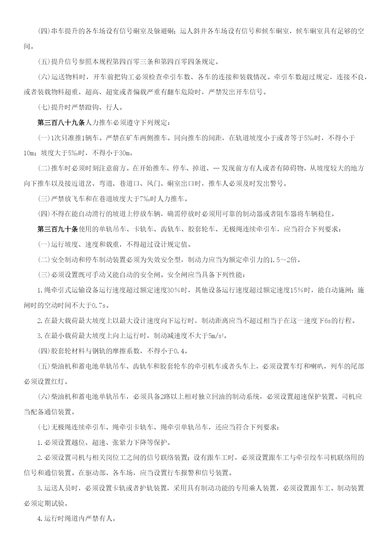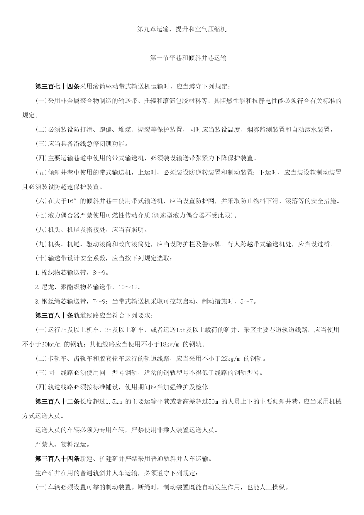 煤矿安全规程机电部分培训课件优质资料(可以直接使用,可编辑优质资料,欢迎下载)第九章运输、提升和空气压缩机第一节平巷和倾斜井巷运输第三百七十四条采用滚筒驱动带式输送机运输时,应当遵守下列规定:(一)采用非金属聚合物制造的输送带、托辊和滚筒包胶材料等,其阻燃性能和抗静电性能必须符合有关标准的规定。(二)必须装设防打滑、跑偏、堆煤、撕裂等保护装置,同时应当装设温度、烟雾监测装置和自动洒水装置。(三)应当具备沿线急停闭锁功能。(四)主要运输巷道中使用的带式输送机,必须装设输送带张紧力下降保护装置。(五)倾斜井巷中使用的带式输送机,上运时,必须装设防逆转装置和制动装置;下运时,应当装设软制动装置且必须装设防超速保护装置。(六)在大于16°的倾斜井巷中使用带式输送机,应当设置防护网,并采取防止物料下滑、滚落等的安全措施。(七)液力偶合器严禁使用可燃性传动介质(调速型液力偶合器不受此限)。(八)机头、机尾及搭接处,应当有照明。(九)机头、机尾、驱动滚筒和改向滚筒处,应当设防护栏及警示牌。行人跨越带式输送机处,应当设过桥。(十)输送带设计安全系数,应当按下列规定选取:1.棉织物芯输送带,8~9。2.尼龙、聚酯织物芯输送带,10~12。3.钢丝绳芯输送带,7~9;当带式输送机采取可控软启动、制动措施时,5~7。第三百八十条轨道线路应当符合下列要求:(一)运行7t及以上机车、3t及以上矿车,或者运送15t及以上载荷的矿井、采区主要巷道轨道线路,应当使用不小于30kg/m的钢轨;其他线路应当使用不小于18kg/m的钢轨。(二)卡轨车、齿轨车和胶套轮车运行的轨道线路,应当采用不小于22kg/m的钢轨。(三)同一线路必须使用同一型号钢轨,道岔的钢轨型号不得低于线路的钢轨型号。(四)轨道线路必须按标准铺设,使用期间应当加强维护及检修。第三百八十二条长度超过1.5km的主要运输平巷或者高差超过50m的人员上下的主要倾斜井巷,应当采用机械方式运送人员。运送人员的车辆必须为专用车辆,严禁使用非乘人装置运送人员。严禁人、物料混运。第三百八十四条新建、扩建矿井严禁采用普通轨斜井人车运输。生产矿井在用的普通轨斜井人车运输,必须遵守下列规定:(一)车辆必须设置可靠的制动装置。断绳时,制动装置既能自动发生作用,也能人工操纵。(二)必须设置使跟车工在运行途中任何地点都能发送紧急停车信号的装置。(三)多水平运输时,从各水平发出的信号必须有区别。(四)人员上下地点应当悬挂信号牌。任一区段行车时,各水平必须有信号显示。(五)应当有跟车工,跟车工必须坐在设有手动制动装置把手的位置。(六)每班运送人员前,必须检查人车的连接装置、保险链和制动装置,并先空载运行一次。第三百八十五条采用平巷人车运送人员时,必须遵守下列规定:(一)每班发车前,应当检查各车的连接装置、轮轴、车门(防护链)和车闸等。(二)严禁同时运送易燃易爆或者腐蚀性的物品,或者附挂物料车。(三)列车行驶速度不得超过4m/s。(四)人员上下车地点应当有照明,架空线必须设置分段开关或者自动停送电开关,人员上下车时必须切断该区段架空线电源。(五)双轨巷道乘车场必须设置信号区间闭锁,人员上下车时,严禁其他车辆进入乘车场。(六)应当设跟车工,遇有紧急情况时立即向司机发出停车信号。(七)两车在车场会车时,驶入车辆应当停止运行,让驶出车辆先行。第三百八十六条人员乘坐人车时,必须遵守下列规定:(一)听从司机及跟车工的指挥,开车前必须关闭车门或者挂上防护链。(二)人体及所携带的工具、零部件,严禁露出车外。(三)列车行驶中及尚未停稳时,严禁上下车和在车内站立。(四)严禁在机车上或者任意2车厢之间搭乘。(五)严禁扒车、跳车和超员乘坐。第三百八十七条倾斜井巷内使用串车提升时,必须遵守下列规定:(一)在倾斜井巷内安设能够将运行中断绳、脱钩的车辆阻止住的跑车防护装置。(二)在各车场安设能够防止带绳车辆误入非运行车场或者区段的阻车器。(三)在上部平车场入口安设能够控制车辆进入摘挂钩地点的阻车器。(四)在上部平车场接近变坡点处,安设能够阻止未连挂的车辆滑入斜巷的阻车器。(五)在变坡点下方略大于1列车长度的地点,设置能够防止未连挂的车辆继续往下跑车的挡车栏。上述挡车装置必须经常关闭,放车时方准打开。兼作行驶人车的倾斜井巷,在提升人员时,倾斜井巷中的挡车装置和跑车防护装置必须是常开状态并闭锁。第三百八十八条倾斜井巷使用提升机或者绞车提升时,必须遵守下列规定:(一)采取轨道防滑措施。(二)按设计要求设置托绳轮(辊),并保持转动灵活。(三)井巷上端的过卷距离,应当根据巷道倾角、设计载荷、最大提升速度和实际制动力等参量计算确定,并有1.5倍的备用