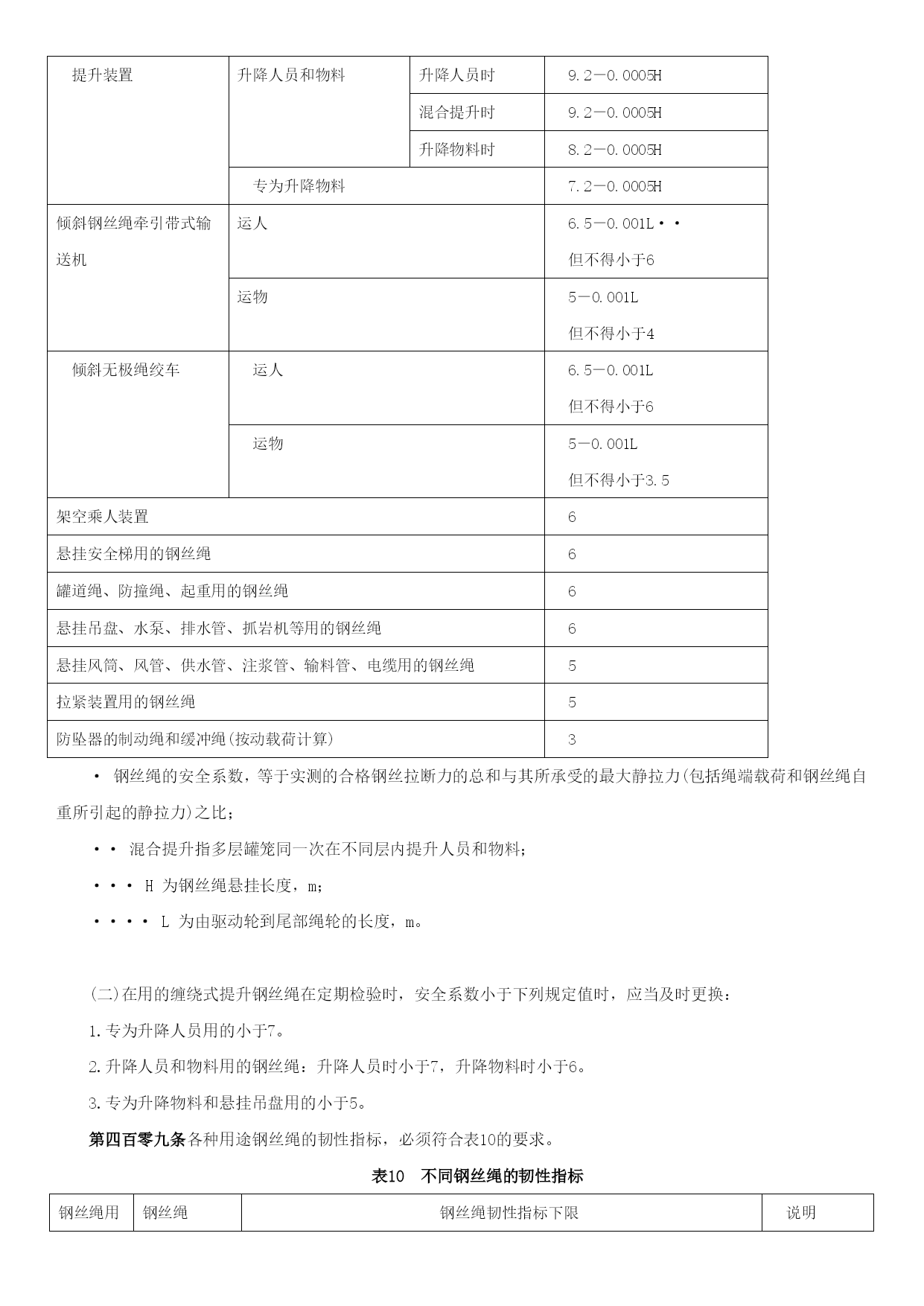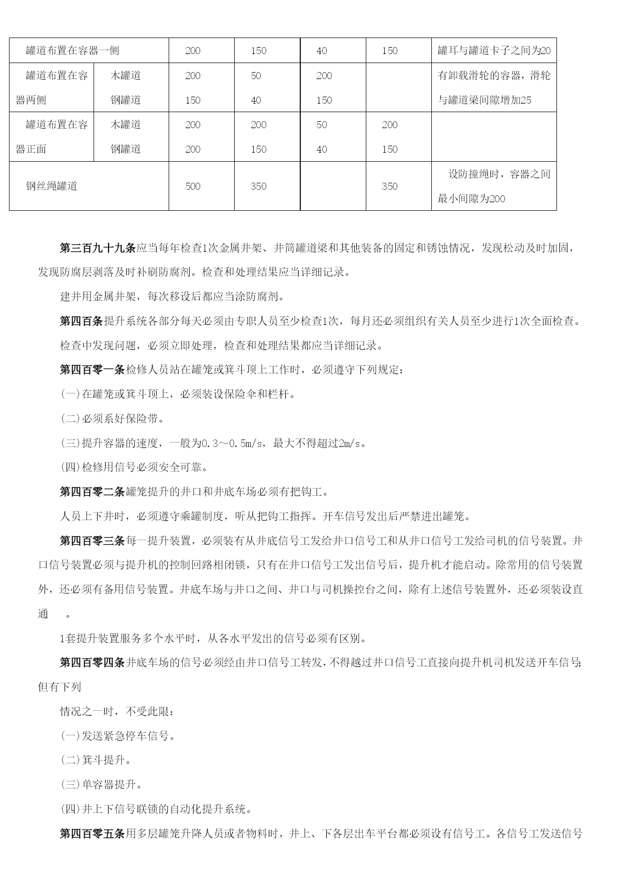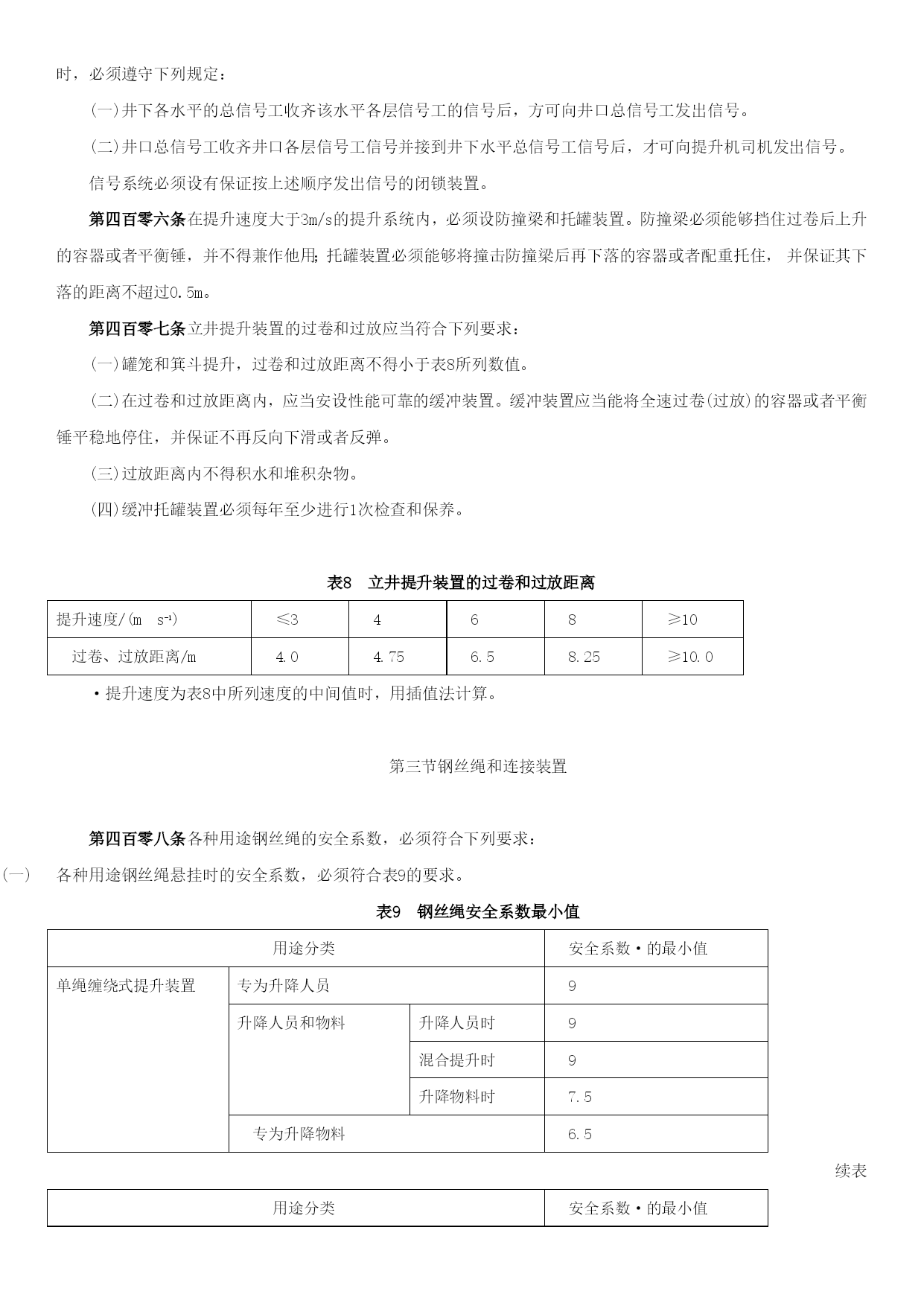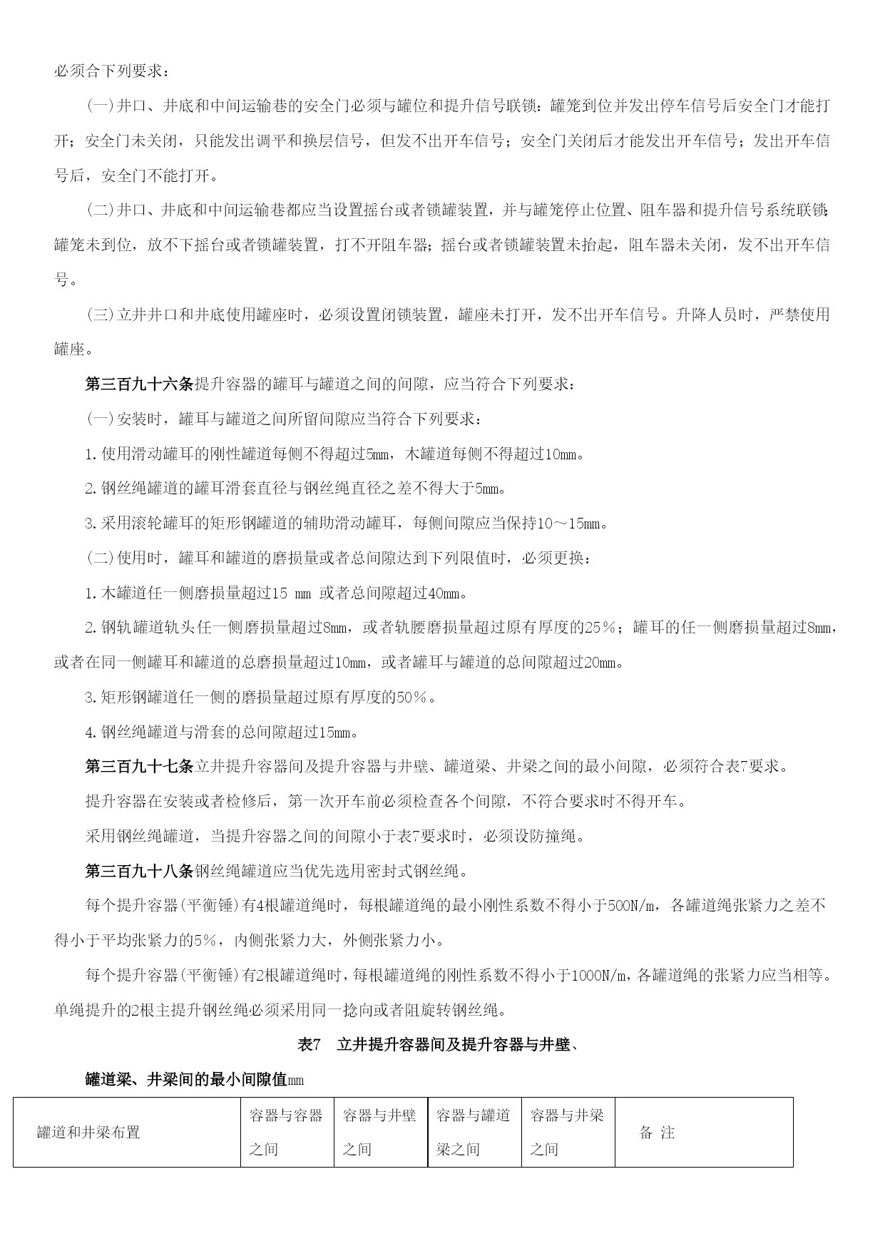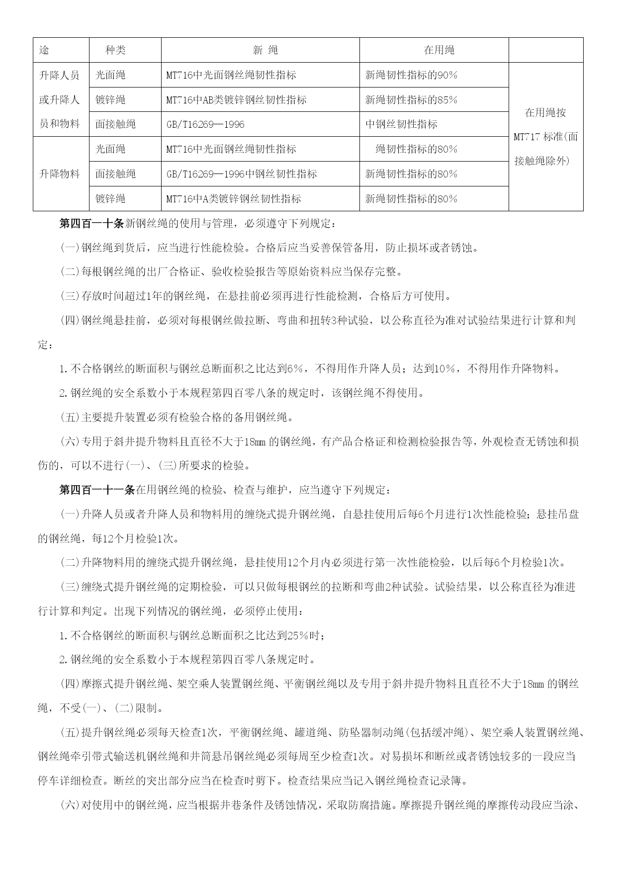 煤矿安全规程机电部分培训课件优质资料(可以直接使用,可编辑优质资料,欢迎下载)第九章运输、提升和空气压缩机第一节平巷和倾斜井巷运输第三百七十四条采用滚筒驱动带式输送机运输时,应当遵守下列规定:(一)采用非金属聚合物制造的输送带、托辊和滚筒包胶材料等,其阻燃性能和抗静电性能必须符合有关标准的规定。(二)必须装设防打滑、跑偏、堆煤、撕裂等保护装置,同时应当装设温度、烟雾监测装置和自动洒水装置。(三)应当具备沿线急停闭锁功能。(四)主要运输巷道中使用的带式输送机,必须装设输送带张紧力下降保护装置。(五)倾斜井巷中使用的带式输送机,上运时,必须装设防逆转装置和制动装置;下运时,应当装设软制动装置且必须装设防超速保护装置。(六)在大于16°的倾斜井巷中使用带式输送机,应当设置防护网,并采取防止物料下滑、滚落等的安全措施。(七)液力偶合器严禁使用可燃性传动介质(调速型液力偶合器不受此限)。(八)机头、机尾及搭接处,应当有照明。(九)机头、机尾、驱动滚筒和改向滚筒处,应当设防护栏及警示牌。行人跨越带式输送机处,应当设过桥。(十)输送带设计安全系数,应当按下列规定选取:1.棉织物芯输送带,8~9。2.尼龙、聚酯织物芯输送带,10~12。3.钢丝绳芯输送带,7~9;当带式输送机采取可控软启动、制动措施时,5~7。第三百八十条轨道线路应当符合下列要求:(一)运行7t及以上机车、3t及以上矿车,或者运送15t及以上载荷的矿井、采区主要巷道轨道线路,应当使用不小于30kg/m的钢轨;其他线路应当使用不小于18kg/m的钢轨。(二)卡轨车、齿轨车和胶套轮车运行的轨道线路,应当采用不小于22kg/m的钢轨。(三)同一线路必须使用同一型号钢轨,道岔的钢轨型号不得低于线路的钢轨型号。(四)轨道线路必须按标准铺设,使用期间应当加强维护及检修。第三百八十二条长度超过1.5km的主要运输平巷或者高差超过50m的人员上下的主要倾斜井巷,应当采用机械方式运送人员。运送人员的车辆必须为专用车辆,严禁使用非乘人装置运送人员。严禁人、物料混运。第三百八十四条新建、扩建矿井严禁采用普通轨斜井人车运输。生产矿井在用的普通轨斜井人车运输,必须遵守下列规定:(一)车辆必须设置可靠的制动装置。断绳时,制动装置既能自动发生作用,也能人工操纵。(二)必须设置使跟车工在运行途中任何地点都能发送紧急停车信号的装置。(三)多水平运输时,从各水平发出的信号必须有区别。(四)人员上下地点应当悬挂信号牌。任一区段行车时,各水平必须有信号显示。(五)应当有跟车工,跟车工必须坐在设有手动制动装置把手的位置。(六)每班运送人员前,必须检查人车的连接装置、保险链和制动装置,并先空载运行一次。第三百八十五条采用平巷人车运送人员时,必须遵守下列规定:(一)每班发车前,应当检查各车的连接装置、轮轴、车门(防护链)和车闸等。(二)严禁同时运送易燃易爆或者腐蚀性的物品,或者附挂物料车。(三)列车行驶速度不得超过4m/s。(四)人员上下车地点应当有照明,架空线必须设置分段开关或者自动停送电开关,人员上下车时必须切断该区段架空线电源。(五)双轨巷道乘车场必须设置信号区间闭锁,人员上下车时,严禁其他车辆进入乘车场。(六)应当设跟车工,遇有紧急情况时立即向司机发出停车信号。(七)两车在车场会车时,驶入车辆应当停止运行,让驶出车辆先行。第三百八十六条人员乘坐人车时,必须遵守下列规定:(一)听从司机及跟车工的指挥,开车前必须关闭车门或者挂上防护链。(二)人体及所携带的工具、零部件,严禁露出车外。(三)列车行驶中及尚未停稳时,严禁上下车和在车内站立。(四)严禁在机车上或者任意2车厢之间搭乘。(五)严禁扒车、跳车和超员乘坐。第三百八十七条倾斜井巷内使用串车提升时,必须遵守下列规定:(一)在倾斜井巷内安设能够将运行中断绳、脱钩的车辆阻止住的跑车防护装置。(二)在各车场安设能够防止带绳车辆误入非运行车场或者区段的阻车器。(三)在上部平车场入口安设能够控制车辆进入摘挂钩地点的阻车器。(四)在上部平车场接近变坡点处,安设能够阻止未连挂的车辆滑入斜巷的阻车器。(五)在变坡点下方略大于1列车长度的地点,设置能够防止未连挂的车辆继续往下跑车的挡车栏。上述挡车装置必须经常关闭,放车时方准打开。兼作行驶人车的倾斜井巷,在提升人员时,倾斜井巷中的挡车装置和跑车防护装置必须是常开状态并闭锁。第三百八十八条倾斜井巷使用提升机或者绞车提升时,必须遵守下列规定:(一)采取轨道防滑措施。(二)按设计要求设置托绳轮(辊),并保持转动灵活。(三)井巷上端的过卷距离,应当根据巷道倾角、设计载荷、最大提升速度和实际制动力等参量计算确定,并有1.5倍的备用