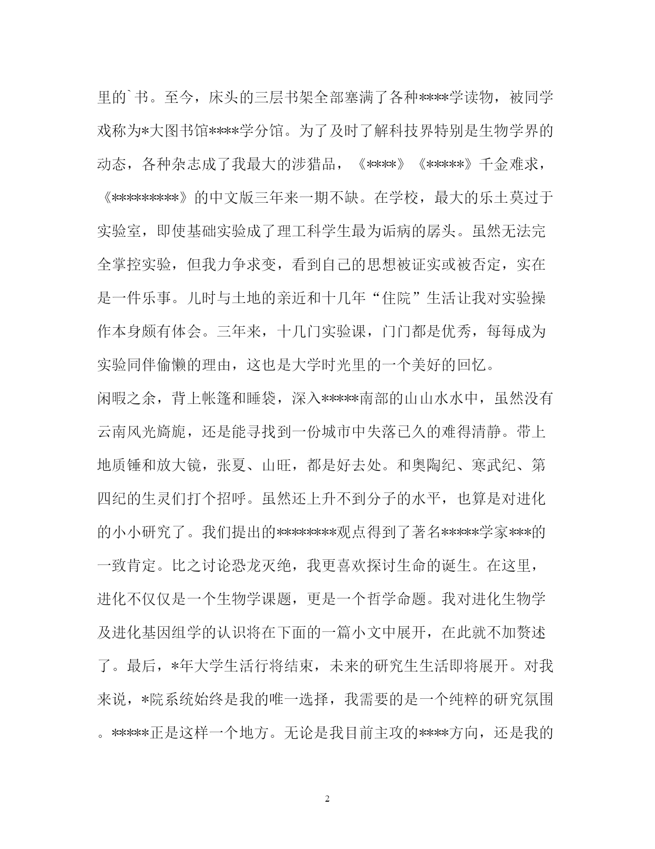 此资料由网络收集而来,如有侵权请告知上传者立即删除。资料共分享,我们负责传递知识。PAGEPAGE3生命科学研究生自我介绍生命科学研究生自我介绍**,出生于19**年*月**日**省**县。自小我与土地亲近,与自然感情之久不需置疑。与****学结缘始于母亲的《*****》和父亲的《*****》。我接受了正规的十二年中国基础教育,十二年寒窗乏善可陈。曾*次参加中学*竞赛,分别取得*奖和*奖。高中三年,平心而论只拼了半年,用减肥八千克换了一张*总分的高考成绩单。怀着对****学的一腔热情,力排众议报考了**大学生命科学学院,并被录取。进入大学,发现理想中之自由开放的象牙塔仍遥不可及,但对我来说已经是“如鳅得泥”。虽然与中学相比,课程的负担不止增加了倍余,但我更喜欢这种忙碌。基础课的教学,应该不能算得上理想,我想这是多数大学的通病。不过,课程本身的吸引力,远远大于我对教学方式的不满。虽然没有在拿到全部的优秀,但也算是顺利通过。英语拿下*级,也似小马过河,不是一件异常恐怖的事情。在顺利完成学习任务之余,课外阅读成了我的最大爱好,三年间省下了别人喝咖啡的钱全部买了书。*年北京,*年上海,每次都把钱包里的钱换成了更加充实的书包里的`书。至今,床头的三层书架全部塞满了各种****学读物,被同学戏称为*大图书馆****学分馆。为了及时了解科技界特别是生物学界的动态,各种杂志成了我最大的涉猎品,《****》《*****》千金难求,《*********》的中文版三年来一期不缺。在学校,最大的乐土莫过于实验室,即使基础实验成了理工科学生最为诟病的孱头。虽然无法完全掌控实验,但我力争求变,看到自己的思想被证实或被否定,实在是一件乐事。儿时与土地的亲近和十几年“住院”生活让我对实验操作本身颇有体会。三年来,十几门实验课,门门都是优秀,每每成为实验同伴偷懒的理由,这也是大学时光里的一个美好的回忆。闲暇之余,背上帐篷和睡袋,深入*****南部的山山水水中,虽然没有云南风光旖旎,还是能寻找到一份城市中失落已久的难得清静。带上地质锤和放大镜,张夏、山旺,都是好去处。和奥陶纪、寒武纪、第四纪的生灵们打个招呼。虽然还上升不到分子的水平,也算是对进化的小小研究了。我们提出的********观点得到了著名*****学家***的一致肯定。比之讨论恐龙灭绝,我更喜欢探讨生命的诞生。在这里,进化不仅仅是一个生物学课题,更是一个哲学命题。我对进化生物学及进化基因组学的认识将在下面的一篇小文中展开,在此就不加赘述了。最后,*年大学生活行将结束,未来的研究生生活即将展开。对我来说,*院系统始终是我的唯一选择,我需要的是一个纯粹的研究氛围。*****正是这样一个地方。无论是我目前主攻的****方向,还是我的兴趣所在-******,*****都有国内顶尖的教授和实验条件。倘若能有幸成为*****的一员,在如此优秀的研究条件下工作,还有什么能说的呢?推荐你使用百度搜索内容