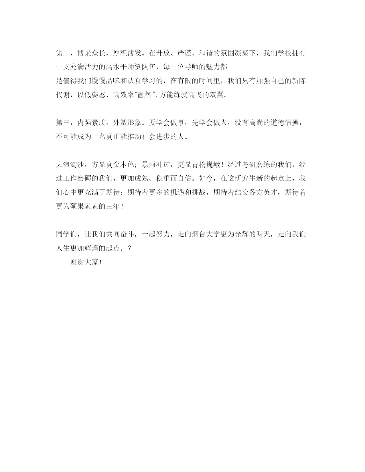 此资料由网络收集而来,如有侵权请告知上传者立即删除。资料共分享,我们负责传递知识。开学典礼学院研究生代表发言稿尊敬的各位领导、老师、亲爱的同学们:大家上午好!我是来自计算机技术的研究生王中元,很高兴今天能够站在这里代表新生发言。我毕业于山东师范大学,信息与计算科学专业,因为憧憬烟台大学机控学院的师资力量所以来到了这里。能和大家一起在未来的三年里共同见证烟台大学这所学府的厚重与蓬勃,我感到十分荣幸。首先,请允许我代表2020级研究生向各位老师致以崇高的敬意和诚挚的感谢!一份录取通知书,承载了太久的向往与期盼,承载了太多的努力与汗水,更承载了太多人的殷切希望。今天,一切都不再是梦想。很高兴能够与各位相聚在烟台大学,一同来放飞新一段旅程的梦想。我们要把一颗颗梦想和希望的种子深埋在这块沃土之中。作为一名研究生,我们不仅要扩充自己的知识、提高自己的素质、实现自己的人生价值,更要努力培养自己的创新精神和科学观念,立足学科前沿,解放思想,积极探索,用我们的智慧,用我们的双手在实践中铸就明天的辉煌!此时此刻,站在新的起点上,我常常问自己:"路是选好了,如何走下去才能无悔当初呢?"面对更高的平台,我们必须再接再厉。在接下来的三年研究生生活中,我们需要做到:第一,明确目标,学会学习。硕士阶段是要对自己有更高要求的学习过程,这种定位要求我们树立明确的专业目标,不仅要掌握好自己的专业知识,更要掌握求取知识的方法。第二,博采众长,厚积薄发。在开放、严谨、和谐的氛围凝聚下,我们学校拥有一支充满活力的高水平师资队伍,每一位导师的魅力都是值得我们慢慢品味和认真学习的,在有限的时间里,我们只有加强自己的新陈代谢,以低姿态、高效率"融智",方能练就高飞的双翼。第三,内强素质,外塑形象。要学会做事,先学会做人,没有高尚的道德情操,不可能成为一名真正能推动社会进步的人。大浪淘沙,方显真金本色;暴雨冲过,更显青松巍峨!经过考研磨练的我们,经过工作磨砺的我们,更加成熟、稳重而自信。如今,在这研究生新的起点上,我们心中更充满了期待:期待着更多的机遇和挑战,期待着结交各方英才,期待着更为硕果累累的三年!同学们,让我们共同奋斗,一起努力,走向烟台大学更为光辉的明天,走向我们人生更加辉煌的起点。?谢谢大家!