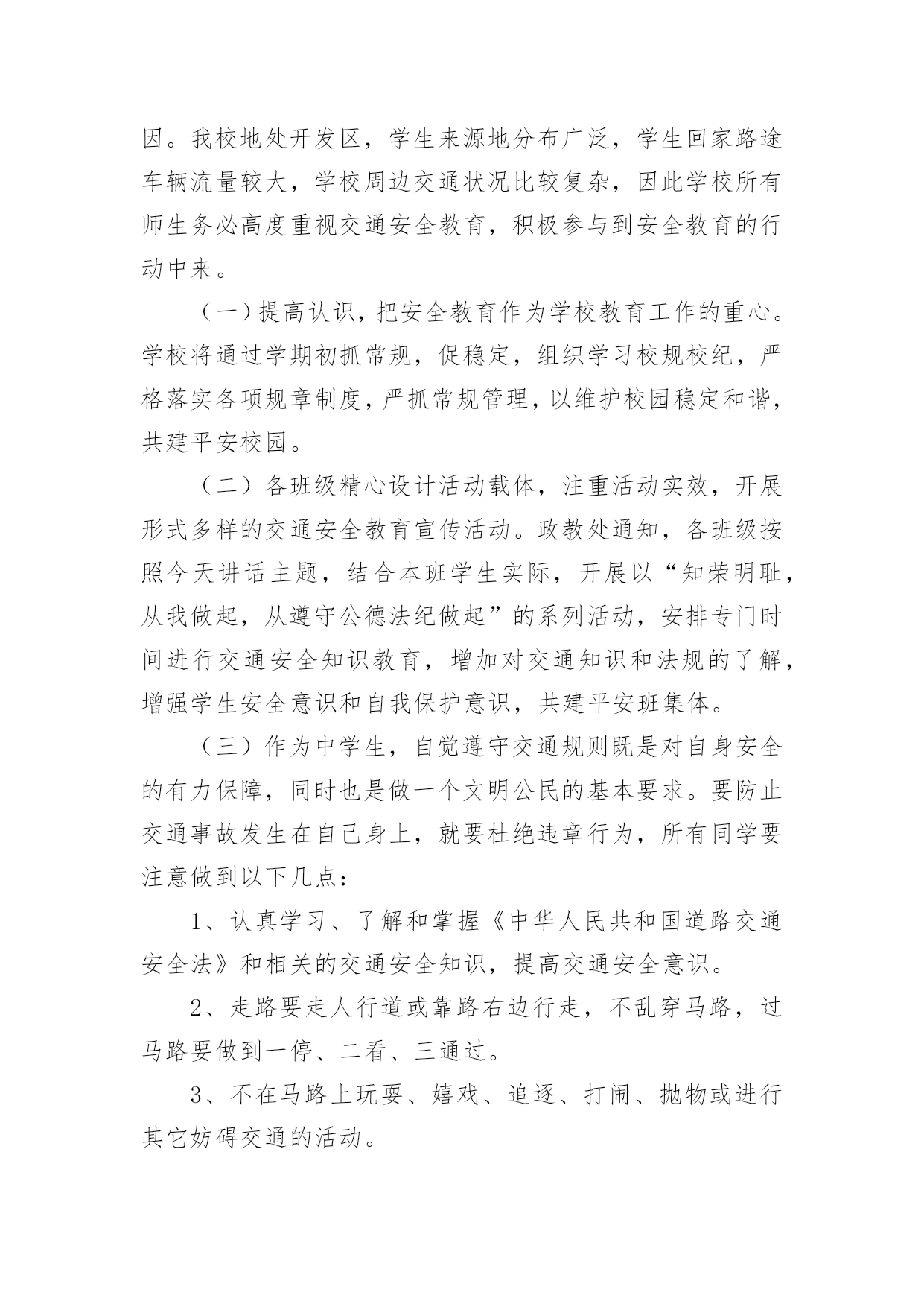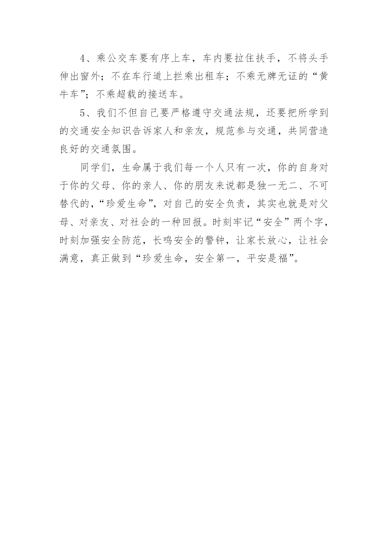 中学生交通安全讲话稿在我们平凡的日常里,需要使用讲话稿的场合越来越多,讲话稿可以起到指引或总结会议,传达贯彻上级精神等作用。如何写一份恰当的讲话稿呢?以下是小编为大家收集的中学生交通安全讲话稿,欢迎阅读,希望大家能够喜欢。各位老师、同学们:大家好!为努力倡导文明交通行为风尚,积极预防和减少交通事故的发生。今天由政教处进行交通安全宣传教育,讲话的主题是“增强安全意识,建设平安校园”。同学们,从你来到这个世界的那一天起,就标志着你给了人间增添一笔宝贵的财富,同时,也给家庭带来了无比欢乐。从这一刻起,多少人关注着你,期望着你成长,成材成器。所以,当你们每一次回校时,父母叮嘱你们最多的一句话就是什么?“骑车慢一点儿”“过公路时要小心”“注意交通安全”。就是这些充满善意与爱心的提醒,告诉你“安全第一”。只有生命的存在,才能去去追寻你最真的梦想,实现你美好的理想。所以“珍爱生命,安全第一”是生命活中永恒的话题。目前,城市道路交通迅猛发展,各种车辆日益增多,由于一部分人对交通知识的缺乏和对交通法规的淡漠,使得各种交通事故频频发生。交通事故成为导致意外死亡的最大原因。我校地处开发区,学生来源地分布广泛,学生回家路途车辆流量较大,学校周边交通状况比较复杂,因此学校所有师生务必高度重视交通安全教育,积极参与到安全教育的行动中来。(一)提高认识,把安全教育作为学校教育工作的重心。学校将通过学期初抓常规,促稳定,组织学习校规校纪,严格落实各项规章制度,严抓常规管理,以维护校园稳定和谐,共建平安校园。(二)各班级精心设计活动载体,注重活动实效,开展形式多样的交通安全教育宣传活动。政教处通知,各班级按照今天讲话主题,结合本班学生实际,开展以“知荣明耻,从我做起,从遵守公德法纪做起”的系列活动,安排专门时间进行交通安全知识教育,增加对交通知识和法规的了解,增强学生安全意识和自我保护意识,共建平安班集体。(三)作为中学生,自觉遵守交通规则既是对自身安全的有力保障,同时也是做一个文明公民的基本要求。要防止交通事故发生在自己身上,就要杜绝违章行为,所有同学要注意做到以下几点:1、认真学习、了解和掌握《中华人民共和国道路交通安全法》和相关的交通安全知识,提高交通安全意识。2、走路要走人行道或靠路右边行走,不乱穿马路,过马路要做到一停、二看、三通过。3、不在马路上玩耍、嬉戏、追逐、打闹、抛物或进行其它妨碍交通的活动。4、乘公交车要有序上车,车内要拉住扶手,不将头手伸出窗外;不在车行道上拦乘出租车;不乘无牌无证的“黄牛车”;不乘超载的接送车。5、我们不但自己要严格遵守交通法规,还要把所学到的交通安全知识告诉家人和亲友,规范参与交通,共同营造良好的交通氛围。同学们,生命属于我们每一个人只有一次,你的自身对于你的父母、你的亲人、你的朋友来说都是独一无二、不可替代的,“珍爱生命”,对自己的安全负责,其实也就是对父母、对亲友、对社会的一种回报。时刻牢记“安全”两个字,时刻加强安全防范,长鸣安全的警钟,让家长放心,让社会满意,真正做到“珍爱生命,安全第一,平安是福”。