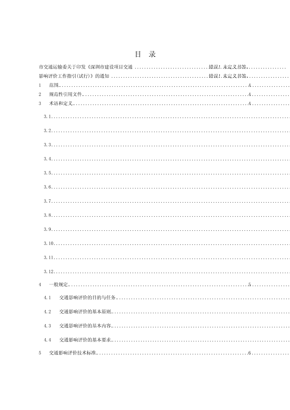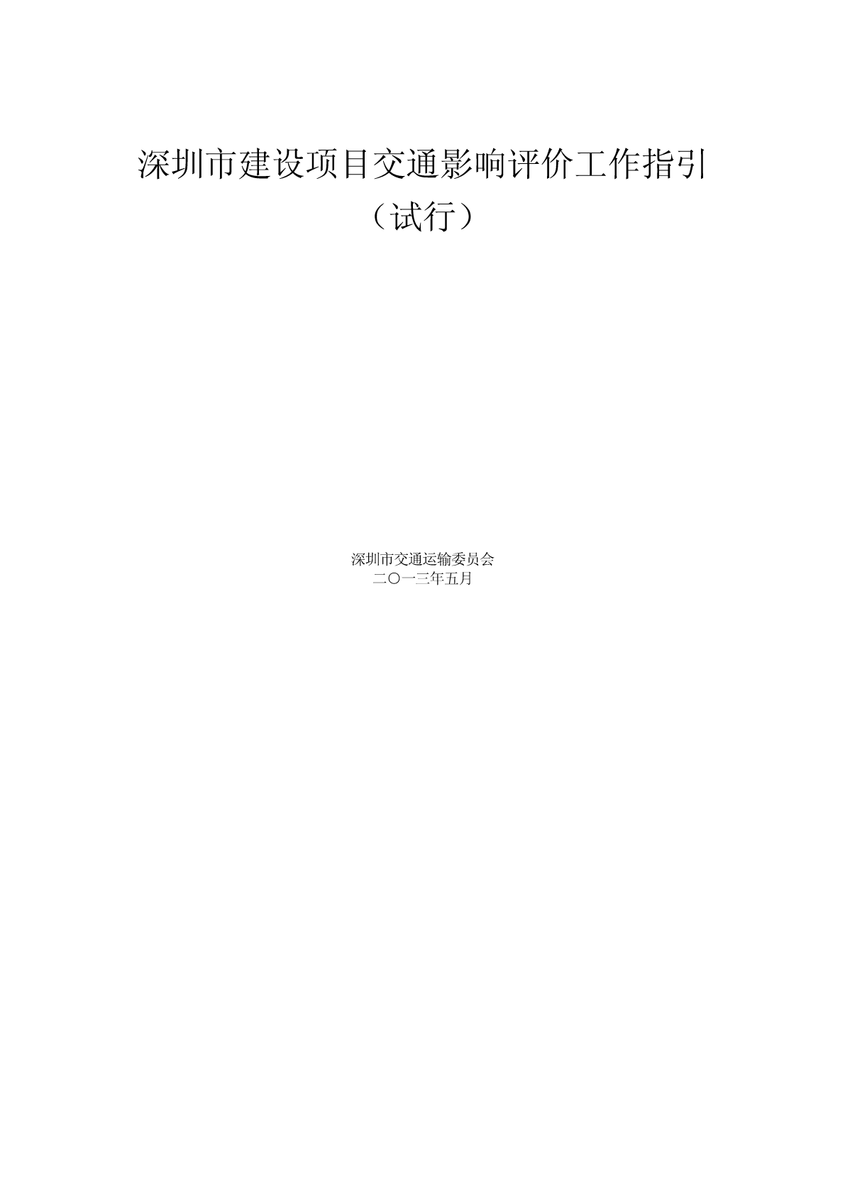 深圳市建设项目交通影响评价工作指引(试行)深圳市交通运输委员会二○一三年五月目录市交通运输委关于印发《深圳市建设项目交通................................................................错误!未定义书签。影响评价工作指引(试行)》的通知....................................................................................错误!未定义书签。1范围..................................................................................................................................................................42规范性引用文件..............................................................................................................................................43术语和定义......................................................................................................................................................43.1........................................................................................................................................................................43.2........................................................................................................................................................................43.3........................................................................................................................................................................43.4........................................................................................................................................................................43.5........................................................................................................................................................................43.6........................................................................................................................................................................53.7........................................................................................................................................................................53.8....................................