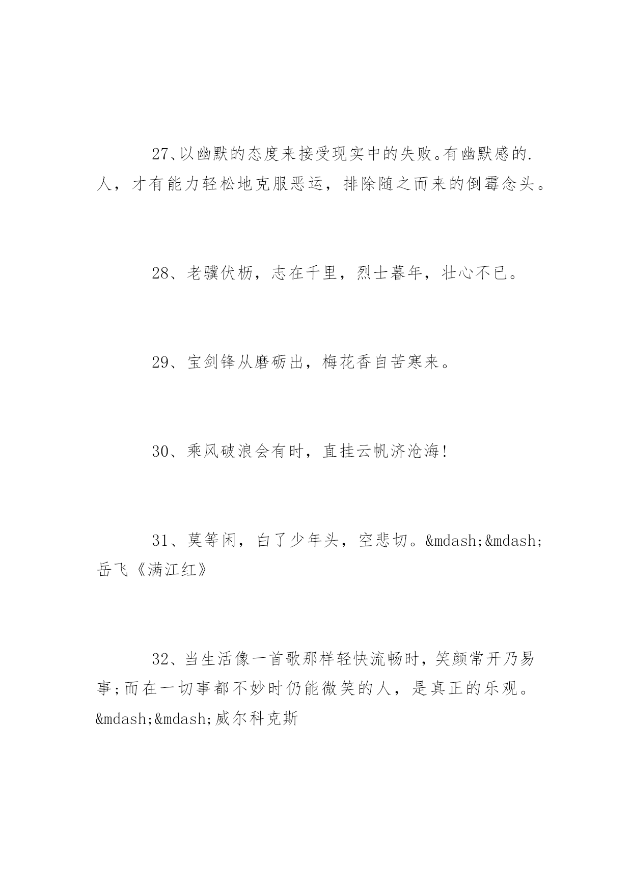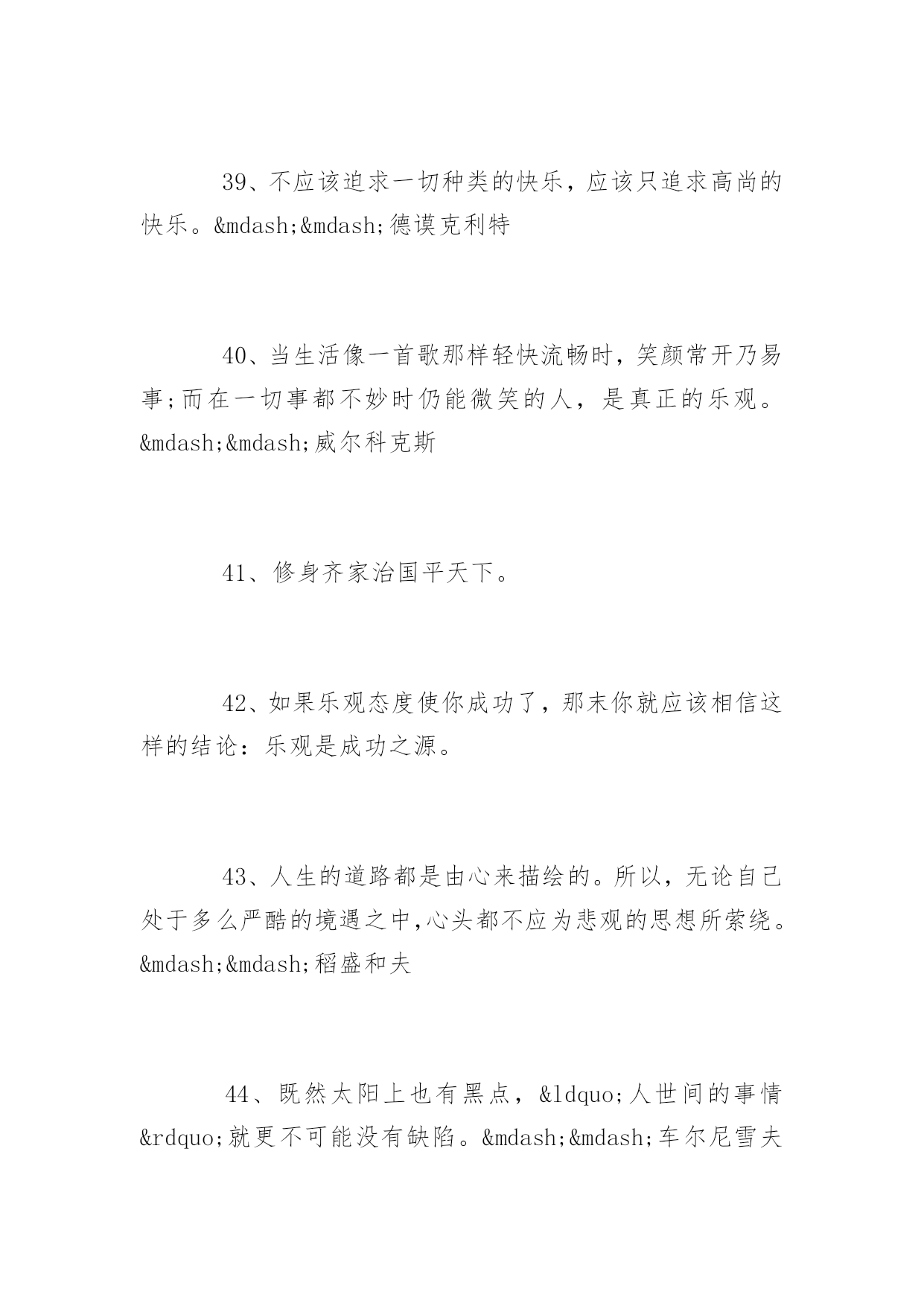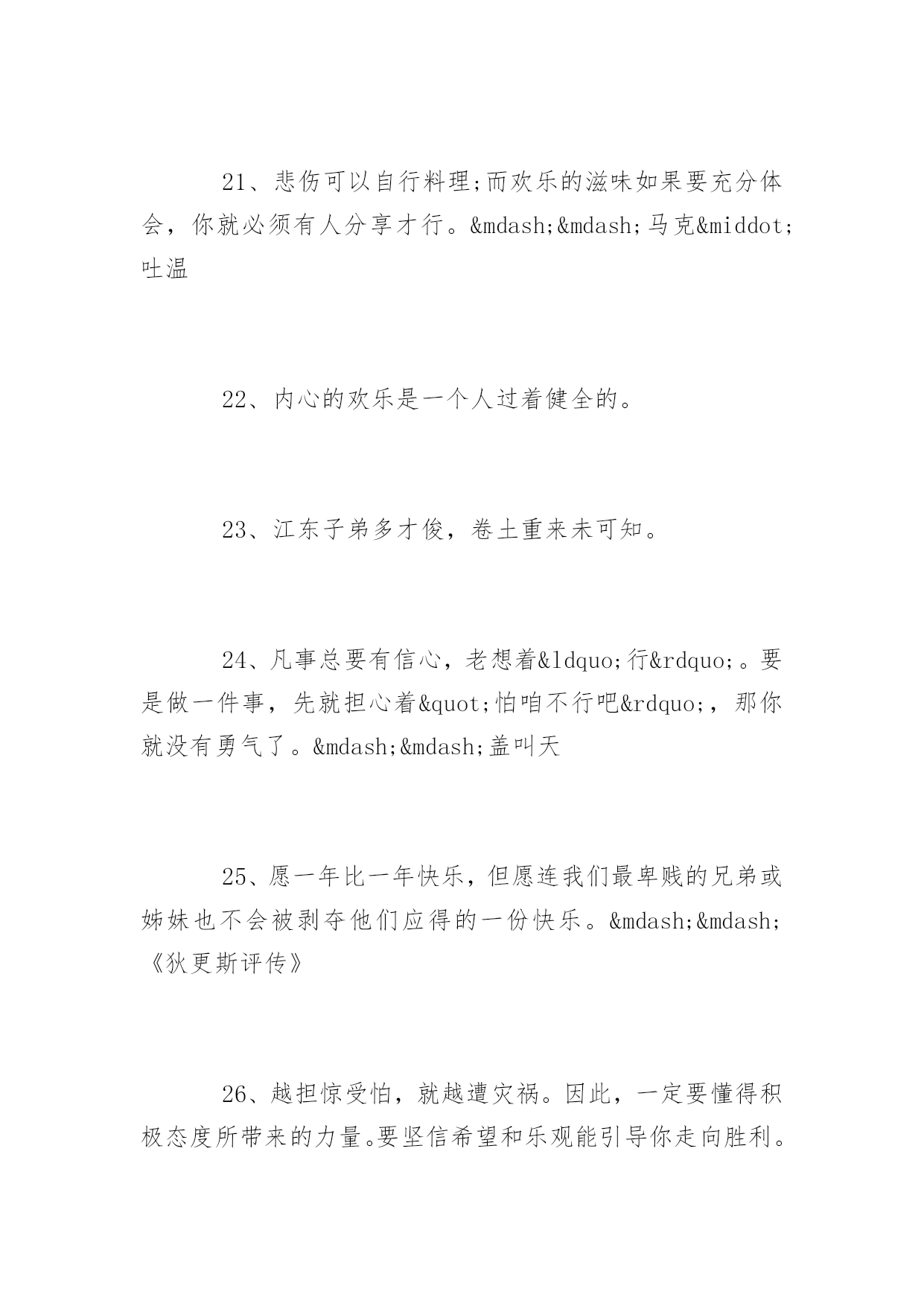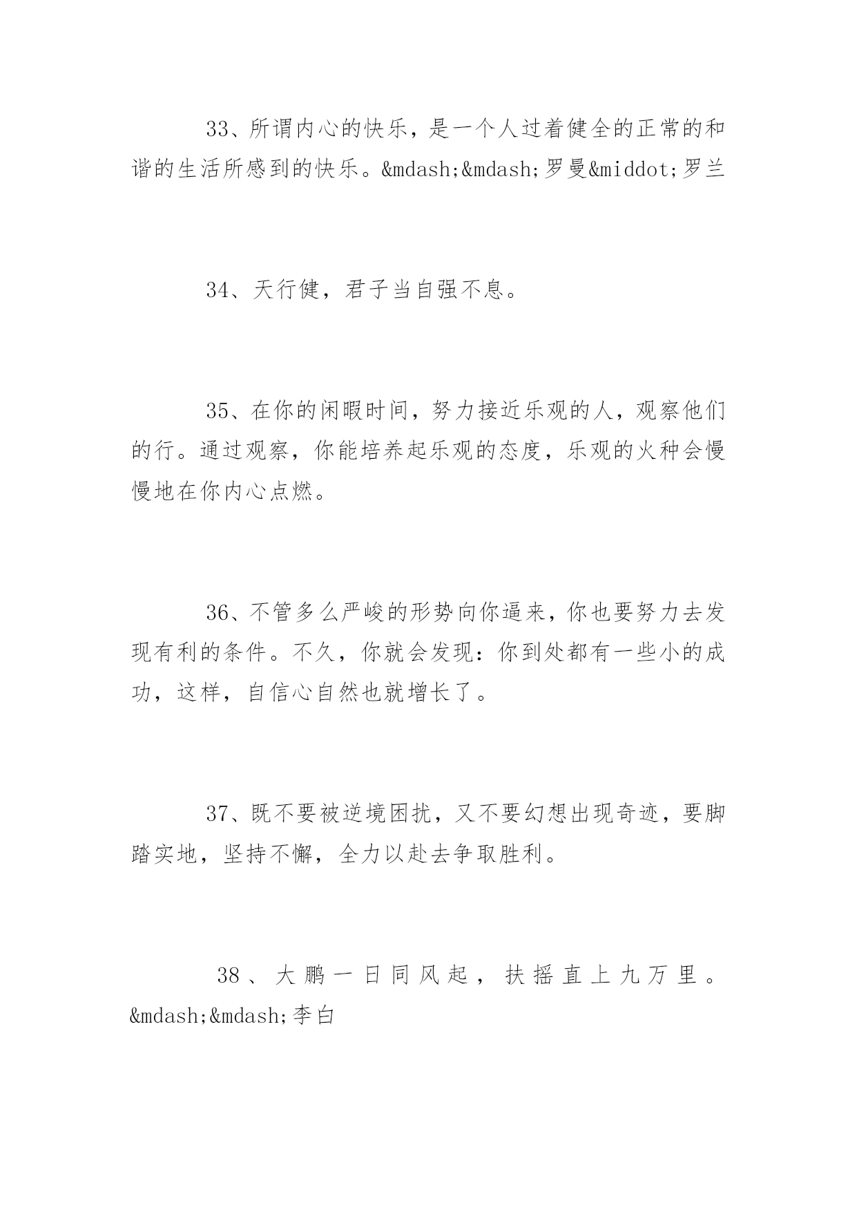 中考素材:积极向上的格言中考素材:关于积极向上的格言导语:积极向上,每个人都可以获得成功的喜悦。下面是小编收集的关于积极向上的格言,欢迎参考。1、乐观本身就是一种成功。2、沉舟侧畔千帆过,病树前头万木春。——刘禹锡3、欢乐是希望之花,能够赐给她以力量,使她可以毫无畏惧地正视人生的坎坷。——巴尔扎克4、路漫漫其修远今,吾将上下而求索。——屈原5、一切的和谐与平衡,健康与健美,成功与幸福,都是由乐观与希望的向上心理产生与造成的。——华盛顿6、不管我到什么地方去,我是去找快乐的。我决不会到什么地方去找痛苦,因为我生来就是个寻欢作乐的人。只有痛苦找到我头上,我才会痛苦。——狄更斯7、使你自己有更多更多工作,使你习惯于工作。这是人生快乐的第一个条件。——罗曼·罗兰8、体育和运动可以增进人体的健康和人的乐观情绪,而乐观情绪却是长寿的一项必要条件。——勒柏辛斯卡娅9、春蚕到死丝方尽,蜡炬成灰泪始干。——李商隐10、即使处境危难,也要寻找积极因素。这样,你就不会放弃取得微小胜利的努力。你越乐观,你克服困难的勇气就越会倍增。11、人生要有意义只有发扬生命,快乐就是发扬生命的最好方法。——张闻天12、在美好的景色、悦耳的声音和扑鼻的芳香给我带来的愉快当中,我不会紧锁住自己感官的大门。——《泰戈尔评传》13、只有利害关系和出众的才干,才能帮你出起主意来,才认真细到,眼光透彻。——巴尔扎克14、理解生活而且还要热爱生活。——罗曼·罗兰15、愉快的笑声,是精神健康的可靠标志。16、不要把悲观作为保护你失望情绪的缓冲器。乐观是希望之花,能赐人以力量。17、忧愁、顾虑和悲观,可以使人得病;积极、愉快和坚强的意志和乐观的情绪,可以战胜疾病,更可以使人强壮和长寿。18、乌云后面依然是灿烂的晴天。——朗弗罗19、业无高卑志当坚,男儿有求安得闲。——张耒20、你失败了,但你要想到,你曾经多次获得过成功。这才是值得庆幸的。如果10个问题,你做对了5个,做错了5个,那未你还是完全有理由庆祝一番,因为你已经成功地解决了5个问题。21、悲伤可以自行料理;而欢乐的滋味如果要充分体会,你就必须有人分享才行。——马克·吐温22、内心的欢乐是一个人过着健全的。23、江东子弟多才俊,卷土重来未可知。24、凡事总要有信心,老想着“行”。要是做一件事,先就担心着"怕咱不行吧”,那你就没有勇气了。——盖叫天25、愿一年比一年快乐,但愿连我们最卑贱的兄弟或姊妹也不会被剥夺他们应得的一份快乐。——《狄更斯评传》26、越担惊受怕,就越遭灾祸。因此,一定要懂得积极态度所带来的力量。要坚信希望和乐观能引导你走向胜利。27、以幽默的态度来接受现实中的失败。有幽默感的.人,才有能力轻松地克服恶运,排除随之而来的倒霉念头。28、老骥伏枥,志在千里,烈士暮年,壮心不已。29、宝剑锋从磨砺出,梅花香自苦寒来。30、乘风破浪会有时,直挂云帆济沧海!31、莫等闲,白了少年头,空悲切。——岳飞《满江红》32、当生活像一首歌那样轻快流畅时,笑颜常开乃易事;而在一切事都不妙时仍能微笑的人,是真正的乐观。——威尔科克斯33、所谓内心的快乐,是一个人过着健全的正常的和谐的生活所感到的快乐。——罗曼·罗兰34、天行健,君子当自强不息。35、在你的闲暇时间,努力接近乐观的人,观察他们的行。通过观察,你能培养起乐观的态度,乐观的火种会慢慢地在你内心点燃。36、不管多么严峻的形势向你逼来,你也要努力去发现有利的条件。不久,你就会发现:你到处都有一些小的成功,这样,自信心自然也就增长了。37、既不要被逆境困扰,又不要幻想出现奇迹,要脚踏实地,坚持不懈,全力以赴去争取胜利。38、大鹏一日同风起,扶摇直上九万里。——李白39、不应该迫求一切种类的快乐,应该只追求高尚的快乐。——德谟克利特40、当生活像一首歌那样轻快流畅时,笑颜常开乃易事;而在一切事都不妙时仍能微笑的人,是真正的乐观。——威尔科克斯41、修身