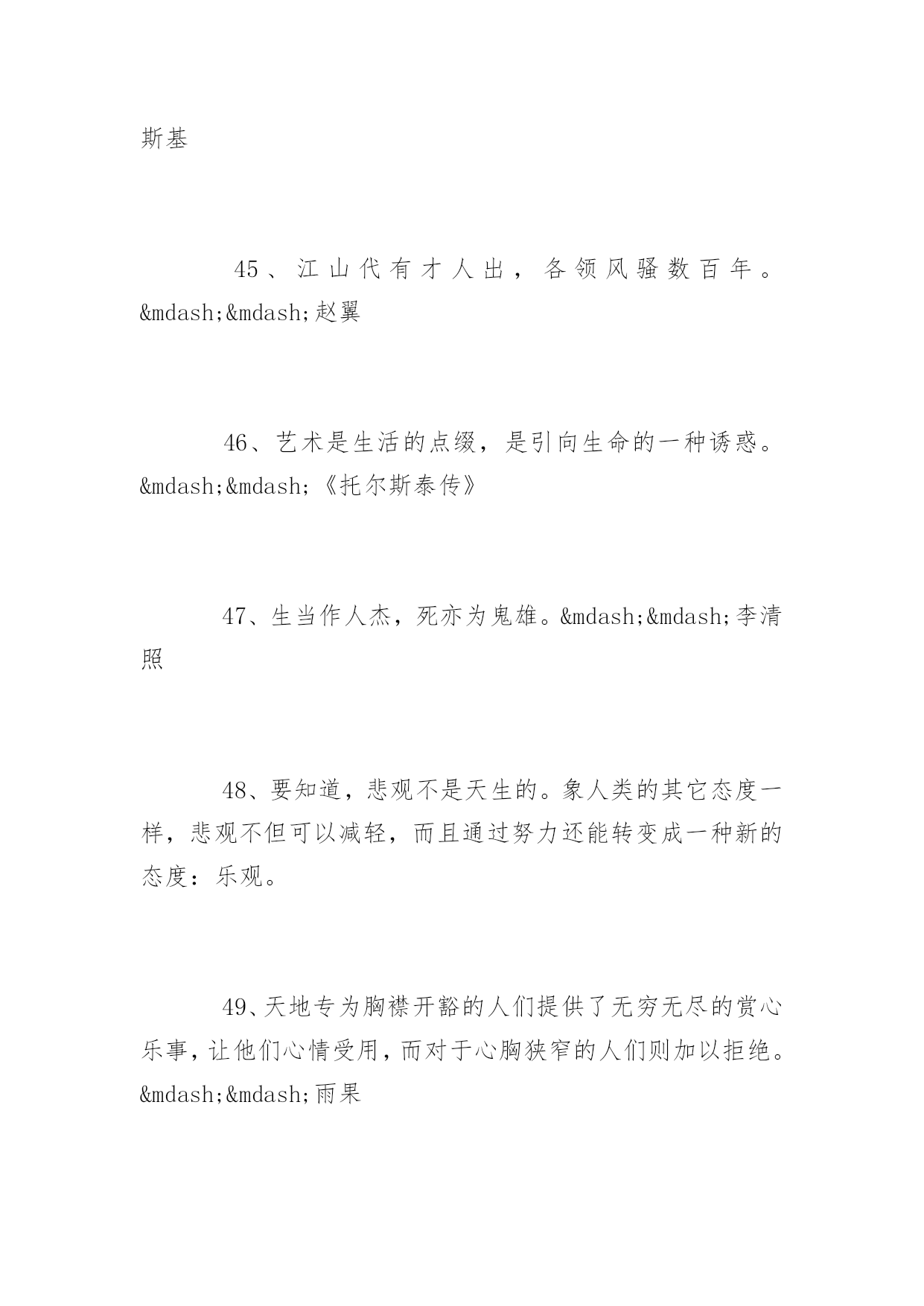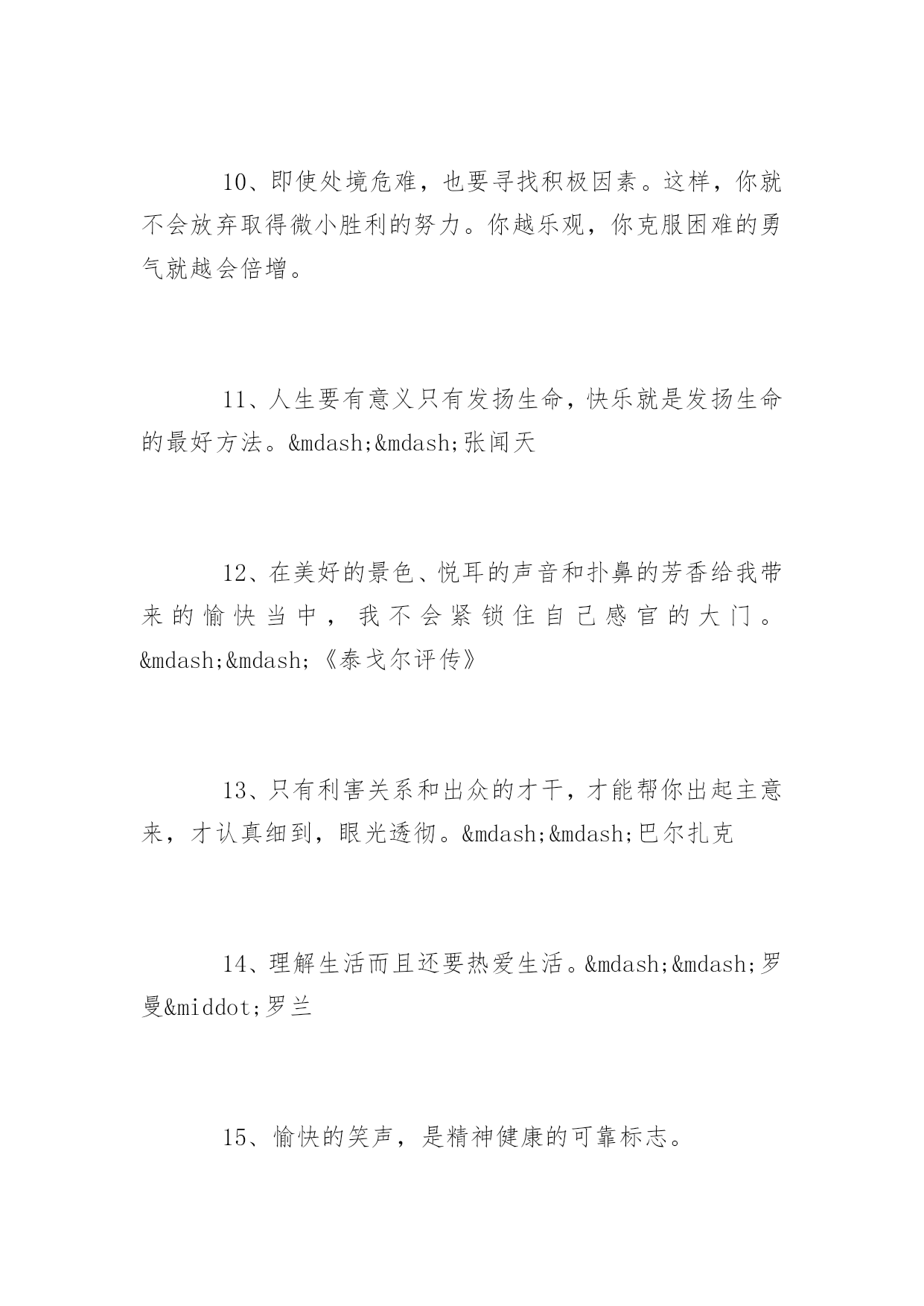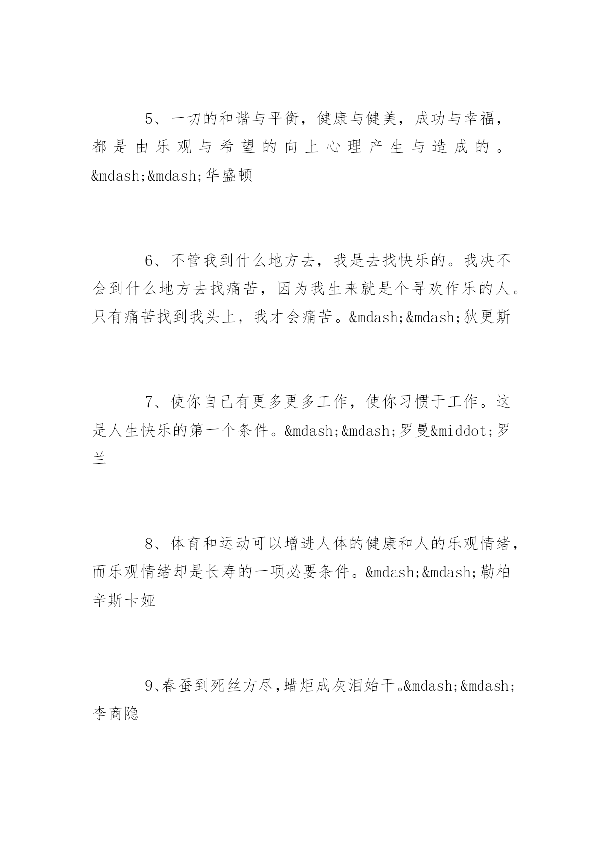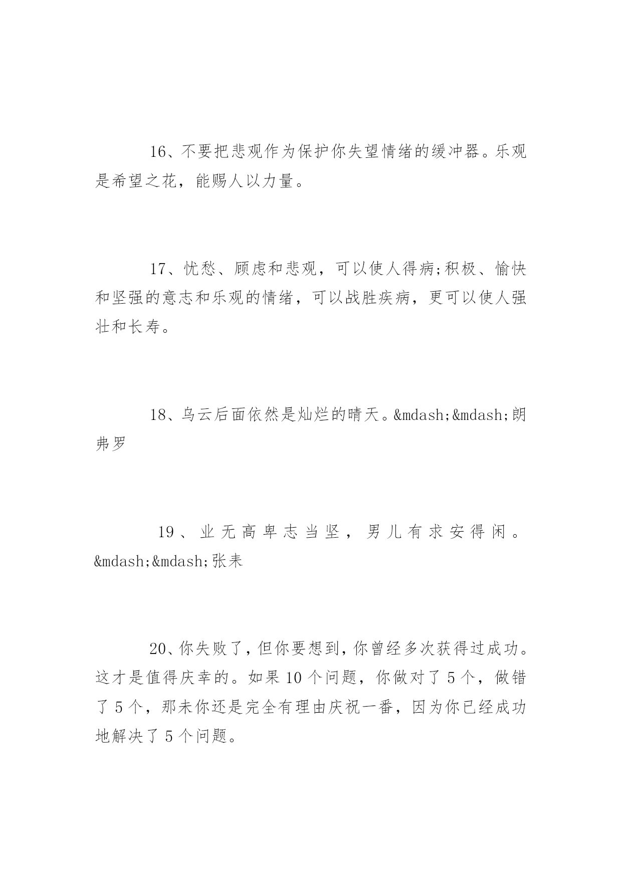 中考素材:积极向上的格言中考素材:关于积极向上的格言导语:积极向上,每个人都可以获得成功的喜悦。下面是小编收集的关于积极向上的格言,欢迎参考。1、乐观本身就是一种成功。2、沉舟侧畔千帆过,病树前头万木春。——刘禹锡3、欢乐是希望之花,能够赐给她以力量,使她可以毫无畏惧地正视人生的坎坷。——巴尔扎克4、路漫漫其修远今,吾将上下而求索。——屈原5、一切的和谐与平衡,健康与健美,成功与幸福,都是由乐观与希望的向上心理产生与造成的。——华盛顿6、不管我到什么地方去,我是去找快乐的。我决不会到什么地方去找痛苦,因为我生来就是个寻欢作乐的人。只有痛苦找到我头上,我才会痛苦。——狄更斯7、使你自己有更多更多工作,使你习惯于工作。这是人生快乐的第一个条件。——罗曼·罗兰8、体育和运动可以增进人体的健康和人的乐观情绪,而乐观情绪却是长寿的一项必要条件。——勒柏辛斯卡娅9、春蚕到死丝方尽,蜡炬成灰泪始干。——李商隐10、即使处境危难,也要寻找积极因素。这样,你就不会放弃取得微小胜利的努力。你越乐观,你克服困难的勇气就越会倍增。11、人生要有意义只有发扬生命,快乐就是发扬生命的最好方法。——张闻天12、在美好的景色、悦耳的声音和扑鼻的芳香给我带来的愉快当中,我不会紧锁住自己感官的大门。——《泰戈尔评传》13、只有利害关系和出众的才干,才能帮你出起主意来,才认真细到,眼光透彻。——巴尔扎克14、理解生活而且还要热爱生活。——罗曼·罗兰15、愉快的笑声,是精神健康的可靠标志。16、不要把悲观作为保护你失望情绪的缓冲器。乐观是希望之花,能赐人以力量。17、忧愁、顾虑和悲观,可以使人得病;积极、愉快和坚强的意志和乐观的情绪,可以战胜疾病,更可以使人强壮和长寿。18、乌云后面依然是灿烂的晴天。——朗弗罗19、业无高卑志当坚,男儿有求安得闲。——张耒20、你失败了,但你要想到,你曾经多次获得过成功。这才是值得庆幸的。如果10个问题,你做对了5个,做错了5个,那未你还是完全有理由庆祝一番,因为你已经成功地解决了5个问题。21、悲伤可以自行料理;而欢乐的滋味如果要充分体会,你就必须有人分享才行。——马克·吐温22、内心的欢乐是一个人过着健全的。23、江东子弟多才俊,卷土重来未可知。24、凡事总要有信心,老想着“行”。要是做一件事,先就担心着"怕咱不行吧”,那你就没有勇气了。——盖叫天25、愿一年比一年快乐,但愿连我们最卑贱的兄弟或姊妹也不会被剥夺他们应得的一份快乐。——《狄更斯评传》26、越担惊受怕,就越遭灾祸。因此,一定要懂得积极态度所带来的力量。要坚信希望和乐观能引导你走向胜利。27、以幽默的态度来接受现实中的失败。有幽默感的.人,才有能力轻松地克服恶运,排除随之而来的倒霉念头。28、老骥伏枥,志在千里,烈士暮年,壮心不已。29、宝剑锋从磨砺出,梅花香自苦寒来。30、乘风破浪会有时,直挂云帆济沧海!31、莫等闲,白了少年头,空悲切。——岳飞《满江红》32、当生活像一首歌那样轻快流畅时,笑颜常开乃易事;而在一切事都不妙时仍能微笑的人,是真正的乐观。——威尔科克斯33、所谓内心的快乐,是一个人过着健全的正常的和谐的生活所感到的快乐。——罗曼·罗兰34、天行健,君子当自强不息。35、在你的闲暇时间,努力接近乐观的人,观察他们的行。通过观察,你能培养起乐观的态度,乐观的火种会慢慢地在你内心点燃。36、不管多么严峻的形势向你逼来,你也要努力去发现有利的条件。不久,你就会发现:你到处都有一些小的成功,这样,自信心自然也就增长了。37、既不要被逆境困扰,又不要幻想出现奇迹,要脚踏实地,坚持不懈,全力以赴去争取胜利。38、大鹏一日同风起,扶摇直上九万里。——李白39、不应该迫求一切种类的快乐,应该只追求高尚的快乐。——德谟克利特40、当生活像一首歌那样轻快流畅时,笑颜常开乃易事;而在一切事都不妙时仍能微笑的人,是真正的乐观。——威尔科克斯41、修身