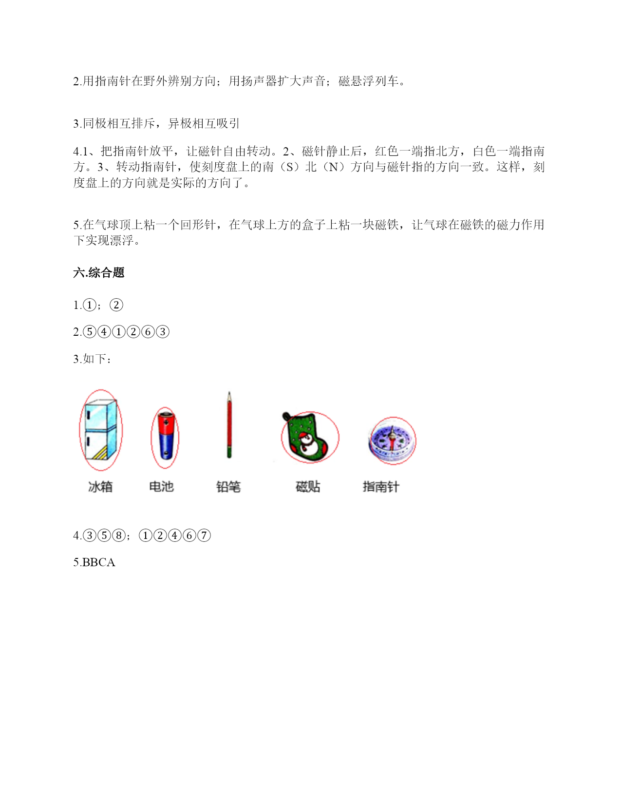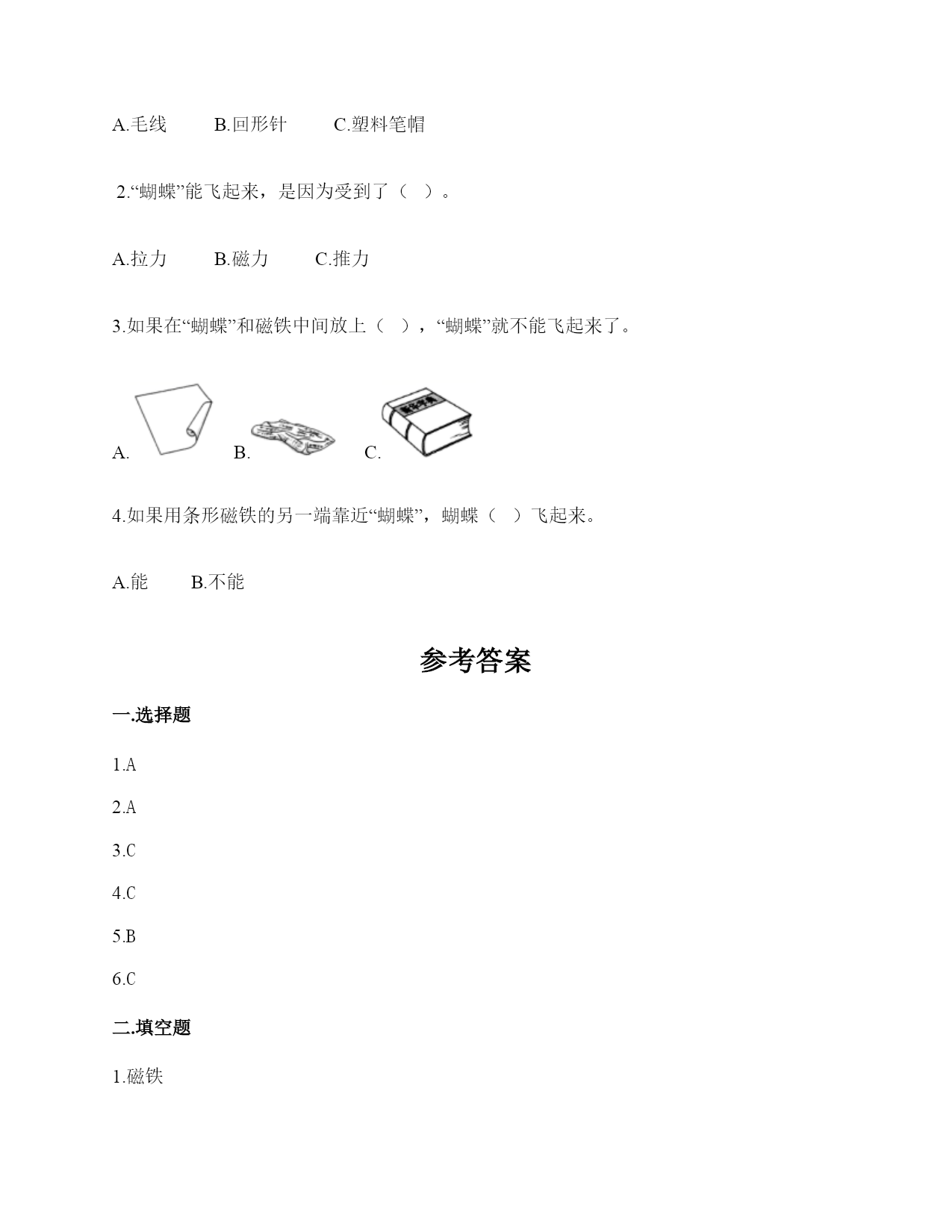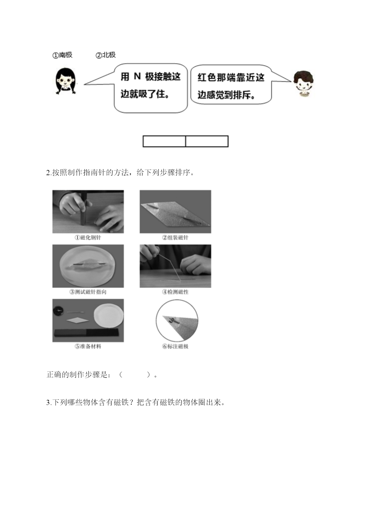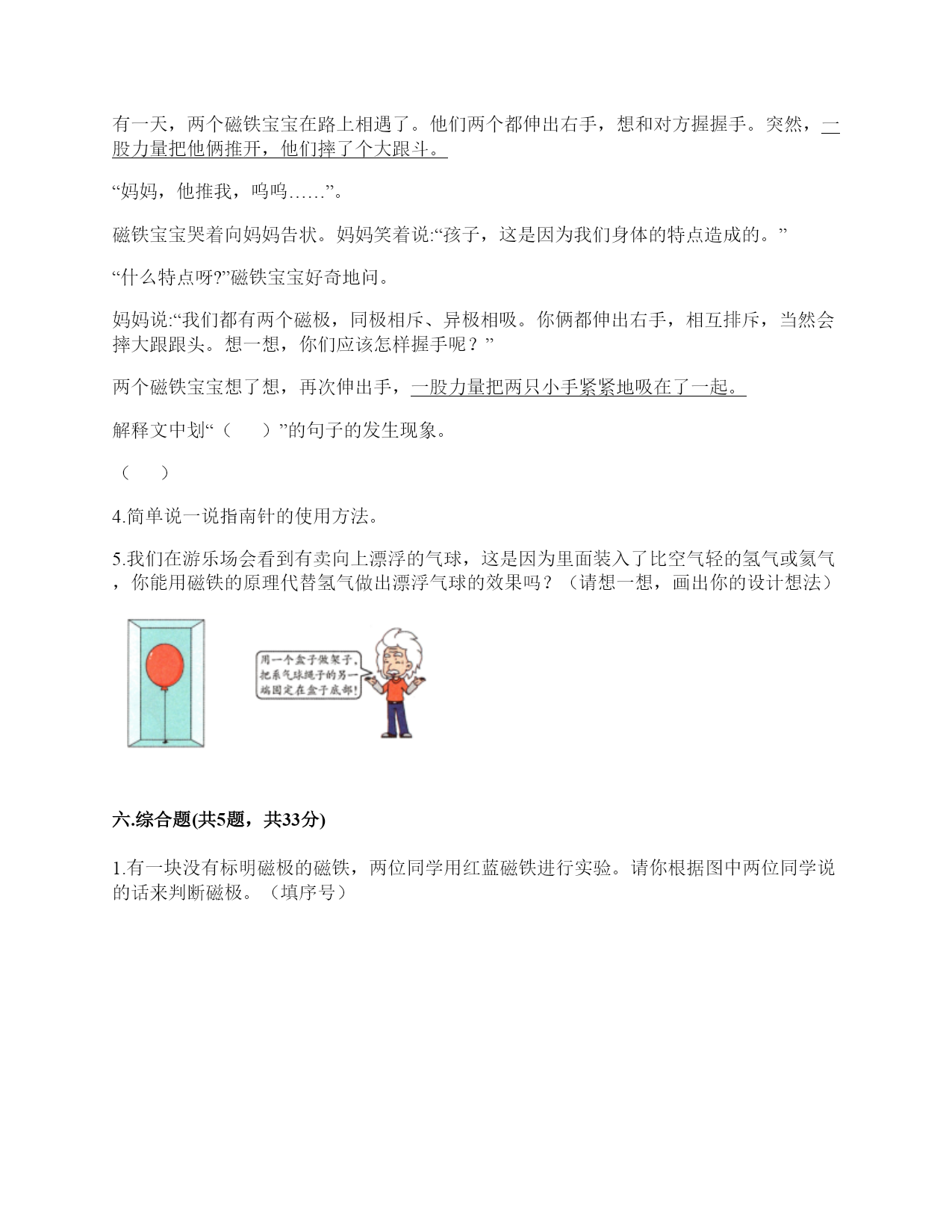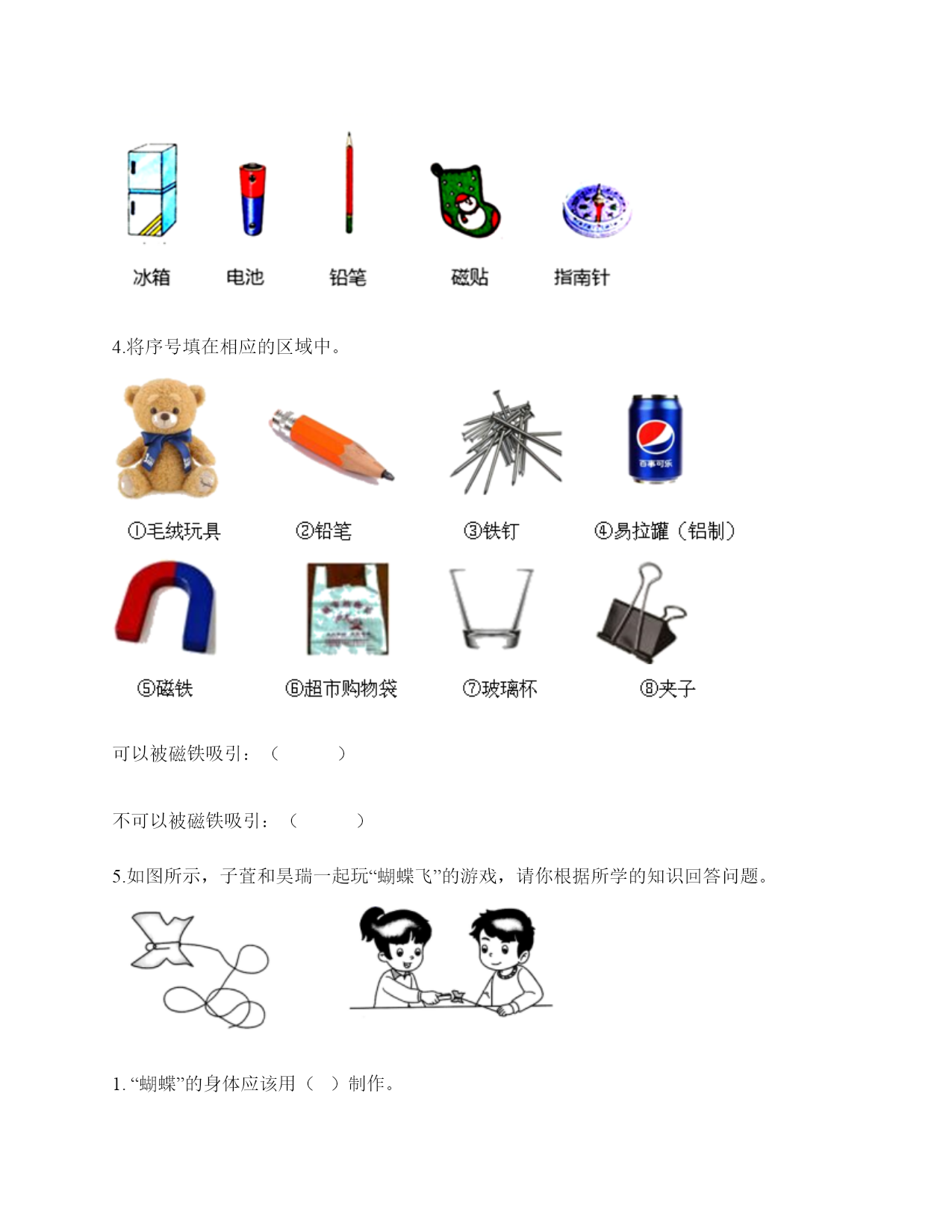 小学科学《磁铁》练习题一.选择题(共6题,共12分)1.下列物体中都是铁制品的是()A.铁钉、回形针、弹簧B.橡皮、电饭锅、螺丝C.木头、纸片塑料尺2.用推力、拉力和磁铁使小车运动,它们的主要区别是()。A.推力和拉力需要接触磁力不需要接触B.推力和拉力不需要接触,磁力需要接触C.拉力需要接触,推力和磁力不需要接触3.把一颗小钢珠放在磁性比较强的蹄形磁铁上,松开手,可能发生的现象是()。A.小钢珠不动B.小钢珠会掉下来C.小钢珠会滚向蹄形磁铁的磁极部位4.关于条形磁铁,下列说法正确的是()。A.各个部分的磁力都一样大B.中心的部分叫做磁极C.可以把其他物体也变得具有磁性5.下列物体,能被磁铁吸引的是()。A.塑料尺B.一元硬币C.铜钥匙6.我们可以用来检验摩擦了的钢针是否已经变成了磁铁的方法是()。A.用钢针去与磁铁互相接触,观察它们的相互作用B.将钢针悬挂,观察钢针时候能旋转指引方向C.用钢针去吸引大头针,观察钢针是否能吸引大头针二.填空题(共6题,共18分)1.指南针是利用()指示方向的仪器。2.磁铁的磁力最大的地方叫作(),每个磁铁都有两处这种地方。3.人们用字母()表示磁铁的南极,用字母()表示磁铁的北极。4.磁铁有不同的外形,常见的有()、()、和()。5.磁铁能隔着一些物体不太厚的物体也能吸()。6.磁铁能够吸引()的性质叫磁性。三.判断题(共6题,共12分)1.一块磁铁摔成两段后,每半段磁铁仍有两个磁极。()2.磁铁有磁性,可以吸引任何物体。()3.指南针发源于中国。()4.磁铁隔着纸能吸引铁,隔着玻璃就不能吸引了。()5.小明的铜钥匙掉进了树洞里,我们可以用磁铁把它吸出来。()6.磁铁只能吸引铁和含铁的物体。()四.连线题(共1题,共4分)1.把下列事物和应用磁铁的原理用线连起来。五.简答题(共5题,共29分)1.请写出4种不同形状的磁铁的名称。2.写出三个磁铁在生活中应用的实例。3.磁铁宝宝相遇记有一天,两个磁铁宝宝在路上相遇了。他们两个都伸出右手,想和对方握握手。突然,一股力量把他俩推开,他们摔了个大跟斗。“妈妈,他推我,呜呜……”。磁铁宝宝哭着向妈妈告状。妈妈笑着说:“孩子,这是因为我们身体的特点造成的。”“什么特点呀?”磁铁宝宝好奇地问。妈妈说:“我们都有两个磁极,同极相斥、异极相吸。你俩都伸出右手,相互排斥,当然会摔大跟跟头。想一想,你们应该怎样握手呢?”两个磁铁宝宝想了想,再次伸出手,一股力量把两只小手紧紧地吸在了一起。解释文中划“()”的句子的发生现象。()4.简单说一说指南针的使用方法。5.我们在游乐场会看到有卖向上漂浮的气球,这是因为里面装入了比空气轻的氢气或氦气,你能用磁铁的原理代替氢气做出漂浮气球的效果吗?(请想一想,画出你的设计想法)六.综合题(共5题,共33分)1.有一块没有标明磁极的磁铁,两位同学用红蓝磁铁进行实验。请你根据图中两位同学说的话来判断磁极。(填序号)2.按照制作指南针的方法,给下列步骤排序。正确的制作步骤是:()。3.下列哪些物体含有磁铁?把含有磁铁的物体圈出来。4.将序号填在相应的区域中。可以被磁铁吸引:()不可以被磁铁吸引:()5.如图所示,子萓和昊瑞一起玩“蝴蝶飞”的游戏,请你根据所学的知识回答问题。1.“蝴蝶”的身体应该用()制作。A.毛线B.回形针C.塑料笔帽2.“蝴蝶”能飞起来,是因为受到了()。A.拉力B.磁力C.推力3.如果在“蝴蝶”和磁铁中间放上(),“蝴蝶”就不能飞起来了。A.B.C.4.如果用条形磁铁的另一端靠近“蝴蝶”,蝴蝶()飞起来。A.能B.不能参考答案一.选择题1.A2.A3.C4.C5.B6.C二.填空题1.磁铁2.磁极3.S;N4.条形磁铁;蹄形磁铁;环形磁铁5.铁6.铁三.判断题1.√2.×3.√4.×5.×6.×四.连线题1.如下:五.简答题1.常见的不同形状的磁铁:条形磁铁、蹄形磁铁、环形磁铁、方形磁铁、圆形磁铁等。2.用指南针在野外辨别方向;用扬声器扩大声音;磁悬浮列车。3.同极相互排斥,异极相互吸引4.1、把指南针放平,让磁针自由转动。2、磁针静止后,红色一端指北方,白色一端指南方。3、转动指南针,使刻度盘上的南(S)北(N)方向与磁针指的方向一致。这样,刻度盘上的方向就是实际的方向了。5.在气球顶上粘一个回形针,在气球上方的盒子上粘一块磁铁,让气球在磁铁的磁力作用下实现漂浮。六.综合题1.①;②2.⑤④①②⑥③3.如下:4.③⑤⑧;①②④⑥⑦5.BBCA