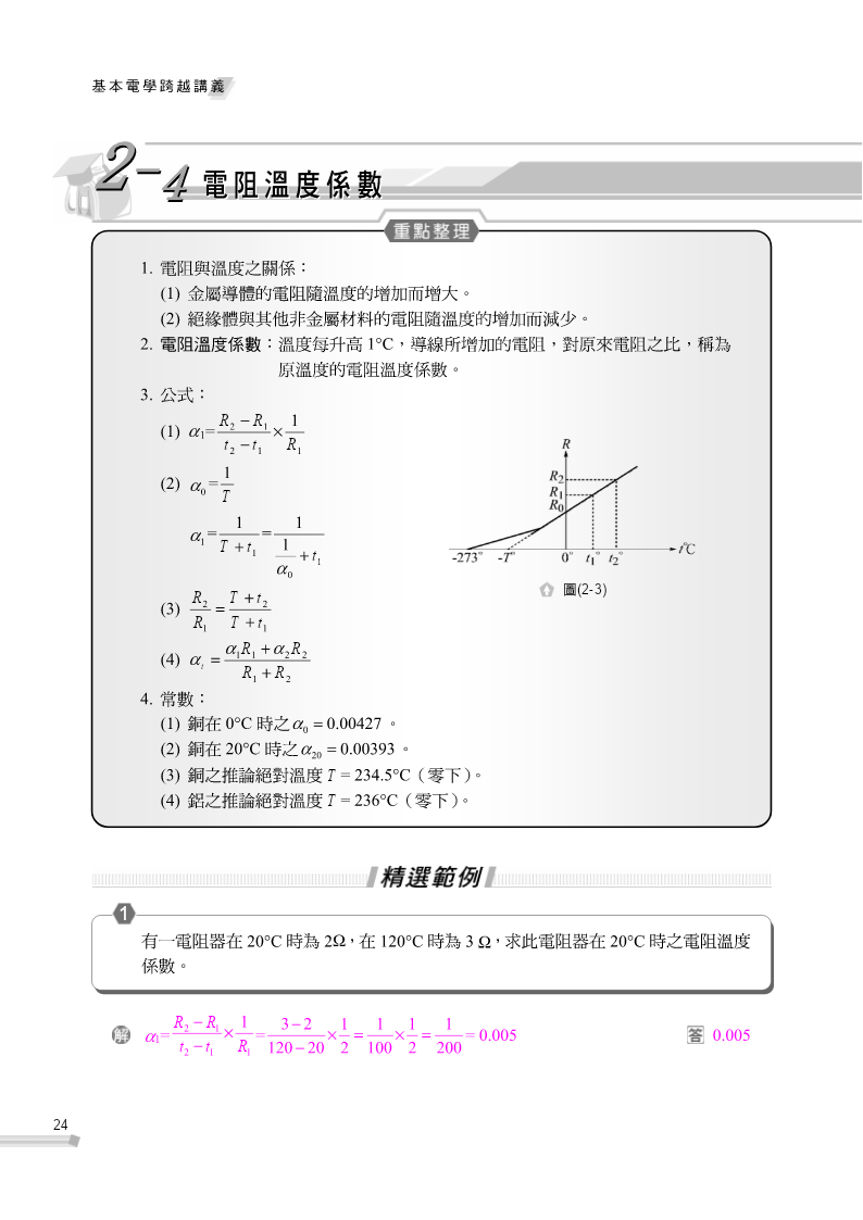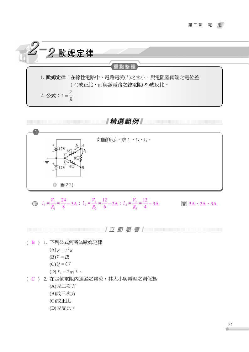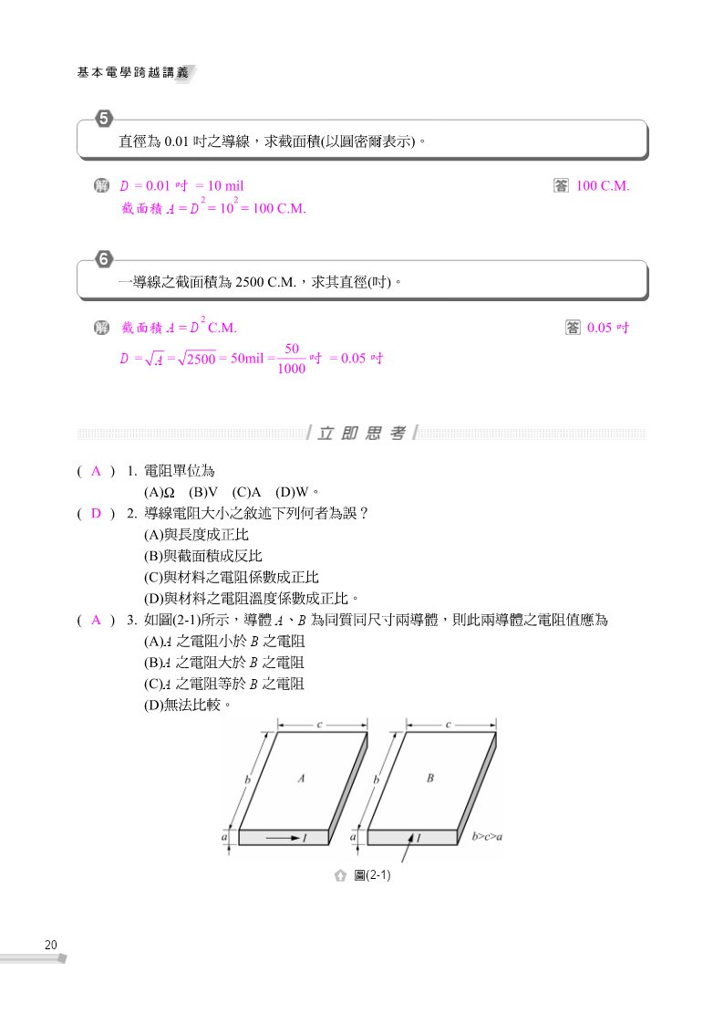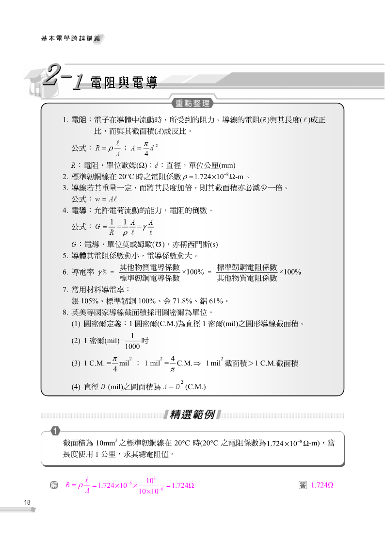 電阻本章是針對電阻元件的各項特性做詳細的介紹,內容分為電阻、電導、歐姆定律、色碼電阻、電阻溫度係數及焦耳定律……等。由過去近三年的歷屆試題可知,平均每年本章命題出現的機率約4%,考題大都是基本公式的應用,希望讀者能背熟公式,可輕易得分。2-1電阻與電導2-2歐姆定律2-3色碼電阻2-4電阻溫度係數2-5焦耳定律基本電學跨越講義2-11.電阻:電子在導體中流動時,所受到的阻力。導線的電阻(R)與其長度(l)成正比,而與其截面積(A)成反比。π公式:R=ρl;A=d2A4R:電阻,單位歐姆(Ω);d:直徑,單位公厘(mm)2.標準韌銅線在20°C時之電阻係數ρ=×Ω1.72410−8-m。3.導線若其重量一定,而將其長度加倍,則其截面積亦必減少一倍。公式:w=Al4.電導:允許電荷流動的能力,電阻的倒數。11AA公式:G===γRρllG:電導,單位莫或姆歐(Ω),亦稱西門斯(s)5.導體其電阻係數愈小,電導係數愈大。其他物質電導係數標準韌銅電阻係數6.導電率γ%=×100%=×100%標準韌銅電導係數其他物質電阻係數7.常用材料導電率:銀105%、標準韌銅100%、金71.8%、鋁61%。8.英美等國家導線截面積採用圓密爾為單位。(1)圓密爾定義:1圓密爾(C.M.)為直徑1密爾(mil)之圓形導線截面積。1(2)1密爾(mil)=吋1000π2242(3)1C.M.=mil;1mil=C.M.⇒1mil截面積>1C.M.截面積4π2(4)直徑D(mil)之圓面積為A=D(C.M.)12截面積為10mm之標準韌銅線在20°C時(20°C之電阻係數為1.724×10−8Ω-m),當長度使用1公里,求其總電阻值。3l−810R=ρ=××1.72410=1.724Ω1.724ΩA10×10−618第二章電阻2有A、B兩條鎳烙線,其材料相同,設A的長度為B的兩倍,B的線徑為A的一半,若B的電阻為10歐姆,求A的電阻。25ΩρllAπ2ρ(2d)RA1110AA==4=⇒RR=×==5ΩR222ABBρllBρAπ2B()d43某導線均勻拉長為原來之n倍,則其電阻值為原來電阻的幾倍?2∵wA=l;ww=′n倍nl′AρlR′∴===A′nnRnRn222⇒′=⇒倍RρllAA41某電熱器之電熱線因檢修而剪掉,則該電熱器之電功率為原來的幾倍?109l1.11倍l′10R′ρρ99==AA′=⇒RR′=R1010ρρllAAV2V29RP′10==R′10=⇒P′=1.11P⇒1.11倍PVV229RR19基本電學跨越講義5直徑為0.01吋之導線,求截面積(以圓密爾表示)。D=0.01吋=10mil100C.M.22截面積A=D=10=100C.M.6一導線之截面積為2500C.M.,求其直徑(吋)。2截面積A=DC.M.0.05吋50D=A=2500=50mil=吋=0.05吋1000(A)1.電阻單位為(A)Ω(B)V(C)A(D)W。(D)2.導線電阻大小之敘述下列何者為誤?(A)與長度成正比(B)與截面積成反比(C)與材料之電阻係數成正比(D)與材料之電阻溫度係數成正比。(A)3.如圖(2-1)所示,導體A、B為同質同尺寸兩導體,則此兩導體之電阻值應為(A)A之電阻小於B之電阻(B)A之電阻大於B之電阻(C)A之電阻等於B之電阻(D)無法比較。圖(2-1)20第二章電阻2-21.歐姆定律:在線性電路中,電路電流(I)之大小,與電阻器兩端之電位差(V)成正比,而與該電路之總電阻(R)成反比。V2.公式:I=R1如圖所示,求I1、I2、I3。圖(2-2)V24V12V12I1I2I31===3A;2===2A;3===3A3A、2A、3AR18R26R34(B)1.下列公式何者為歐姆定律(A)P=I2R(B)V=IR(C)Q=CV(D)XL=2πfL。(C)2.在定值電阻內通過之電流,其大小與電壓之關係為(A)成二次方(B)成三次方(C)成正比(D)成反比。21基本電學跨越講義2-31.色碼電阻顏色與所代表數字關係:棕紅橙黃綠藍紫灰白黑↓↓↓↓↓↓↓↓↓↓12345678902.倒數第二色帶代表次方:金銀棕紅橙黃綠藍紫灰白黑↓↓↓↓↓↓↓↓↓↓↓↓