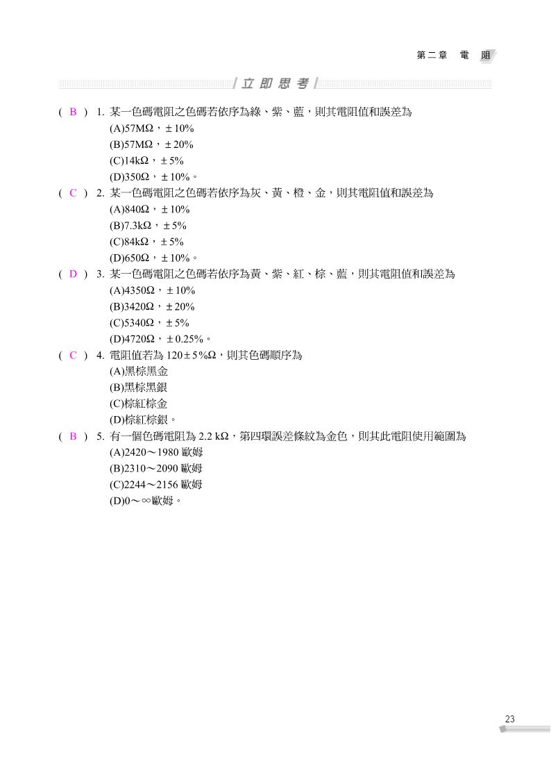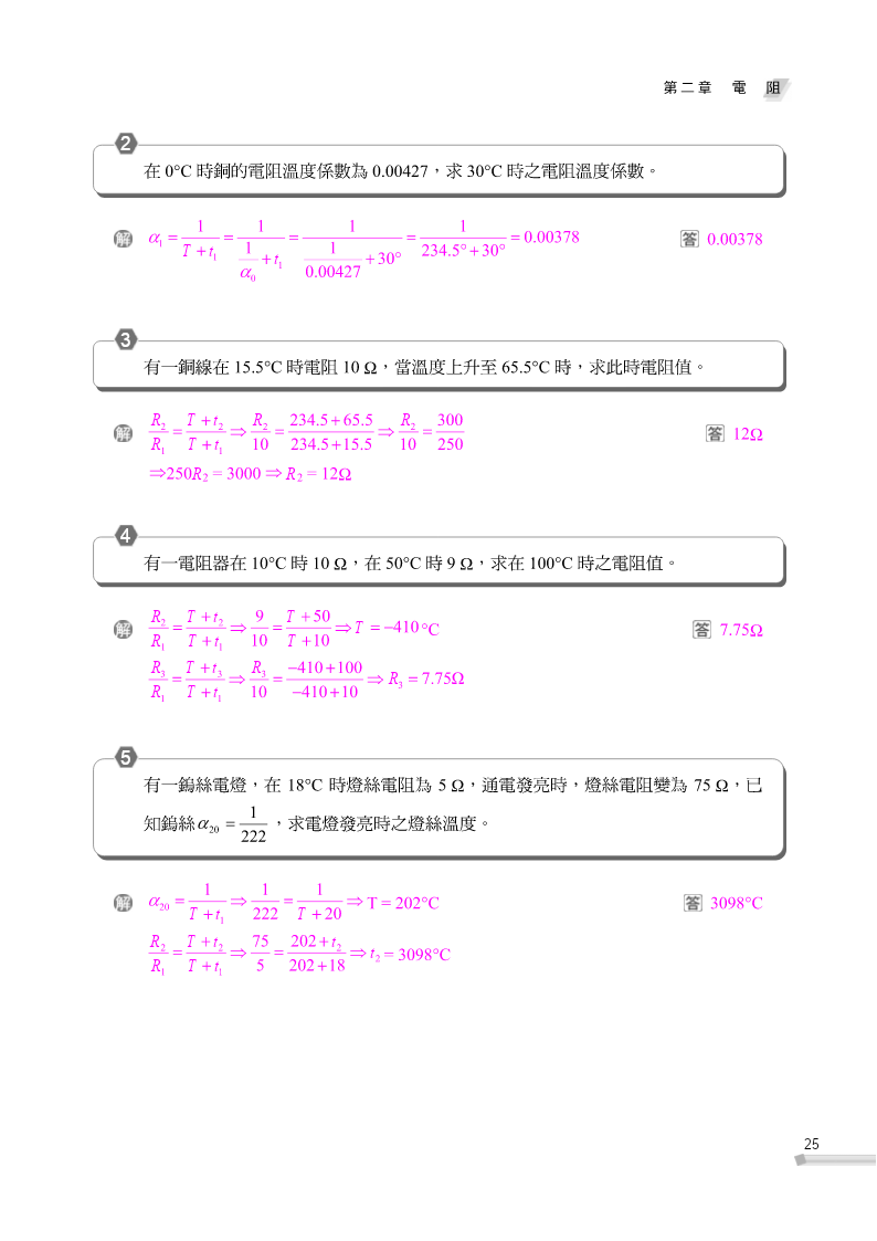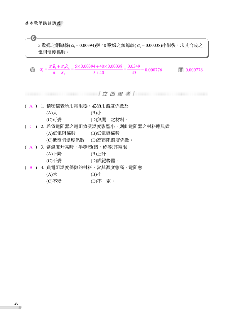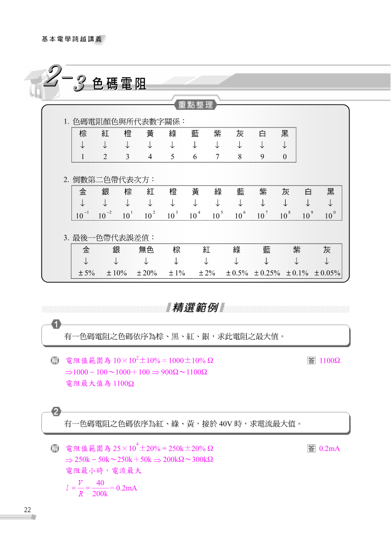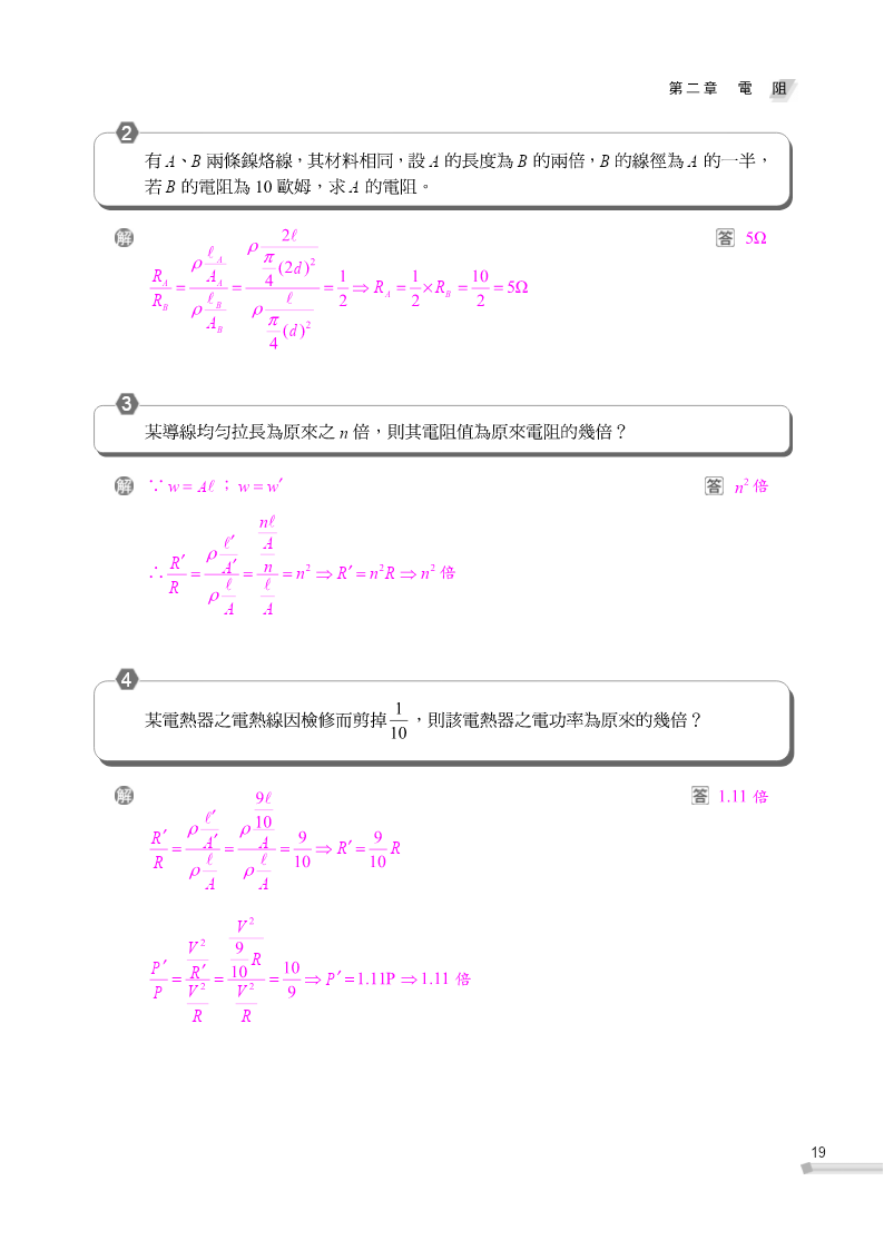 電阻本章是針對電阻元件的各項特性做詳細的介紹,內容分為電阻、電導、歐姆定律、色碼電阻、電阻溫度係數及焦耳定律……等。由過去近三年的歷屆試題可知,平均每年本章命題出現的機率約4%,考題大都是基本公式的應用,希望讀者能背熟公式,可輕易得分。2-1電阻與電導2-2歐姆定律2-3色碼電阻2-4電阻溫度係數2-5焦耳定律基本電學跨越講義2-11.電阻:電子在導體中流動時,所受到的阻力。導線的電阻(R)與其長度(l)成正比,而與其截面積(A)成反比。π公式:R=ρl;A=d2A4R:電阻,單位歐姆(Ω);d:直徑,單位公厘(mm)2.標準韌銅線在20°C時之電阻係數ρ=×Ω1.72410−8-m。3.導線若其重量一定,而將其長度加倍,則其截面積亦必減少一倍。公式:w=Al4.電導:允許電荷流動的能力,電阻的倒數。11AA公式:G===γRρllG:電導,單位莫或姆歐(Ω),亦稱西門斯(s)5.導體其電阻係數愈小,電導係數愈大。其他物質電導係數標準韌銅電阻係數6.導電率γ%=×100%=×100%標準韌銅電導係數其他物質電阻係數7.常用材料導電率:銀105%、標準韌銅100%、金71.8%、鋁61%。8.英美等國家導線截面積採用圓密爾為單位。(1)圓密爾定義:1圓密爾(C.M.)為直徑1密爾(mil)之圓形導線截面積。1(2)1密爾(mil)=吋1000π2242(3)1C.M.=mil;1mil=C.M.⇒1mil截面積>1C.M.截面積4π2(4)直徑D(mil)之圓面積為A=D(C.M.)12截面積為10mm之標準韌銅線在20°C時(20°C之電阻係數為1.724×10−8Ω-m),當長度使用1公里,求其總電阻值。3l−810R=ρ=××1.72410=1.724Ω1.724ΩA10×10−618第二章電阻2有A、B兩條鎳烙線,其材料相同,設A的長度為B的兩倍,B的線徑為A的一半,若B的電阻為10歐姆,求A的電阻。25ΩρllAπ2ρ(2d)RA1110AA==4=⇒RR=×==5ΩR222ABBρllBρAπ2B()d43某導線均勻拉長為原來之n倍,則其電阻值為原來電阻的幾倍?2∵wA=l;ww=′n倍nl′AρlR′∴===A′nnRnRn222⇒′=⇒倍RρllAA41某電熱器之電熱線因檢修而剪掉,則該電熱器之電功率為原來的幾倍?109l1.11倍l′10R′ρρ99==AA′=⇒RR′=R1010ρρllAAV2V29RP′10==R′10=⇒P′=1.11P⇒1.11倍PVV229RR19基本電學跨越講義5直徑為0.01吋之導線,求截面積(以圓密爾表示)。D=0.01吋=10mil100C.M.22截面積A=D=10=100C.M.6一導線之截面積為2500C.M.,求其直徑(吋)。2截面積A=DC.M.0.05吋50D=A=2500=50mil=吋=0.05吋1000(A)1.電阻單位為(A)Ω(B)V(C)A(D)W。(D)2.導線電阻大小之敘述下列何者為誤?(A)與長度成正比(B)與截面積成反比(C)與材料之電阻係數成正比(D)與材料之電阻溫度係數成正比。(A)3.如圖(2-1)所示,導體A、B為同質同尺寸兩導體,則此兩導體之電阻值應為(A)A之電阻小於B之電阻(B)A之電阻大於B之電阻(C)A之電阻等於B之電阻(D)無法比較。圖(2-1)20第二章電阻2-21.歐姆定律:在線性電路中,電路電流(I)之大小,與電阻器兩端之電位差(V)成正比,而與該電路之總電阻(R)成反比。V2.公式:I=R1如圖所示,求I1、I2、I3。圖(2-2)V24V12V12I1I2I31===3A;2===2A;3===3A3A、2A、3AR18R26R34(B)1.下列公式何者為歐姆定律(A)P=I2R(B)V=IR(C)Q=CV(D)XL=2πfL。(C)2.在定值電阻內通過之電流,其大小與電壓之關係為(A)成二次方(B)成三次方(C)成正比(D)成反比。21基本電學跨越講義2-31.色碼電阻顏色與所代表數字關係:棕紅橙黃綠藍紫灰白黑↓↓↓↓↓↓↓↓↓↓12345678902.倒數第二色帶代表次方:金銀棕紅橙黃綠藍紫灰白黑↓↓↓↓↓↓↓↓↓↓↓↓