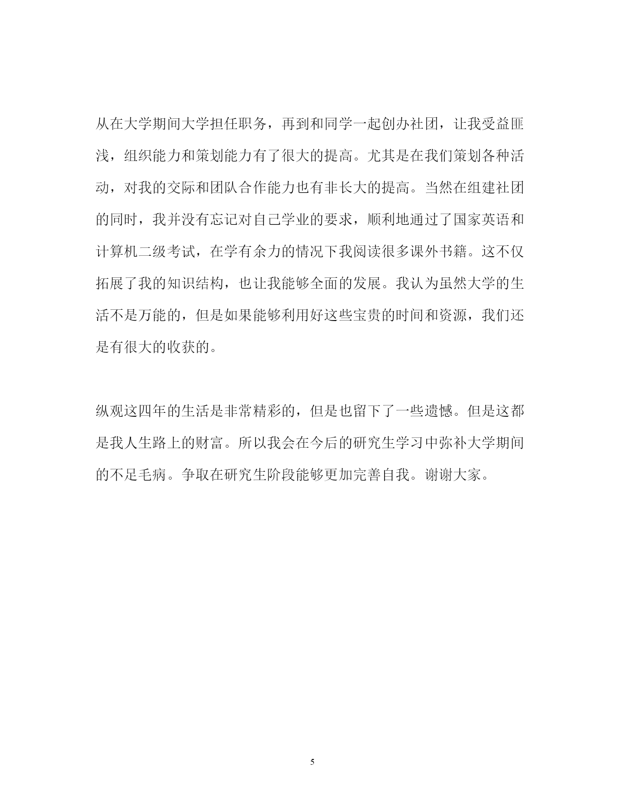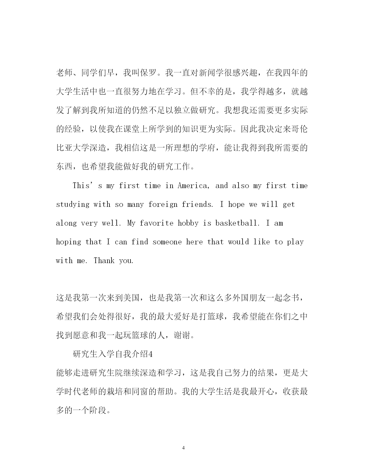 此资料由网络收集而来,如有侵权请告知上传者立即删除。资料共分享,我们负责传递知识。PAGEPAGE5研究生入学自我介绍研究生入学自我介绍眼看就要开学了,研究生入学自我介绍该怎么准备呢?下面是小编搜集整理的研究生入学自我介绍,欢迎阅读。研究生入学自我介绍1同学们大家好,我是***,来自***,*岁。在我的大学生涯中,我一直都认为人应该是活到老学到老的我对知识、对本专业一丝不苟,因而在成绩上一直都得到肯定,每学年都获得三等奖学金。在不满足于学好理论课的同时也注重于对各种应用软件和硬件的研究。因此在第四学期开始就被老师信任为计算机房的负责人。有广泛爱好的我特别擅长于排版及网页美工和多媒体的制作,就任本班组织委员的同时也加入了校学生会宣传部。对工作热情、任劳任怨,和部内成员团结一致,一年间我由部委升为部长。在任部长期间注重配合学校、学生会其它部门,出色的完成各项宣传工作,促使学校的各种运作更顺利的同时行。学校的各种活动都热情的参加,在XX年至XX年间获校文娱比赛及知识问答比赛等一等奖。大胆创新对校报版面进行改革,使得校报的受视率提高到一个层次。学校的各种活动都热情的参加,在XX年4月获校网页比赛三等奖。身为学生的我在修好学业的同时也注重于对社会的实践。本着学以致用,实践结合理论发挥XX年暑假我以熟练的计算机技术应聘入衡阳联想电脑城实习。本人具有热爱等祖国等的优良传统,积极向上的生活态度和广泛的兴趣爱好,对工作责任心强、勤恳踏实,有较强的组织、宣传能力,有一定的艺术细胞和创意,注重团队合作精神和集体观念。研究生入学自我介绍2回顾了大学四年的不足,表达了在研究生阶段完善的决心。很荣幸能够走进研究生院继续深造和学习,这是我自己努力的结果,更是大学时代老师的栽培和同窗的帮助。我的大学生活是我最开心,收获最多的一个阶段。从在大学期间大学担任职务,再到和同学一起创办社团,让我受益匪浅,组织能力和策划能力有了很大的提高。尤其是在我们策划各种活动,对我的交际和团队合作能力也有非长大的提高。当然在组建社团的同时,我并没有忘记对自己学业的要求,顺利地通过了国家英语和计算机二级考试,在学有余力的情况下我阅读很多课外书籍。这不仅拓展了我的知识结构,也让我能够全面的`发展。我认为虽然大学的生活不是万能的,但是如果能够利用好这些宝贵的时间和资源,我们还是有很大的收获的。纵观这四年的生活是非常精彩的,但是也留下了一些遗憾。但是这都是我人生路上的财富。所以我会在今后的研究生学习中弥补大学期间的不足毛玻争取在研究生阶段能够更加完善自我。谢谢大家。研究生入学自我介绍3Goodmorning,teachersandmyfellowstudents.MynameisPaul.I’vealwaysbeenveryinterestedinjournalism,andhaveworkedveryhardatstudyingthroughoutmyfouryearsofcollege.Unfortunately,themoreI’velearned,themoreIbegantorealizethatIstilldon’tknowenoughtodoresearchbymyself.IthinkIstillneedalotmorepracticalexperiencetomakewhatI‘velearnedintheclassroommorerealistic.SoIdecidedtopursueadvancedstudyattheColumbiaUniversity,whichIbelieveistheideaplaceformetogetwhatIneed.IhopethatIcandoagoodjobinmypursuits.老师、同学们早,我叫保罗。我一直对新闻学很感兴趣,在我四年的大学生活中也一直很努力地在学习。但不幸的是,我学得越多,就越发了解到我所知道的仍然不足以独立做研究。我想我还需要更多实际的经验,以使我在课堂上所学到的知识更为实际。因此我决定来哥伦比亚大学深造,我相信这是一所理想的学府,能让我得到我所需要的东西,也希望我能做好我的研究工作。This’smyfirsttimeinAmerica,andalsomyfirsttimestudyingwithsomanyforeignfriends.Ihopewewillgetalongverywell.Myfavoritehobbyisbasketball.IamhopingthatIcanfindsomeoneherethatwouldliketoplaywithme.Thankyou.这是我第一次来到美国,也是我第一次和这么多外国朋友一起念书,希望我们会处得很好