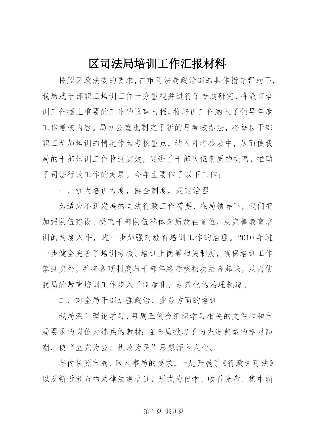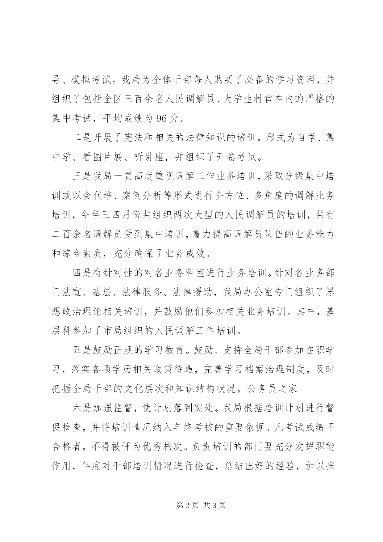 第PAGE\*Arabic\*MERGEFORMAT3页共NUMPAGES\*MERGEFORMAT3页区司法局培训工作汇报材料按照区政法委的要求,在市司法局政治部的具体指导帮助下,我局就干部职工培训工作十分重视并进行了专题研究,将教育培训工作摆上重要的工作的议事日程,将培训工作纳入了领导年度工作考核内容。局办公室也制定了新的月考核办法,将每位干部职工参加培训的情况作为考核重点,纳入月考核表中,从而使我局的干部培训工作收到实效,促进了干部队伍素质的提高,推动了司法行政工作的发展。今年主要作了以下工作:一、加大培训力度,健全制度,规范治理为适应不断发展的司法行政工作需要,在局领导下,我们把加强队伍建设、提高干部队伍整体素质放在首位,从完善教育培训的角度入手,进一步加强对教育培训工作的治理。2010年进一步健全完善了培训考核、培训上岗等相关制度,确保培训工作落到实处,并将各项制度与干部年终考核档次结合起来,从而使我局的教育培训工作步入了制度化、规范化的治理轨道。二、对全局干部加强政治、业务方面的培训我局深化理论学习,每周五例会组织学习相关的文件和和市局要求的岗位大练兵的教材;在全局掀起了向先进典型的学习高潮,使“立党为公、执政为民”思想深入人心。年内按照市局、区人事局的要求,一是开展了《行政许可法》以及新近颁布的法律法规培训,形式为自学、收看光盘、集中辅导、模拟考试。我局为全体干部每人购买了必备的学习资料,并组织了包括全区三百余名人民调解员、大学生村官在内的严格的集中考试,平均成绩为96分。二是开展了宪法和相关的法律知识的培训,形式为自学、集中学、看图片展、听讲座,并组织了开卷考试。三是我局一贯高度重视调解工作业务培训,采取分级集中培训或以会代培、案例分析等形式进行全方位、多角度的调解业务培训,今年三四月份共组织两次大型的人民调解员的培训,共有二百余名调解员受到集中培训,着力提高调解员队伍的业务能力和综合素质,充分确保了业务成效。四是有针对性的对各业务科室进行业务培训。针对各业务部门法宣、基层、法律服务、法律援助,我局办公室专门组织了思想政治理论相关培训,并鼓励他们参加相关业务培训。其中,基层科参加了市局组织的人民调解工作培训。五是鼓励正规的学习教育。鼓励、支持全局干部参加在职学习,落实各项学历相关政策待遇,完善学习档案治理制度,及时把握全局干部的文化层次和知识结构状况。公务员之家六是加强监督,使计划落到实处。我局根据培训计划进行督促检查,并将培训情况纳入年终考核的重要依据。凡考试成绩不合格者,不得被评为优秀档次。负责培训的部门要充分发挥职能作用,年底对干部培训情况进行检查,总结出好的经验,加以推广,进一步推动我局的教育培训工作。近一年的工作表明,加强对司法行政人员的培训工作是提高干部素质的重要途径,是更好的完成司法行政工作的基础。我局能够熟悉到培训工作的重要性,并保证培训经费的落实到位,从而更好的完成市区交给的工作,我们将总结经验、查找不足,争取明年再创培训工作的新水平。