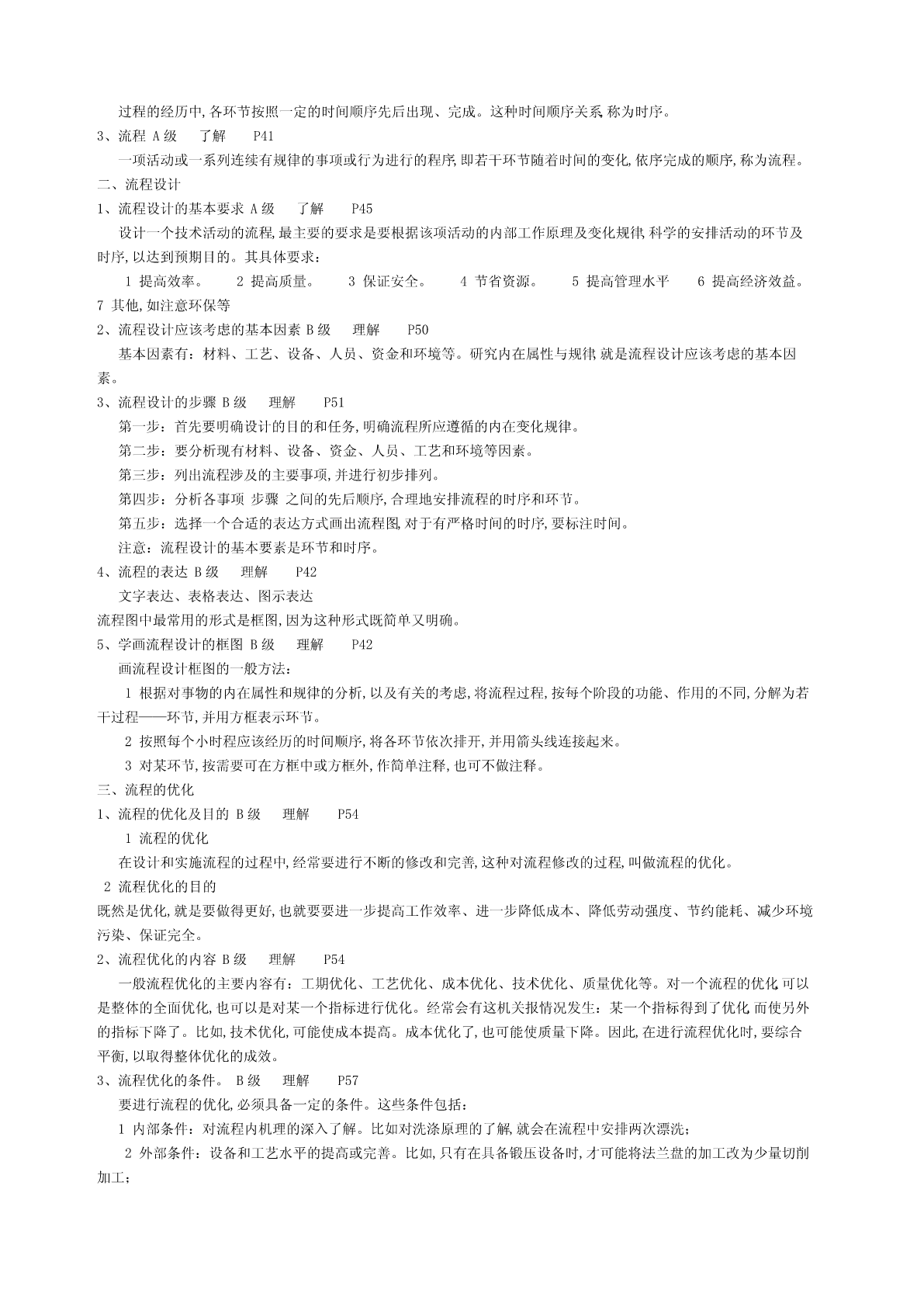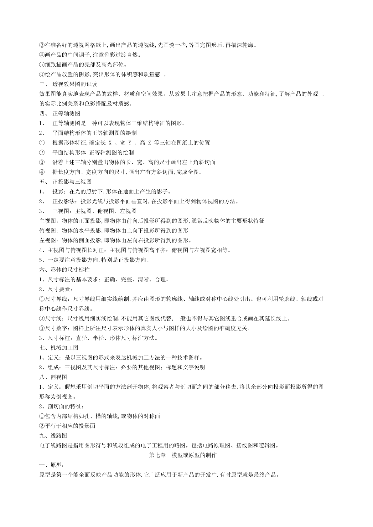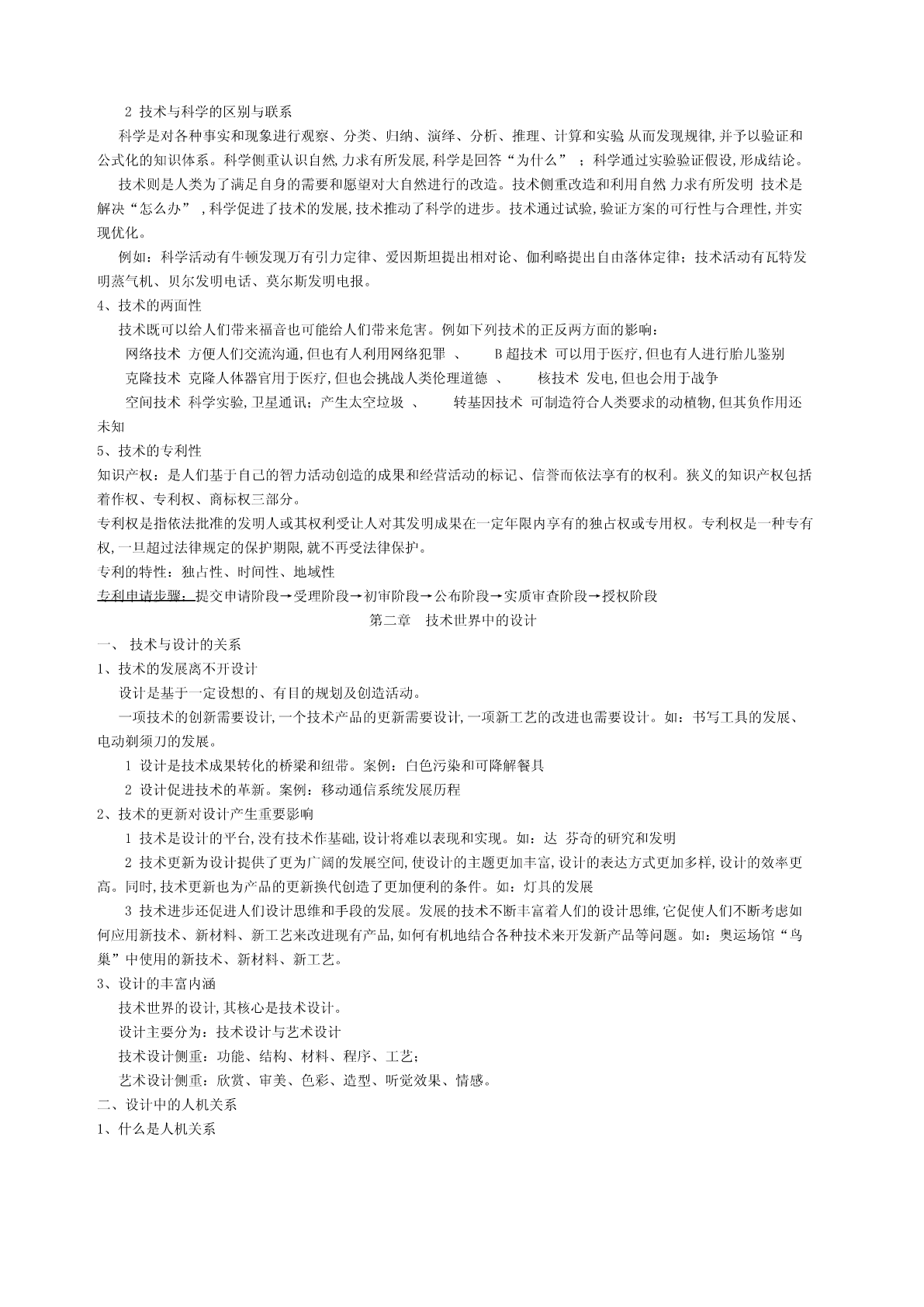 通用技术复习资料第一章走进技术世界一、技术的价值:1、技术与人的关系技术是人类满足自身的需求、愿望,更好的适应大自然,而采取的方法和手段。1人类需要着衣裳遮身避寒——纺织、印染、缝制技术。2人类需要进食补充能量——食品烹饪加工、农作物栽培、家禽饲养技术。3人类需要住所以避风挡雨——建筑技术4人类需要抵御野兽攻击和伤害——武器制造技术。5人类需要出行——车、船制造技术。6人类需要交往、保持联系——邮电通讯技术。技术的作用:保护人:提供抵抗不良环境,防止被侵害的手段和工具。解放人:解放或延长了身体器官,拓展活动了空间,提高了劳动效率,增强了各方面的能力。发展人:技术促进人的精神和智力的发展,使得人的创新精神和批判能力得以提高,思维方式发生转变,自我价值得以体现。2、技术与社会的关系技术促进社会的发展,丰富社会文化内容,改变社会生活方式,是推动社会发展和文明进步的主要动力之一。具体为:1技术是社会财富积累的一种形式,对社会生产具有直接的经济意义。它促进了社会经济的增长,实现了产业结构的升级,并为企业的发展提供了基础。如福特T型车的生产流水线。2随着技术的发展,劳动力结构也发生了较大的变化,第一第二产业从业者数量减少,第三产业从业者数量大幅度增加。例如:因为农业技术的发展与劳作方式的变革使农业从业人口减少。3技术不仅为生产提供了先进的手段和工具,提高了生产效率和经济效益,而且丰富了人们的社会生活,使人们衣食、住、行、交往、娱乐、教育等方面都发生了改变。4技术进步不仅带动社会生产的发展和社会活动的变化,而且渗透到军事、政治、文化各领域。3、技术与自然的关系1利用技术,人类可以改造和利用自然。如:填海造田、南水北调、西气东输、都江堰、荷兰的风车。2人类利用技术和改造自然要有合理的尺度,要注意对自然的保护,不能忽视对自然的保护,不能忽视一些技术或产品对环境可能造成的负面影响。3技术的发展给自然环境带来了问题,但也给解决这些问题提供了可能。“绿色”技术:主要包括绿色产品的生产技术以及清洁工艺等。绿色产品:指在生产和生活中,不会污染环境和破坏生态的产品的总称。二、技术的性质1、技术的目的性技术总是从一定的目的出发,针对具体的问题,形成解决方案,从而满足人们的某方面的需求。例如:助听器的发明。人类有目的、有计划、有步骤地技术活动推动了技术的不断发展。2、技术的创新性创新是技术发展的核心。技术的发展需要创新。技术创新常常表现为技术革新和技术发明。技术革新一般是在原有技术的基础上的变革和改进,技术发明则是一项新技术的产生。3、技术的综合性1技术活动往往需要综合运用多种知识。技术具有跨学科的性质,综合性是技术的内在特性。一般地,每一项技术都需要综合运用多个学科、多方面的知识。2技术与科学的区别与联系科学是对各种事实和现象进行观察、分类、归纳、演绎、分析、推理、计算和实验,从而发现规律,并予以验证和公式化的知识体系。科学侧重认识自然,力求有所发展,科学是回答“为什么”;科学通过实验验证假设,形成结论。技术则是人类为了满足自身的需要和愿望对大自然进行的改造。技术侧重改造和利用自然,力求有所发明技术是解决“怎么办”,科学促进了技术的发展,技术推动了科学的进步。技术通过试验,验证方案的可行性与合理性,并实现优化。例如:科学活动有牛顿发现万有引力定律、爱因斯坦提出相对论、伽利略提出自由落体定律;技术活动有瓦特发明蒸气机、贝尔发明电话、莫尔斯发明电报。4、技术的两面性技术既可以给人们带来福音也可能给人们带来危害。例如下列技术的正反两方面的影响:网络技术方便人们交流沟通,但也有人利用网络犯罪、B超技术可以用于医疗,但也有人进行胎儿鉴别克隆技术克隆人体器官用于医疗,但也会挑战人类伦理道德、核技术发电,但也会用于战争空间技术科学实验,卫星通讯;产生太空垃圾、转基因技术可制造符合人类要求的动植物,但其负作用还未知5、技术的专利性知识产权:是人们基于自己的智力活动创造的成果和经营活动的标记、信誉而依法享有的权利。狭义的知识产权包括着作权、专利权、商标权三部分。专利权是指依法批准的发明人或其权利受让人对其发明成果在一定年限内享有的独占权或专用权。专利权是一种专有权,一旦超过法律规定的保护期限,就不再受法律保护。专利的特性:独占性、时间性、地域性专利申请步骤:提交申请阶段→受理阶段→初审阶段→公布阶段→实质审查阶段→授权阶段第二章技术世界中的设计一、技术与设计的关系1、技术的发展离不开设计设计是基于一定设想的、有目的规划及创造活动。一项技术的创新需要设计,一个技术产品的更新需要设计,一项新工艺的改进也需要设计。如:书写工具的发展、电动剃