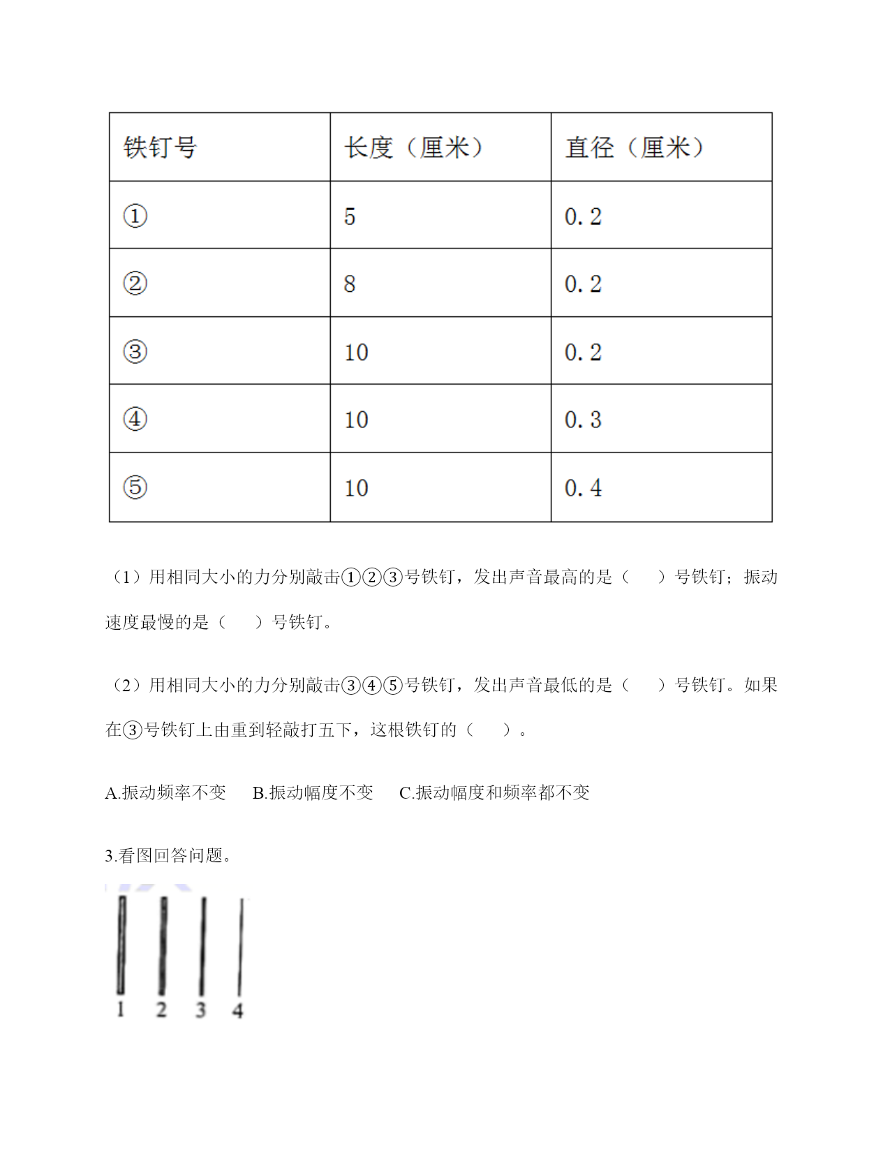 小学科学《声音》练习题一.选择题(共10题,共20分)1.声音产生的根源是()。A.摩擦B.空气C.发声器D.物体振动2.下面不能用于描述声音的是()。A.高、低B.强、弱C.多、少3.声音可以向()传播。A.一个方向B.四面八方C.两个方向4.下列物质中,声音在()中传播速度最快。A.铁轨B.大海C.空气5.吹奏笛子时,我们听到的声音主要是由()振动产生的。A.笛子本子B.笛子中的空气C.吹奏者的嘴唇6.当我们把玻璃钟罩里的空气逐渐抽掉时,钟罩里的闹钟铃声会()。A.越来越轻,甚至听不见B.越来越响C.没有什么变化7.关于声音,下面说法正确的是()。A.人说话是靠舌头振动发声的B.一切发声物体都在振动C.只要物体在振动,我们人耳就能听到声音8.钢尺一部分伸出桌边外,其他部分固定在桌面上。用木块压它在桌外部分顶端并让它滑过。尺端被压下2厘米时即滑过,与被压下5厘米时即滑过发出的声音()。A.强弱不同,频率相同B.频率不同,强弱相同C.频率、强弱都不同9.莉莉借助音叉和乒乓球研究声音产生的秘密(如图所示),当他撞击音叉并将悬吊的乒乓球紧贴着音叉,他会观察到()。A.乒乓球位置不变B.乒乓球多次被弹开C.乒乓球接触音叉后,音叉立即停止发声10.把耳朵贴在桌面上,听同桌在桌子另一端用手抓挠桌面的声音,这样听到的声音与耳朵不贴桌面听到的声音相比()。A.声音更弱B.声音更强C.声音没什么变化二.填空题(共10题,共32分)1.一些歌唱家的歌声被称为“海豚音”,是因为他们能发出很()的声音。2.敲击音叉,然后轻轻按住,感觉音叉在()。3.人的()聚集、传递声音,()接收声音、产生振动、且传递振动到内耳;()能把振动转化为神经信号传递给大脑。4.在耳朵的各个部分中,能将声音转化为振动的是()。5.一根橡皮筋,用相同的力量拨动时,橡皮筋拉得越紧,声音越(),拉得越松,声音越()。(选填“高”或“低”)6.拔动钢尺、()都能发出声音,同时看到物体在()。7.影响弦乐器的弦的音高因素有()等。8.玻璃罩中的空气被抽掉了,形成()后,我们就只能看见闹钟的铃在动,却听不到它的声音。9.听觉神经的作用是(),鼓膜有()的作用。10.物体的振动带动了周围空气的(),空气的振动又引起()的振动。三.判断题(共10题,共20分)1.我们听到蝉的叫声是它们的翅膀在迅速地振动产生的。()2.制作的乐器只要能发出声音就行了。()3.宇航员在月球上需要借助电子设备才能进行沟通,是因为他们穿的宇航服太厚了。()4.听觉神经把振动传到大脑。()5.声音的高低是由物体振动的幅度决定的。振动幅度越大,音调越高。()6.橡皮筋没有发出声音,说明橡皮筋没有发生变化。()7.我们改变电视机的音量时,改变的是声音的强弱。()8.声带越紧,发出的声音就越高。()9.用击打后的音叉轻轻触及水面,水面会有波纹产生。()10.其他条件相同时,物体振动的越快,发出的声音越低。()四.连线题(共1题,共6分)1.连线题。鸟叫声人为的声音电锯声雷声自然界的声音雕刻石碑的声音雨声琴声五.填表题(共2题,共14分)1.探究尺子发出声音的音高变化实验记录表。2.观察物体是否发声。六.简答题(共5题,共26分)1.闪电和雷同时在云层产生,在夏季的雨夜,我们总是先看到闪电,后听到雷声,请对这种现象进行合理解释。2.二胡有两根弦,空弦拉的时候,发出的声音有高有低,这是为什么?3.抽出玻璃罩内的空气,闹钟的声音有什么变化?怎样解释我们看到的现象?声音的传播与空气有关系吗?4.为什么说“一个巴掌拍不响”?5.简单说说如何改变古筝上的某一根弦的音高?七.材料题(共3题,共19分)1.在下图中选出制作土电话的材料。(在选中的材料序号上画“√”)思考:在玩土电话游戏时,对方讲话的声音是通过什么物体传到听话人的耳朵里的?用什么方法能够使土电话中的声音更大一些?2.某一天,有一个人找到福尔摩斯,说他碰上了幽灵。福尔摩斯觉得很好奇,就问他到底是怎么回事。乘客说:“我乘坐的客轮触礁沉没了,幸好我会游泳,才没有沉下云。就当我在水下朝求救生艇游云的时候,突然听见一声巨响,我连忙从水里出来向沉船方向看去,结果又传来一声巨响。可是后来所有人都说只听到了一声巨响。你说我是不是遇到幽灵了?”福尔摩斯想了想,笑着说:“你没听错,不过确实只发生了一次爆炸,水里没有幽灵。”你能利用声音传播的知识,替福尔摩斯向这个人解释为什么会听到两次爆炸的声音吗?3.用三个塑料袋分别装上沙子、水和空气封口,将三个塑料袋分别放在桌子上,一只耳朵轻轻地贴在塑料袋上,捂住另一只耳朵。在距离一臂远处,用铅笔上的橡皮轻轻敲击桌面。