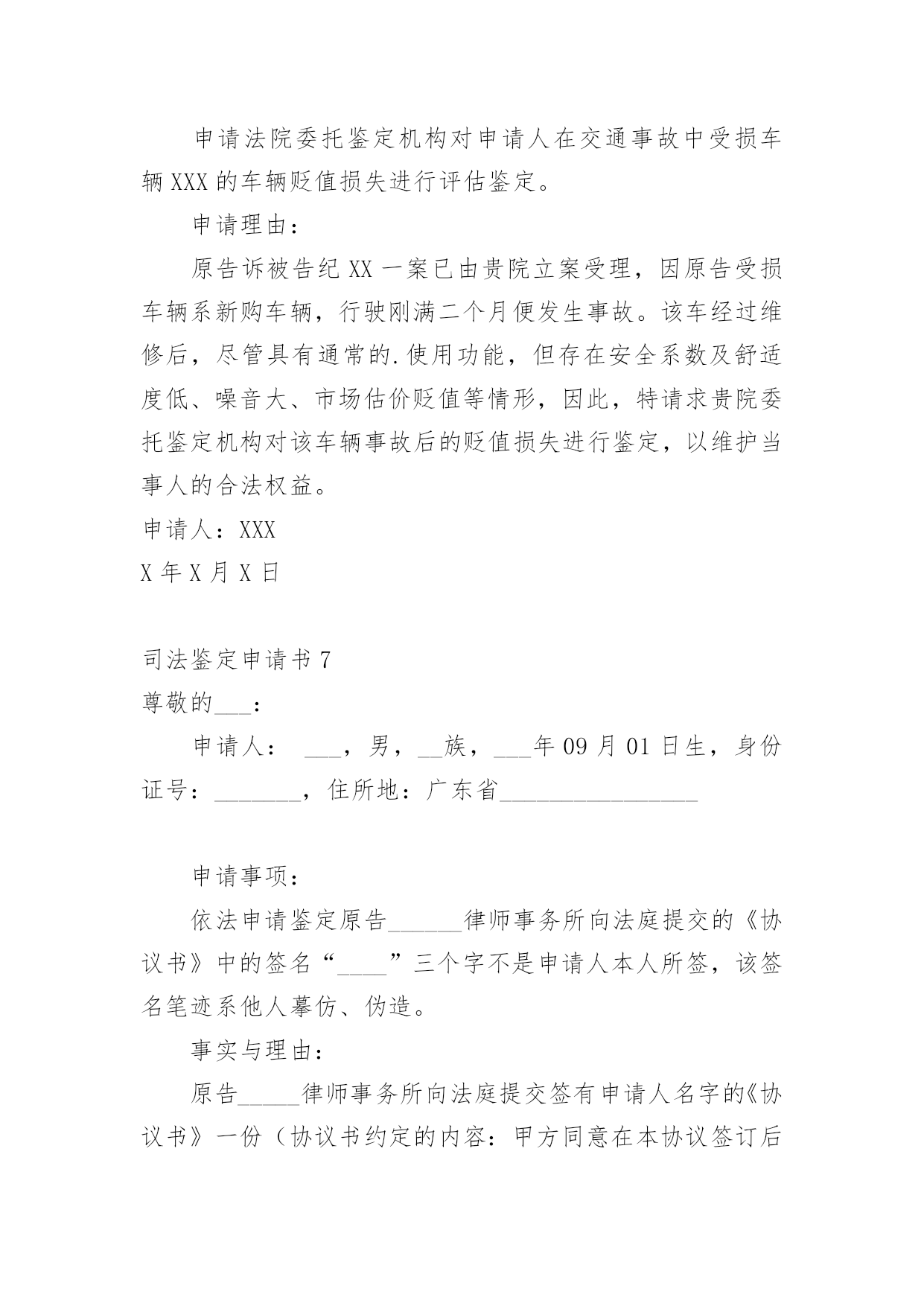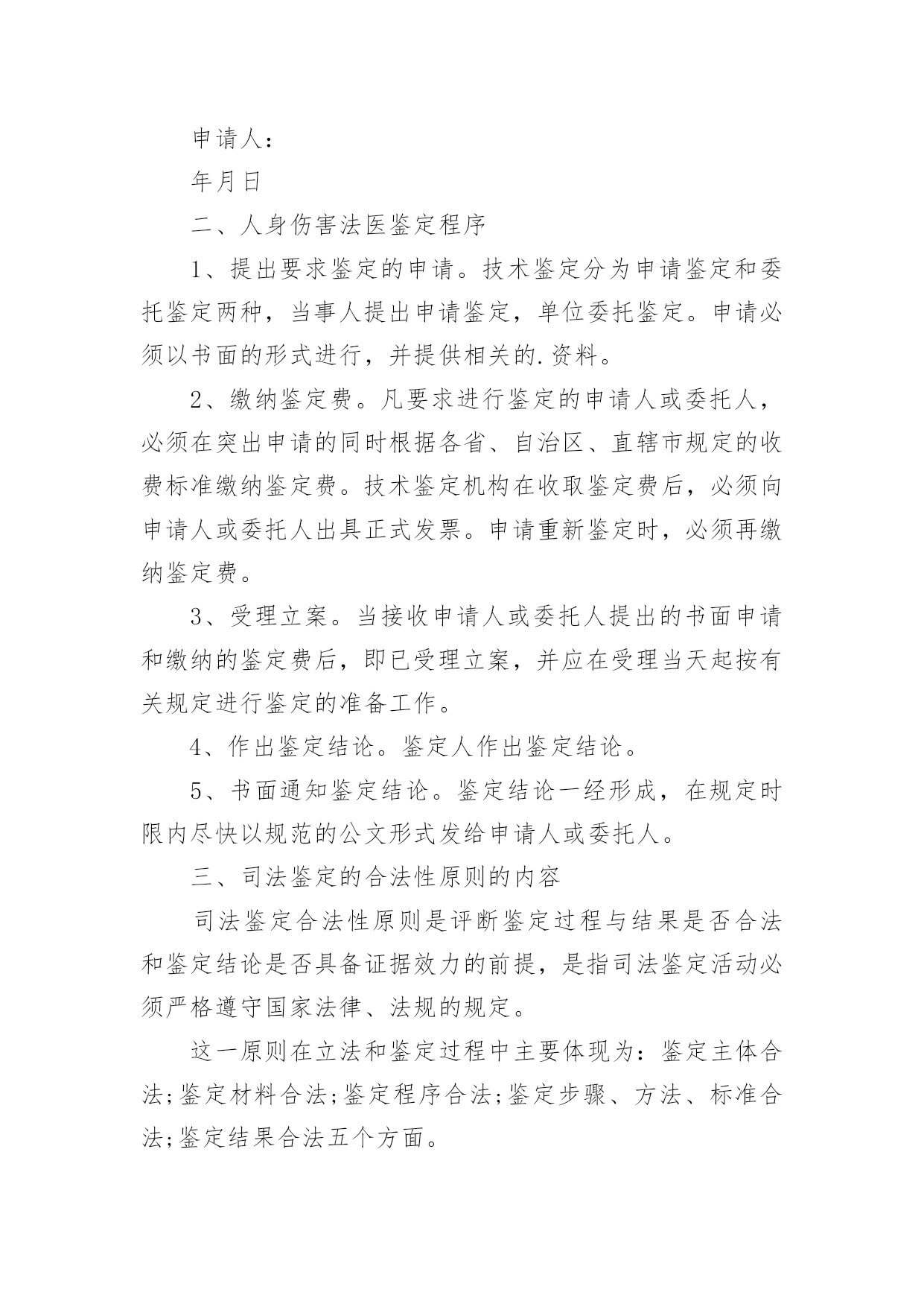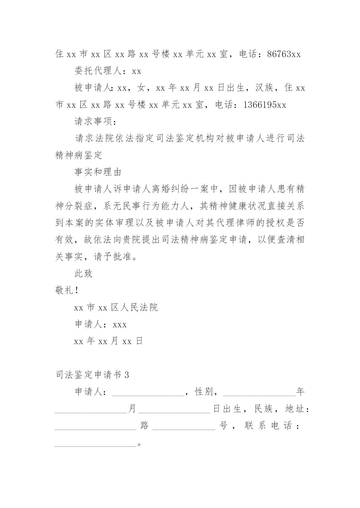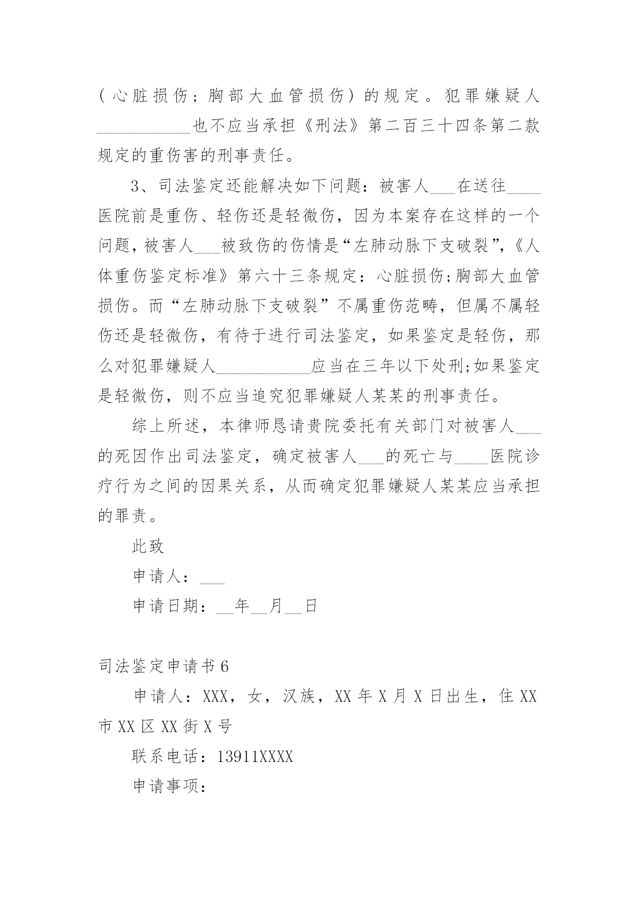 司法鉴定申请书我们眼下的社会,申请书起到的作用越来越大,我们可以将自己的愿望和请求写进申请书里。那么相关的申请书到底怎么写呢?以下是小编帮大家整理的司法鉴定申请书,欢迎大家借鉴与参考,希望对大家有所帮助。司法鉴定申请书1一、申请司法鉴定申请书范文是怎样的申请人:王XX,男,汉族,1976年11月19日出生,身份号码:XXXXXXXXXXXXXXXXXX,江西省XX市XX县人,现住广东省XX市XX县XX镇XX村XX队。联系电话:XXXXXXXXXXX案由:故意伤害刑事附带民事诉讼申请事项:对申请人受伤的后续治疗费用(含康复费)、营养费用、误工天数、休养期限和护理人数作出司法鉴定。事实与理由申请人是贵院受理的XXX故意伤害案的被害人、附带民事诉讼原告人,现在本人受伤尚未治愈,须要继续治疗、休养,为主张民事赔偿权利,特申请贵院指定相关鉴定机构对申请人受伤的后续治疗费用(含康复费)、营养费用、误工天数、休养期限和护理人数作出司法鉴定。为正确维护权益,请求法院准予我的申请事项。此致XX市XX区人民法院申请人:年月日二、人身伤害法医鉴定程序1、提出要求鉴定的申请。技术鉴定分为申请鉴定和委托鉴定两种,当事人提出申请鉴定,单位委托鉴定。申请必须以书面的形式进行,并提供相关的.资料。2、缴纳鉴定费。凡要求进行鉴定的申请人或委托人,必须在突出申请的同时根据各省、自治区、直辖市规定的收费标准缴纳鉴定费。技术鉴定机构在收取鉴定费后,必须向申请人或委托人出具正式发票。申请重新鉴定时,必须再缴纳鉴定费。3、受理立案。当接收申请人或委托人提出的书面申请和缴纳的鉴定费后,即已受理立案,并应在受理当天起按有关规定进行鉴定的准备工作。4、作出鉴定结论。鉴定人作出鉴定结论。5、书面通知鉴定结论。鉴定结论一经形成,在规定时限内尽快以规范的公文形式发给申请人或委托人。三、司法鉴定的合法性原则的内容司法鉴定合法性原则是评断鉴定过程与结果是否合法和鉴定结论是否具备证据效力的前提,是指司法鉴定活动必须严格遵守国家法律、法规的规定。这一原则在立法和鉴定过程中主要体现为:鉴定主体合法;鉴定材料合法;鉴定程序合法;鉴定步骤、方法、标准合法;鉴定结果合法五个方面。1、司法鉴定机构必须是按法律、法规、部门规章规定,经过省级以上司法机关审批,取得司法鉴定实施权的法定鉴定机构,或按规定程序委托的特定鉴定机构。司法鉴定人必须是具备规定的条件,获得司法鉴定人职业资格的执业许可证的自然人。2、司法鉴定材料主要是指鉴定对象及其作为被比较的样本(样品)。鉴定对象必须是法律规定的案件中的专门性问题,法律未作规定的专门性问题不能作为司法鉴定对象。如我国现阶段对司法心理测定(俗称测谎)、气味鉴别(警犬鉴定)等尚未作为法定鉴定对象,其鉴定结论不能作为证据。而且鉴定材料的来源(含提取、保存、运送、监督等)必须符合相关法律规定的要求。3、鉴定程序合法性,包括司法鉴定的提请、决定与委托、受理、实施、补充鉴定、重新鉴定、专家共同鉴定等各个环节上必须符合诉讼法和其他相关法律法规和部门规章的规定。4、鉴定的步骤、方法应当是经过法律确认的、有效的,鉴定标准要符合国家法定标准或部门(行业)标准。5、鉴定结果的合法性,主要表现为司法鉴定文书的合法性。鉴定文书必须具备法律规定的文书格式和必备的各项内容,鉴定结论必须符合证据要求和法律规范。司法鉴定申请书2申请人:某某某,男,xx年xx月xx日出生,汉族,住xx市xx区xx路xx号楼xx单元xx室,电话:86763xx委托代理人:xx被申请人:xx,女,xx年xx月xx日出生,汉族,住xx市xx区xx路xx号楼xx单元xx室,电话:1366195xx请求事项:请求法院依法指定司法鉴定机构对被申请人进行司法精神病鉴定事实和理由被申请人诉申请人离婚纠纷一案中,因被申请人患有精神分裂症,系无民事行为能力人,其精神健康状况直接关系到本案的实体审理以及被申请人对其代理律师的授权是否有效,故依法向贵院提出司法精神病鉴定申请,以便查清相关事实,请予批准。此致敬礼!xx市xx区人民法院申请人:xxxxx年xx月xx日司法鉴定申请书3申请人:_______________,性别,_______________年_______________月_______________日出生,民族,地址:_________________路_____________号,联系电话:_________________。被申请人:_________________医院。地址:_________________路_____________号,联系电话:_______________。法定代表人:_________________,职务:______________院长。申请事项:1、申请法院委托鉴定机构对____