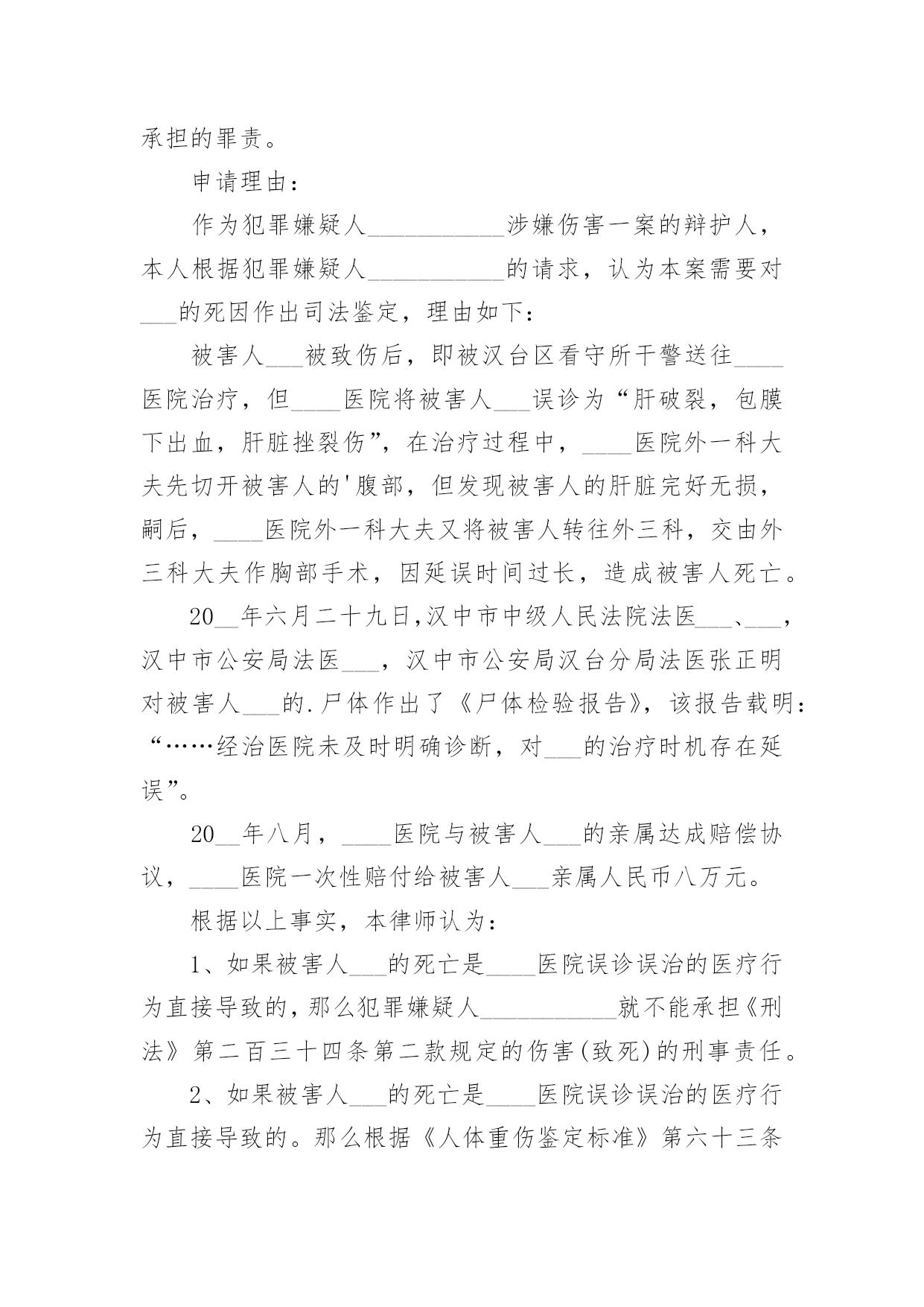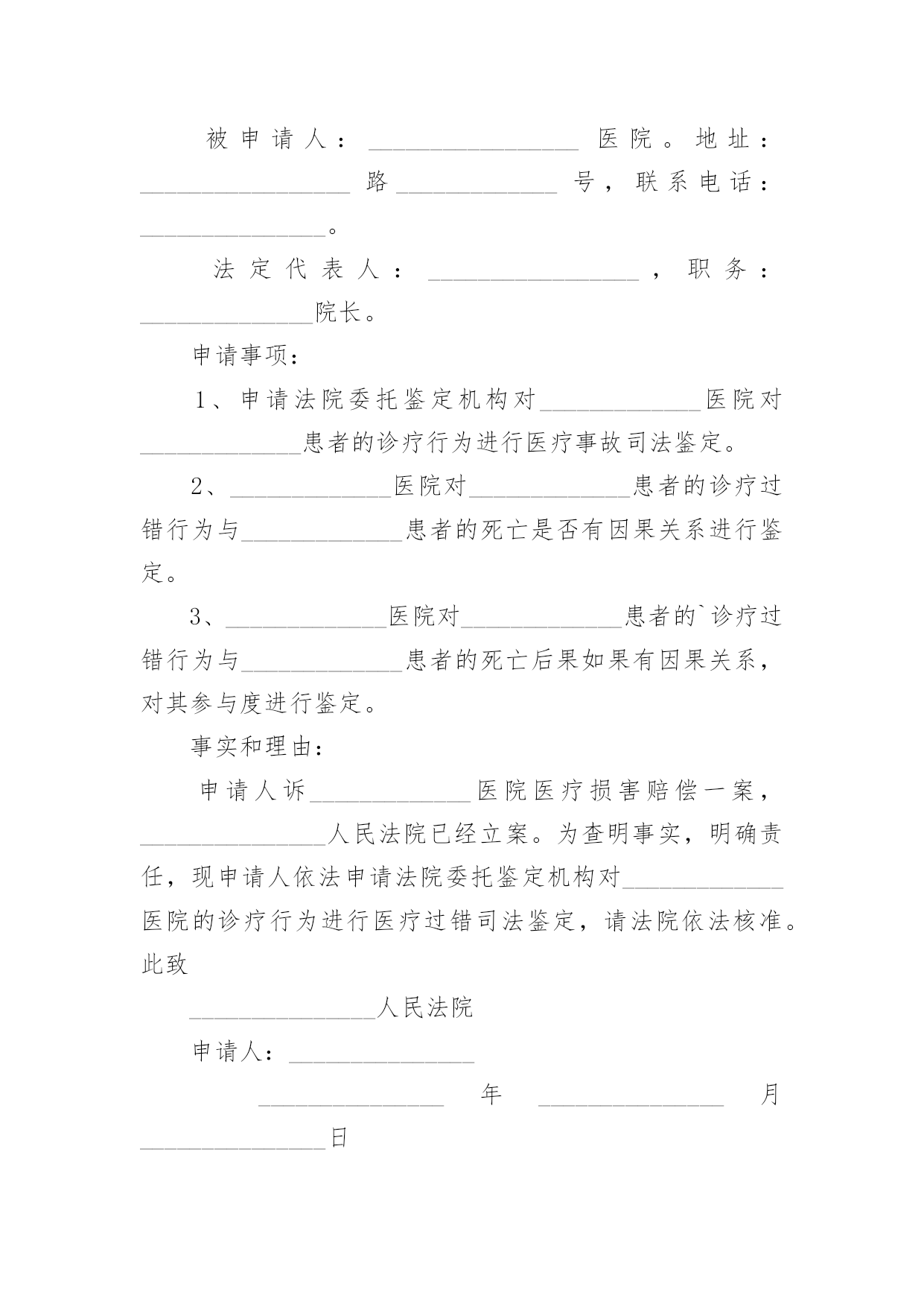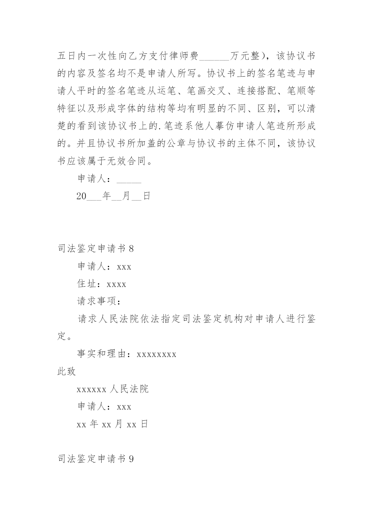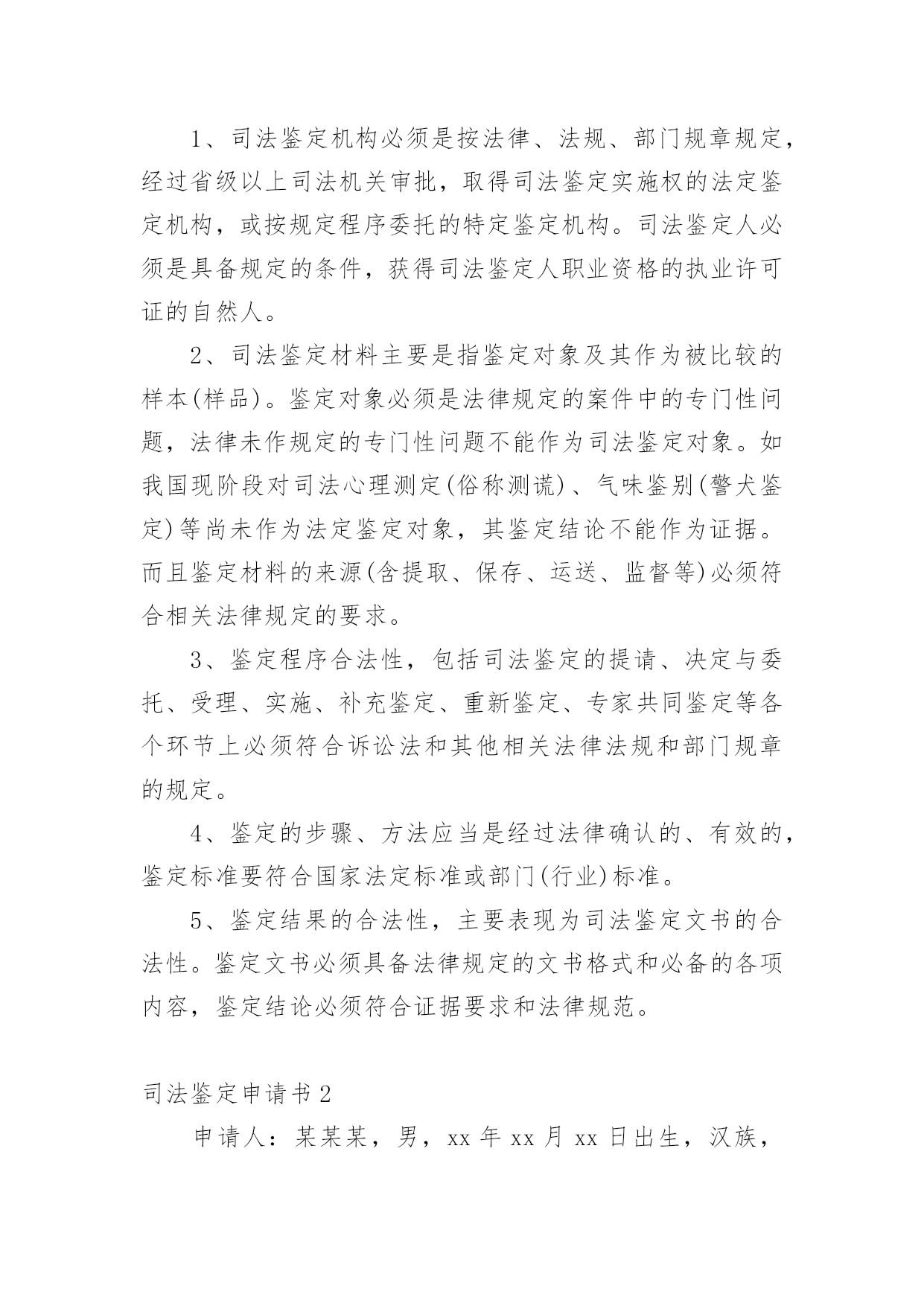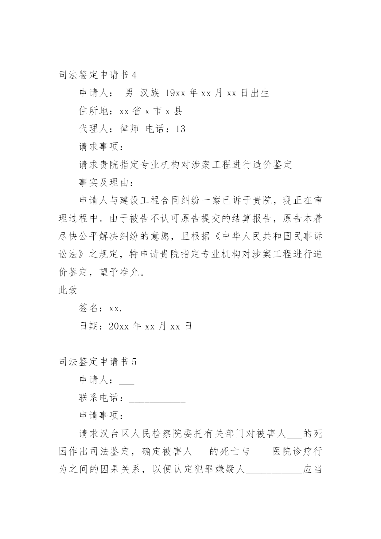 司法鉴定申请书我们眼下的社会,申请书起到的作用越来越大,我们可以将自己的愿望和请求写进申请书里。那么相关的申请书到底怎么写呢?以下是小编帮大家整理的司法鉴定申请书,欢迎大家借鉴与参考,希望对大家有所帮助。司法鉴定申请书1一、申请司法鉴定申请书范文是怎样的申请人:王XX,男,汉族,1976年11月19日出生,身份号码:XXXXXXXXXXXXXXXXXX,江西省XX市XX县人,现住广东省XX市XX县XX镇XX村XX队。联系电话:XXXXXXXXXXX案由:故意伤害刑事附带民事诉讼申请事项:对申请人受伤的后续治疗费用(含康复费)、营养费用、误工天数、休养期限和护理人数作出司法鉴定。事实与理由申请人是贵院受理的XXX故意伤害案的被害人、附带民事诉讼原告人,现在本人受伤尚未治愈,须要继续治疗、休养,为主张民事赔偿权利,特申请贵院指定相关鉴定机构对申请人受伤的后续治疗费用(含康复费)、营养费用、误工天数、休养期限和护理人数作出司法鉴定。为正确维护权益,请求法院准予我的申请事项。此致XX市XX区人民法院申请人:年月日二、人身伤害法医鉴定程序1、提出要求鉴定的申请。技术鉴定分为申请鉴定和委托鉴定两种,当事人提出申请鉴定,单位委托鉴定。申请必须以书面的形式进行,并提供相关的.资料。2、缴纳鉴定费。凡要求进行鉴定的申请人或委托人,必须在突出申请的同时根据各省、自治区、直辖市规定的收费标准缴纳鉴定费。技术鉴定机构在收取鉴定费后,必须向申请人或委托人出具正式发票。申请重新鉴定时,必须再缴纳鉴定费。3、受理立案。当接收申请人或委托人提出的书面申请和缴纳的鉴定费后,即已受理立案,并应在受理当天起按有关规定进行鉴定的准备工作。4、作出鉴定结论。鉴定人作出鉴定结论。5、书面通知鉴定结论。鉴定结论一经形成,在规定时限内尽快以规范的公文形式发给申请人或委托人。三、司法鉴定的合法性原则的内容司法鉴定合法性原则是评断鉴定过程与结果是否合法和鉴定结论是否具备证据效力的前提,是指司法鉴定活动必须严格遵守国家法律、法规的规定。这一原则在立法和鉴定过程中主要体现为:鉴定主体合法;鉴定材料合法;鉴定程序合法;鉴定步骤、方法、标准合法;鉴定结果合法五个方面。1、司法鉴定机构必须是按法律、法规、部门规章规定,经过省级以上司法机关审批,取得司法鉴定实施权的法定鉴定机构,或按规定程序委托的特定鉴定机构。司法鉴定人必须是具备规定的条件,获得司法鉴定人职业资格的执业许可证的自然人。2、司法鉴定材料主要是指鉴定对象及其作为被比较的样本(样品)。鉴定对象必须是法律规定的案件中的专门性问题,法律未作规定的专门性问题不能作为司法鉴定对象。如我国现阶段对司法心理测定(俗称测谎)、气味鉴别(警犬鉴定)等尚未作为法定鉴定对象,其鉴定结论不能作为证据。而且鉴定材料的来源(含提取、保存、运送、监督等)必须符合相关法律规定的要求。3、鉴定程序合法性,包括司法鉴定的提请、决定与委托、受理、实施、补充鉴定、重新鉴定、专家共同鉴定等各个环节上必须符合诉讼法和其他相关法律法规和部门规章的规定。4、鉴定的步骤、方法应当是经过法律确认的、有效的,鉴定标准要符合国家法定标准或部门(行业)标准。5、鉴定结果的合法性,主要表现为司法鉴定文书的合法性。鉴定文书必须具备法律规定的文书格式和必备的各项内容,鉴定结论必须符合证据要求和法律规范。司法鉴定申请书2申请人:某某某,男,xx年xx月xx日出生,汉族,住xx市xx区xx路xx号楼xx单元xx室,电话:86763xx委托代理人:xx被申请人:xx,女,xx年xx月xx日出生,汉族,住xx市xx区xx路xx号楼xx单元xx室,电话:1366195xx请求事项:请求法院依法指定司法鉴定机构对被申请人进行司法精神病鉴定事实和理由被申请人诉申请人离婚纠纷一案中,因被申请人患有精神分裂症,系无民事行为能力人,其精神健康状况直接关系到本案的实体审理以及被申请人对其代理律师的授权是否有效,故依法向贵院提出司法精神病鉴定申请,以便查清相关事实,请予批准。此致敬礼!xx市xx区人民法院申请人:xxxxx年xx月xx日司法鉴定申请书3申请人:_______________,性别,_______________年_______________月_______________日出生,民族,地址:_________________路_____________号,联系电话:_________________。被申请人:_________________医院。地址:_________________路_____________号,联系电话:_______________。法定代表人:_________________,职务:______________院长。申请事项:1、申请法院委托鉴定机构对____