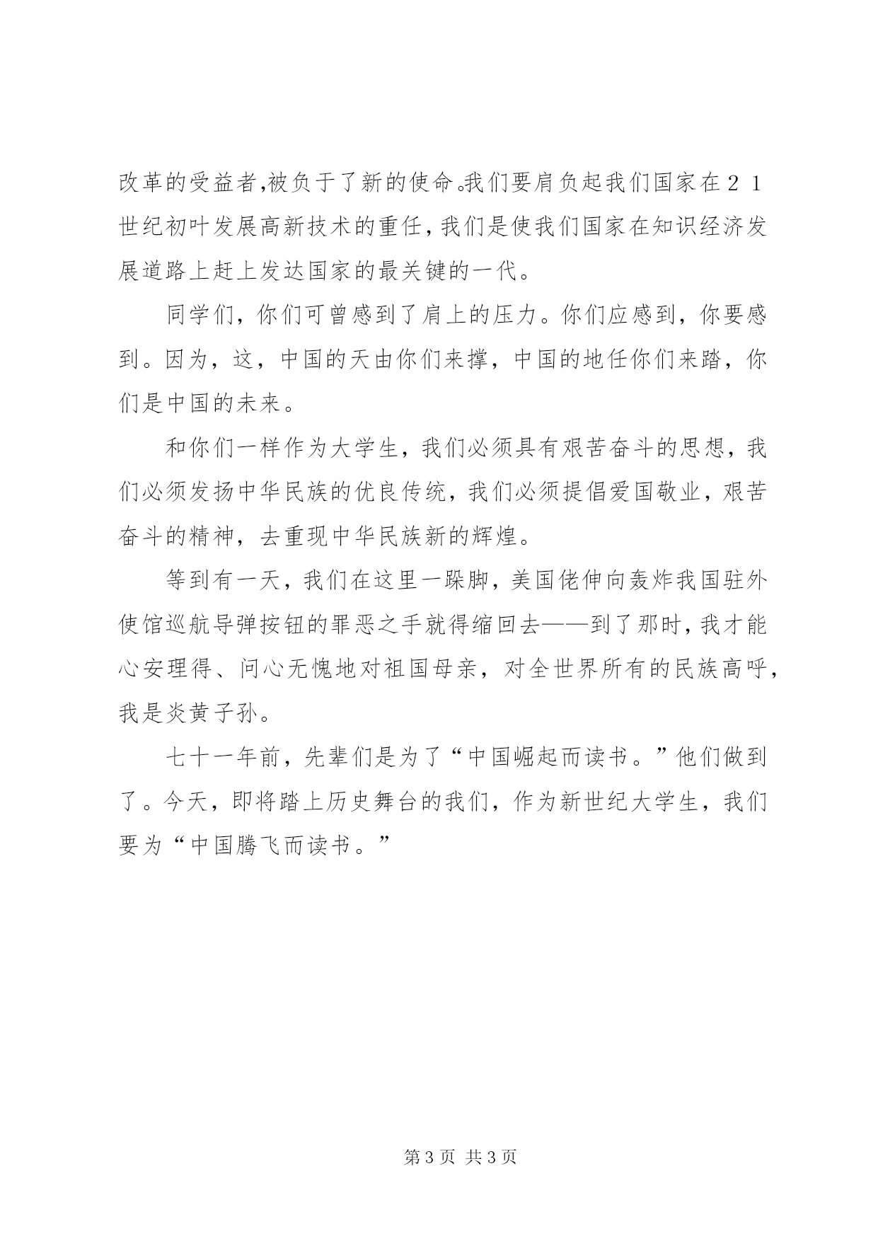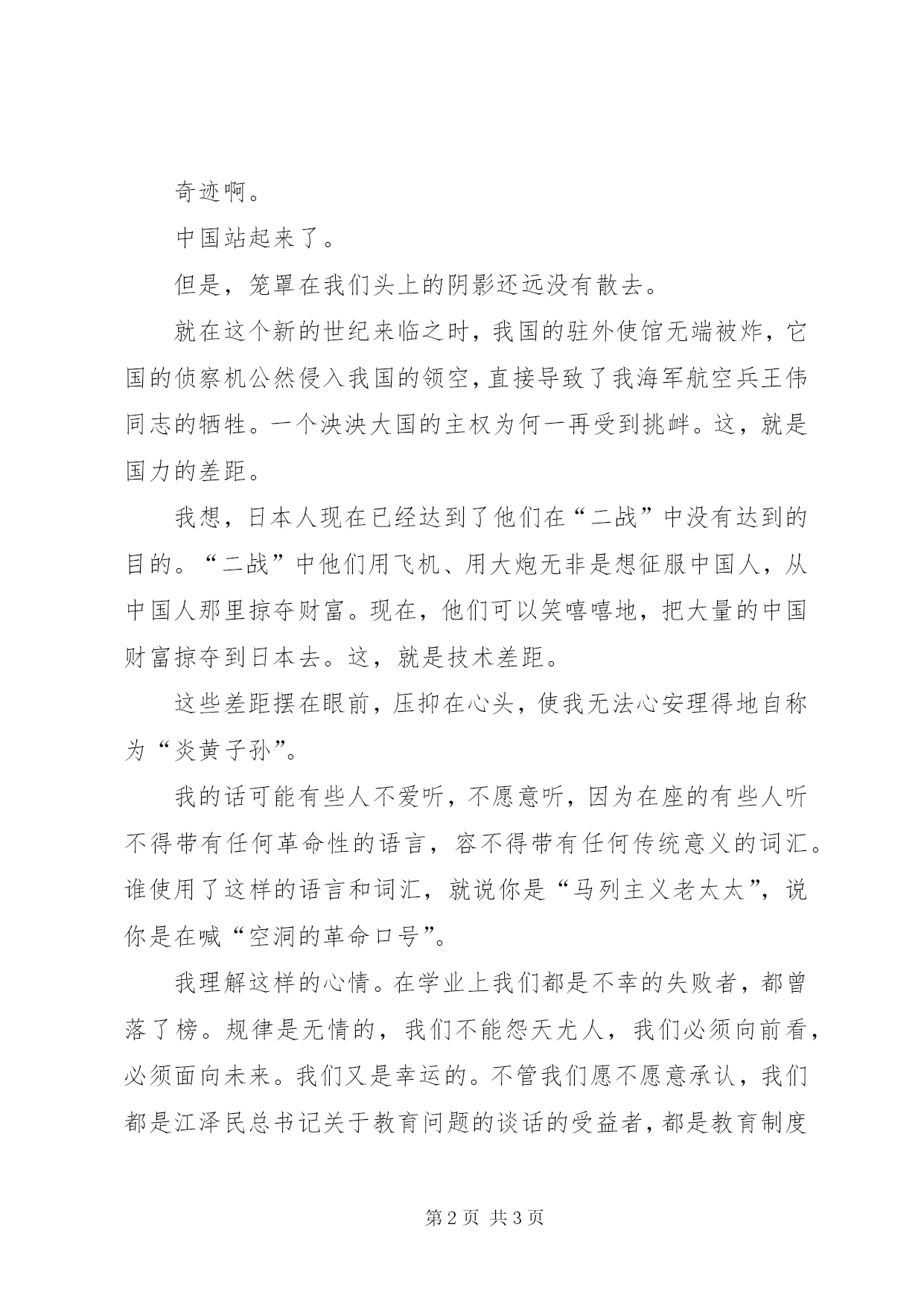 第PAGE\*Arabic\*MERGEFORMAT3页共NUMPAGES\*MERGEFORMAT3页纪念一二·九运动演讲值此纪念一二·九运动周年之际,能够站在这里演讲我感到高兴与荣幸。经过了七十年的一二·九运动,早已记入了中国革命的历史。它的事迹,它的精神也早已铭刻进了我们在座每一位的心中。我在这里就不再多作赘述了,因为它永远不会退色,在我们心中,它的精神只会越来越崇高,越来越伟大。今天,站在这里回眸20世纪,我们发现,科学技术从来没有像今天这样深刻地影响和改变着社会、经济、文化、观念——以至我们赖以生存的地球。当人告别茹毛饮血,刀耕火种的蒙昧时代,经过了数千年的血雨腥风,艰辛跋涉,终于迎来了一个新时代。蒸汽机的出现和电的发明,把人类从农业经济社会带入工业经济社会。机器的轰鸣打破了往日的宁静,灿烂的灯光照亮了千家万户,目不暇接的新发现、新发明使人类成就了超越过去数千年创造的文明总和几百倍的业绩。历史悠久的中国却因为没有跟上工业革命的步伐而在近代落伍了,并因落伍而遭受帝国主义列强的凌辱。为了重新崛起、雪洗国耻,中华民族的仁人志士在黑暗中探索,奋斗了100多年,直到新中国的成立为中华民族点燃了重新崛起的希望。在中国共产党的带领下,我们的先辈们使中国发生了翻天覆地的变化,创造出了10多亿人的大国连续保持10多年的高速增长。奇迹啊。中国站起来了。但是,笼罩在我们头上的阴影还远没有散去。就在这个新的世纪来临之时,我国的驻外使馆无端被炸,它国的侦察机公然侵入我国的领空,直接导致了我海军航空兵王伟同志的牺牲。一个泱泱大国的主权为何一再受到挑衅。这,就是国力的差距。我想,日本人现在已经达到了他们在“二战”中没有达到的目的。“二战”中他们用飞机、用大炮无非是想征服中国人,从中国人那里掠夺财富。现在,他们可以笑嘻嘻地,把大量的中国财富掠夺到日本去。这,就是技术差距。这些差距摆在眼前,压抑在心头,使我无法心安理得地自称为“炎黄子孙”。我的话可能有些人不爱听,不愿意听,因为在座的有些人听不得带有任何革命性的语言,容不得带有任何传统意义的词汇。谁使用了这样的语言和词汇,就说你是“马列主义老太太”,说你是在喊“空洞的革命口号”。我理解这样的心情。在学业上我们都是不幸的失败者,都曾落了榜。规律是无情的,我们不能怨天尤人,我们必须向前看,必须面向未来。我们又是幸运的。不管我们愿不愿意承认,我们都是江泽民总书记关于教育问题的谈话的受益者,都是教育制度改革的受益者,被负于了新的使命。我们要肩负起我们国家在21世纪初叶发展高新技术的重任,我们是使我们国家在知识经济发展道路上赶上发达国家的最关键的一代。同学们,你们可曾感到了肩上的压力。你们应感到,你要感到。因为,这,中国的天由你们来撑,中国的地任你们来踏,你们是中国的未来。和你们一样作为大学生,我们必须具有艰苦奋斗的思想,我们必须发扬中华民族的优良传统,我们必须提倡爱国敬业,艰苦奋斗的精神,去重现中华民族新的辉煌。等到有一天,我们在这里一跺脚,美国佬伸向轰炸我国驻外使馆巡航导弹按钮的罪恶之手就得缩回去——到了那时,我才能心安理得、问心无愧地对祖国母亲,对全世界所有的民族高呼,我是炎黄子孙。七十一年前,先辈们是为了“中国崛起而读书。”他们做到了。今天,即将踏上历史舞台的我们,作为新世纪大学生,我们要为“中国腾飞而读书。”