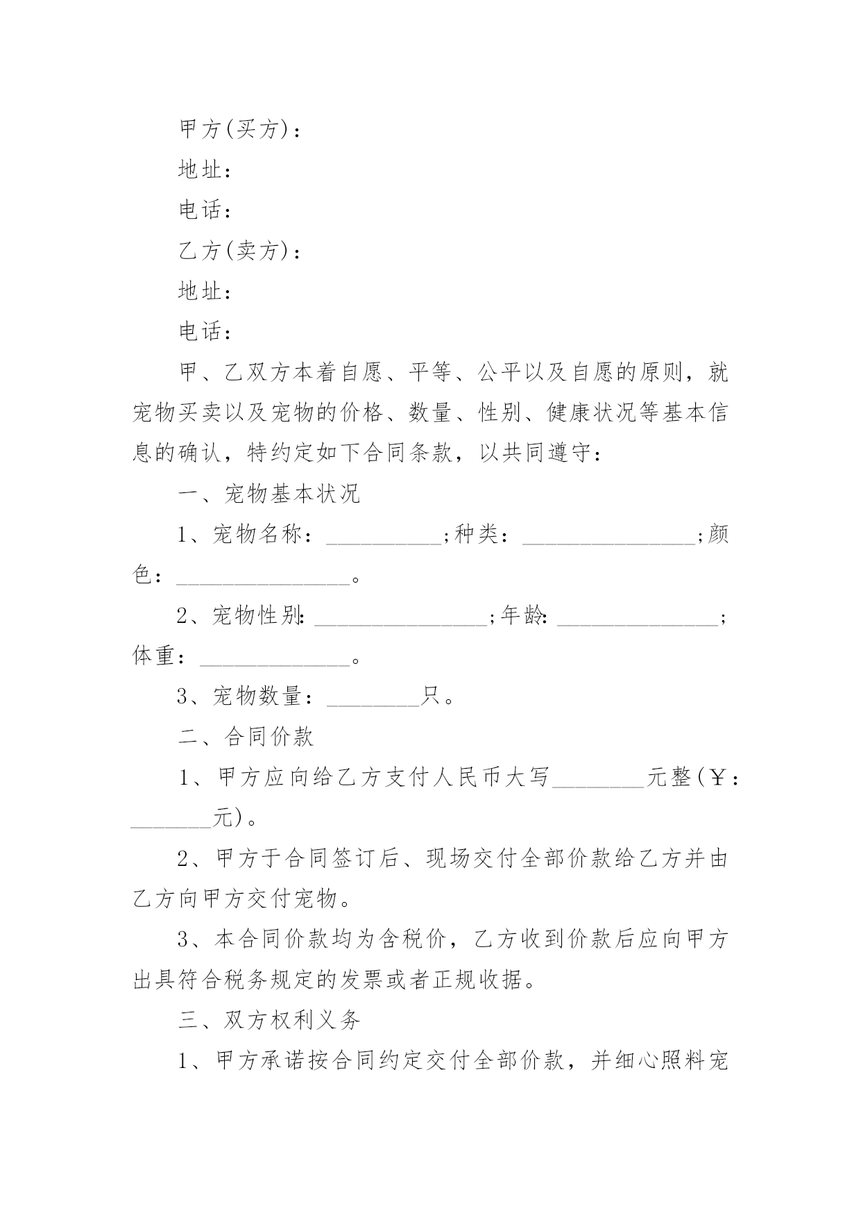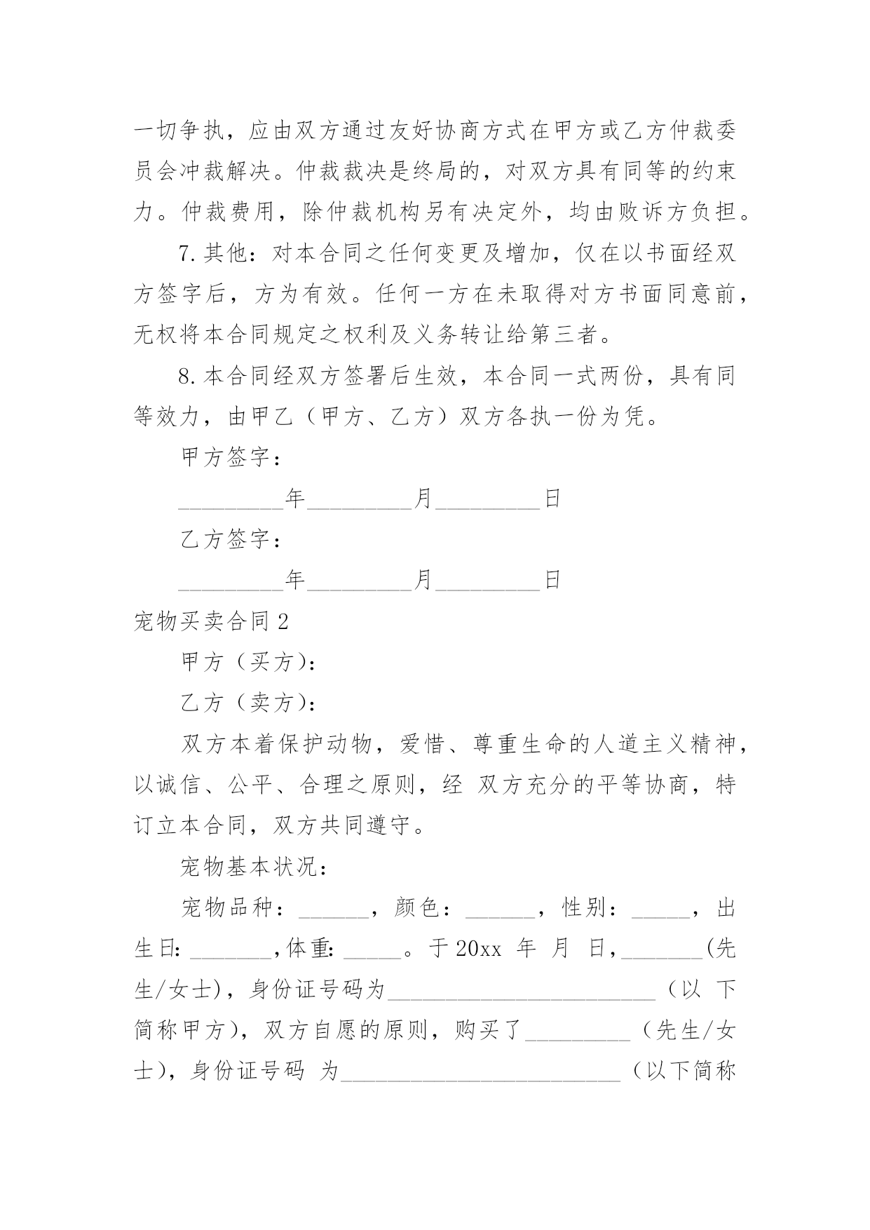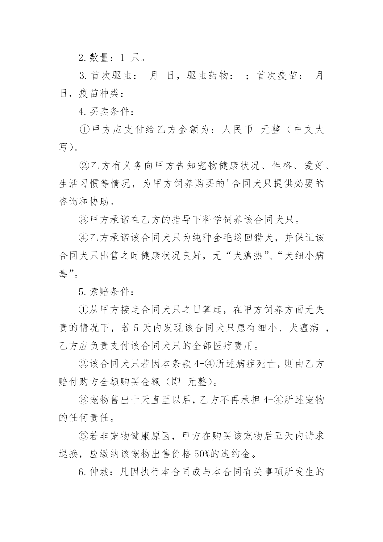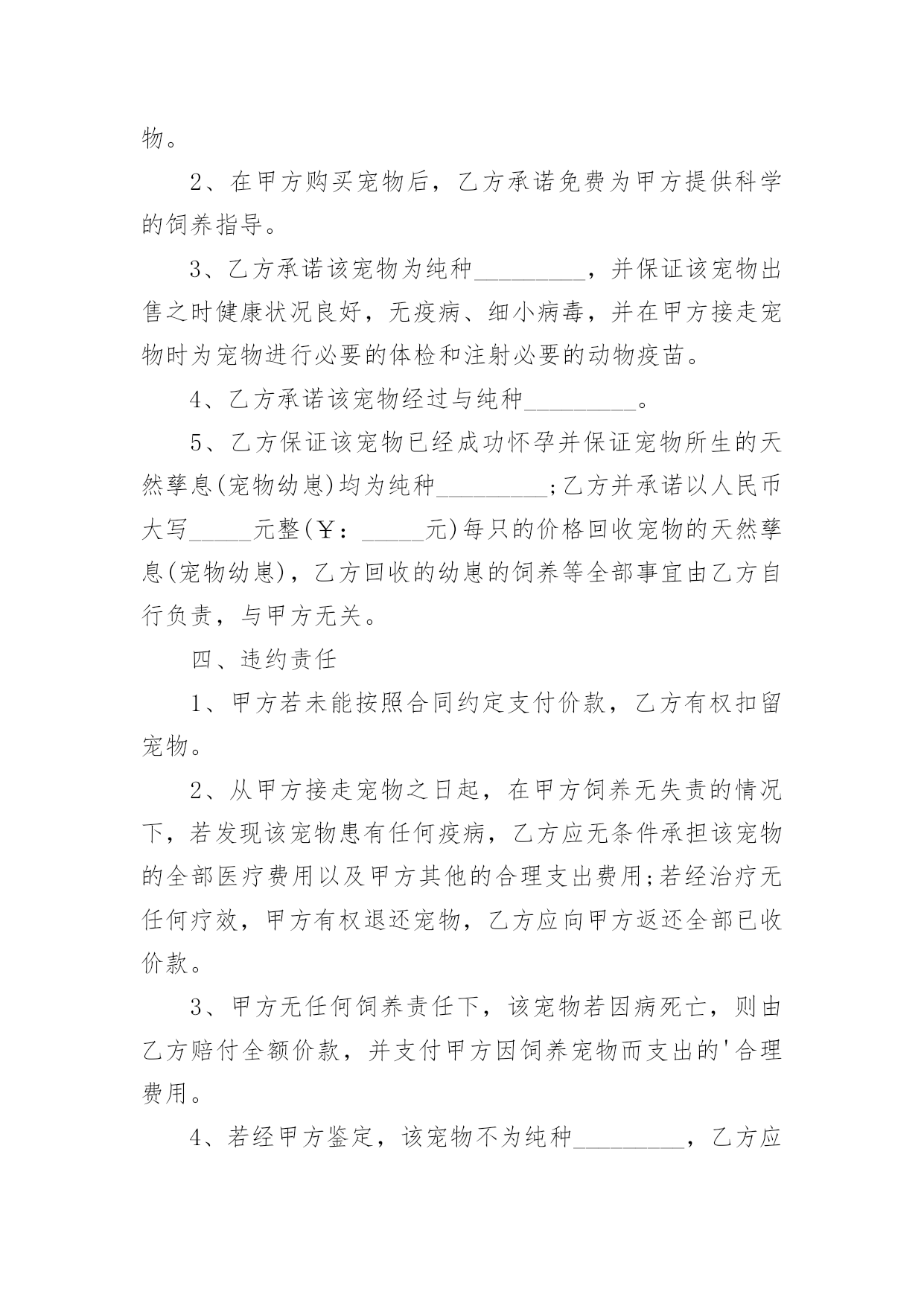 宠物买卖合同宠物买卖合同集锦(15篇)随着法律知识的普及,人们运用到合同的场合不断增多,在达成意见一致时,制定合同可以享有一定的自由。那么问题来了,到底应如何拟定合同呢?下面是小编为大家整理的宠物买卖合同,欢迎大家分享。宠物买卖合同1甲方(买方):乙方(卖方):双方本着保护动物,爱惜、尊重生命的人道主义精神,以诚信、公平、合理之原则,经双方充分的平等协商,特订立本合同,双方共同遵守。宠物基本状况:宠物品种:金毛巡回猎犬,颜色:______,性别:_____,年龄:______,体重:_____。于20年月日,_______(先生/女士)以下简称甲方,双方自愿的原则,购买了_________(先生/女士),以下简称乙方的金毛巡回猎犬(以下简称合同犬只)。其合同犬只的价格、数量、性别、健康状况等方面,经双方确认,签署本合同,其条款如下:1.合同犬只为:纯种金毛巡回猎犬(样子为附件照片),个月(公/母)犬。2.数量:1只。3.首次驱虫:月日,驱虫药物:;首次疫苗:月日,疫苗种类:4.买卖条件:①甲方应支付给乙方金额为:人民币元整(中文大写)。②乙方有义务向甲方告知宠物健康状况、性格、爱好、生活习惯等情况,为甲方饲养购买的'合同犬只提供必要的咨询和协助。③甲方承诺在乙方的指导下科学饲养该合同犬只。④乙方承诺该合同犬只为纯种金毛巡回猎犬,并保证该合同犬只出售之时健康状况良好,无“犬瘟热”、“犬细小病毒”。5.索赔条件:①从甲方接走合同犬只之日算起,在甲方饲养方面无失责的情况下,若5天内发现该合同犬只患有细小、犬瘟病,乙方应负责支付该合同犬只的全部医疗费用。②该合同犬只若因本条款4-④所述病症死亡,则由乙方赔付购方全额购买金额(即元整)。③宠物售出十天直至以后,乙方不再承担4-④所述宠物的任何责任。⑤若非宠物健康原因,甲方在购买该宠物后五天内请求退换,应缴纳该宠物出售价格50%的违约金。6.仲裁:凡因执行本合同或与本合同有关事项所发生的一切争执,应由双方通过友好协商方式在甲方或乙方仲裁委员会冲裁解决。仲裁裁决是终局的,对双方具有同等的约束力。仲裁费用,除仲裁机构另有决定外,均由败诉方负担。7.其他:对本合同之任何变更及增加,仅在以书面经双方签字后,方为有效。任何一方在未取得对方书面同意前,无权将本合同规定之权利及义务转让给第三者。8.本合同经双方签署后生效,本合同一式两份,具有同等效力,由甲乙(甲方、乙方)双方各执一份为凭。甲方签字:_________年_________月_________日乙方签字:_________年_________月_________日宠物买卖合同2甲方(买方):乙方(卖方):双方本着保护动物,爱惜、尊重生命的人道主义精神,以诚信、公平、合理之原则,经双方充分的平等协商,特订立本合同,双方共同遵守。宠物基本状况:宠物品种:______,颜色:______,性别:_____,出生日:_______,体重:_____。于20xx年月日,_______(先生/女士),身份证号码为_______________________(以下简称甲方),双方自愿的原则,购买了_________(先生/女士),身份证号码为________________________(以下简称乙方)的哈士奇(以下简称合同犬只)。其合同犬只的价格、性别、健康状况等方面,经双方确认,签署本合同,其条款如下:1.合同犬只类型为:_______,年龄:__个月。2.数量:1只。3.首次驱虫:__月__日,驱虫药物:________;首次疫苗:__月__日,疫苗种类:____4.买卖条件:①甲方应支付给乙方金额为:人民币__________元整(中文大写)。②乙方有义务向甲方告知宠物健康状况、性格、爱好、生活习惯等情况,为甲方饲养购买的.合同犬只提供必要的咨询和协助。③甲方承诺关心爱护并且科学饲养该合同犬只。④乙方承诺该合同犬只为纯种哈士奇,并保证该合同犬只出售之时健康状况良好,无“犬瘟热”、“犬细小病毒”。5.索赔条件:①从甲方接走合同犬只之日算起,在甲方饲养方面无失责的情况下,若15天内发现该合同犬只患有细小、犬瘟病,乙方应负责支付该合同犬只的全部医疗费用。②该合同犬只若因本条款4-④所述病症死亡,则由乙方赔付购方全额购买金额(即元整)。③宠物售出十五天直至以后,乙方不再承担所述宠物的责任。⑤若非宠物健康原因,甲方在购买该宠物后五天内请求退换,应支付该宠物出售价格50%的违约金,即乙方只须返还购买金额的50%。6.诉讼:因执行本合同或与本合同有关事项发生争执的,应由双方通过友好协商方式解决,协商不成功,以至于必须要诉至法院的,双方确定眉山市东坡区人民法院为有管辖权的法院。法院判决是终局的,对双方具有同等约束力。诉讼引起的费用,均由败诉方负担。因此,
