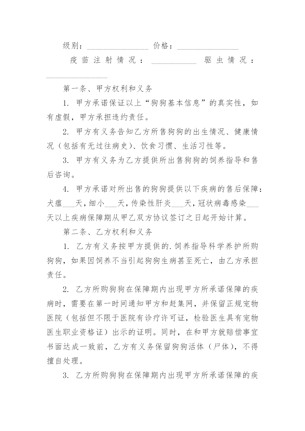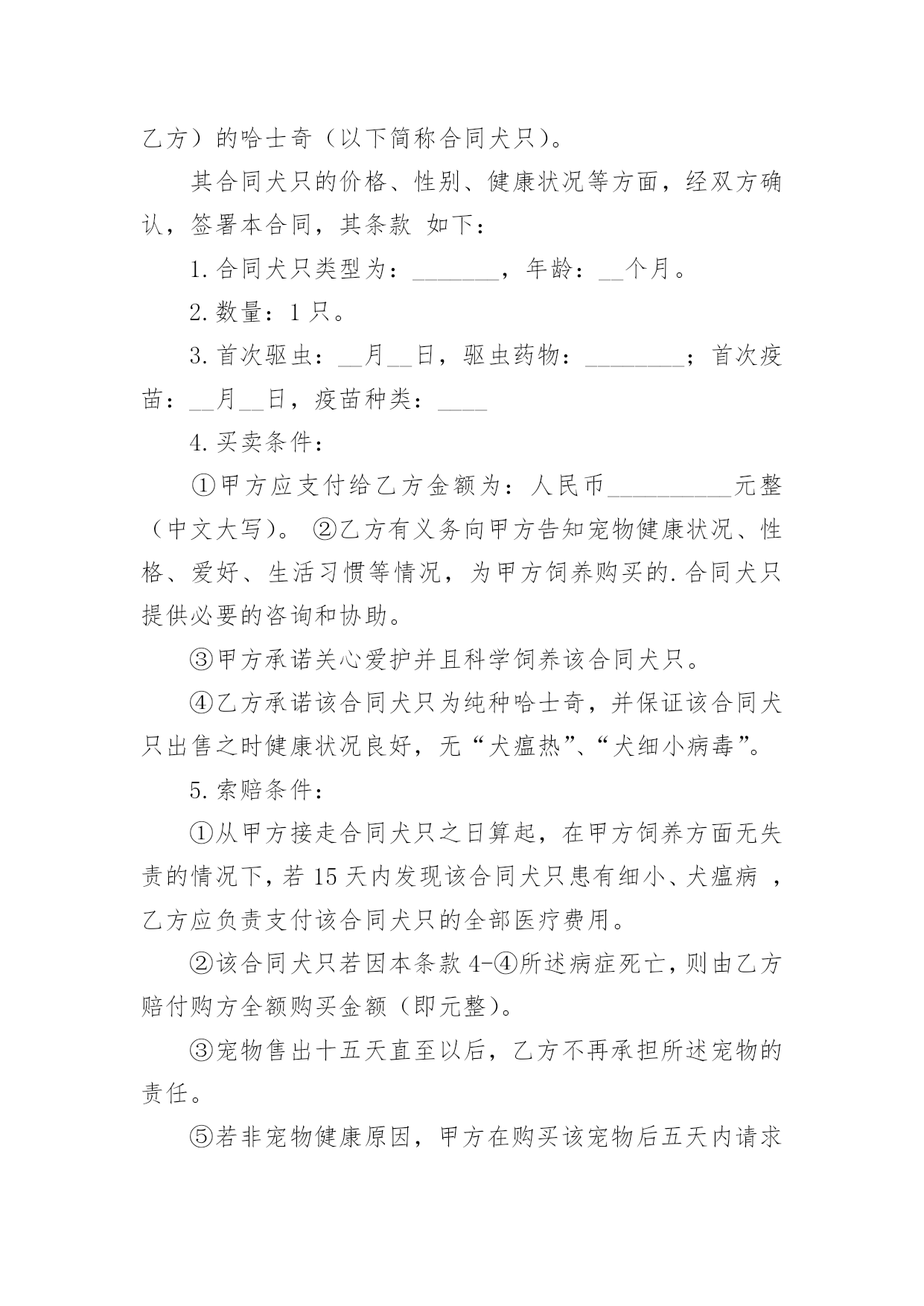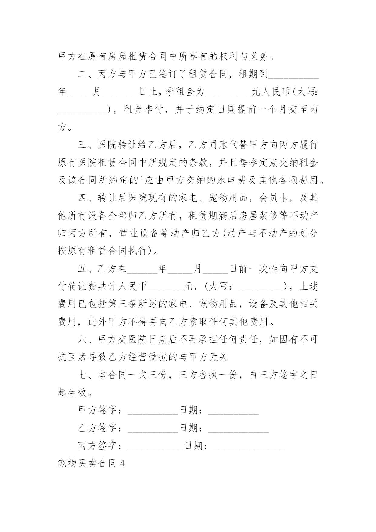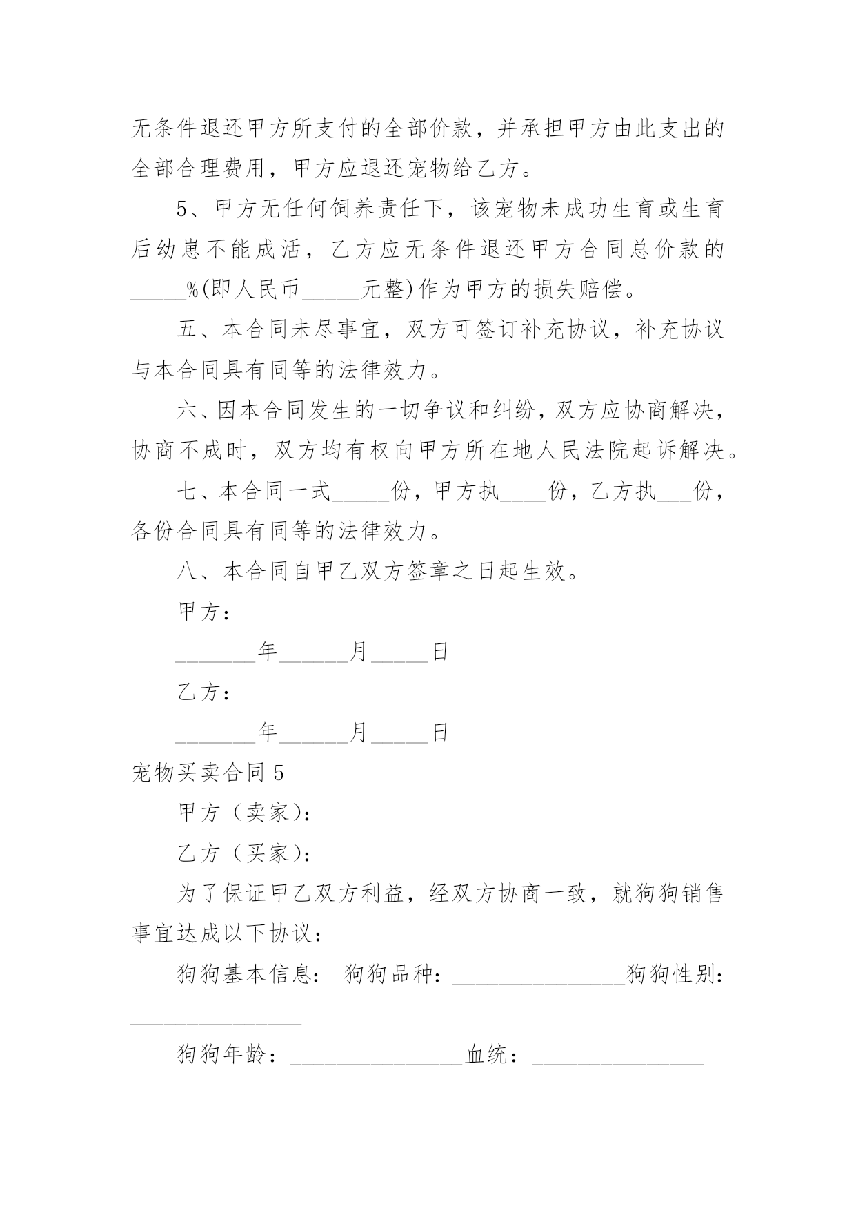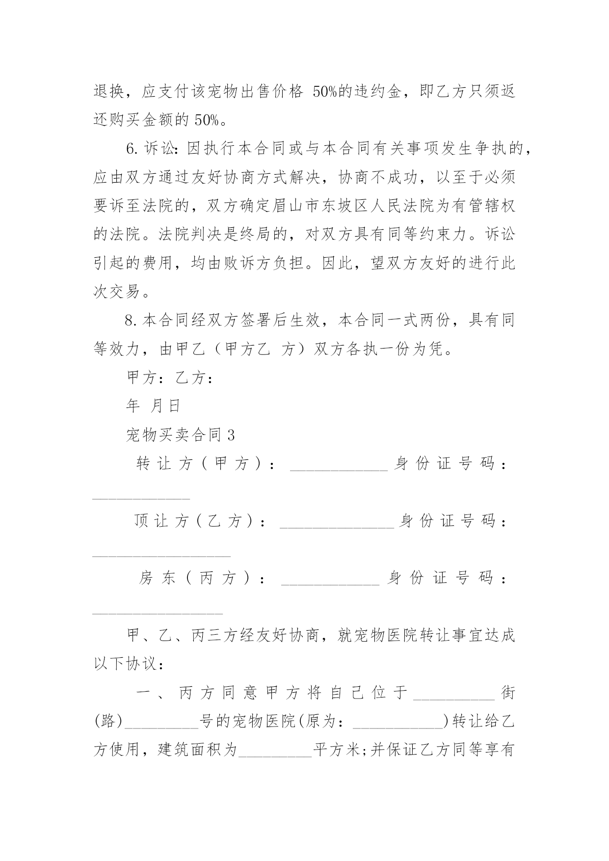 宠物买卖合同宠物买卖合同集锦(15篇)随着法律知识的普及,人们运用到合同的场合不断增多,在达成意见一致时,制定合同可以享有一定的自由。那么问题来了,到底应如何拟定合同呢?下面是小编为大家整理的宠物买卖合同,欢迎大家分享。宠物买卖合同1甲方(买方):乙方(卖方):双方本着保护动物,爱惜、尊重生命的人道主义精神,以诚信、公平、合理之原则,经双方充分的平等协商,特订立本合同,双方共同遵守。宠物基本状况:宠物品种:金毛巡回猎犬,颜色:______,性别:_____,年龄:______,体重:_____。于20年月日,_______(先生/女士)以下简称甲方,双方自愿的原则,购买了_________(先生/女士),以下简称乙方的金毛巡回猎犬(以下简称合同犬只)。其合同犬只的价格、数量、性别、健康状况等方面,经双方确认,签署本合同,其条款如下:1.合同犬只为:纯种金毛巡回猎犬(样子为附件照片),个月(公/母)犬。2.数量:1只。3.首次驱虫:月日,驱虫药物:;首次疫苗:月日,疫苗种类:4.买卖条件:①甲方应支付给乙方金额为:人民币元整(中文大写)。②乙方有义务向甲方告知宠物健康状况、性格、爱好、生活习惯等情况,为甲方饲养购买的'合同犬只提供必要的咨询和协助。③甲方承诺在乙方的指导下科学饲养该合同犬只。④乙方承诺该合同犬只为纯种金毛巡回猎犬,并保证该合同犬只出售之时健康状况良好,无“犬瘟热”、“犬细小病毒”。5.索赔条件:①从甲方接走合同犬只之日算起,在甲方饲养方面无失责的情况下,若5天内发现该合同犬只患有细小、犬瘟病,乙方应负责支付该合同犬只的全部医疗费用。②该合同犬只若因本条款4-④所述病症死亡,则由乙方赔付购方全额购买金额(即元整)。③宠物售出十天直至以后,乙方不再承担4-④所述宠物的任何责任。⑤若非宠物健康原因,甲方在购买该宠物后五天内请求退换,应缴纳该宠物出售价格50%的违约金。6.仲裁:凡因执行本合同或与本合同有关事项所发生的一切争执,应由双方通过友好协商方式在甲方或乙方仲裁委员会冲裁解决。仲裁裁决是终局的,对双方具有同等的约束力。仲裁费用,除仲裁机构另有决定外,均由败诉方负担。7.其他:对本合同之任何变更及增加,仅在以书面经双方签字后,方为有效。任何一方在未取得对方书面同意前,无权将本合同规定之权利及义务转让给第三者。8.本合同经双方签署后生效,本合同一式两份,具有同等效力,由甲乙(甲方、乙方)双方各执一份为凭。甲方签字:_________年_________月_________日乙方签字:_________年_________月_________日宠物买卖合同2甲方(买方):乙方(卖方):双方本着保护动物,爱惜、尊重生命的人道主义精神,以诚信、公平、合理之原则,经双方充分的平等协商,特订立本合同,双方共同遵守。宠物基本状况:宠物品种:______,颜色:______,性别:_____,出生日:_______,体重:_____。于20xx年月日,_______(先生/女士),身份证号码为_______________________(以下简称甲方),双方自愿的原则,购买了_________(先生/女士),身份证号码为________________________(以下简称乙方)的哈士奇(以下简称合同犬只)。其合同犬只的价格、性别、健康状况等方面,经双方确认,签署本合同,其条款如下:1.合同犬只类型为:_______,年龄:__个月。2.数量:1只。3.首次驱虫:__月__日,驱虫药物:________;首次疫苗:__月__日,疫苗种类:____4.买卖条件:①甲方应支付给乙方金额为:人民币__________元整(中文大写)。②乙方有义务向甲方告知宠物健康状况、性格、爱好、生活习惯等情况,为甲方饲养购买的.合同犬只提供必要的咨询和协助。③甲方承诺关心爱护并且科学饲养该合同犬只。④乙方承诺该合同犬只为纯种哈士奇,并保证该合同犬只出售之时健康状况良好,无“犬瘟热”、“犬细小病毒”。5.索赔条件:①从甲方接走合同犬只之日算起,在甲方饲养方面无失责的情况下,若15天内发现该合同犬只患有细小、犬瘟病,乙方应负责支付该合同犬只的全部医疗费用。②该合同犬只若因本条款4-④所述病症死亡,则由乙方赔付购方全额购买金额(即元整)。③宠物售出十五天直至以后,乙方不再承担所述宠物的责任。⑤若非宠物健康原因,甲方在购买该宠物后五天内请求退换,应支付该宠物出售价格50%的违约金,即乙方只须返还购买金额的50%。6.诉讼:因执行本合同或与本合同有关事项发生争执的,应由双方通过友好协商方式解决,协商不成功,以至于必须要诉至法院的,双方确定眉山市东坡区人民法院为有管辖权的法院。法院判决是终局的,对双方具有同等约束力。诉讼引起的费用,均由败诉方负担。因此,