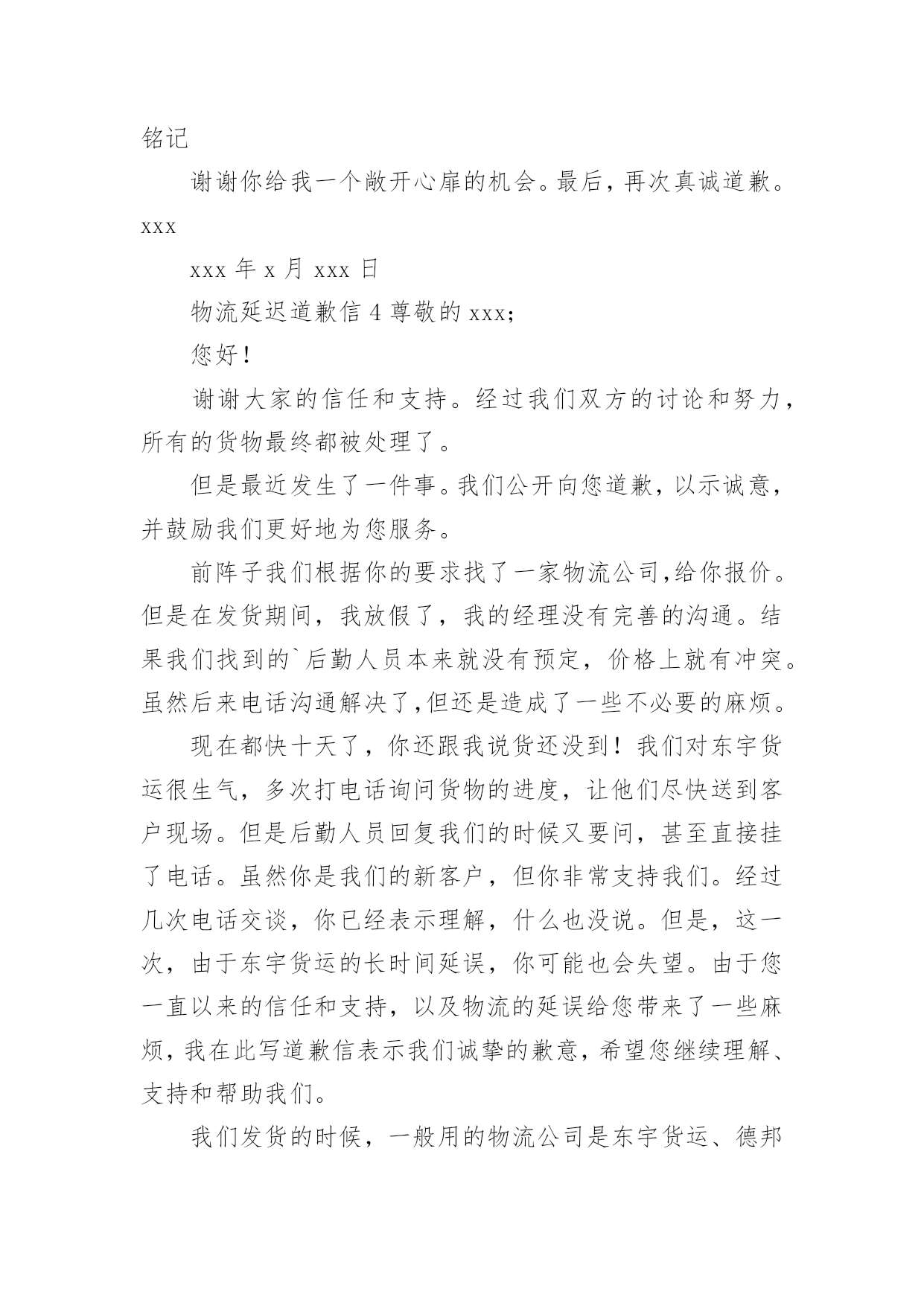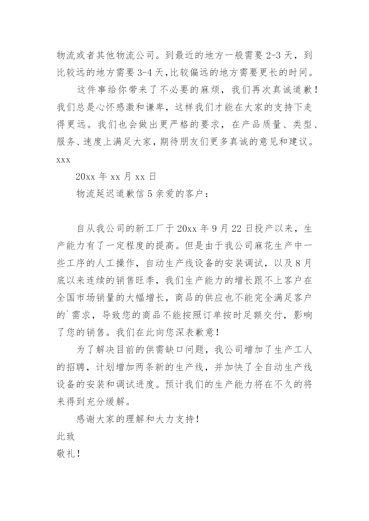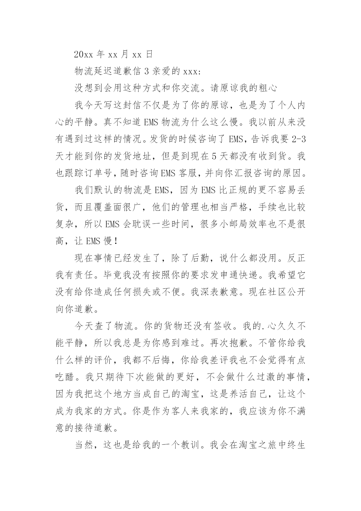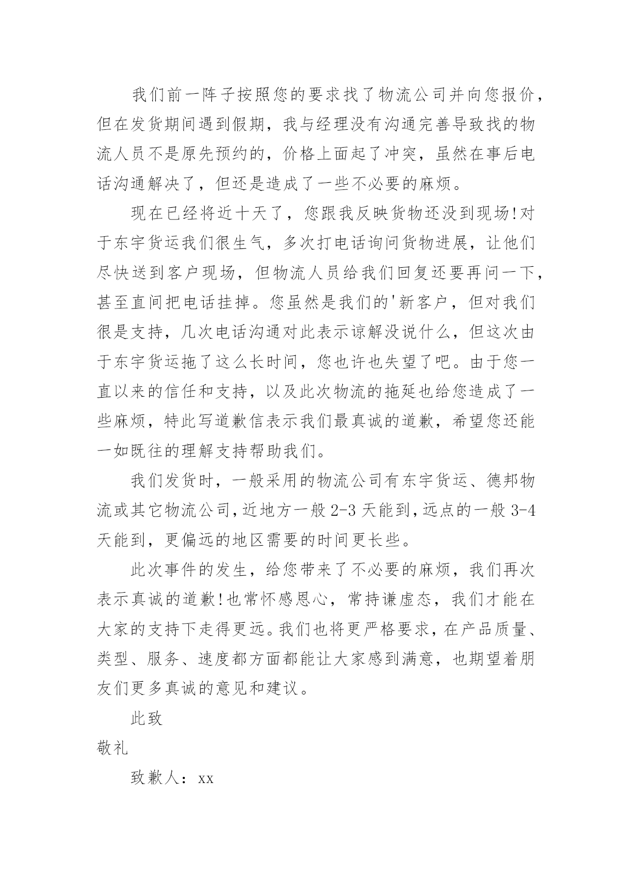 物流延迟道歉信物流延迟道歉信范文(精选5篇)在现在社会,用到道歉信的地方越来越多,道歉信可以帮助我们表示遗憾和歉意,表明愿意补救的愿望,提出建议或安排。写起道歉信来就毫无头绪?下面是小编帮大家整理的物流延迟道歉信范文(精选5篇),希望对大家有所帮助。物流延迟道歉信1尊敬的'xxx:您好!由于冰雪天气(或者交通意外)原因,导致了货物到达日期的延迟,给您带来不便敬请谅解!我公司保证,下次出现类似的原因一定提前知会您,很高兴能为您服务,期待下一次的愉快合作。在此,我代表xxx公司祝您阖家幸福,生活美满!此致致敬!xxx20xx年xx月xx日物流延迟道歉信2亲爱的客户:您好!感谢您对我们的信任和支持,在我们相互探讨及努力下,终于把货物全部加工完成。但是最近发生了一件事情,我们在这里公开向您道歉,以表我们的诚意,也更激励我们更好地服务大家。我们前一阵子按照您的要求找了物流公司并向您报价,但在发货期间遇到假期,我与经理没有沟通完善导致找的物流人员不是原先预约的,价格上面起了冲突,虽然在事后电话沟通解决了,但还是造成了一些不必要的麻烦。现在已经将近十天了,您跟我反映货物还没到现场!对于东宇货运我们很生气,多次打电话询问货物进展,让他们尽快送到客户现场,但物流人员给我们回复还要再问一下,甚至直间把电话挂掉。您虽然是我们的'新客户,但对我们很是支持,几次电话沟通对此表示谅解没说什么,但这次由于东宇货运拖了这么长时间,您也许也失望了吧。由于您一直以来的信任和支持,以及此次物流的拖延也给您造成了一些麻烦,特此写道歉信表示我们最真诚的道歉,希望您还能一如既往的理解支持帮助我们。我们发货时,一般采用的物流公司有东宇货运、德邦物流或其它物流公司,近地方一般2-3天能到,远点的一般3-4天能到,更偏远的地区需要的时间更长些。此次事件的发生,给您带来了不必要的麻烦,我们再次表示真诚的道歉!也常怀感恩心,常持谦虚态,我们才能在大家的支持下走得更远。我们也将更严格要求,在产品质量、类型、服务、速度都方面都能让大家感到满意,也期望着朋友们更多真诚的意见和建议。此致敬礼致歉人:xx20xx年xx月xx日物流延迟道歉信3亲爱的xxx:没想到会用这种方式和你交流。请原谅我的粗心我今天写这封信不仅是为了你的原谅,也是为了个人内心的平静。真不知道EMS物流为什么这么慢。我以前从来没有遇到过这样的情况。发货的时候咨询了EMS,告诉我要2-3天才能到你的发货地址,但是到现在5天都没有收到货。我也跟踪订单号,随时咨询EMS客服,并向你汇报咨询的原因。我们默认的物流是EMS,因为EMS比正规的更不容易丢货,而且覆盖面很广,他们的管理也相当严格,手续也比较复杂,所以EMS会耽误一些时间,很多小邮局效率也不是很高,让EMS慢!现在事情已经发生了,除了后勤,说什么都没用。反正我有责任。毕竟我没有按照你的要求发申通快递。我希望它没有给你造成任何损失或不便。我深表歉意。现在社区公开向你道歉。今天查了物流。你的货物还没有签收。我的.心久久不能平静,所以我总是为你感到难过。再次抱歉。不管你给我什么样的评价,我都不后悔,你给我差评我也不会觉得有点吃醋。我只期待下次能做的更好,不会做什么过激的事情,因为我把这个地方当成自己的淘宝,这是养活自己,让这个成为我家的方式。你是作为客人来我家的,我应该为你不满意的接待道歉。当然,这也是给我的一个教训。我会在淘宝之旅中终生铭记谢谢你给我一个敞开心扉的机会。最后,再次真诚道歉。xxxxxx年x月xxx日物流延迟道歉信4尊敬的xxx;您好!谢谢大家的信任和支持。经过我们双方的讨论和努力,所有的货物最终都被处理了。但是最近发生了一件事。我们公开向您道歉,以示诚意,并鼓励我们更好地为您服务。前阵子我们根据你的要求找了一家物流公司,给你报价。但是在发货期间,我放假了,我的经理没有完善的沟通。结果我们找到的`后勤人员本来就没有预定,价格上就有冲突。虽然后来电话沟通解决了,但还是造成了一些不必要的麻烦。现在都快十天了,你还跟我说货还没到!我们对东宇货运很生气,多次打电话询问货物的进度,让他们尽快送到客户现场。但是后勤人员回复我们的时候又要问,甚至直接挂了电话。虽然你是我们的新客户,但你非常支持我们。经过几次电话交谈,你已经表示理解,什么也没说。但是,这一次,由于东宇货运的长时间延误,你可能也会失望。由于您一直以来的信任和支持,以及物流的延误给您带来了一些麻烦,我在此写道歉信表示我们诚挚的歉意,希望您继续理解、支持和帮助我们。我们发货的时候,一般用的物流公司是东宇货运、德邦物流或者其他物流公司。到最近的地方一般需要2-3天,到比较远的地方需要3-4天,比较偏远的地方需要更长的时间。这件事给你带来了不必要的麻烦,我们再次真诚道歉!我们总是心怀感激和谦卑,这样我们才能在大家的