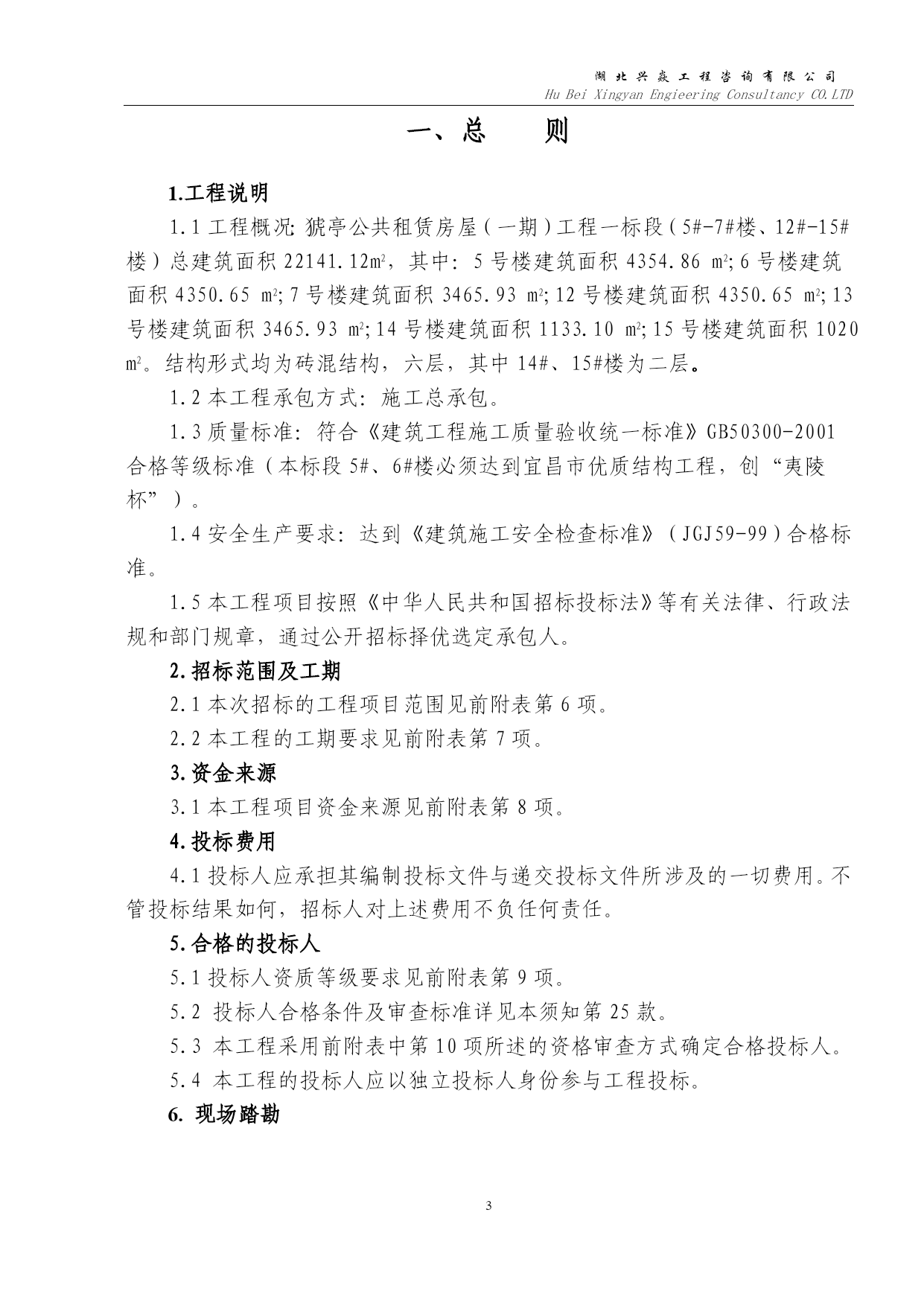 湖北兴焱工程咨询有限公司HuBeiXingyanEngieeringConsultancyCO.LTD湖北兴焱工程咨询有限公司HuBeiXingyanEngieeringConsultancyCO.LTD猇亭公共租赁房屋(一期)工程一标段(5#-7#楼、12#-15#楼)二次招标施工招标文件项目编号:YCJS(2011)258项目名称:猇亭公共租赁房屋(一期)工程一标段招标人:宜昌市城市投资建设开发有限公司(盖章)法定代表人或其委托人:(签字或盖章)招标代理机构:湖北兴焱工程咨询有限公司(盖章)法定代表人或其委托代理人:(签字或盖章)日期:二〇一一年七月湖北兴焱工程咨询有限公司HuBeiXingyanEngieeringConsultancyCO.LTD目录TOC\o"1-3"\u第一章投标须知前附表一、总则二、招标文件三、投标报价、工程量清单及拦标价四、投标文件的编制与递交五、开标六、评标七、授予合同第二章投标文件详细评审细则第三章合同一、合同协议书二、通用条款三、专用条款第四章工程技术要求及工程技术规范第五章图纸(另册)第六章投标函格式一、投标函及附件二、资格审查资料第七章商务标部分格式一、投标总价二、总说明三、工程项目投标报价汇总表四、单项工程投标报价汇总表五、单位工程投标报价汇总表六、分部分项工程量清单计价表七、分部分项工程量清单综合单价分析表八、措施项目清单与计价表(一)九、措施项目清单与计价表(二)十、其他项目清单与计价汇总表十一、暂列金额明细表十二、材料暂估单价表十三、专业工程暂估价表十四、规费、税金项目清单与计价十五、材料价格表十六、投标报价需要的其他资料第八章技术标部分格式第九章工程量清单PAGE\*MERGEFORMAT100第一章投标须知前附表项号条款号内容说明与要求11.1工程名称猇亭公共租赁房屋(一期)工程一标段(5#-7#楼、12#-15#楼)21.1建设地点宜昌市猇亭区桐岭路31.1建设规模总建筑面积22141.12m2,其中:5号楼建筑面积4354.86m2;6号楼建筑面积4350.65m2;7号楼建筑面积3465.93m2;12号楼建筑面积4350.65m2;13号楼建筑面积3465.93m2;14号楼建筑面积1133.10m2;15号楼建筑面积1020m2。结构形式均为砖混结构,六层,其中其中14#、15#楼为二层。41.2承包方式施工总承包51.3质量标准符合《建筑工程施工质量验收统一标准》GB50300-2001合格等级标准(本标段5#、6#楼必须达到宜昌市优质结构工程,创“夷陵杯”)。62.1招标范围招标范围为施工图设计范围内的建筑、装饰、安装工程(包括地基与基础、主体结构、建筑装饰装修、建筑屋面、建筑给水排水、建筑电气)。72.2工期要求计划开工日期:2011年8月20日(实际开工日期以监理下达的开工令为准)计划竣工日期:2012年3月17日(按工期推算)工期:210日历天83.1资金来源公司自筹及申请中央预算内补助资金95.1投标人资质等级具备建设行政主管部门核发的房屋建筑工程施工总承包贰级及以上资质等级证书105.2资格审查方式资格后审1111.1工程计价执行《建设工程工程量清单计价规范》(GB50500-2008)1215.1投标有效期投标截止后60日内有效1316.1投标保证金金额人民币:捌拾万元,投标人应于投标截止时间之前,在会员专区内通过农行网银(应与宜昌市公共资源交易网信息网中登记的网银账号一致)缴纳投标保证金,并打印投标保证金缴纳成功回执单(具体操作参见宜昌市公共资源交易网上交易系统投标企业操作指南)。146现场踏勘招标人不统一组织踏勘,各投标人可自行到现场进行考察与踏勘。159.1招标文件发放招标文件下载时间:2011年7月14日至7月27日17:00时投标人登录http://www.ycztb.com并按网上提示在网上银行缴纳工本费后即可下载招标文件(具体操作参见宜昌市公共资源交易中心投标企业操作指南)招标文件每套售价人民币2000元,售后不退。168招标文件的澄清和修改本工程实行网上答疑,投标人可在宜昌市公共资源交易中心投标企业操作指南(http://www.ycztb.com)答疑专区上提交投标疑问。网上提问开始时间:2011年7月14日网上提问截止时间:2011年7月20日17时网上发布澄清、修改时间:2011年7月21日16时投标计价培训时间:2011年7月21日15时地点:宜昌市公共资源交易中心(宜昌市城东大道2号行政服务中心)七楼701室17投标人的替代方案本项目不接受替代
