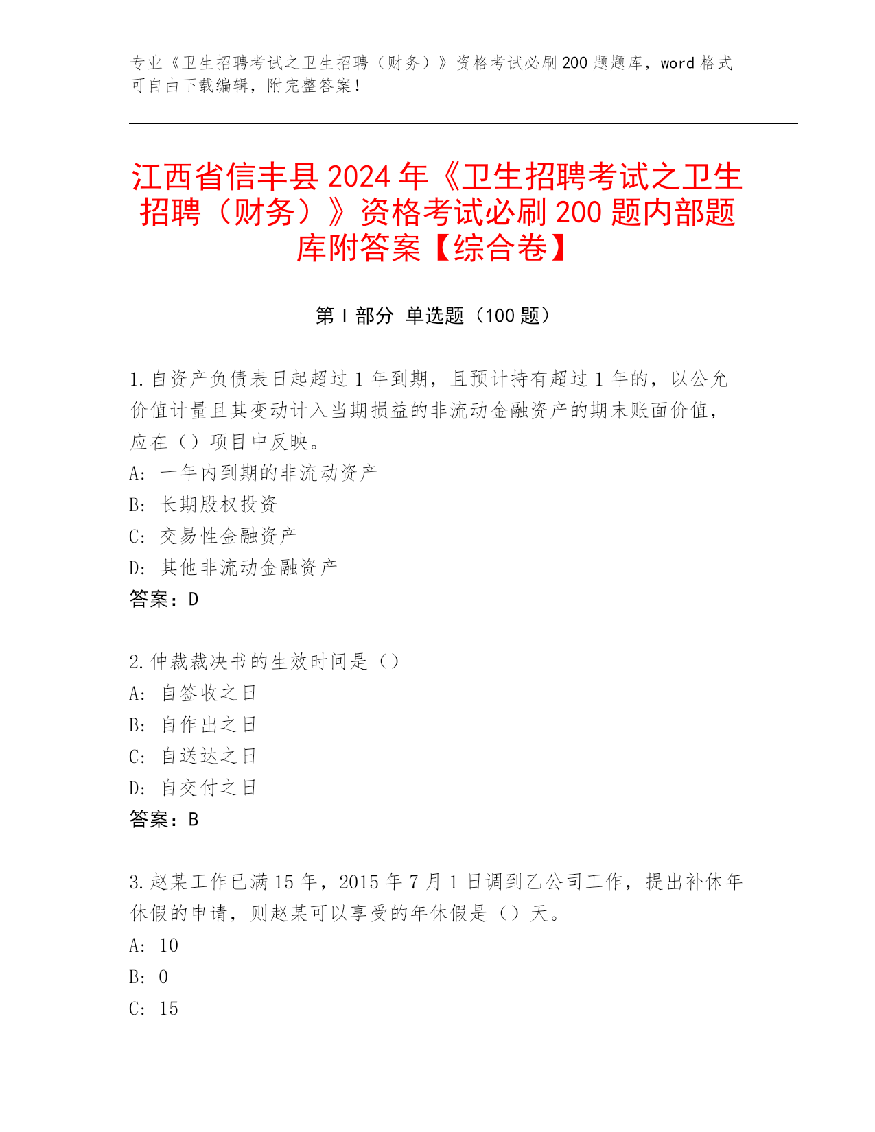 江西省信丰县2024年《卫生招聘考试之卫生招聘(财务)》资格考试必刷200题内部题库附答案【综合卷】