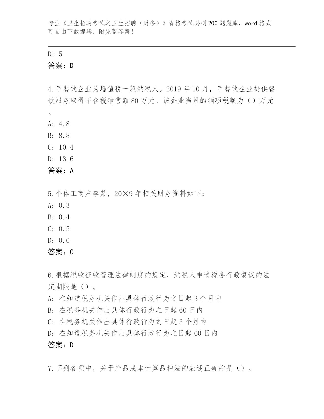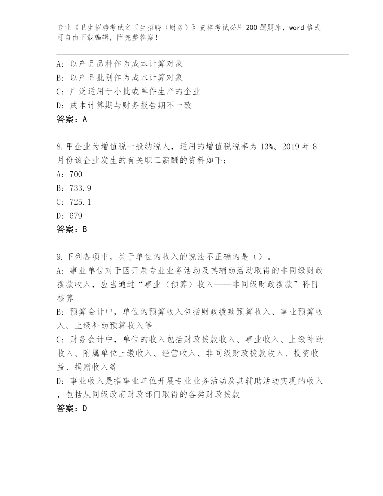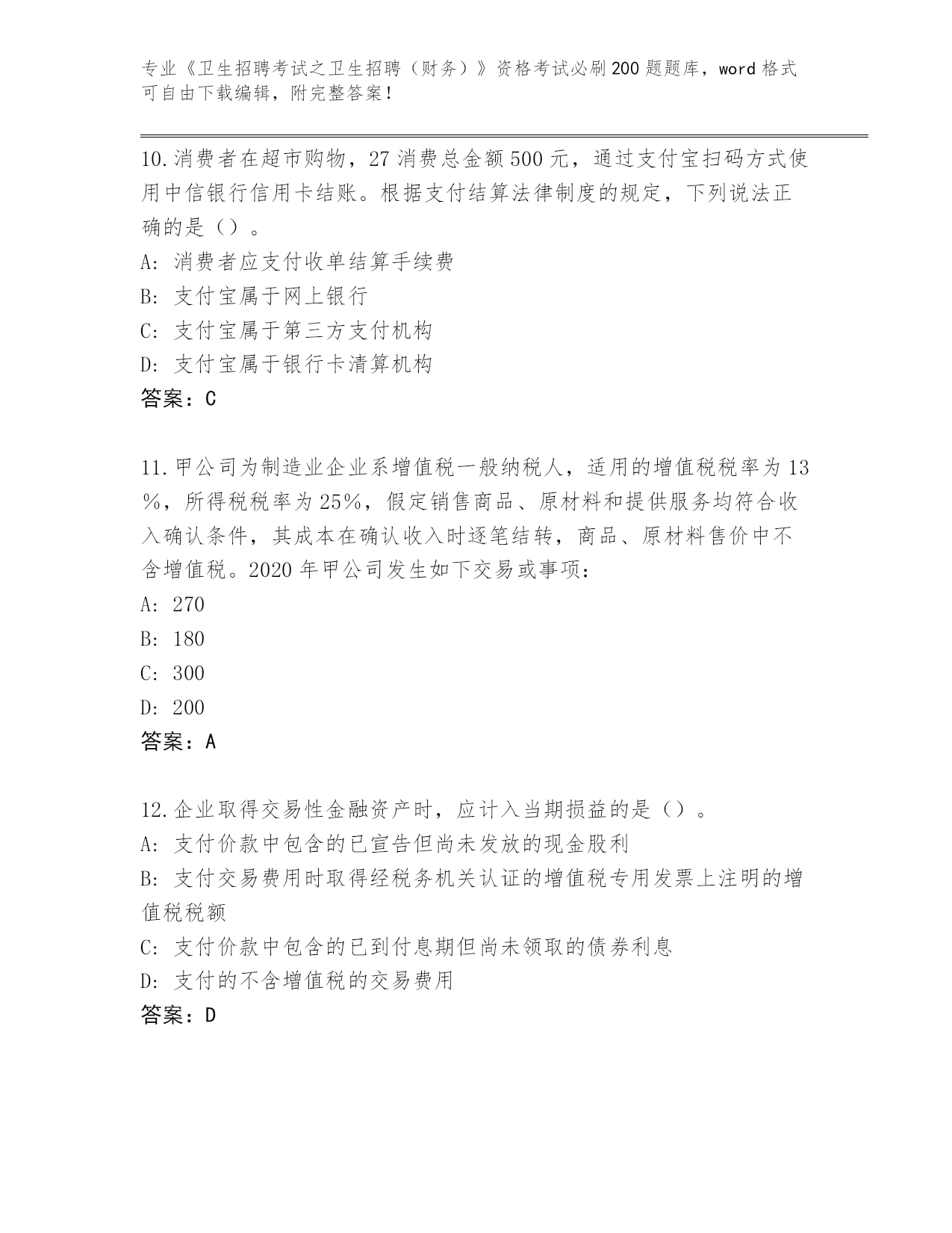 内部使用江西省章贡区《卫生招聘考试之卫生招聘(财务)》资格考试必刷200题题库及答案【】