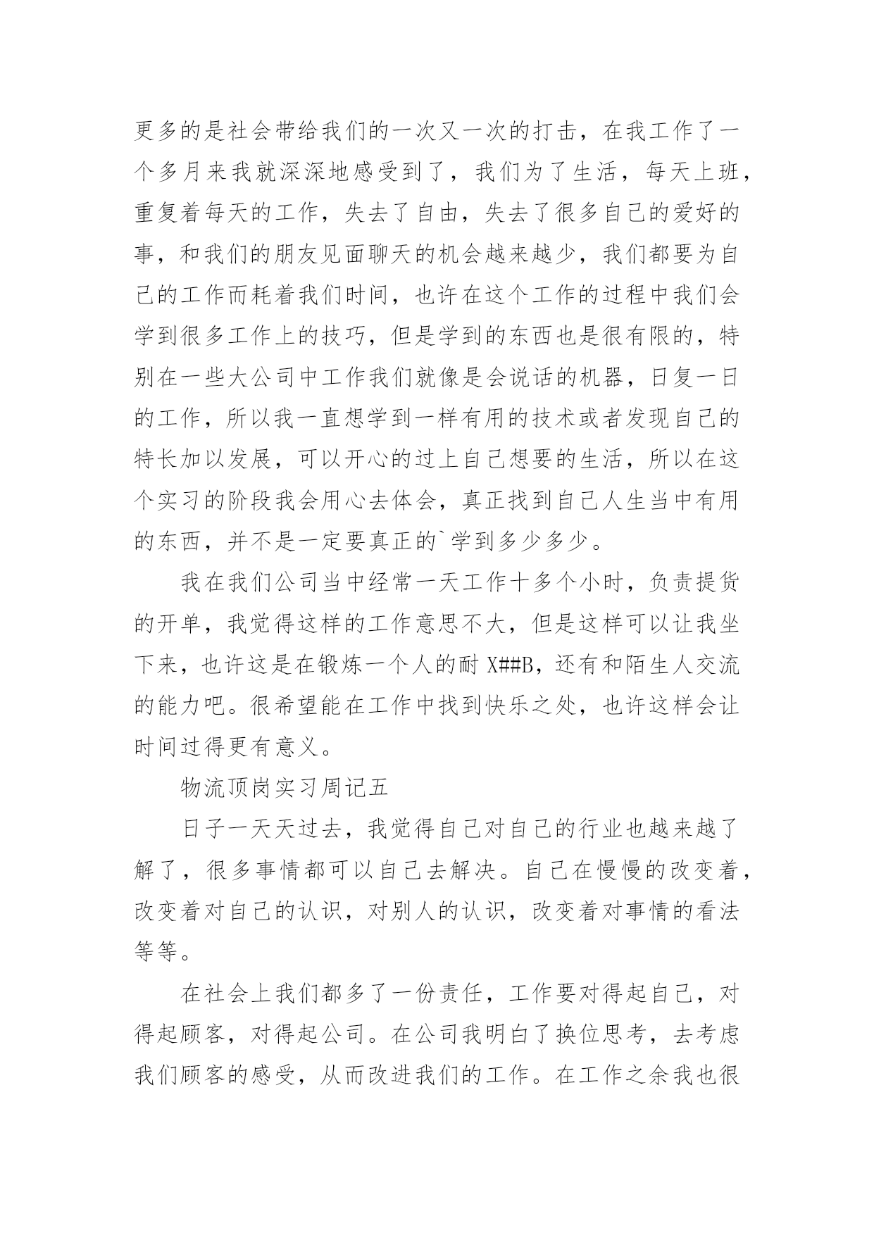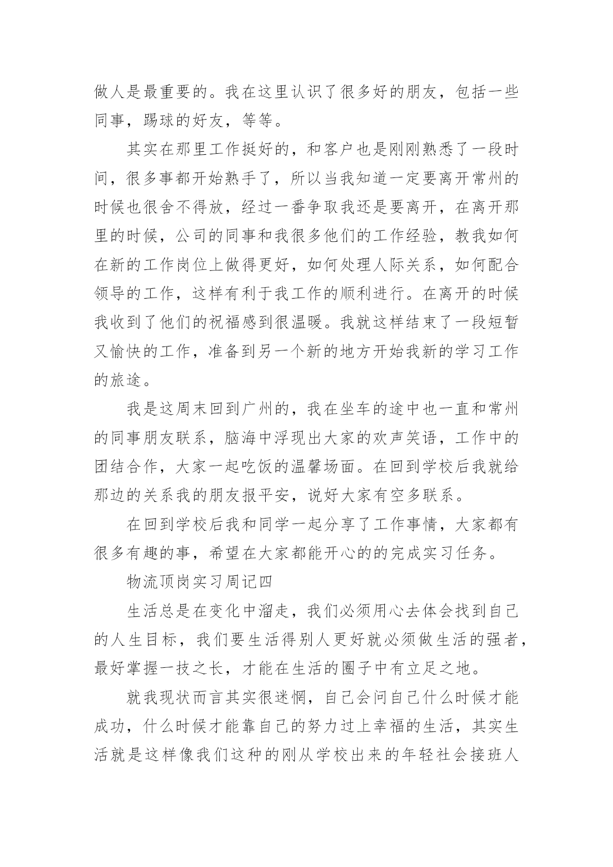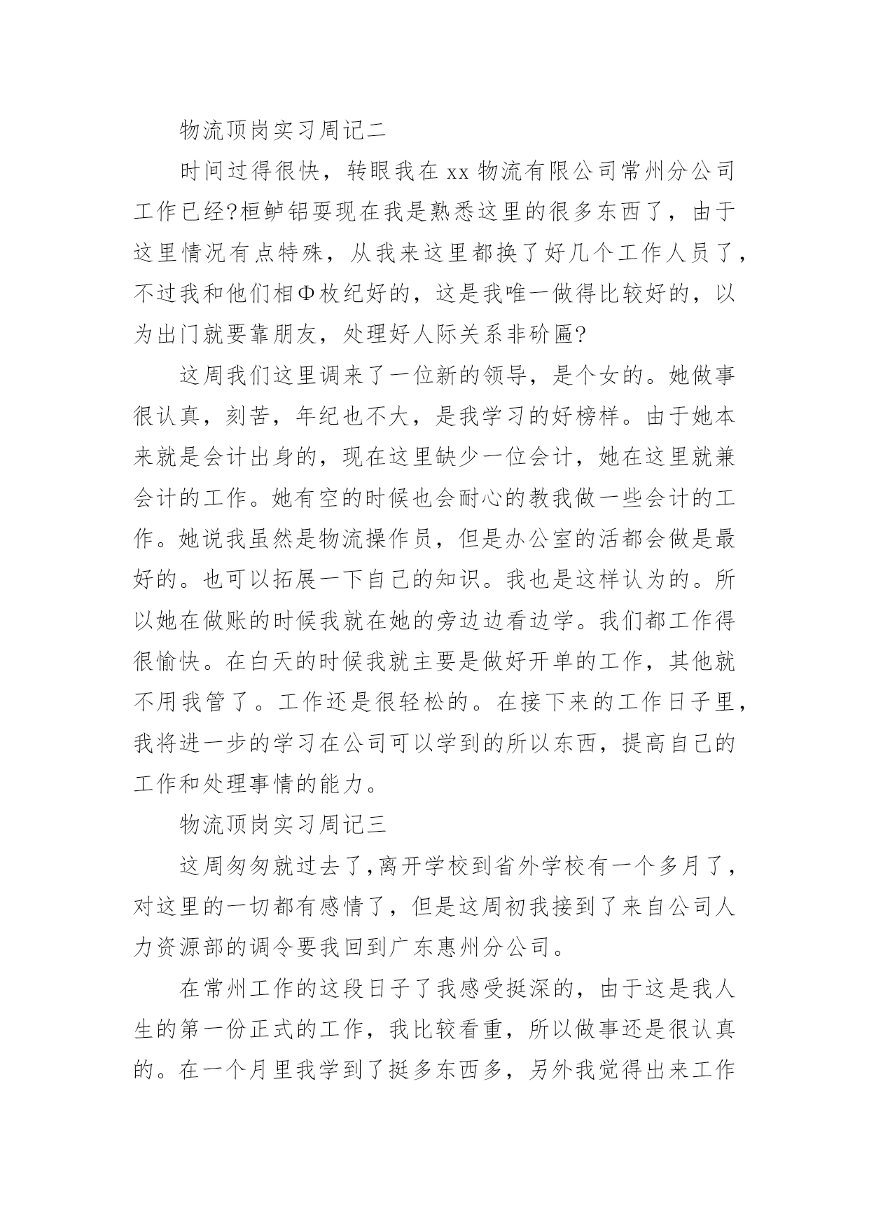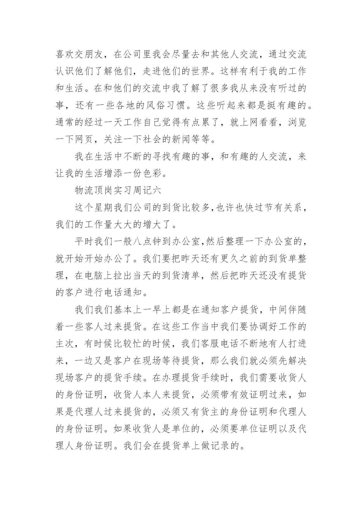 物流顶岗实习周记物流顶岗实习周记一这个星期即将过去,这里我该做的工作基本熟识了。我们分公司中有的组织架构是这样的,领导是我们主管,下面有操作员,会计,出纳,装卸工,司机,我们各尽各职。我是操作员,我主要学习电脑的开单管理系统,进一步做好与客户的沟通服务工作。在工作的过程中,其实要做很多琐事,例如作为公司的物流操作员,工作上首先是要为客户提供开单工作,发货开单后还要检查货物在贴标签,装车出库,还要做好货物的跟踪情况。因为在物流运输的途中经常会出现耽误货物到达时间,或者货物在分流中心出现错误,又或者在贴标签时出错等等情况,所以,要锻炼良好的沟通能力,才能更好的协调各方面的工作,以最快的速度解决问题,为客户提供最有效的解决方案。有时候客户的货物由于急需但是运输途中偏偏出错了,我们会一直被客户追问的,我们就要学会如何解答客户的问题了。例如当被问到货物到底具体到哪里啦,我们就要马上联系该货物的到货公司,确认货物具体情况,如果还没有到达到货公司我们得联系分流中心,了解货物到了分流中心分流了没有,有没有缺货等等,最后转告客户,让他们再耐心等待。其实,作为物流操作员很多东西都要了解的。这样才能一站式的服务客户,做到一站到位。物流顶岗实习周记二时间过得很快,转眼我在xx物流有限公司常州分公司工作已经?桓鲈铝耍现在我是熟悉这里的很多东西了,由于这里情况有点特殊,从我来这里都换了好几个工作人员了,不过我和他们相Φ枚纪好的,这是我唯一做得比较好的,以为出门就要靠朋友,处理好人际关系非砎匾?这周我们这里调来了一位新的领导,是个女的。她做事很认真,刻苦,年纪也不大,是我学习的好榜样。由于她本来就是会计出身的,现在这里缺少一位会计,她在这里就兼会计的工作。她有空的时候也会耐心的教我做一些会计的工作。她说我虽然是物流操作员,但是办公室的活都会做是最好的。也可以拓展一下自己的知识。我也是这样认为的。所以她在做账的时候我就在她的旁边边看边学。我们都工作得很愉快。在白天的时候我就主要是做好开单的工作,其他就不用我管了。工作还是很轻松的。在接下来的工作日子里,我将进一步的学习在公司可以学到的所以东西,提高自己的工作和处理事情的能力。物流顶岗实习周记三这周匆匆就过去了,离开学校到省外学校有一个多月了,对这里的一切都有感情了,但是这周初我接到了来自公司人力资源部的调令要我回到广东惠州分公司。在常州工作的这段日子了我感受挺深的,由于这是我人生的第一份正式的工作,我比较看重,所以做事还是很认真的。在一个月里我学到了挺多东西多,另外我觉得出来工作做人是最重要的。我在这里认识了很多好的朋友,包括一些同事,踢球的好友,等等。其实在那里工作挺好的,和客户也是刚刚熟悉了一段时间,很多事都开始熟手了,所以当我知道一定要离开常州的时候也很舍不得放,经过一番争取我还是要离开,在离开那里的时候,公司的同事和我很多他们的工作经验,教我如何在新的工作岗位上做得更好,如何处理人际关系,如何配合领导的工作,这样有利于我工作的顺利进行。在离开的时候我收到了他们的祝福感到很温暖。我就这样结束了一段短暂又愉快的工作,准备到另一个新的地方开始我新的学习工作的旅途。我是这周末回到广州的,我在坐车的途中也一直和常州的同事朋友联系,脑海中浮现出大家的欢声笑语,工作中的团结合作,大家一起吃饭的温馨场面。在回到学校后我就给那边的关系我的朋友报平安,说好大家有空多联系。在回到学校后我和同学一起分享了工作事情,大家都有很多有趣的事,希望在大家都能开心的的完成实习任务。物流顶岗实习周记四生活总是在变化中溜走,我们必须用心去体会找到自己的人生目标,我们要生活得别人更好就必须做生活的强者,最好掌握一技之长,才能在生活的圈子中有立足之地。就我现状而言其实很迷惘,自己会问自己什么时候才能成功,什么时候才能靠自己的努力过上幸福的生活,其实生活就是这样像我们这种的刚从学校出来的年轻社会接班人更多的是社会带给我们的一次又一次的打击,在我工作了一个多月来我就深深地感受到了,我们为了生活,每天上班,重复着每天的工作,失去了自由,失去了很多自己的爱好的事,和我们的朋友见面聊天的机会越来越少,我们都要为自己的工作而耗着我们时间,也许在这个工作的过程中我们会学到很多工作上的技巧,但是学到的东西也是很有限的,特别在一些大公司中工作我们就像是会说话的机器,日复一日的工作,所以我一直想学到一样有用的技术或者发现自己的特长加以发展,可以开心的过上自己想要的生活,所以在这个实习的阶段我会用心去体会,真正找到自己人生当中有用的东西,并不是一定要真正的`学到多少多少。我在我们公司当中经常一天工作十多个小时,负责提货的开单,我觉得这样的工作意思不大,但是这样可以让我坐下来,也许这是在锻炼一个人的耐X##B,还有和陌生人交流的能力吧。很希望能在工作中找到快乐之