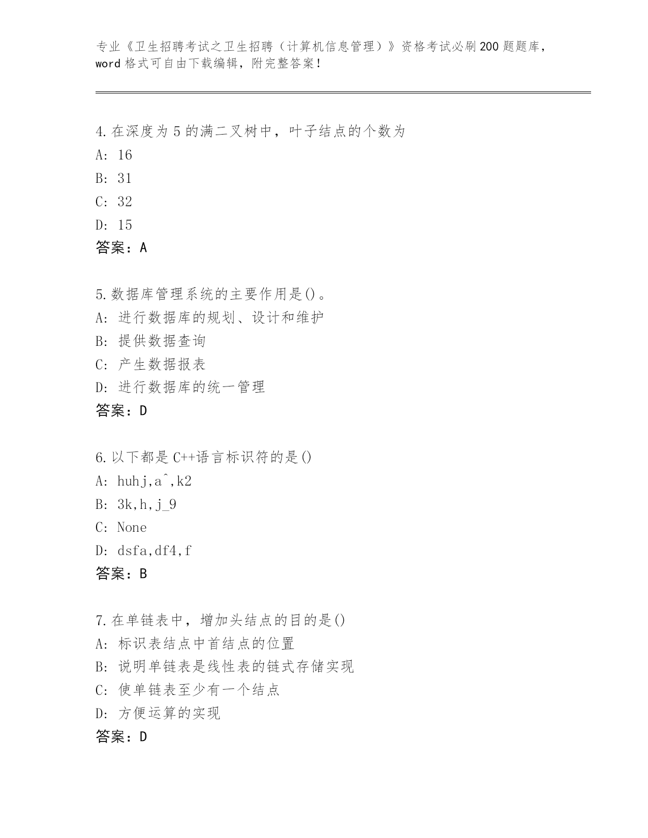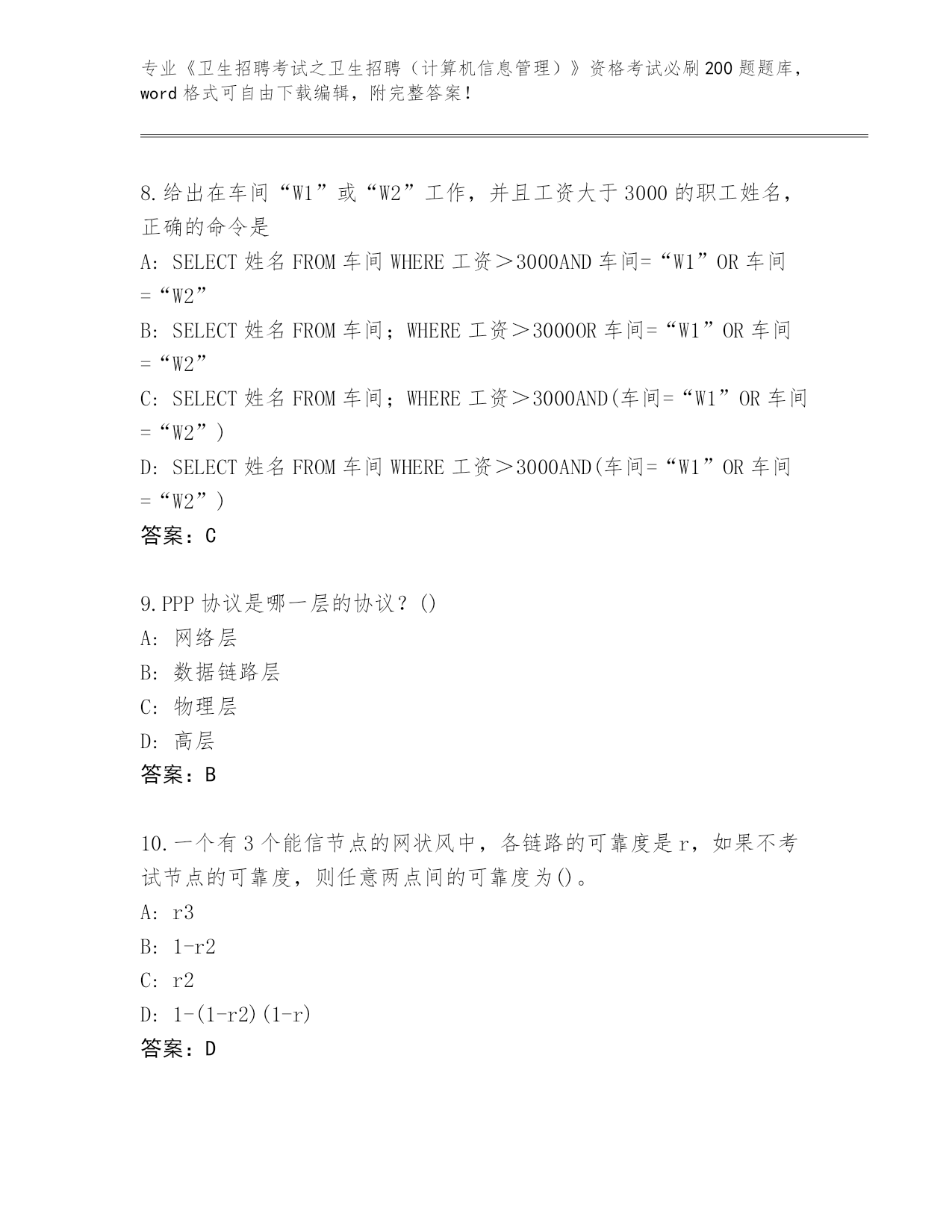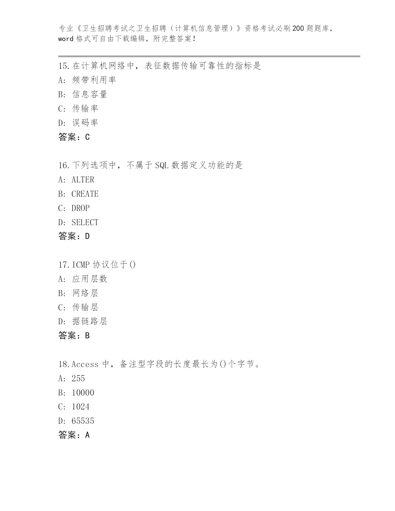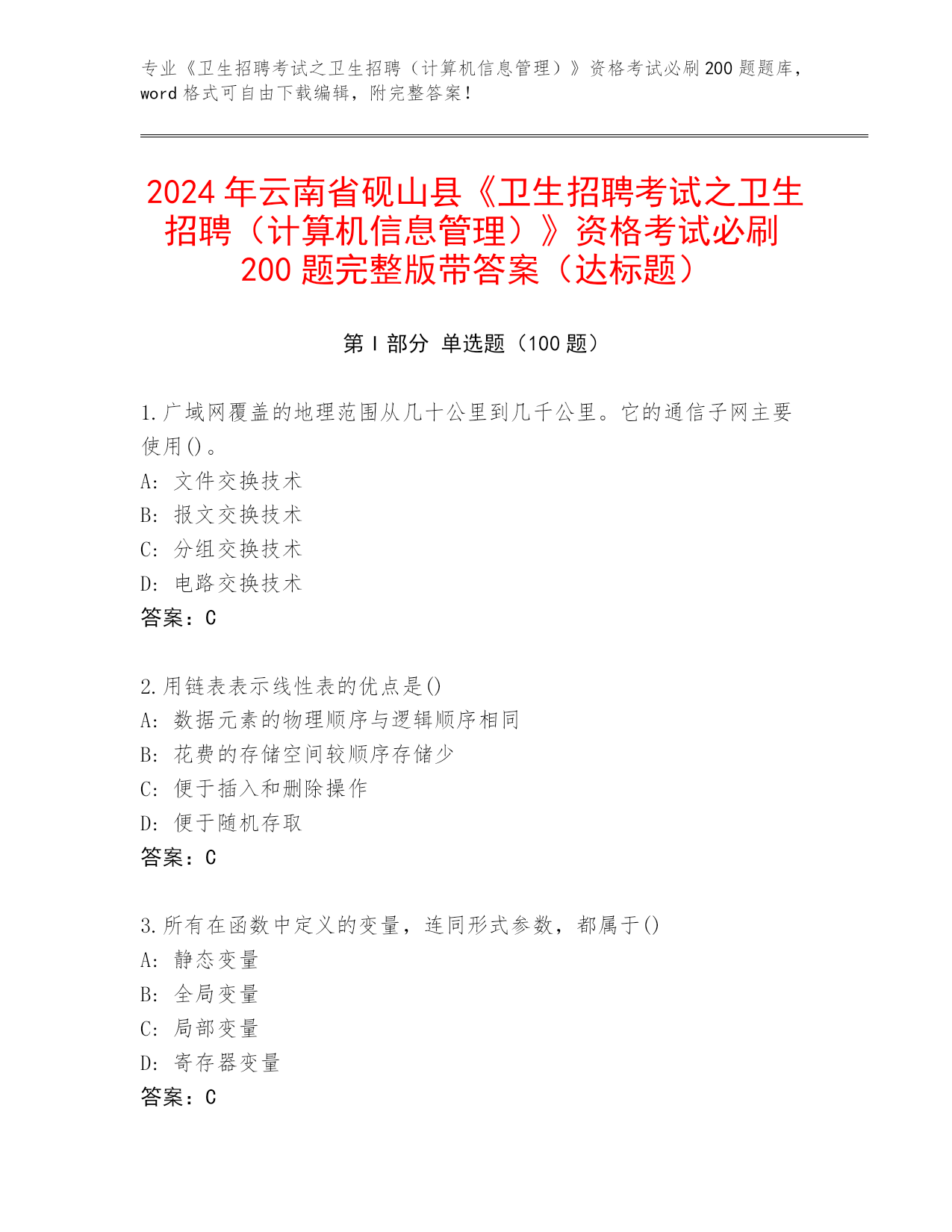 2024年云南省砚山县《卫生招聘考试之卫生招聘(计算机信息管理)》资格考试必刷200题完整版带答案(达标题)