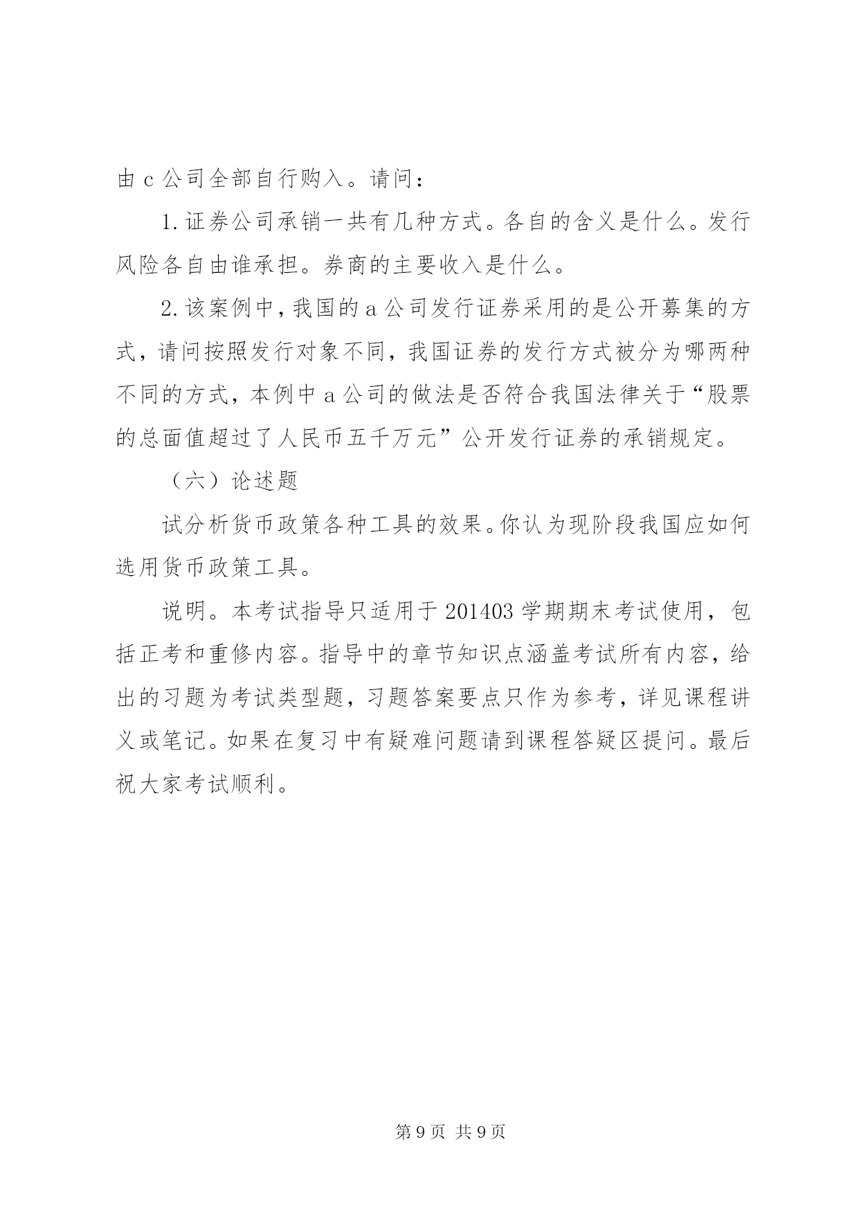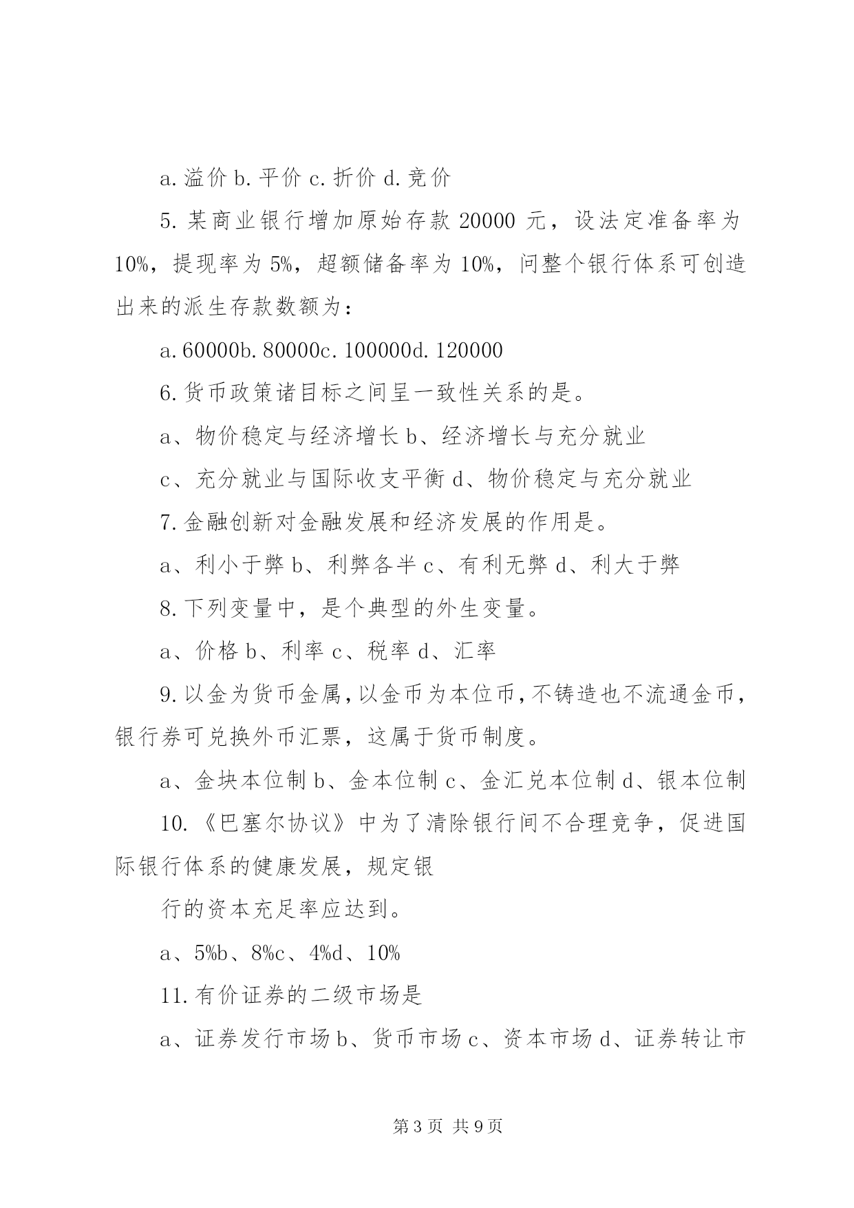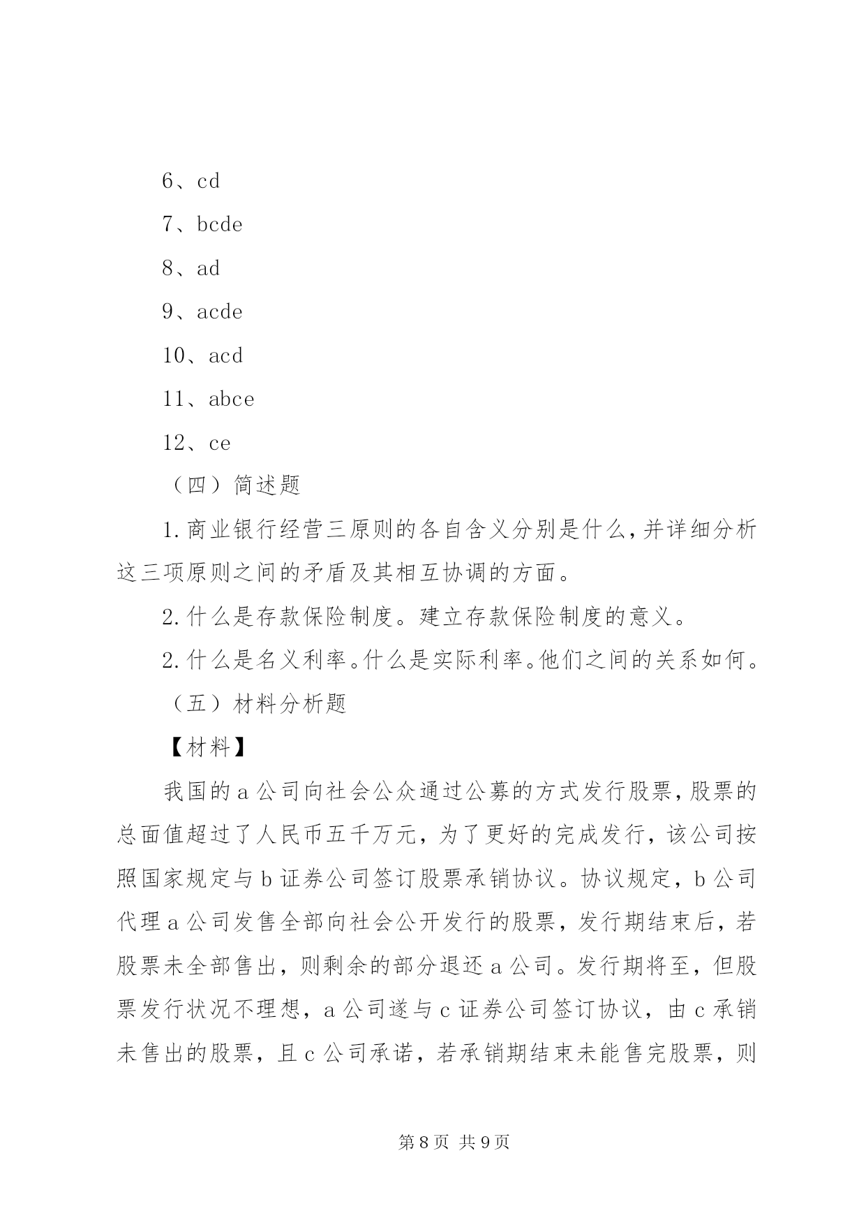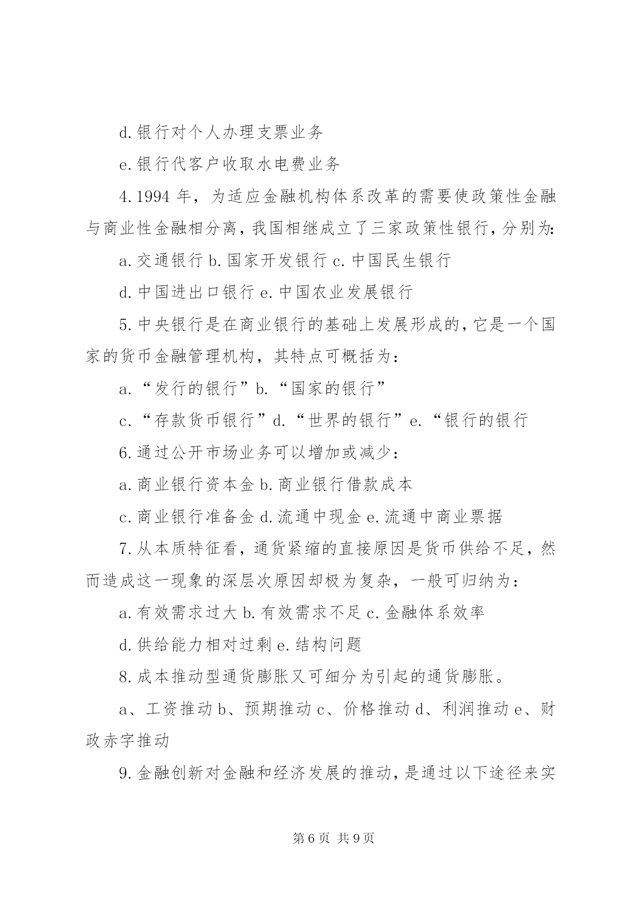 第PAGE\*Arabic\*MERGEFORMAT9页共NUMPAGES\*MERGEFORMAT9页货币银行学学习心得0039《货币银行学》2014年6月期末考试指导三、重点习题(一)判断题1.在间接融资中,资金供求双方并不形成直接的债权和债务关系,而是分别与金融机构形成债权债务关系。2.商业票据的背书人对票据不负有连带责任。3.执行流通手段的货币,可以是想象的或观念上的货币,也可以是现实的货币。4.货币需求是指社会各部门在既定的收入或财富范围内,能够而且愿意以货币形式持有的数量。5.商业银行对社会公众的负债比债权更具主动性和可控性。6.监管商业银行的经营曾经是中国人民银行的重要职责之一,2003年以后对商业银行的监管主要由银行业监督管理委员会负责。7.需求拉上说解释通货膨胀时是以总供给给定为前提的。8.金融体系是指一国一定时期金融机构的总和。9.投资银行的主要资金来源是发行股票和债券。10.货币供给的主体是中央银行和非银行金融机构。参考答案:1、×2、×3、×4、√5、×6、√7、√8、√9、√10、Χ(二)单选题1.利息率的合理区间是:a.小于零b.大于零c.高于平均利润率d.大于零,小于平均利润率2.以下不属于债务信用的是:a.银行的存贷款活动b.政府发行国债c.居民购买股票d.企业发行债券3.金融市场按照金融交易的期限分类,可以划分为:a.直接金融市场和间接金融市场b.短期金融市场和长期金融市场c.发行市场和流通市场d.有形市场和无形市场4.发行价格低于金融工具的票面金额称作:a.溢价b.平价c.折价d.竞价5.某商业银行增加原始存款20000元,设法定准备率为10%,提现率为5%,超额储备率为10%,问整个银行体系可创造出来的派生存款数额为:a.60000b.80000c.100000d.1200006.货币政策诸目标之间呈一致性关系的是。a、物价稳定与经济增长b、经济增长与充分就业c、充分就业与国际收支平衡d、物价稳定与充分就业7.金融创新对金融发展和经济发展的作用是。a、利小于弊b、利弊各半c、有利无弊d、利大于弊8.下列变量中,是个典型的外生变量。a、价格b、利率c、税率d、汇率9.以金为货币金属,以金币为本位币,不铸造也不流通金币,银行券可兑换外币汇票,这属于货币制度。a、金块本位制b、金本位制c、金汇兑本位制d、银本位制10.《巴塞尔协议》中为了清除银行间不合理竞争,促进国际银行体系的健康发展,规定银行的资本充足率应达到。a、5%b、8%c、4%d、10%11.有价证券的二级市场是a、证券发行市场b、货币市场c、资本市场d、证券转让市场12.货币政策的首要问题是:a、货币政策中介指标b、货币政策工具c、货币政策传导机制d、货币政策目标13.导致通货膨胀的直接原因是:a、货币贬值b、纸币流通c、物价上涨d、货币供应过多14.下列哪个方程式是马克思的货币必要量公式a、mv=ptb、p=mv/tc、m=pq/vd、m=kpy15.在下列控制货币总量的各个手段中,中央银行不能完全自主操作的是:a、公开市场业务b、再贴现政策c、信贷规模控制d、法定准备金率参考答案:1、d2、c3、b4、c5、a6、b7、d8、c9、d10、b11、a12、d13、d14、c15、b(三)多选题1.资本市场主要有下列市场构成:a.长期政府债券市场b.中长期公司债券市场c.商业票据市场d.股票市场e.承兑汇票市场2.现代信用在现代经济活动中发挥着重要作用,主要表现在:a.现代信用可以促进社会资金的合理利用b.现代信用可以优化社会资源配置c.现代信用可以推动经济的增长d.现代信用的规模越大越能促进经济的发展e.现代信用有可能导致泡沫经济3.消费信用的形式有:a.企业以赊销方式对顾客提供信用b.银行和其他金融机构发放给个人用于购买耐用消费品的贷款c.银行和其他金融机构对个人提供的信用卡业务d.银行对个人办理支票业务e.银行代客户收取水电费业务4.1994年,为适应金融机构体系改革的需要使政策性金融与商业性金融相分离,我国相继成立了三家政策性银行,分别为:a.交通银行b.国家开发银行c.中国民生银行d.中国进出口银行e.中国农业发展银行5.中央银行是在商业银行的基础上发展形成的,它是一个国家的货币金融管理机构,其特点可概括为:a.“发行的银行”b.“国家的银行”c.“存款货币银行”d.“世界的银行”e.“银行的银行6.通过公开市场业务可以增加或减少:a.商业银行资本金b.商业银行借款成本c.商业银行准备金d.流通中现金e.流通中商业票据7.从本质特征看,通货紧缩的直接原因是货币供给不足,然而造成这一现象的深层次原因却极为复杂,一般可归纳为:a.有效需求过大b.有效需求不足c.金融体系效率d.供给能力相对过剩e.结