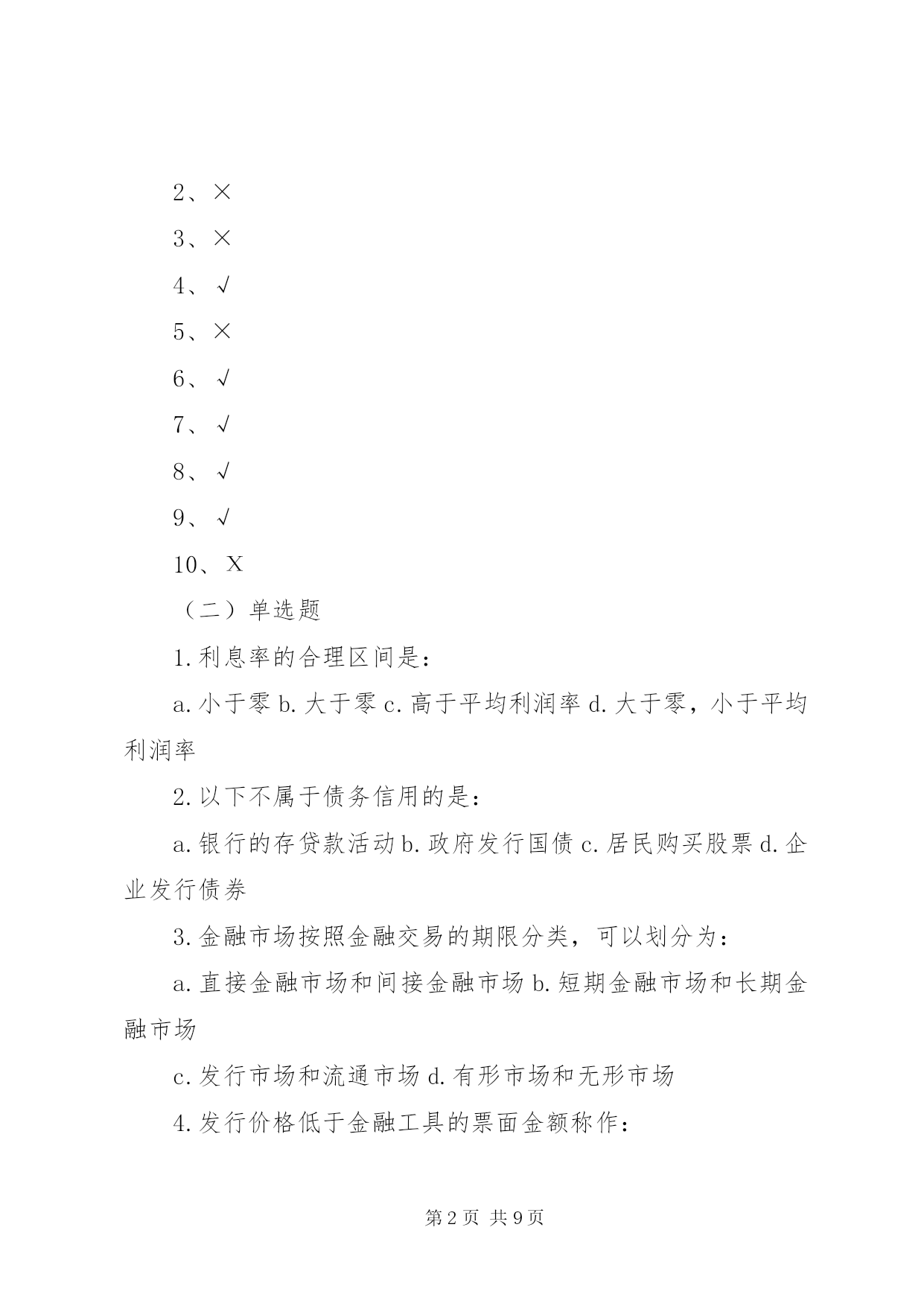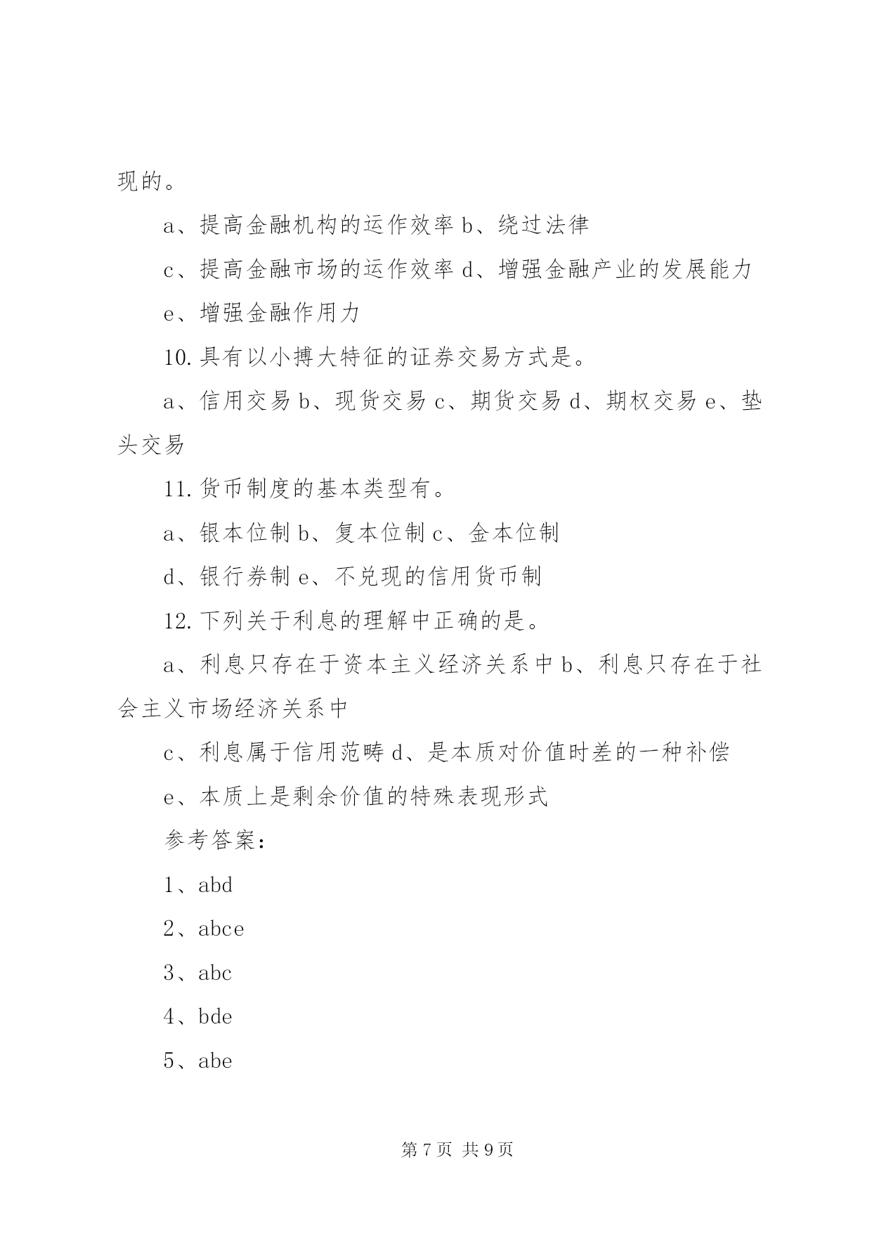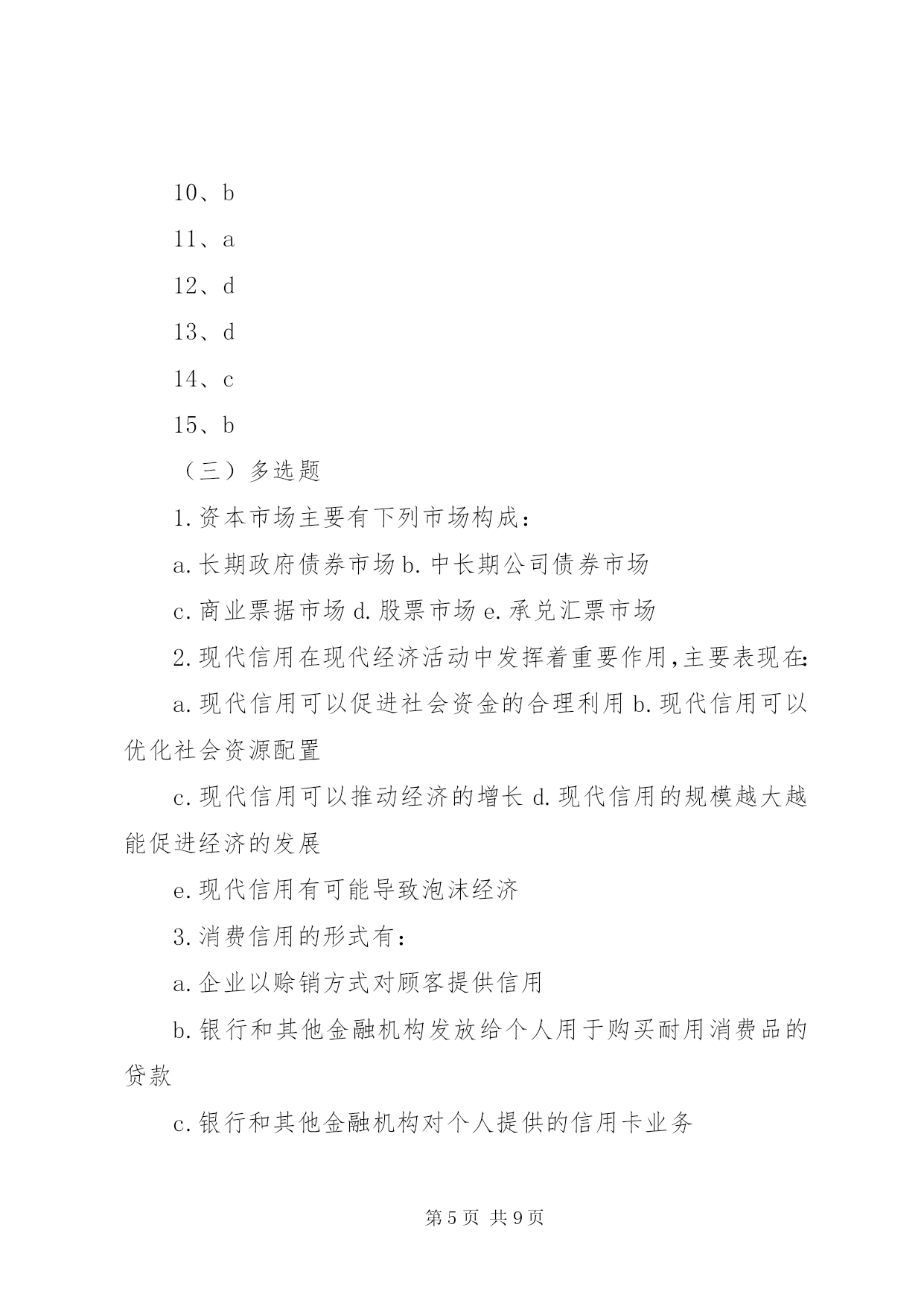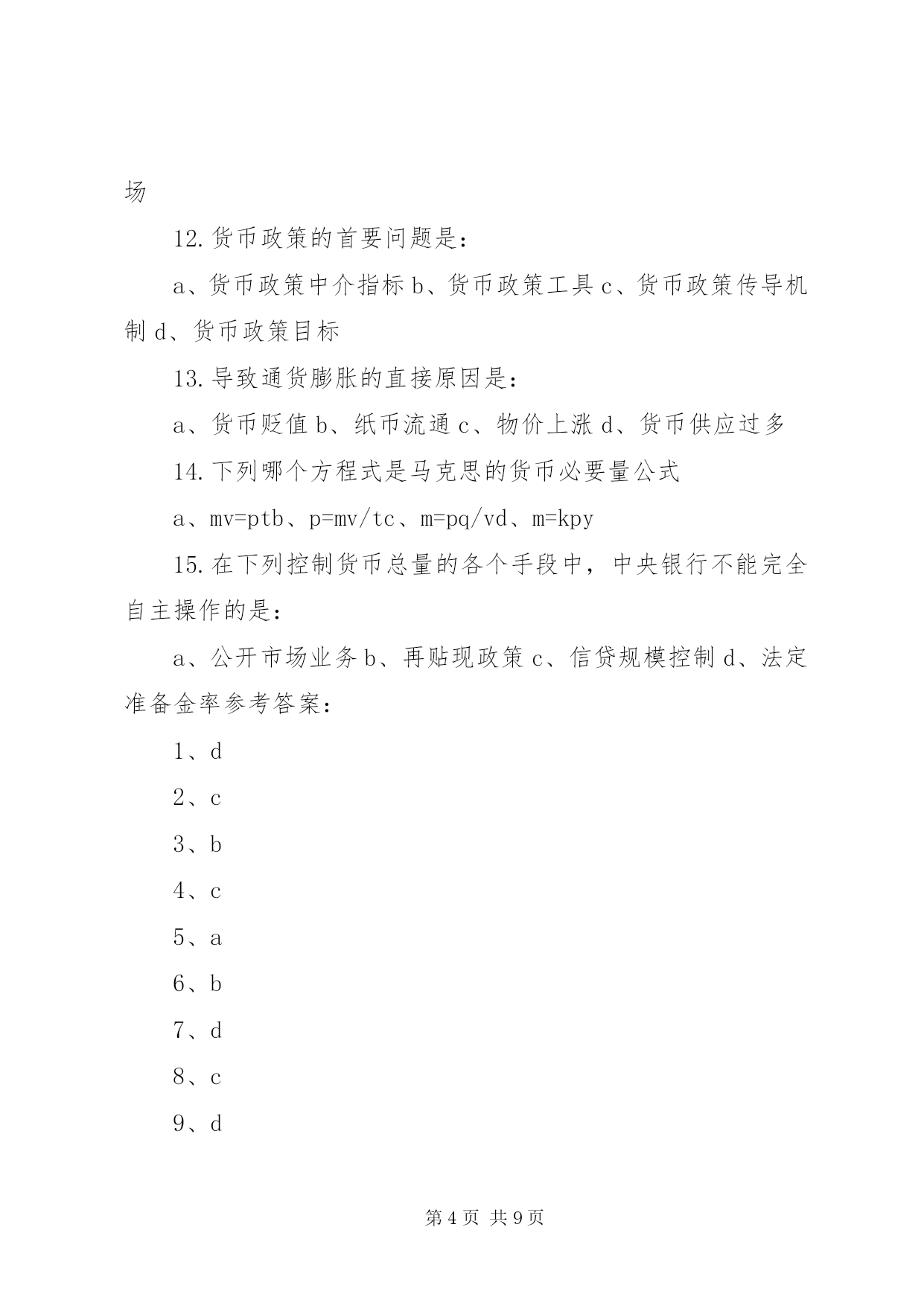 第PAGE\*Arabic\*MERGEFORMAT9页共NUMPAGES\*MERGEFORMAT9页货币银行学学习心得0039《货币银行学》2014年6月期末考试指导三、重点习题(一)判断题1.在间接融资中,资金供求双方并不形成直接的债权和债务关系,而是分别与金融机构形成债权债务关系。2.商业票据的背书人对票据不负有连带责任。3.执行流通手段的货币,可以是想象的或观念上的货币,也可以是现实的货币。4.货币需求是指社会各部门在既定的收入或财富范围内,能够而且愿意以货币形式持有的数量。5.商业银行对社会公众的负债比债权更具主动性和可控性。6.监管商业银行的经营曾经是中国人民银行的重要职责之一,2003年以后对商业银行的监管主要由银行业监督管理委员会负责。7.需求拉上说解释通货膨胀时是以总供给给定为前提的。8.金融体系是指一国一定时期金融机构的总和。9.投资银行的主要资金来源是发行股票和债券。10.货币供给的主体是中央银行和非银行金融机构。参考答案:1、×2、×3、×4、√5、×6、√7、√8、√9、√10、Χ(二)单选题1.利息率的合理区间是:a.小于零b.大于零c.高于平均利润率d.大于零,小于平均利润率2.以下不属于债务信用的是:a.银行的存贷款活动b.政府发行国债c.居民购买股票d.企业发行债券3.金融市场按照金融交易的期限分类,可以划分为:a.直接金融市场和间接金融市场b.短期金融市场和长期金融市场c.发行市场和流通市场d.有形市场和无形市场4.发行价格低于金融工具的票面金额称作:a.溢价b.平价c.折价d.竞价5.某商业银行增加原始存款20000元,设法定准备率为10%,提现率为5%,超额储备率为10%,问整个银行体系可创造出来的派生存款数额为:a.60000b.80000c.100000d.1200006.货币政策诸目标之间呈一致性关系的是。a、物价稳定与经济增长b、经济增长与充分就业c、充分就业与国际收支平衡d、物价稳定与充分就业7.金融创新对金融发展和经济发展的作用是。a、利小于弊b、利弊各半c、有利无弊d、利大于弊8.下列变量中,是个典型的外生变量。a、价格b、利率c、税率d、汇率9.以金为货币金属,以金币为本位币,不铸造也不流通金币,银行券可兑换外币汇票,这属于货币制度。a、金块本位制b、金本位制c、金汇兑本位制d、银本位制10.《巴塞尔协议》中为了清除银行间不合理竞争,促进国际银行体系的健康发展,规定银行的资本充足率应达到。a、5%b、8%c、4%d、10%11.有价证券的二级市场是a、证券发行市场b、货币市场c、资本市场d、证券转让市场12.货币政策的首要问题是:a、货币政策中介指标b、货币政策工具c、货币政策传导机制d、货币政策目标13.导致通货膨胀的直接原因是:a、货币贬值b、纸币流通c、物价上涨d、货币供应过多14.下列哪个方程式是马克思的货币必要量公式a、mv=ptb、p=mv/tc、m=pq/vd、m=kpy15.在下列控制货币总量的各个手段中,中央银行不能完全自主操作的是:a、公开市场业务b、再贴现政策c、信贷规模控制d、法定准备金率参考答案:1、d2、c3、b4、c5、a6、b7、d8、c9、d10、b11、a12、d13、d14、c15、b(三)多选题1.资本市场主要有下列市场构成:a.长期政府债券市场b.中长期公司债券市场c.商业票据市场d.股票市场e.承兑汇票市场2.现代信用在现代经济活动中发挥着重要作用,主要表现在:a.现代信用可以促进社会资金的合理利用b.现代信用可以优化社会资源配置c.现代信用可以推动经济的增长d.现代信用的规模越大越能促进经济的发展e.现代信用有可能导致泡沫经济3.消费信用的形式有:a.企业以赊销方式对顾客提供信用b.银行和其他金融机构发放给个人用于购买耐用消费品的贷款c.银行和其他金融机构对个人提供的信用卡业务d.银行对个人办理支票业务e.银行代客户收取水电费业务4.1994年,为适应金融机构体系改革的需要使政策性金融与商业性金融相分离,我国相继成立了三家政策性银行,分别为:a.交通银行b.国家开发银行c.中国民生银行d.中国进出口银行e.中国农业发展银行5.中央银行是在商业银行的基础上发展形成的,它是一个国家的货币金融管理机构,其特点可概括为:a.“发行的银行”b.“国家的银行”c.“存款货币银行”d.“世界的银行”e.“银行的银行6.通过公开市场业务可以增加或减少:a.商业银行资本金b.商业银行借款成本c.商业银行准备金d.流通中现金e.流通中商业票据7.从本质特征看,通货紧缩的直接原因是货币供给不足,然而造成这一现象的深层次原因却极为复杂,一般可归纳为:a.有效需求过大b.有效需求不足c.金融体系效率d.供给能力相对过剩e.结