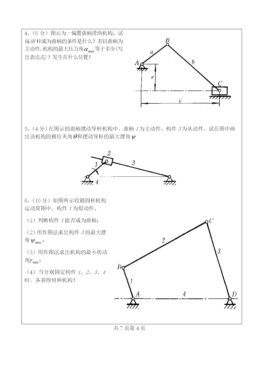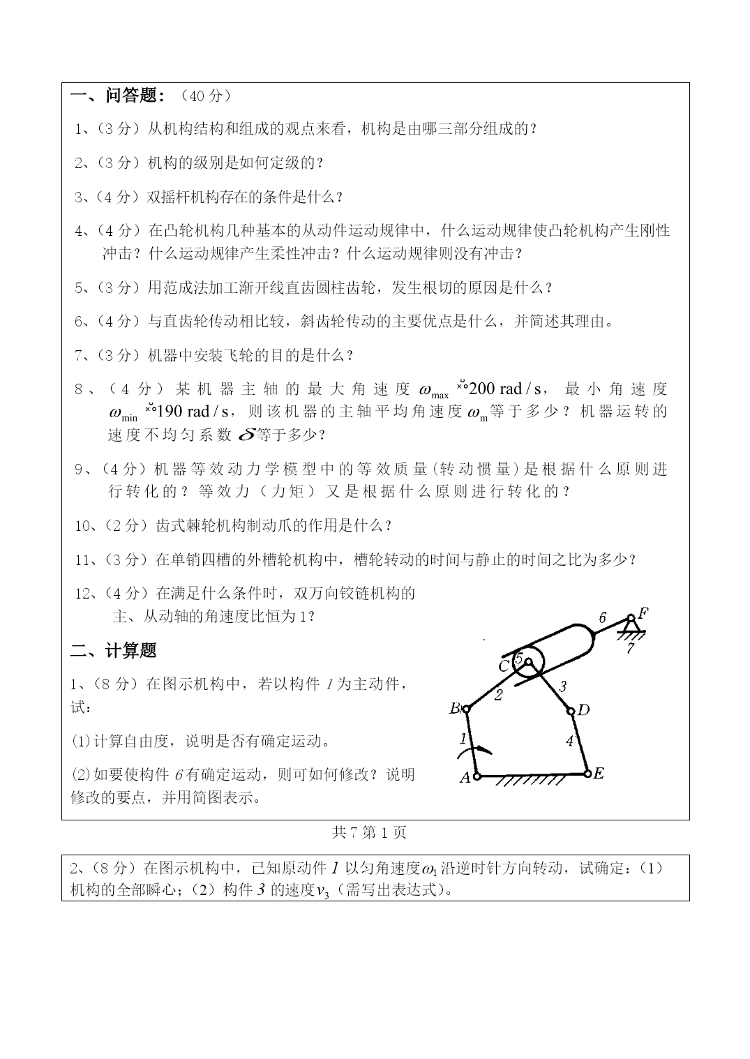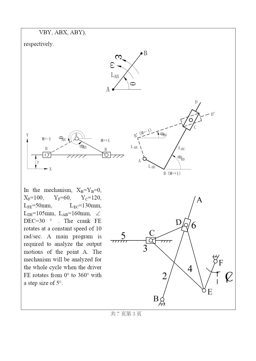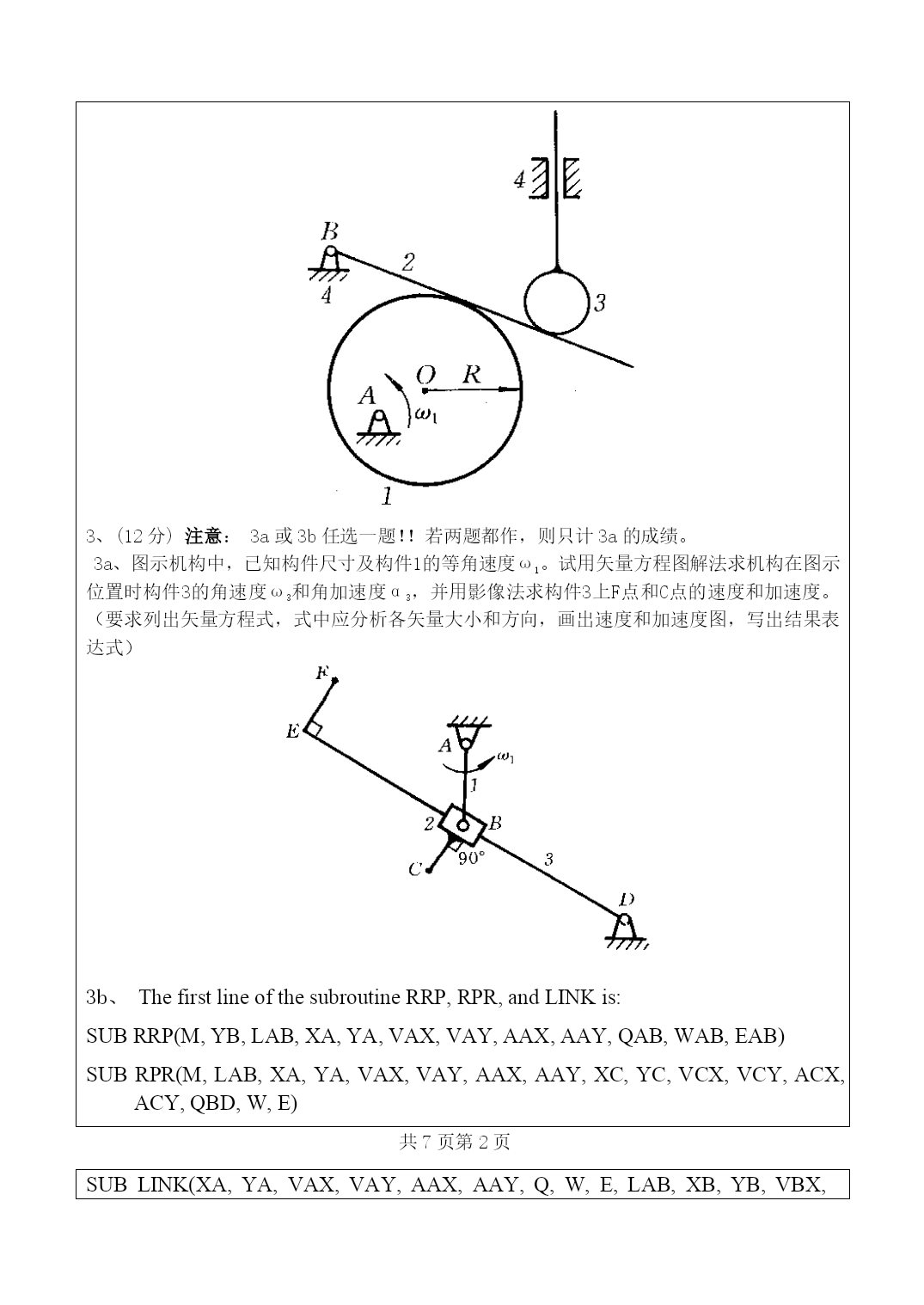 福州大学研究生入学考试机械原理硕士试题(完整版)(文档可以直接使用,也可根据实际需要修改使用,可编辑欢迎下载)福州大学2004年招收硕士/博士研究生入学考试试卷招生学院机械工程及自动化学院招生专业机械制造及其自动化考试科目机械原理科目编号414一、问答题:(40分)1、(3分)从机构结构和组成的观点来看,机构是由哪三部分组成的?2、(3分)机构的级别是如何定级的?3、(4分)双摇杆机构存在的条件是什么?4、(4分)在凸轮机构几种基本的从动件运动规律中,什么运动规律使凸轮机构产生刚性冲击?什么运动规律产生柔性冲击?什么运动规律则没有冲击?5、(3分)用范成法加工渐开线直齿圆柱齿轮,发生根切的原因是什么?6、(4分)与直齿轮传动相比较,斜齿轮传动的主要优点是什么,并简述其理由。7、(3分)机器中安装飞轮的目的是什么?8、(4分)某机器主轴的最大角速度,最小角速度,则该机器的主轴平均角速度等于多少?机器运转的速度不均匀系数等于多少?9、(4分)机器等效动力学模型中的等效质量(转动惯量)是根据什么原则进行转化的?等效力(力矩)又是根据什么原则进行转化的?10、(2分)齿式棘轮机构制动爪的作用是什么?11、(3分)在单销四槽的外槽轮机构中,槽轮转动的时间与静止的时间之比为多少?12、(4分)在满足什么条件时,双万向铰链机构的主、从动轴的角速度比恒为1?二、计算题1、(8分)在图示机构中,若以构件1为主动件,试:(1)计算自由度,说明是否有确定运动。(2)如要使构件6有确定运动,则可如何修改?说明修改的要点,并用简图表示。共72、(8分)在图示机构中,已知原动件1以匀角速度1沿逆时针方向转动,试确定:(1)机构的全部瞬心;(2)构件3的速度(需写出表达式)。3、(12分)注意:3a或3b任选一题!!若两题都作,则只计3a的成绩。3a、图示机构中,已知构件尺寸及构件1的等角速度ω1。试用矢量方程图解法求机构在图示位置时构件3的角速度ω3和角加速度α3,并用影像法求构件3上F点和C点的速度和加速度。(要求列出矢量方程式,式中应分析各矢量大小和方向,画出速度和加速度图,写出结果表达式)3b、ThefirstlineofthesubroutineRRP,RPR,andLINKis:SUBRRP(M,YB,LAB,XA,YA,VAX,VAY,AAX,AAY,QAB,WAB,EAB)SUBRPR(M,LAB,XA,YA,VAX,VAY,AAX,AAY,XC,YC,VCX,VCY,ACX,ACY,QBD,W,E)SUBLINK(XA,YA,VAX,VAY,AAX,AAY,Q,W,E,LAB,XB,YB,VBX,VBY,ABX,ABY),respectively.Inthemechanism,XB=YB=0,XF=100,YF=60,YC=120,LFE=50mm,LEC=130mm,LDE=105mm,LAB=160mm,DEC=30.ThecrankFErotatesataconstantspeedof10rad/sec.AmainprogramisrequiredtoanalyzetheoutputmotionsofthepointA.ThemechanismwillbeanalyzedforthewholecyclewhenthedriverFErotatesfrom0to360withastepsizeof5.4、(6分)图示为一偏置曲柄滑块机构。试问:AB杆成为曲柄的条件是什么?若以曲柄为主动件,机构的最大压力角等于多少(写出表达式)?发生在什么位置?5、(4分)在图示的曲柄摆动导杆机构中,曲柄1为主动件,构件3为从动件,试在图中画出该机构的极位夹角和摆动导杆的最大摆角6、(10分)如图所示铰链四杆机构运动简图中,构件1为原动件。(1)判断构件1能否成为曲柄;(2)用作图法求出构件3的最大摆角;(3)用作图法求出机构的最小传动角;(4)当分别固定构件1、2、3、4时,各获得何种机构?7、(8分)在曲柄摇杆机构中,已知曲柄AB与摇杆CD上的标线ED的两组对应位置如图所示,且ED的第二个位置E2D是其极限位置。试设计此曲柄摇杆机构。8、(10分)图示凸轮机构,要求:(1)写出该凸轮机构的名称;(2)画出凸轮的基圆;(3)画出从升程开始到图示位置时从动件的位移s,相对应的凸轮转角,B点处机构的压力角B,从动件处在最低位置时机构的压力角0.9、(10分)一对使用已久的直齿圆柱标准齿轮需要修复,其基本参数为:mm,,,,,。现在要求中心距不变,而大齿轮因修复齿面需将齿顶圆直径减小3mm。(1)试问能否采用等