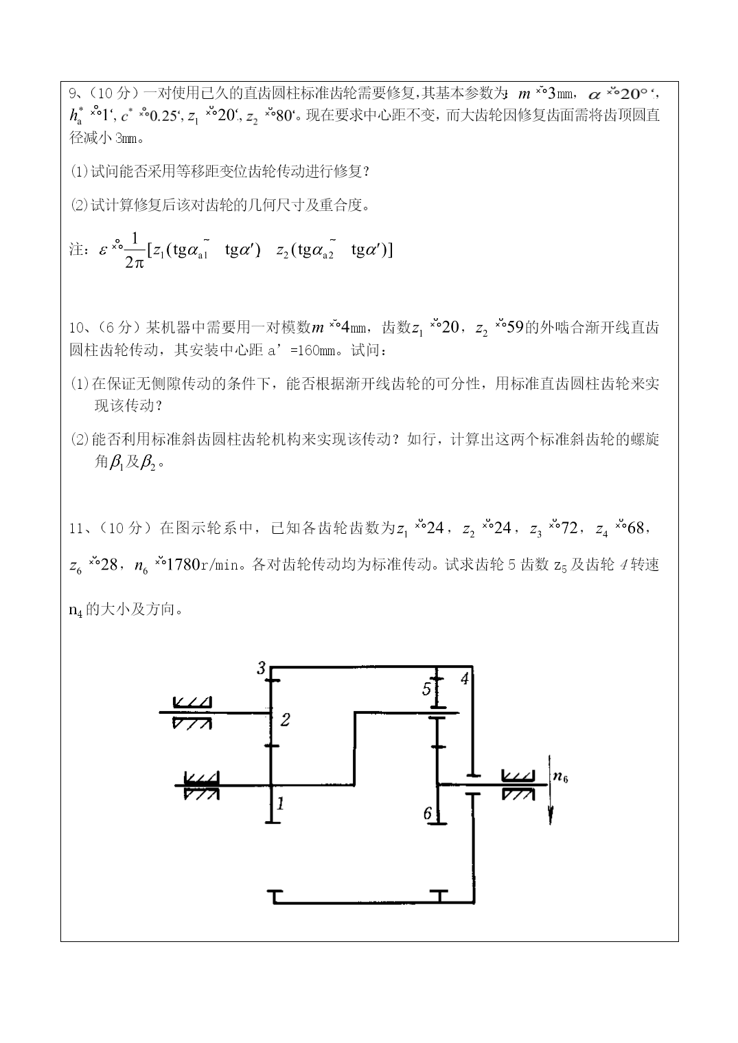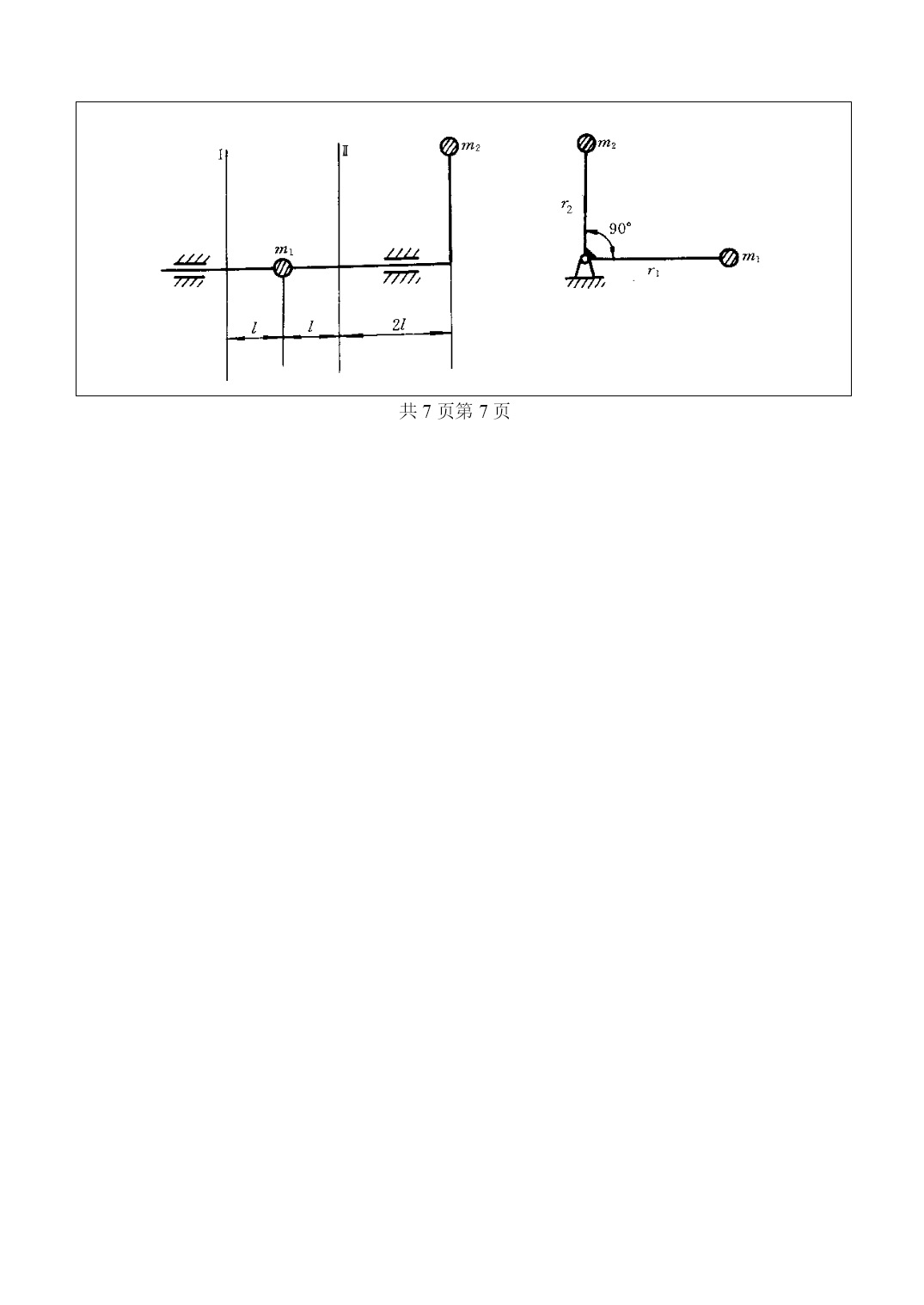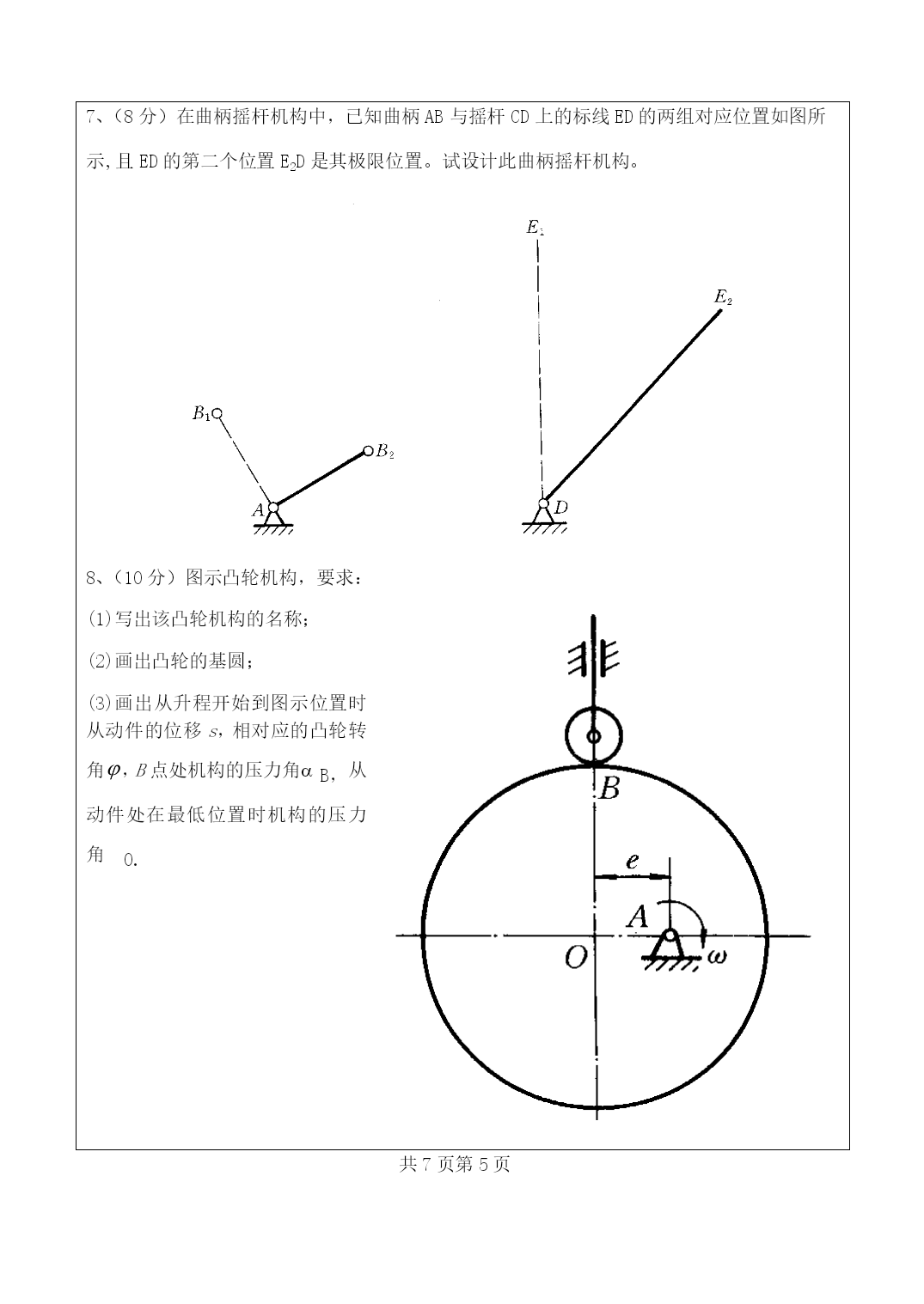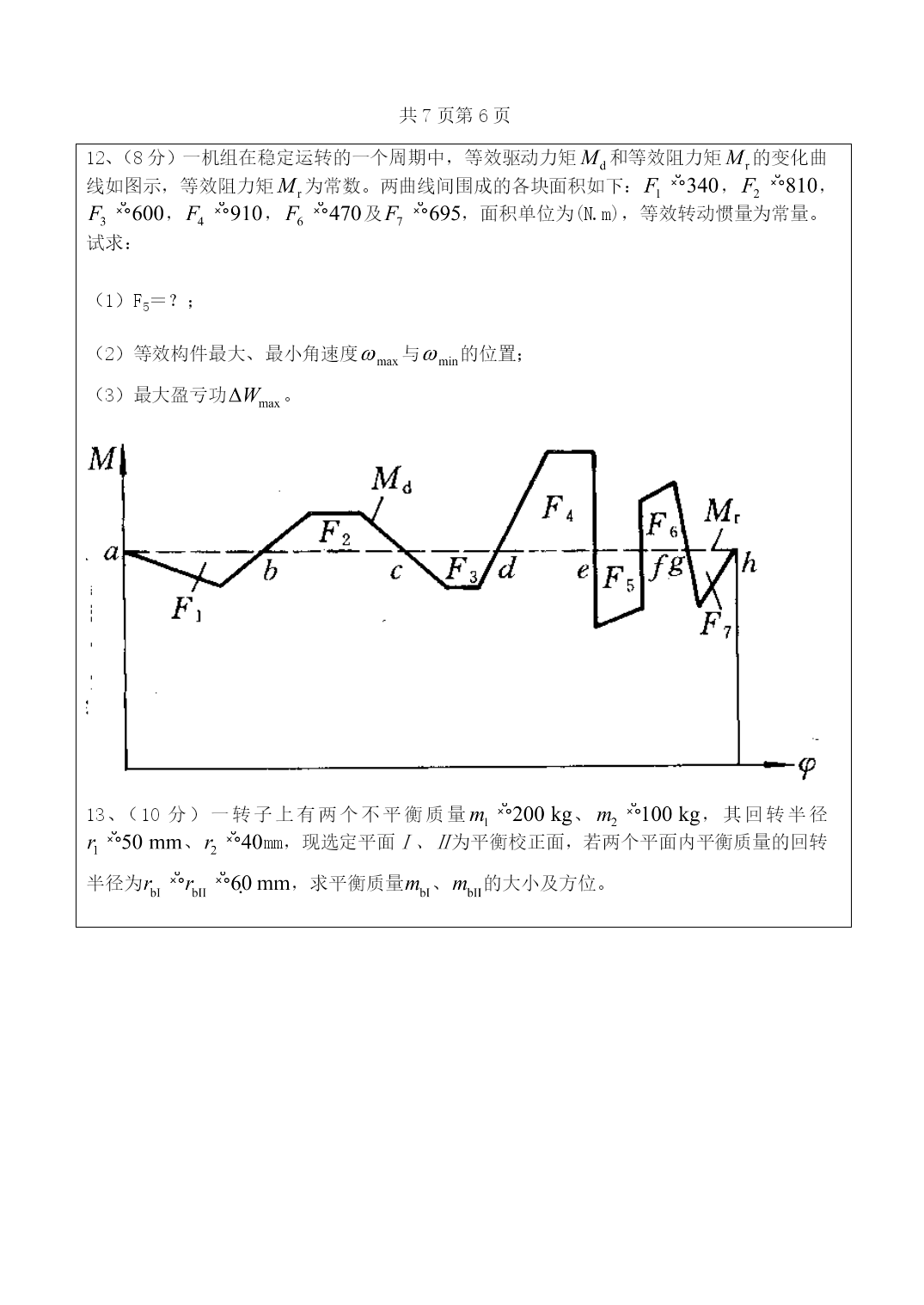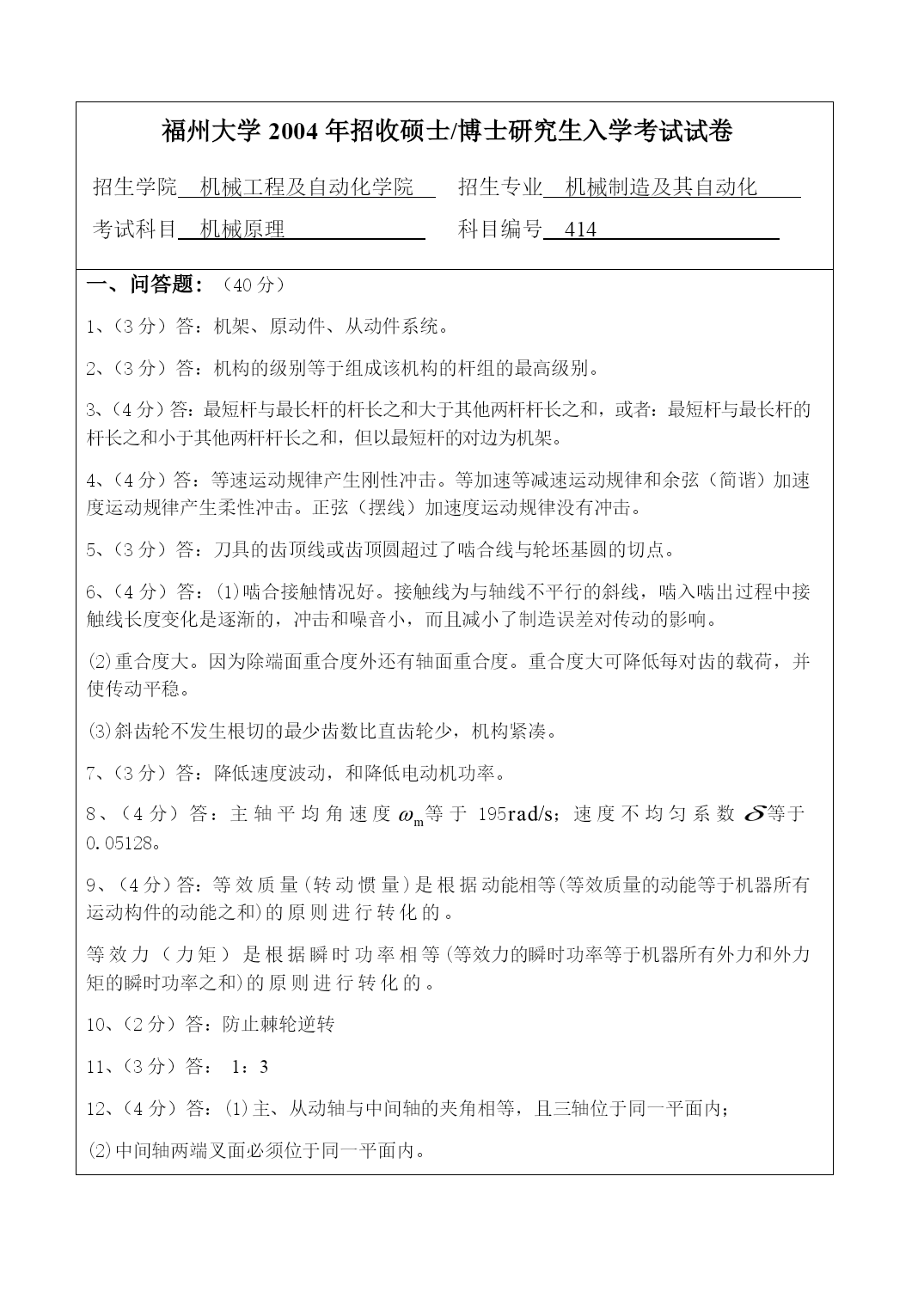 福州大学研究生入学考试机械原理硕士试题(完整版)(文档可以直接使用,也可根据实际需要修改使用,可编辑欢迎下载)福州大学2004年招收硕士/博士研究生入学考试试卷招生学院机械工程及自动化学院招生专业机械制造及其自动化考试科目机械原理科目编号414一、问答题:(40分)1、(3分)从机构结构和组成的观点来看,机构是由哪三部分组成的?2、(3分)机构的级别是如何定级的?3、(4分)双摇杆机构存在的条件是什么?4、(4分)在凸轮机构几种基本的从动件运动规律中,什么运动规律使凸轮机构产生刚性冲击?什么运动规律产生柔性冲击?什么运动规律则没有冲击?5、(3分)用范成法加工渐开线直齿圆柱齿轮,发生根切的原因是什么?6、(4分)与直齿轮传动相比较,斜齿轮传动的主要优点是什么,并简述其理由。7、(3分)机器中安装飞轮的目的是什么?8、(4分)某机器主轴的最大角速度,最小角速度,则该机器的主轴平均角速度等于多少?机器运转的速度不均匀系数等于多少?9、(4分)机器等效动力学模型中的等效质量(转动惯量)是根据什么原则进行转化的?等效力(力矩)又是根据什么原则进行转化的?10、(2分)齿式棘轮机构制动爪的作用是什么?11、(3分)在单销四槽的外槽轮机构中,槽轮转动的时间与静止的时间之比为多少?12、(4分)在满足什么条件时,双万向铰链机构的主、从动轴的角速度比恒为1?二、计算题1、(8分)在图示机构中,若以构件1为主动件,试:(1)计算自由度,说明是否有确定运动。(2)如要使构件6有确定运动,则可如何修改?说明修改的要点,并用简图表示。共72、(8分)在图示机构中,已知原动件1以匀角速度1沿逆时针方向转动,试确定:(1)机构的全部瞬心;(2)构件3的速度(需写出表达式)。3、(12分)注意:3a或3b任选一题!!若两题都作,则只计3a的成绩。3a、图示机构中,已知构件尺寸及构件1的等角速度ω1。试用矢量方程图解法求机构在图示位置时构件3的角速度ω3和角加速度α3,并用影像法求构件3上F点和C点的速度和加速度。(要求列出矢量方程式,式中应分析各矢量大小和方向,画出速度和加速度图,写出结果表达式)3b、ThefirstlineofthesubroutineRRP,RPR,andLINKis:SUBRRP(M,YB,LAB,XA,YA,VAX,VAY,AAX,AAY,QAB,WAB,EAB)SUBRPR(M,LAB,XA,YA,VAX,VAY,AAX,AAY,XC,YC,VCX,VCY,ACX,ACY,QBD,W,E)SUBLINK(XA,YA,VAX,VAY,AAX,AAY,Q,W,E,LAB,XB,YB,VBX,VBY,ABX,ABY),respectively.Inthemechanism,XB=YB=0,XF=100,YF=60,YC=120,LFE=50mm,LEC=130mm,LDE=105mm,LAB=160mm,DEC=30.ThecrankFErotatesataconstantspeedof10rad/sec.AmainprogramisrequiredtoanalyzetheoutputmotionsofthepointA.ThemechanismwillbeanalyzedforthewholecyclewhenthedriverFErotatesfrom0to360withastepsizeof5.4、(6分)图示为一偏置曲柄滑块机构。试问:AB杆成为曲柄的条件是什么?若以曲柄为主动件,机构的最大压力角等于多少(写出表达式)?发生在什么位置?5、(4分)在图示的曲柄摆动导杆机构中,曲柄1为主动件,构件3为从动件,试在图中画出该机构的极位夹角和摆动导杆的最大摆角6、(10分)如图所示铰链四杆机构运动简图中,构件1为原动件。(1)判断构件1能否成为曲柄;(2)用作图法求出构件3的最大摆角;(3)用作图法求出机构的最小传动角;(4)当分别固定构件1、2、3、4时,各获得何种机构?7、(8分)在曲柄摇杆机构中,已知曲柄AB与摇杆CD上的标线ED的两组对应位置如图所示,且ED的第二个位置E2D是其极限位置。试设计此曲柄摇杆机构。8、(10分)图示凸轮机构,要求:(1)写出该凸轮机构的名称;(2)画出凸轮的基圆;(3)画出从升程开始到图示位置时从动件的位移s,相对应的凸轮转角,B点处机构的压力角B,从动件处在最低位置时机构的压力角0.9、(10分)一对使用已久的直齿圆柱标准齿轮需要修复,其基本参数为:mm,,,,,。现在要求中心距不变,而大齿轮因修复齿面需将齿顶圆直径减小3mm。(1)试问能否采用等