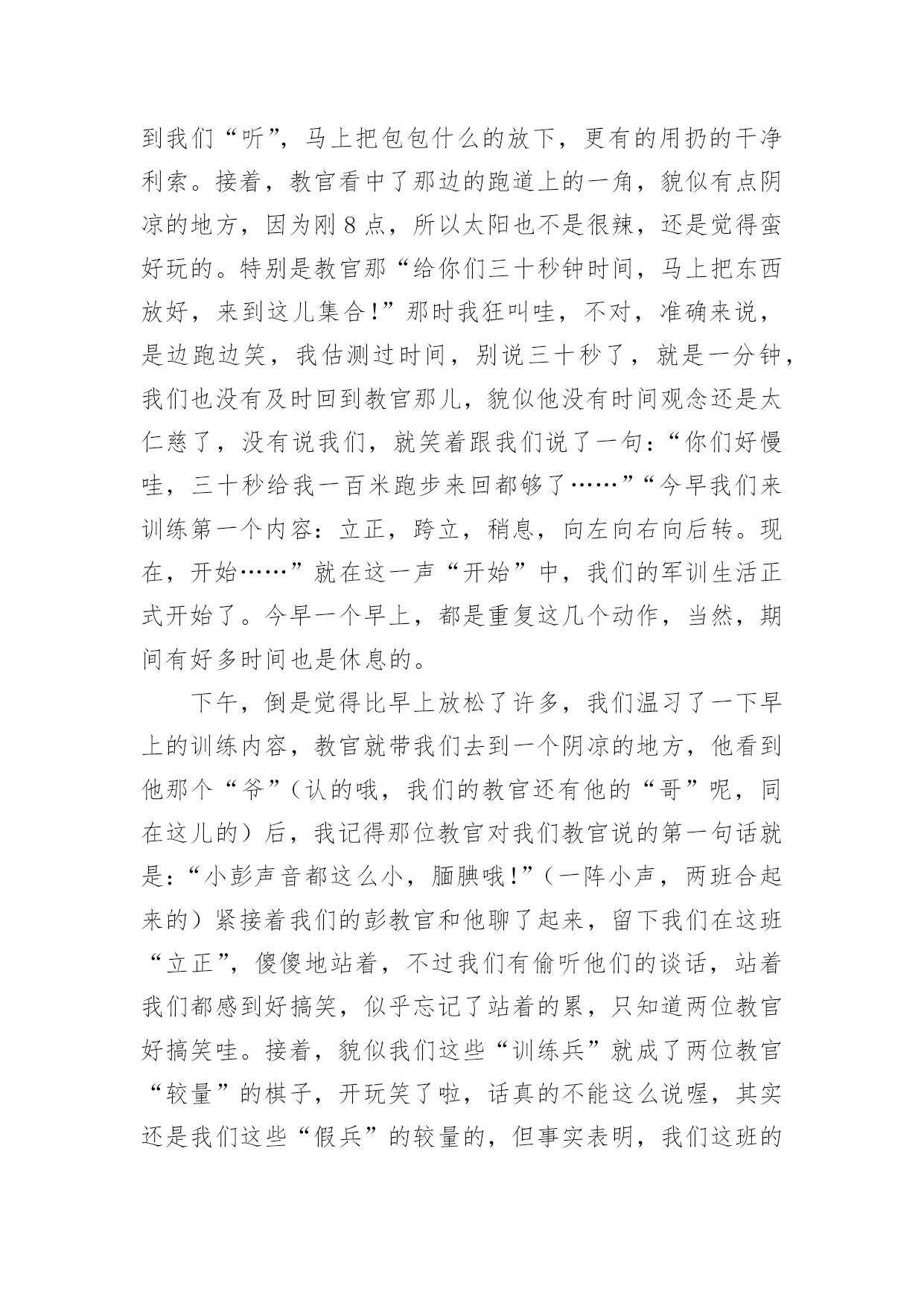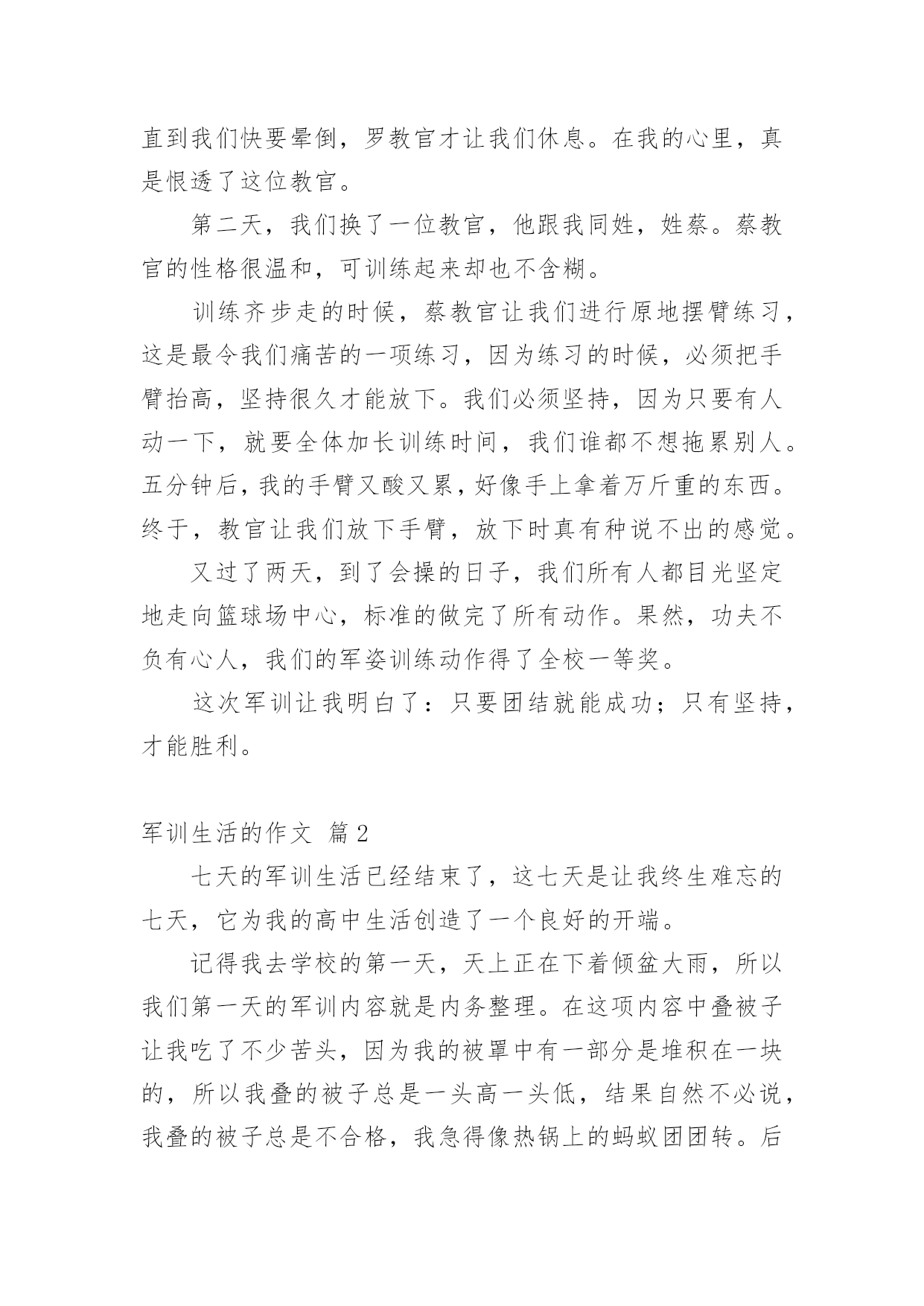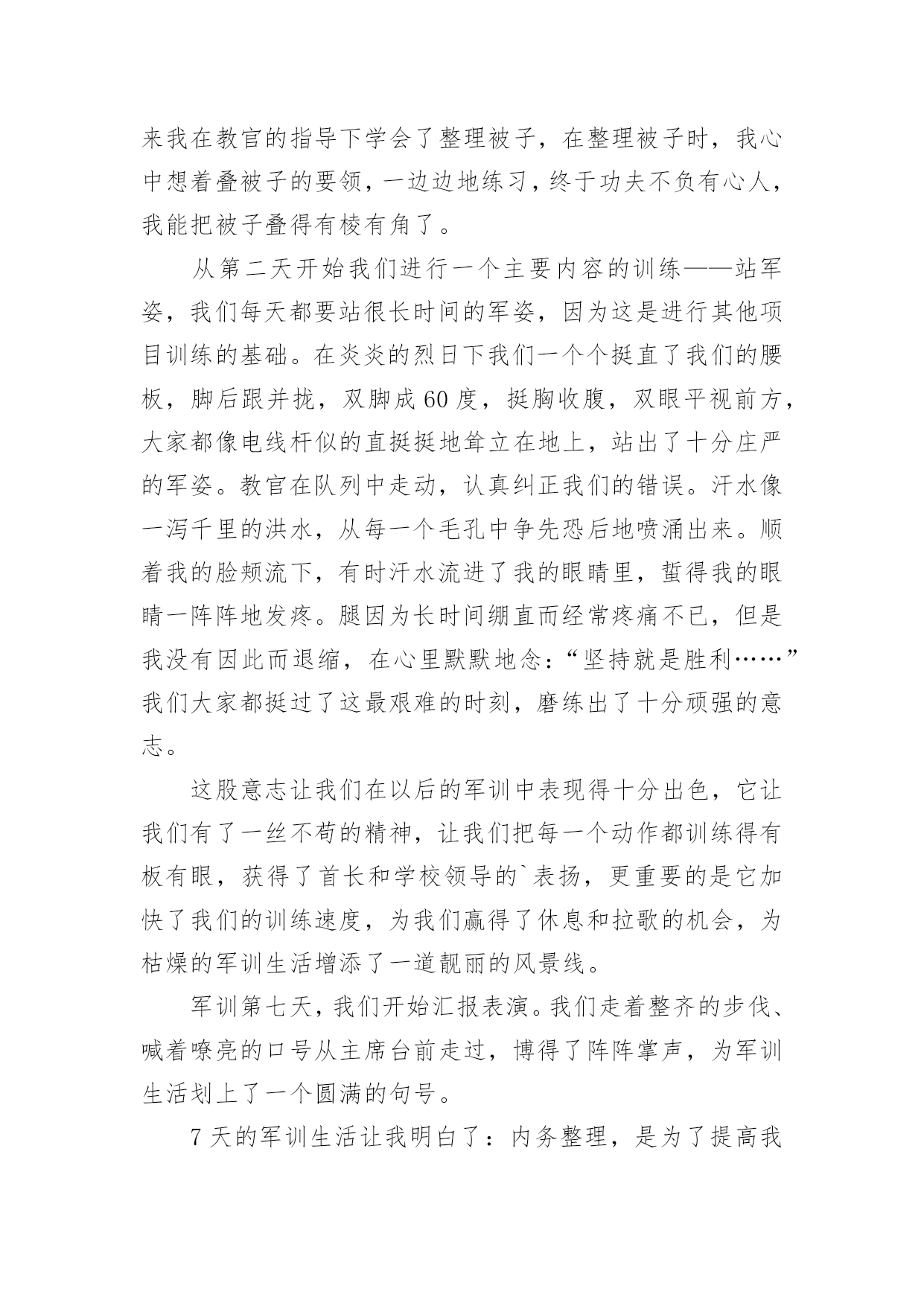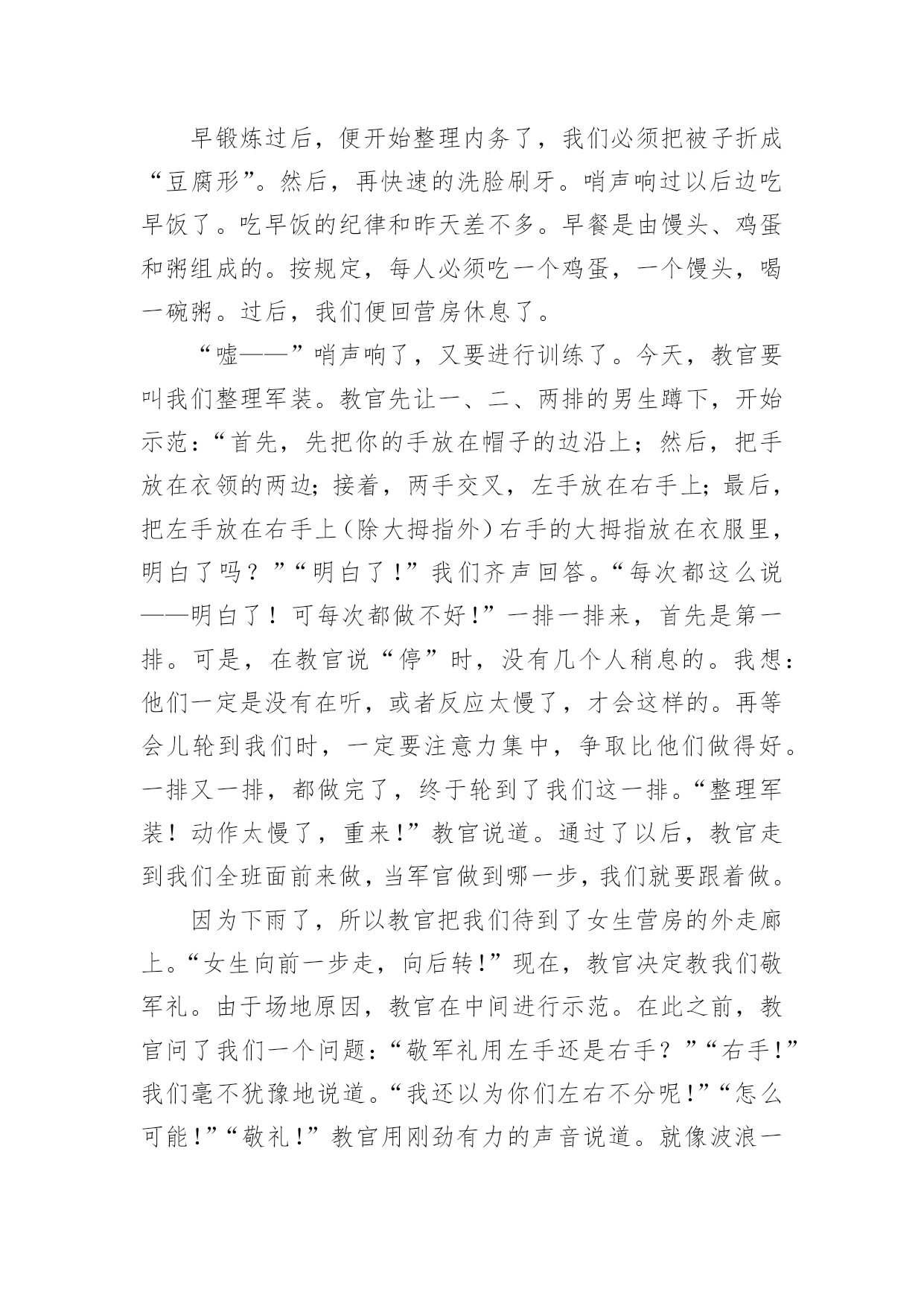 军训生活的作文军训生活的作文10篇在生活、工作和学习中,大家都尝试过写作文吧,作文是人们以书面形式表情达意的言语活动。那么你有了解过作文吗?以下是小编整理的军训生活的作文10篇,欢迎大家借鉴与参考,希望对大家有所帮助。军训生活的作文篇1七年级开学四个星期后,我们终于迎来了为期四天的军训生活。这四天,令我终身难忘,也让我明白了许多道理。星期一,是我们军训的第一天。吃过早餐,我便满怀期待的来到学校,看看同学们,好像也都等待着军训的到来。就在我们浑然不觉的.时候,噩梦开始了。打过上课铃后,我们有秩序地排好队,快速地走到操场上,开始军训的开幕式。十二名军人规范地给我们展示了各种军姿的标准动作,让我们敬佩不已;他们就是我们的教官。我们的教官是罗教官,他的脾气很暴躁,一上来就要我们站军姿。他告诉我们站军姿的要求:脚跟靠紧,脚尖分开60度;双臂微微向后夹,大拇指贴着食指的第二关节,手贴着裤缝,手臂自然下垂;头抬平,双眼直视前方;身体微微向前倾斜。随着太阳越升越高,地表温度也越来越高,许多人站得脸色苍白,全身是汗,可他们却仍旧一动不动,咬牙坚持。直到我们快要晕倒,罗教官才让我们休息。在我的心里,真是恨透了这位教官。第二天,我们换了一位教官,他跟我同姓,姓蔡。蔡教官的性格很温和,可训练起来却也不含糊。训练齐步走的时候,蔡教官让我们进行原地摆臂练习,这是最令我们痛苦的一项练习,因为练习的时候,必须把手臂抬高,坚持很久才能放下。我们必须坚持,因为只要有人动一下,就要全体加长训练时间,我们谁都不想拖累别人。五分钟后,我的手臂又酸又累,好像手上拿着万斤重的东西。终于,教官让我们放下手臂,放下时真有种说不出的感觉。又过了两天,到了会操的日子,我们所有人都目光坚定地走向篮球场中心,标准的做完了所有动作。果然,功夫不负有心人,我们的军姿训练动作得了全校一等奖。这次军训让我明白了:只要团结就能成功;只有坚持,才能胜利。军训生活的作文篇2七天的军训生活已经结束了,这七天是让我终生难忘的七天,它为我的高中生活创造了一个良好的开端。记得我去学校的第一天,天上正在下着倾盆大雨,所以我们第一天的军训内容就是内务整理。在这项内容中叠被子让我吃了不少苦头,因为我的被罩中有一部分是堆积在一块的,所以我叠的被子总是一头高一头低,结果自然不必说,我叠的被子总是不合格,我急得像热锅上的蚂蚁团团转。后来我在教官的指导下学会了整理被子,在整理被子时,我心中想着叠被子的要领,一边边地练习,终于功夫不负有心人,我能把被子叠得有棱有角了。从第二天开始我们进行一个主要内容的训练——站军姿,我们每天都要站很长时间的军姿,因为这是进行其他项目训练的基础。在炎炎的烈日下我们一个个挺直了我们的腰板,脚后跟并拢,双脚成60度,挺胸收腹,双眼平视前方,大家都像电线杆似的直挺挺地耸立在地上,站出了十分庄严的军姿。教官在队列中走动,认真纠正我们的错误。汗水像一泻千里的洪水,从每一个毛孔中争先恐后地喷涌出来。顺着我的脸颊流下,有时汗水流进了我的眼睛里,蜇得我的眼睛一阵阵地发疼。腿因为长时间绷直而经常疼痛不已,但是我没有因此而退缩,在心里默默地念:“坚持就是胜利……”我们大家都挺过了这最艰难的时刻,磨练出了十分顽强的意志。这股意志让我们在以后的军训中表现得十分出色,它让我们有了一丝不苟的精神,让我们把每一个动作都训练得有板有眼,获得了首长和学校领导的`表扬,更重要的是它加快了我们的训练速度,为我们赢得了休息和拉歌的机会,为枯燥的军训生活增添了一道靓丽的风景线。军训第七天,我们开始汇报表演。我们走着整齐的步伐、喊着嘹亮的口号从主席台前走过,博得了阵阵掌声,为军训生活划上了一个圆满的句号。7天的军训生活让我明白了:内务整理,是为了提高我们的生活自理能力,培养思想上的自立和独立,还能帮助我们养成严格自律的良好习惯;站军姿,是为了体现炎黄子孙不屈不饶的精神,体现了龙的传人的毅力;练转身,体现了人类敏捷的思维。我相信,军训生活将使我终身受益。军训结束了,我知道那不是解脱,而是不舍……军训结束了,而过程的点滴却成为永恒的记忆。我将会带着这段美好的回忆,勇敢地接受人生中的每一个挑战。军训生活的作文篇3要说我们班的男生,真是没话说,讽刺不是厉害的没话说,是惭愧的没话说每天看着别的班的男生几十个俯卧撑做的.是轻松自如,在想我们班的男生是不是也这么厉害,有一天,终于让我们看清了他们的真面目.话说那天,老师让没上交作文的男生做俯卧撑,我们女生满心期待,能看到他们最MAN的一面,但事实却是残忍的,心碎他们那些男生做的哪叫俯卧撑啊,整个人都趴在地上了,连有一个都做不了,我也挺佩服他们的,能把俯卧撑做成这样.真是丢脸啊!军训生活的作文篇4今天,听到一阵口哨声后,我就马上起床了。我赶紧换上迷彩服,还没来得及梳头、洗脸、刷牙、整理被子就要集