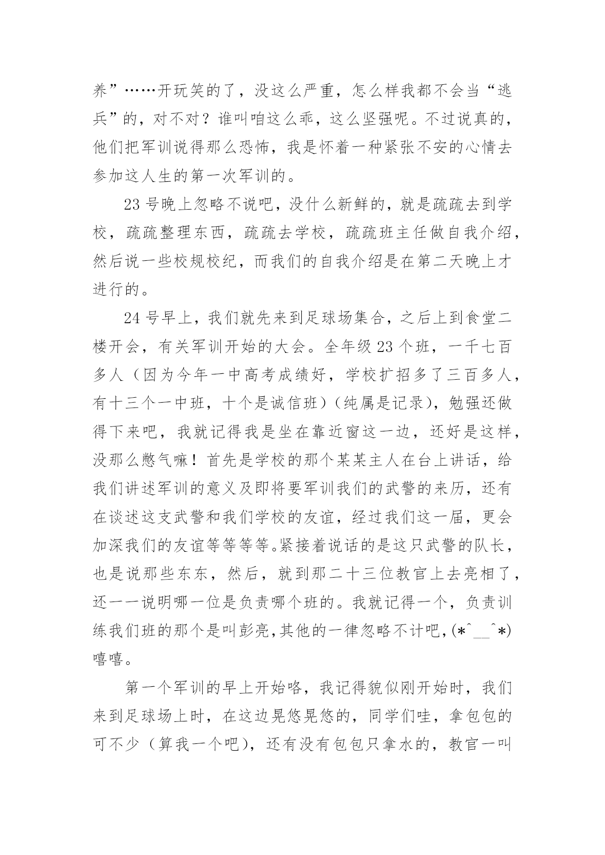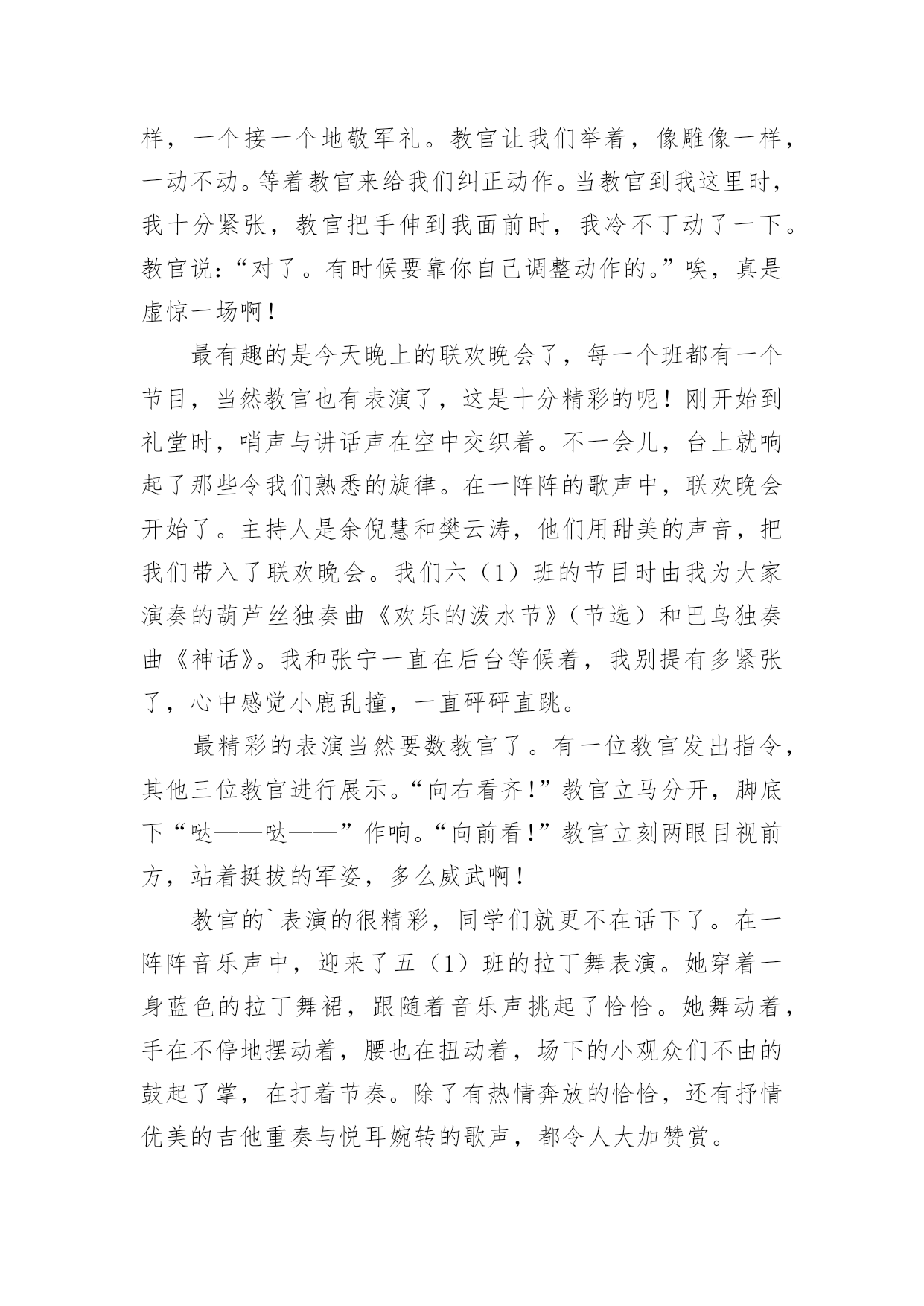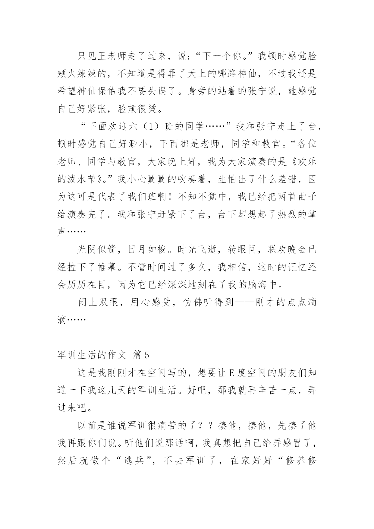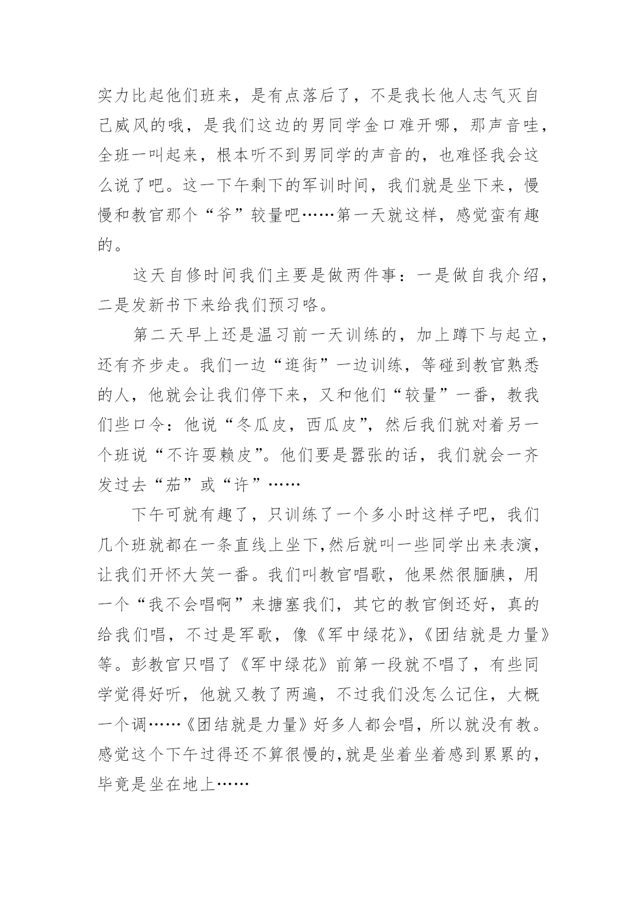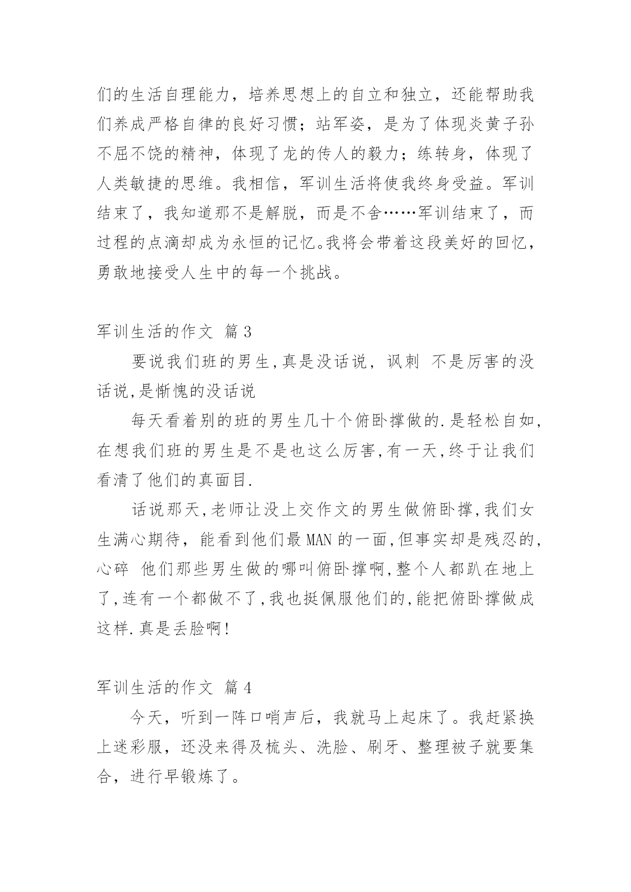 军训生活的作文军训生活的作文10篇在生活、工作和学习中,大家都尝试过写作文吧,作文是人们以书面形式表情达意的言语活动。那么你有了解过作文吗?以下是小编整理的军训生活的作文10篇,欢迎大家借鉴与参考,希望对大家有所帮助。军训生活的作文篇1七年级开学四个星期后,我们终于迎来了为期四天的军训生活。这四天,令我终身难忘,也让我明白了许多道理。星期一,是我们军训的第一天。吃过早餐,我便满怀期待的来到学校,看看同学们,好像也都等待着军训的到来。就在我们浑然不觉的.时候,噩梦开始了。打过上课铃后,我们有秩序地排好队,快速地走到操场上,开始军训的开幕式。十二名军人规范地给我们展示了各种军姿的标准动作,让我们敬佩不已;他们就是我们的教官。我们的教官是罗教官,他的脾气很暴躁,一上来就要我们站军姿。他告诉我们站军姿的要求:脚跟靠紧,脚尖分开60度;双臂微微向后夹,大拇指贴着食指的第二关节,手贴着裤缝,手臂自然下垂;头抬平,双眼直视前方;身体微微向前倾斜。随着太阳越升越高,地表温度也越来越高,许多人站得脸色苍白,全身是汗,可他们却仍旧一动不动,咬牙坚持。直到我们快要晕倒,罗教官才让我们休息。在我的心里,真是恨透了这位教官。第二天,我们换了一位教官,他跟我同姓,姓蔡。蔡教官的性格很温和,可训练起来却也不含糊。训练齐步走的时候,蔡教官让我们进行原地摆臂练习,这是最令我们痛苦的一项练习,因为练习的时候,必须把手臂抬高,坚持很久才能放下。我们必须坚持,因为只要有人动一下,就要全体加长训练时间,我们谁都不想拖累别人。五分钟后,我的手臂又酸又累,好像手上拿着万斤重的东西。终于,教官让我们放下手臂,放下时真有种说不出的感觉。又过了两天,到了会操的日子,我们所有人都目光坚定地走向篮球场中心,标准的做完了所有动作。果然,功夫不负有心人,我们的军姿训练动作得了全校一等奖。这次军训让我明白了:只要团结就能成功;只有坚持,才能胜利。军训生活的作文篇2七天的军训生活已经结束了,这七天是让我终生难忘的七天,它为我的高中生活创造了一个良好的开端。记得我去学校的第一天,天上正在下着倾盆大雨,所以我们第一天的军训内容就是内务整理。在这项内容中叠被子让我吃了不少苦头,因为我的被罩中有一部分是堆积在一块的,所以我叠的被子总是一头高一头低,结果自然不必说,我叠的被子总是不合格,我急得像热锅上的蚂蚁团团转。后来我在教官的指导下学会了整理被子,在整理被子时,我心中想着叠被子的要领,一边边地练习,终于功夫不负有心人,我能把被子叠得有棱有角了。从第二天开始我们进行一个主要内容的训练——站军姿,我们每天都要站很长时间的军姿,因为这是进行其他项目训练的基础。在炎炎的烈日下我们一个个挺直了我们的腰板,脚后跟并拢,双脚成60度,挺胸收腹,双眼平视前方,大家都像电线杆似的直挺挺地耸立在地上,站出了十分庄严的军姿。教官在队列中走动,认真纠正我们的错误。汗水像一泻千里的洪水,从每一个毛孔中争先恐后地喷涌出来。顺着我的脸颊流下,有时汗水流进了我的眼睛里,蜇得我的眼睛一阵阵地发疼。腿因为长时间绷直而经常疼痛不已,但是我没有因此而退缩,在心里默默地念:“坚持就是胜利……”我们大家都挺过了这最艰难的时刻,磨练出了十分顽强的意志。这股意志让我们在以后的军训中表现得十分出色,它让我们有了一丝不苟的精神,让我们把每一个动作都训练得有板有眼,获得了首长和学校领导的`表扬,更重要的是它加快了我们的训练速度,为我们赢得了休息和拉歌的机会,为枯燥的军训生活增添了一道靓丽的风景线。军训第七天,我们开始汇报表演。我们走着整齐的步伐、喊着嘹亮的口号从主席台前走过,博得了阵阵掌声,为军训生活划上了一个圆满的句号。7天的军训生活让我明白了:内务整理,是为了提高我们的生活自理能力,培养思想上的自立和独立,还能帮助我们养成严格自律的良好习惯;站军姿,是为了体现炎黄子孙不屈不饶的精神,体现了龙的传人的毅力;练转身,体现了人类敏捷的思维。我相信,军训生活将使我终身受益。军训结束了,我知道那不是解脱,而是不舍……军训结束了,而过程的点滴却成为永恒的记忆。我将会带着这段美好的回忆,勇敢地接受人生中的每一个挑战。军训生活的作文篇3要说我们班的男生,真是没话说,讽刺不是厉害的没话说,是惭愧的没话说每天看着别的班的男生几十个俯卧撑做的.是轻松自如,在想我们班的男生是不是也这么厉害,有一天,终于让我们看清了他们的真面目.话说那天,老师让没上交作文的男生做俯卧撑,我们女生满心期待,能看到他们最MAN的一面,但事实却是残忍的,心碎他们那些男生做的哪叫俯卧撑啊,整个人都趴在地上了,连有一个都做不了,我也挺佩服他们的,能把俯卧撑做成这样.真是丢脸啊!军训生活的作文篇4今天,听到一阵口哨声后,我就马上起床了。我赶紧换上迷彩服,还没来得及梳头、洗脸、刷牙、整理被子就要集
