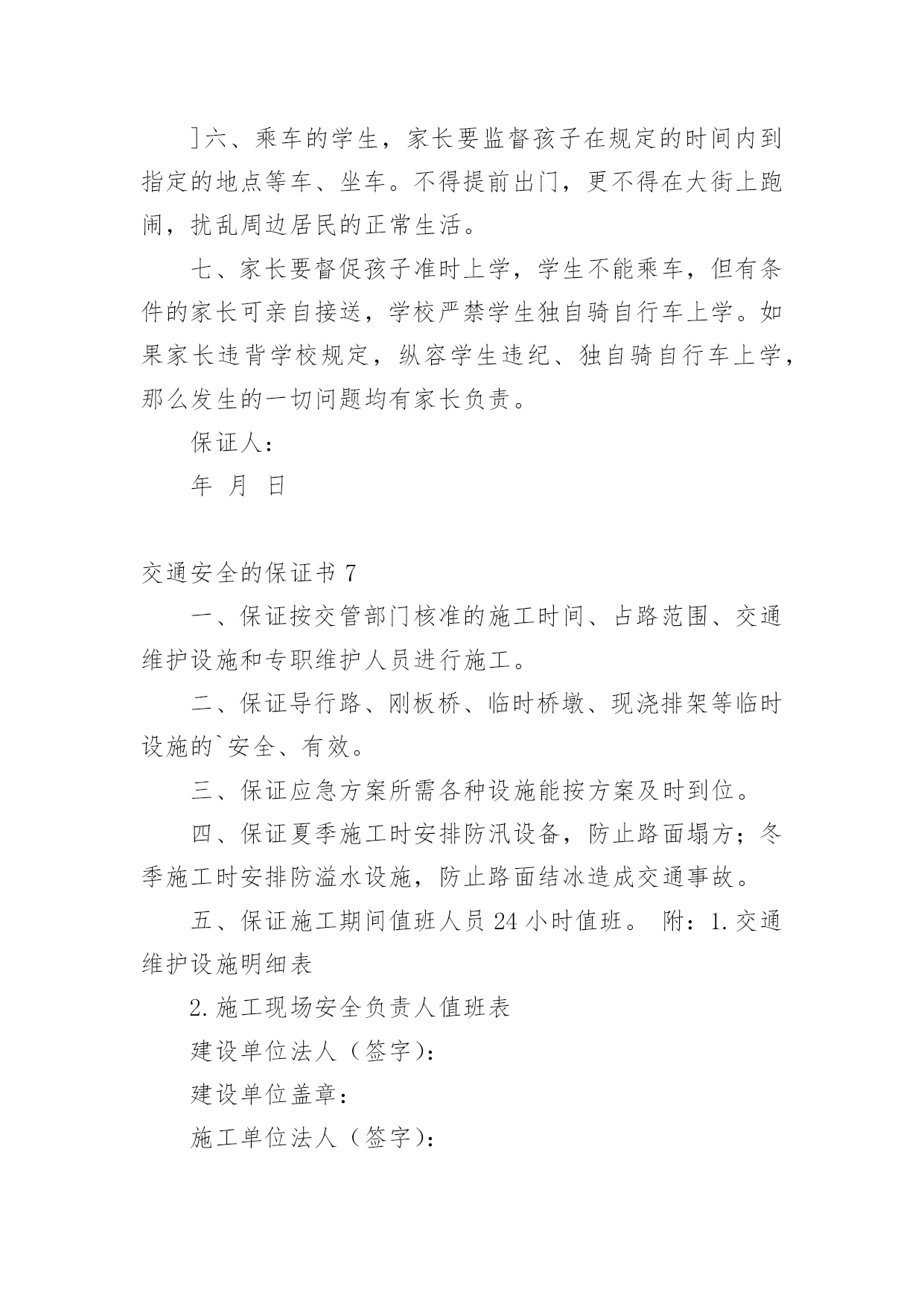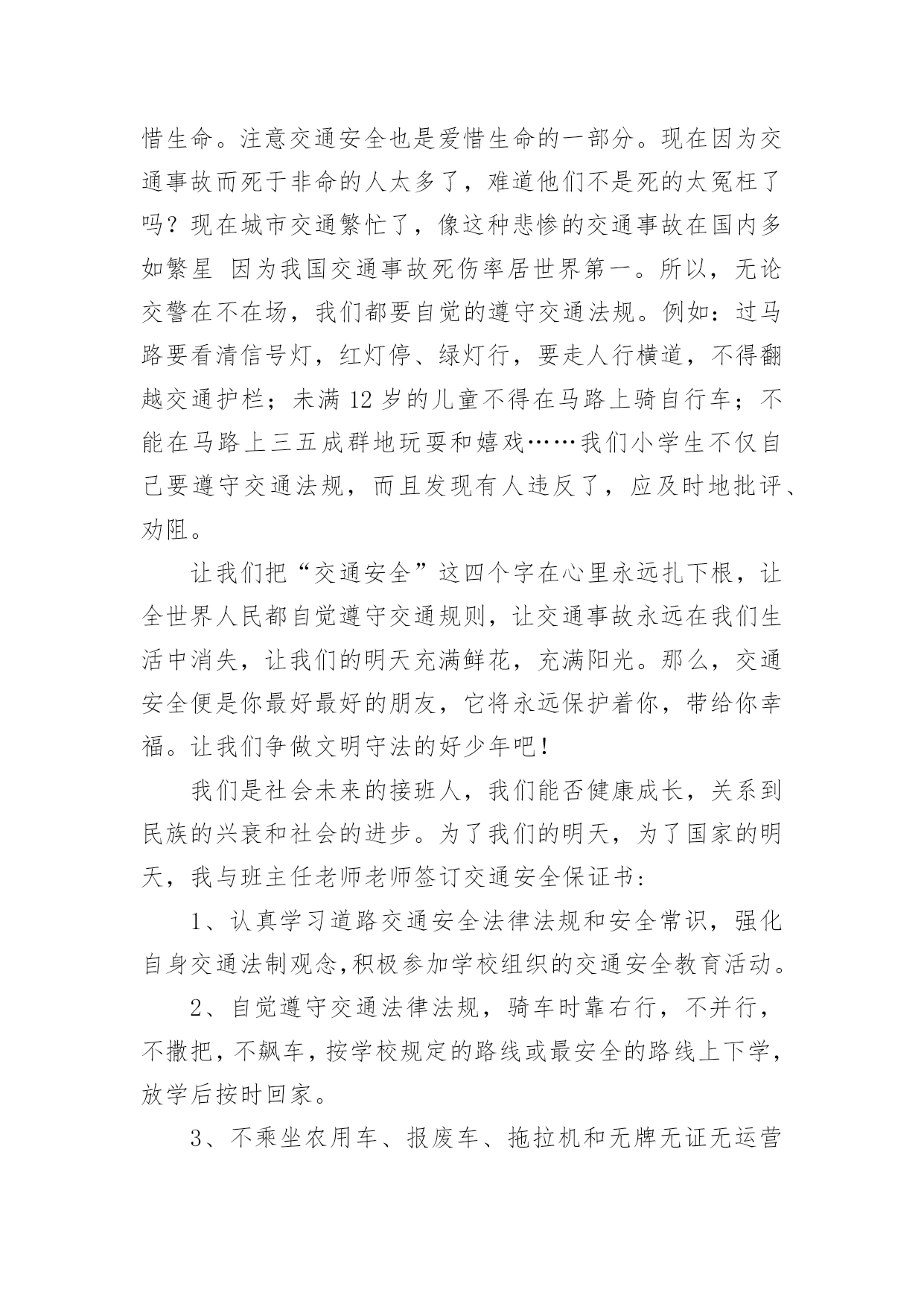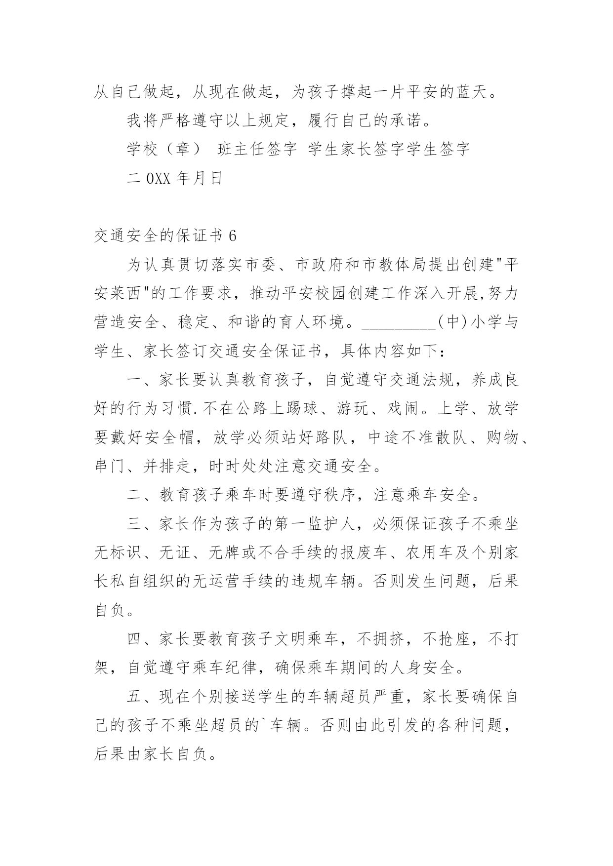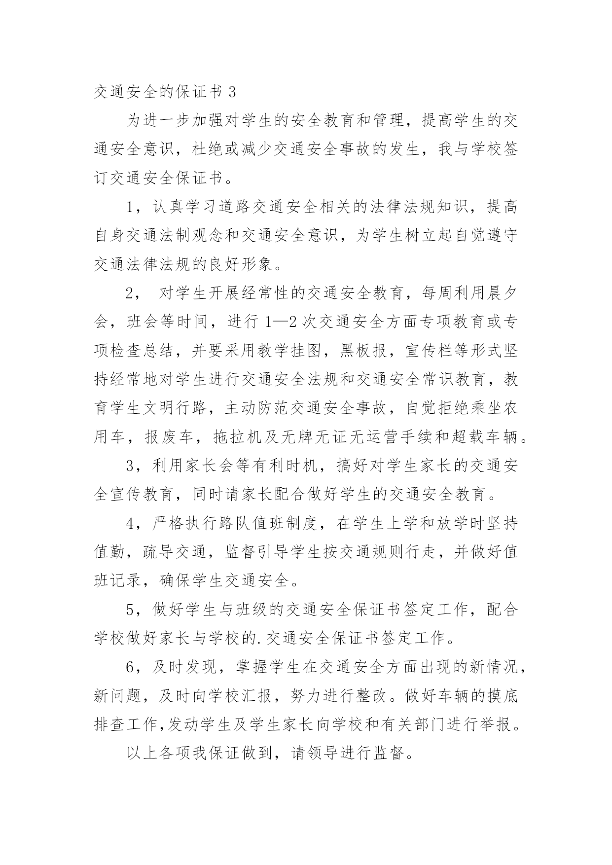 交通安全的保证书在生活中,保证书使用的次数愈发增长,保证书是个人信用的保证。那么你真正懂得怎么写好保证书吗?下面是小编收集整理的交通安全的保证书,欢迎阅读与收藏。交通安全的保证书1生命是宝贵的,人的一生就只有一次生命,我们应该爱惜生命。注意交通安全也是爱惜生命的一部分。现在因为交通事故而死于非命的人太多了,难道他们不是死的太冤枉了吗?现在城市交通繁忙了,像这种悲惨的交通事故在国内多如繁星,因为我国交通事故死伤率居世界第一。所以,无论交警在不在场,我们都要自觉的遵守交通法规。例如:过马路要看清信号灯,红灯停、绿灯行,要走人行横道,不得翻越交通护栏;未满12岁的儿童不得在马路上骑自行车;不能在马路上三五成群地玩耍和嬉戏……我们小学生不仅自己要遵守交通法规,而且发现有人违反了,应及时地批评、劝阻。让我们把“交通安全”这四个字在心里永远扎下根,让全世界人民都自觉遵守交通规则,让交通事故永远在我们生活中消失,让我们的明天充满鲜花,充满阳光。那么,交通安全便是你最好最好的朋友,它将永远保护着你,带给你幸福。让我们争做文明守法的好孩子吧!我们是社会未来的接班人,我们能否健康成长,关系到民族的兴衰和社会的进步。为了我们的明天,为了国家的明天,我学校签订交通安全保证书:1、认真学习道路交通安全法律法规和安全常识,强化自身交通法制观念,积极参加学校组织的.交通安全教育活动。2、自觉遵守交通法律法规,骑车时靠右行,不并行,不撒把,不飙车,按学校规定的路线或最安全的路线上下学,放学后按时回家。3、不乘坐农用车、报废车、拖拉机和无牌无证无运营手续的车辆,拒绝乘坐超载车辆。对运载学生的可疑车辆及时向班主任及学校领导汇报或向有关部门进行举报。4、将在学校学到的交通安全法律法规知识传达给家长,请他们对自己在遵守交通安全方面的行为进行监督与教育。以上各项我保证做到,请老师予以监督。班级:保证人:班主任:交通安全的保证书2上帝是公平的也是吝啬的,他只赐予每个人一次生命,所以我们必须珍惜。生活中交通安全与我们的关系是非常密切的,它就像我们的朋友。日日夜夜都守在我们的身边,教育我们,劝戒我们。生命是宝贵的,人的一生就只有一次生命,我们应该爱惜生命。注意交通安全也是爱惜生命的一部分。现在因为交通事故而死于非命的人太多了,难道他们不是死的太冤枉了吗?现在城市交通繁忙了,像这种悲惨的交通事故在国内多如繁星因为我国交通事故死伤率居世界第一。所以,无论交警在不在场,我们都要自觉的遵守交通法规。例如:过马路要看清信号灯,红灯停、绿灯行,要走人行横道,不得翻越交通护栏;未满12岁的儿童不得在马路上骑自行车;不能在马路上三五成群地玩耍和嬉戏……我们小学生不仅自己要遵守交通法规,而且发现有人违反了,应及时地批评、劝阻。让我们把“交通安全”这四个字在心里永远扎下根,让全世界人民都自觉遵守交通规则,让交通事故永远在我们生活中消失,让我们的明天充满鲜花,充满阳光。那么,交通安全便是你最好最好的朋友,它将永远保护着你,带给你幸福。让我们争做文明守法的好少年吧!我们是社会未来的接班人,我们能否健康成长,关系到民族的兴衰和社会的进步。为了我们的明天,为了国家的明天,我与班主任老师老师签订交通安全保证书:1、认真学习道路交通安全法律法规和安全常识,强化自身交通法制观念,积极参加学校组织的交通安全教育活动。2、自觉遵守交通法律法规,骑车时靠右行,不并行,不撒把,不飙车,按学校规定的路线或最安全的路线上下学,放学后按时回家。3、不乘坐农用车、报废车、拖拉机和无牌无证无运营手续的车辆,拒绝乘坐超载车辆。对运载学生的'可疑车辆及时向班主任老师及学校领导汇报或向有关部门进行举报。4、将在学校学到的交通安全法律法规知识传达给家长,请他们对自己在遵守交通安全方面的行为进行监督与教育。以上各项我保证做到,请老师予以监督。为了我的自身安全,我保证做到以下几点:1、不到河、湾等有水的地方去晚。2、放学路上遵守交通规则,不爬车、不追车。3、不上墙爬屋、不上树或下井挖鸟。4、不玩火、不乱动电器。5、不到铁路边玩耍。6、养成良好的卫生习惯,不吃腐烂变质的食物。7、放学后立即回家,不随便外出。8、严格遵守社会的法律法规和学校的规章制度。9、按学校规定的时间到校,不迟到,不旷课,不早退。10、团结同学,尊敬师长,认真完成老师布置的作业。11、不把管制刀具、棍棒等与学习无关的物品带到学校。我保证以上面的条款严格要求自己,若有违反,承担一切责任,与学校老师无关。家长:学生:班主任老师:xx年。3。16交通安全的保证书3为进一步加强对学生的安全教育和管理,提高学生的交通安全意识,杜绝或减少交通安全事故的发生,我与学校签订交通安全保证书。1,认真学习道路交通安全相关的法律法规知识,提高自身交通法制观念和交通安全意识,为学生树立起自