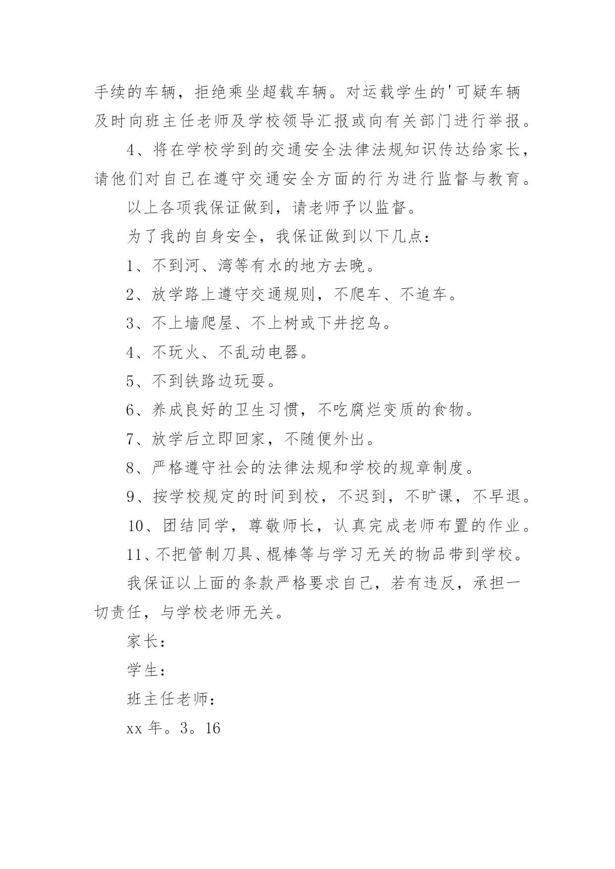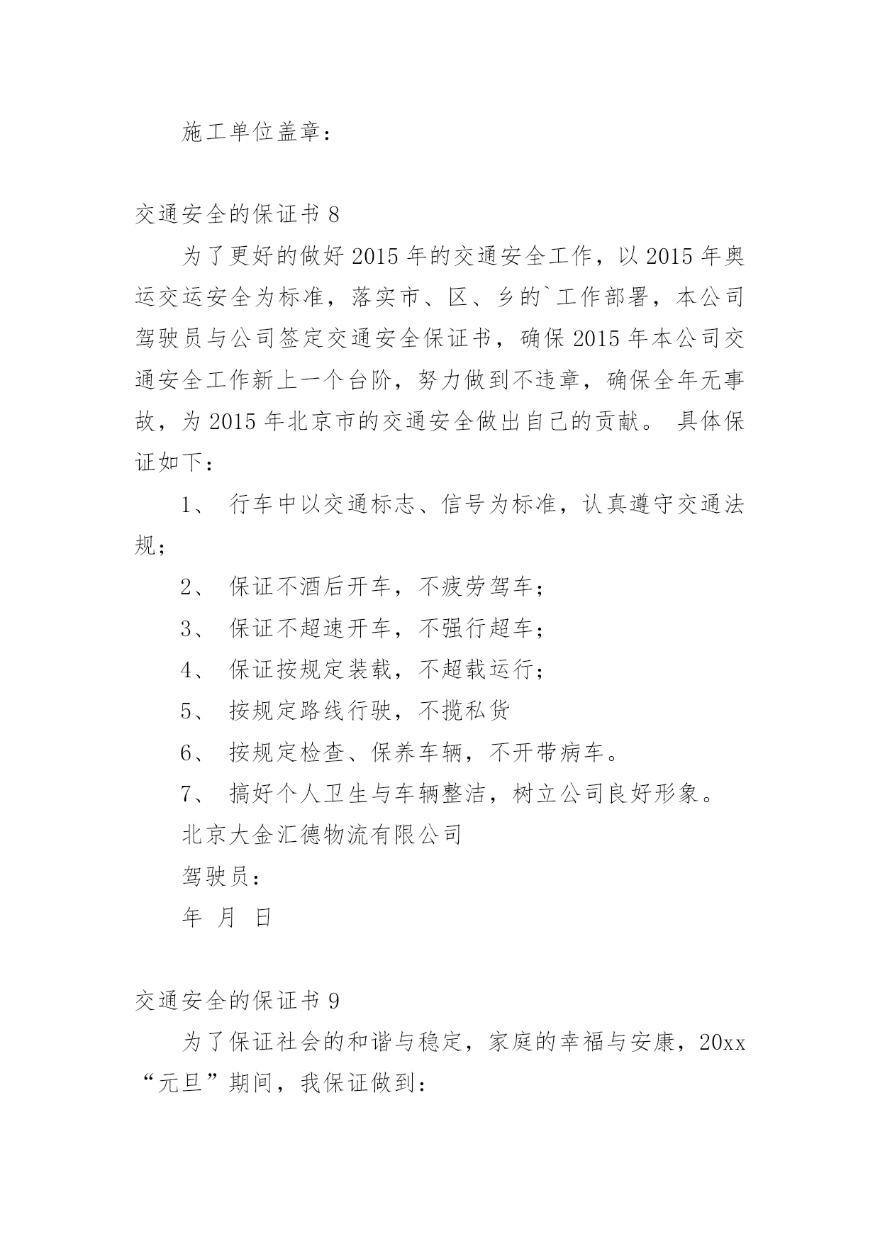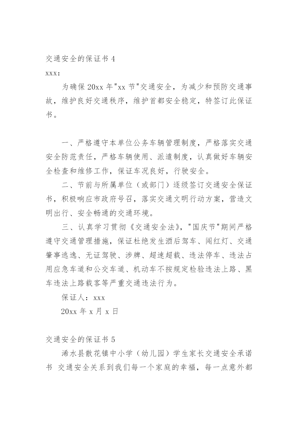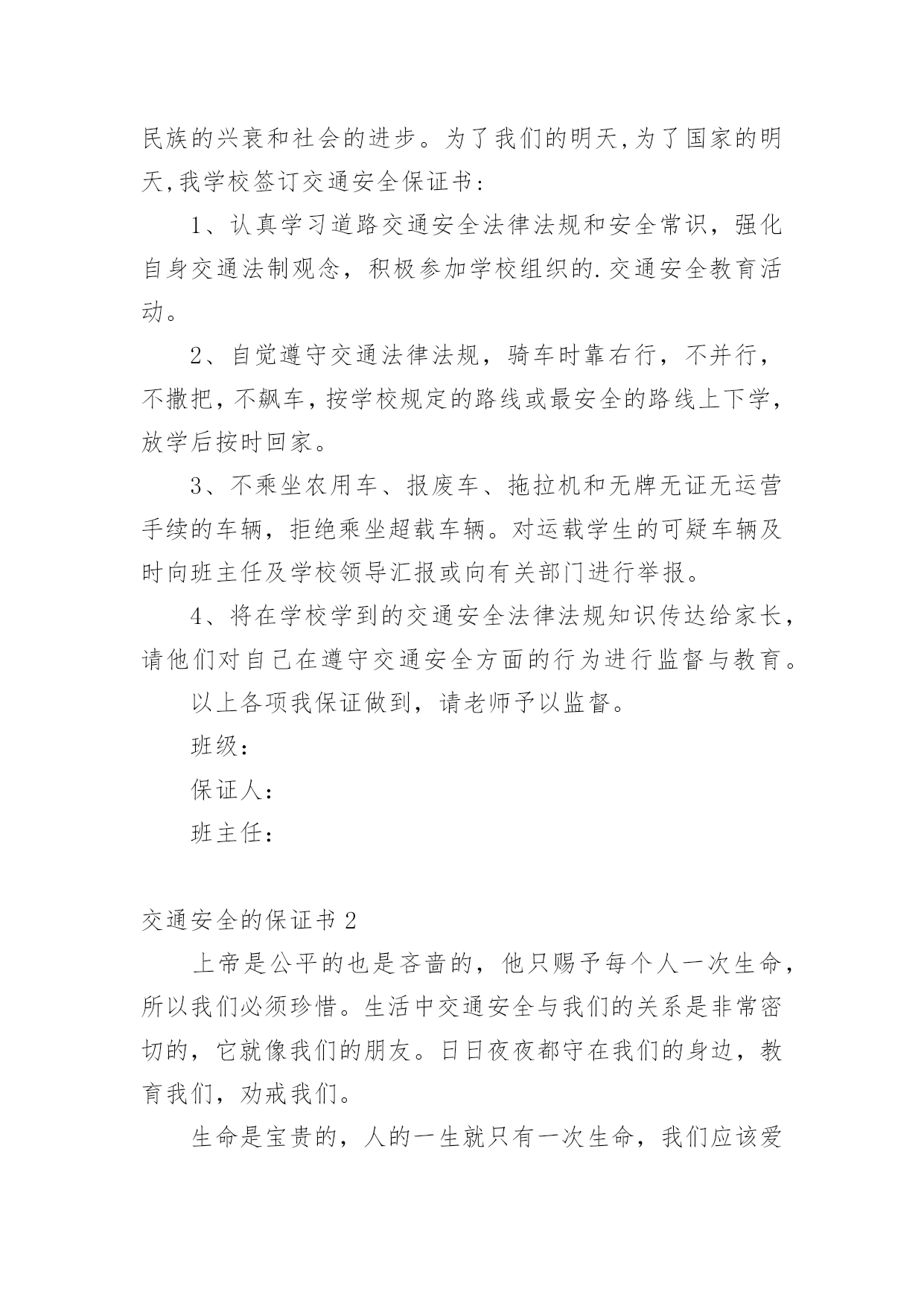 交通安全的保证书在生活中,保证书使用的次数愈发增长,保证书是个人信用的保证。那么你真正懂得怎么写好保证书吗?下面是小编收集整理的交通安全的保证书,欢迎阅读与收藏。交通安全的保证书1生命是宝贵的,人的一生就只有一次生命,我们应该爱惜生命。注意交通安全也是爱惜生命的一部分。现在因为交通事故而死于非命的人太多了,难道他们不是死的太冤枉了吗?现在城市交通繁忙了,像这种悲惨的交通事故在国内多如繁星,因为我国交通事故死伤率居世界第一。所以,无论交警在不在场,我们都要自觉的遵守交通法规。例如:过马路要看清信号灯,红灯停、绿灯行,要走人行横道,不得翻越交通护栏;未满12岁的儿童不得在马路上骑自行车;不能在马路上三五成群地玩耍和嬉戏……我们小学生不仅自己要遵守交通法规,而且发现有人违反了,应及时地批评、劝阻。让我们把“交通安全”这四个字在心里永远扎下根,让全世界人民都自觉遵守交通规则,让交通事故永远在我们生活中消失,让我们的明天充满鲜花,充满阳光。那么,交通安全便是你最好最好的朋友,它将永远保护着你,带给你幸福。让我们争做文明守法的好孩子吧!我们是社会未来的接班人,我们能否健康成长,关系到民族的兴衰和社会的进步。为了我们的明天,为了国家的明天,我学校签订交通安全保证书:1、认真学习道路交通安全法律法规和安全常识,强化自身交通法制观念,积极参加学校组织的.交通安全教育活动。2、自觉遵守交通法律法规,骑车时靠右行,不并行,不撒把,不飙车,按学校规定的路线或最安全的路线上下学,放学后按时回家。3、不乘坐农用车、报废车、拖拉机和无牌无证无运营手续的车辆,拒绝乘坐超载车辆。对运载学生的可疑车辆及时向班主任及学校领导汇报或向有关部门进行举报。4、将在学校学到的交通安全法律法规知识传达给家长,请他们对自己在遵守交通安全方面的行为进行监督与教育。以上各项我保证做到,请老师予以监督。班级:保证人:班主任:交通安全的保证书2上帝是公平的也是吝啬的,他只赐予每个人一次生命,所以我们必须珍惜。生活中交通安全与我们的关系是非常密切的,它就像我们的朋友。日日夜夜都守在我们的身边,教育我们,劝戒我们。生命是宝贵的,人的一生就只有一次生命,我们应该爱惜生命。注意交通安全也是爱惜生命的一部分。现在因为交通事故而死于非命的人太多了,难道他们不是死的太冤枉了吗?现在城市交通繁忙了,像这种悲惨的交通事故在国内多如繁星因为我国交通事故死伤率居世界第一。所以,无论交警在不在场,我们都要自觉的遵守交通法规。例如:过马路要看清信号灯,红灯停、绿灯行,要走人行横道,不得翻越交通护栏;未满12岁的儿童不得在马路上骑自行车;不能在马路上三五成群地玩耍和嬉戏……我们小学生不仅自己要遵守交通法规,而且发现有人违反了,应及时地批评、劝阻。让我们把“交通安全”这四个字在心里永远扎下根,让全世界人民都自觉遵守交通规则,让交通事故永远在我们生活中消失,让我们的明天充满鲜花,充满阳光。那么,交通安全便是你最好最好的朋友,它将永远保护着你,带给你幸福。让我们争做文明守法的好少年吧!我们是社会未来的接班人,我们能否健康成长,关系到民族的兴衰和社会的进步。为了我们的明天,为了国家的明天,我与班主任老师老师签订交通安全保证书:1、认真学习道路交通安全法律法规和安全常识,强化自身交通法制观念,积极参加学校组织的交通安全教育活动。2、自觉遵守交通法律法规,骑车时靠右行,不并行,不撒把,不飙车,按学校规定的路线或最安全的路线上下学,放学后按时回家。3、不乘坐农用车、报废车、拖拉机和无牌无证无运营手续的车辆,拒绝乘坐超载车辆。对运载学生的'可疑车辆及时向班主任老师及学校领导汇报或向有关部门进行举报。4、将在学校学到的交通安全法律法规知识传达给家长,请他们对自己在遵守交通安全方面的行为进行监督与教育。以上各项我保证做到,请老师予以监督。为了我的自身安全,我保证做到以下几点:1、不到河、湾等有水的地方去晚。2、放学路上遵守交通规则,不爬车、不追车。3、不上墙爬屋、不上树或下井挖鸟。4、不玩火、不乱动电器。5、不到铁路边玩耍。6、养成良好的卫生习惯,不吃腐烂变质的食物。7、放学后立即回家,不随便外出。8、严格遵守社会的法律法规和学校的规章制度。9、按学校规定的时间到校,不迟到,不旷课,不早退。10、团结同学,尊敬师长,认真完成老师布置的作业。11、不把管制刀具、棍棒等与学习无关的物品带到学校。我保证以上面的条款严格要求自己,若有违反,承担一切责任,与学校老师无关。家长:学生:班主任老师:xx年。3。16交通安全的保证书3为进一步加强对学生的安全教育和管理,提高学生的交通安全意识,杜绝或减少交通安全事故的发生,我与学校签订交通安全保证书。1,认真学习道路交通安全相关的法律法规知识,提高自身交通法制观念和交通安全意识,为学生树立起自