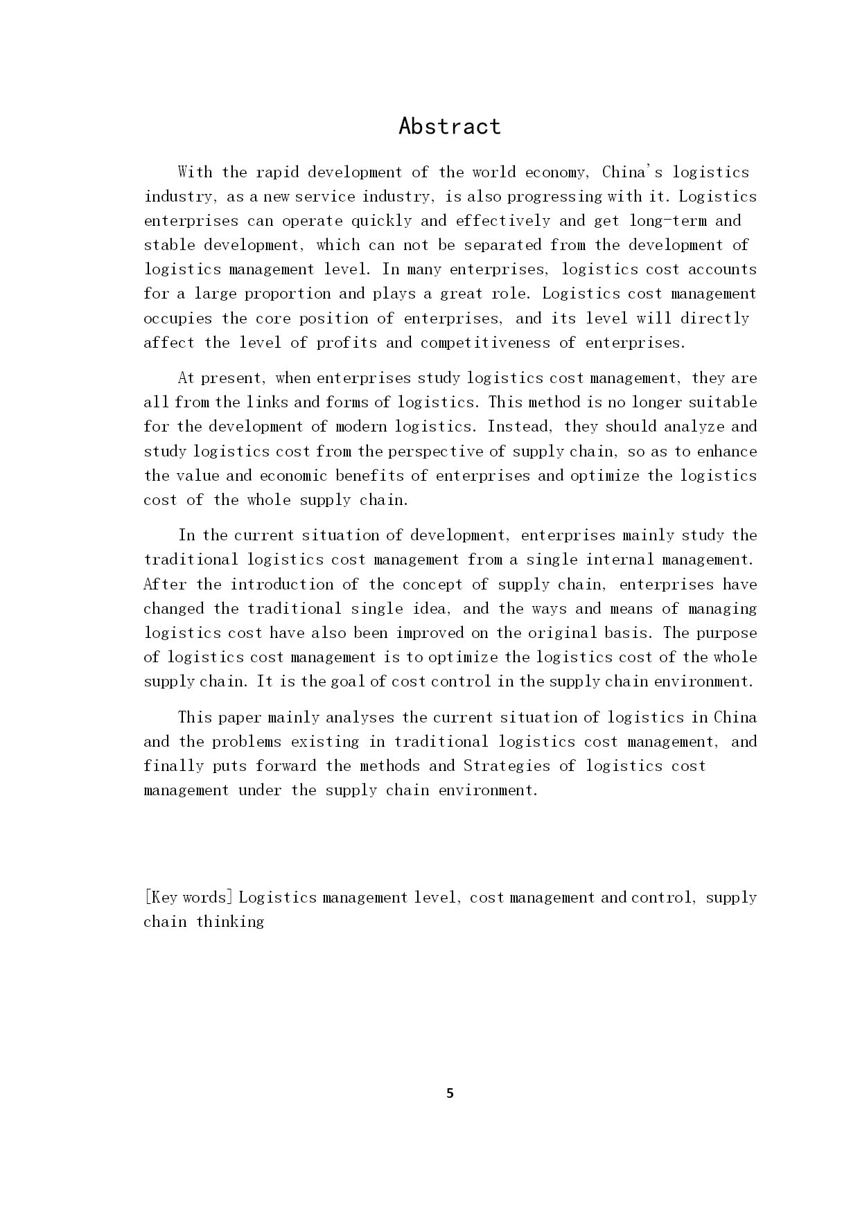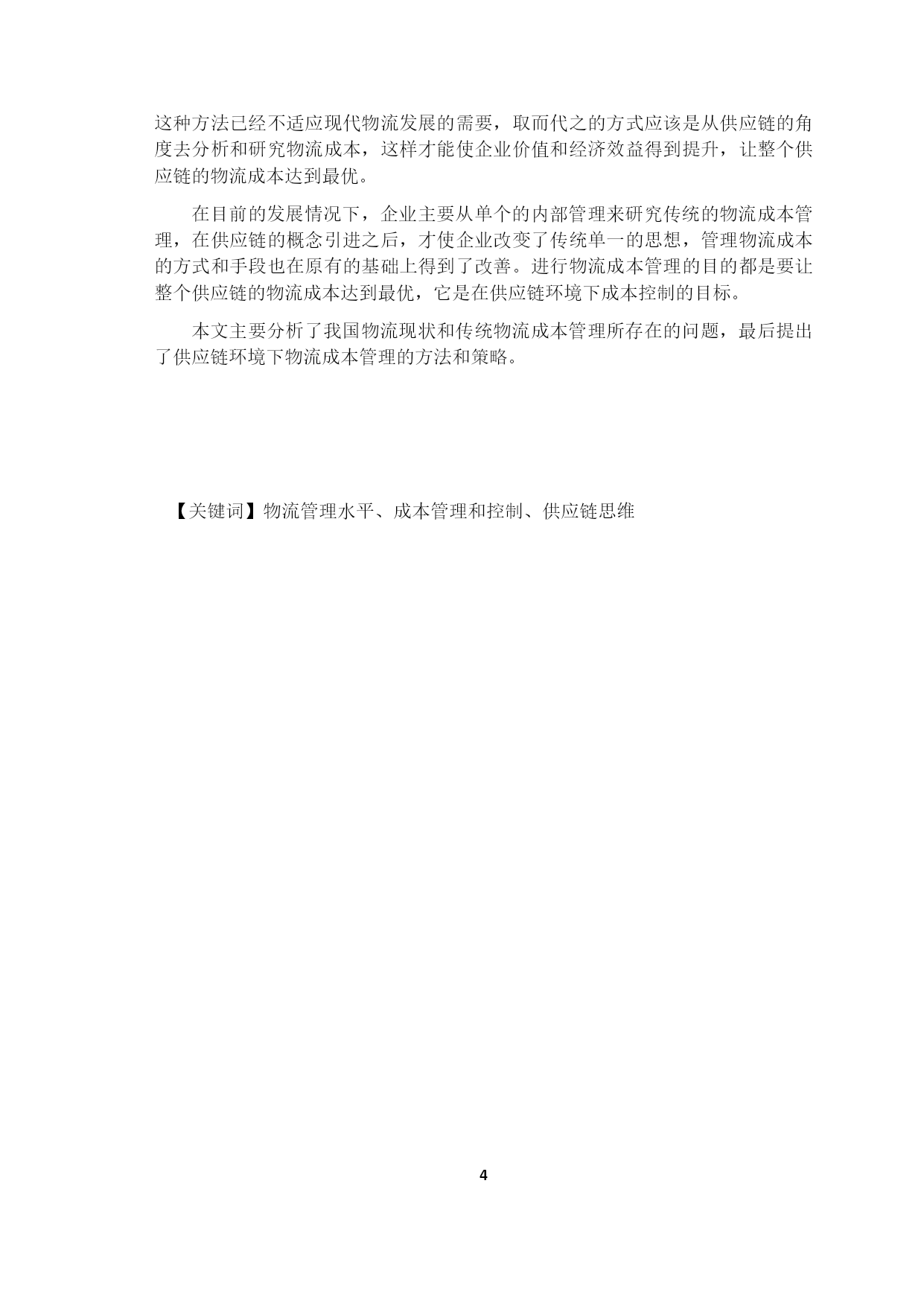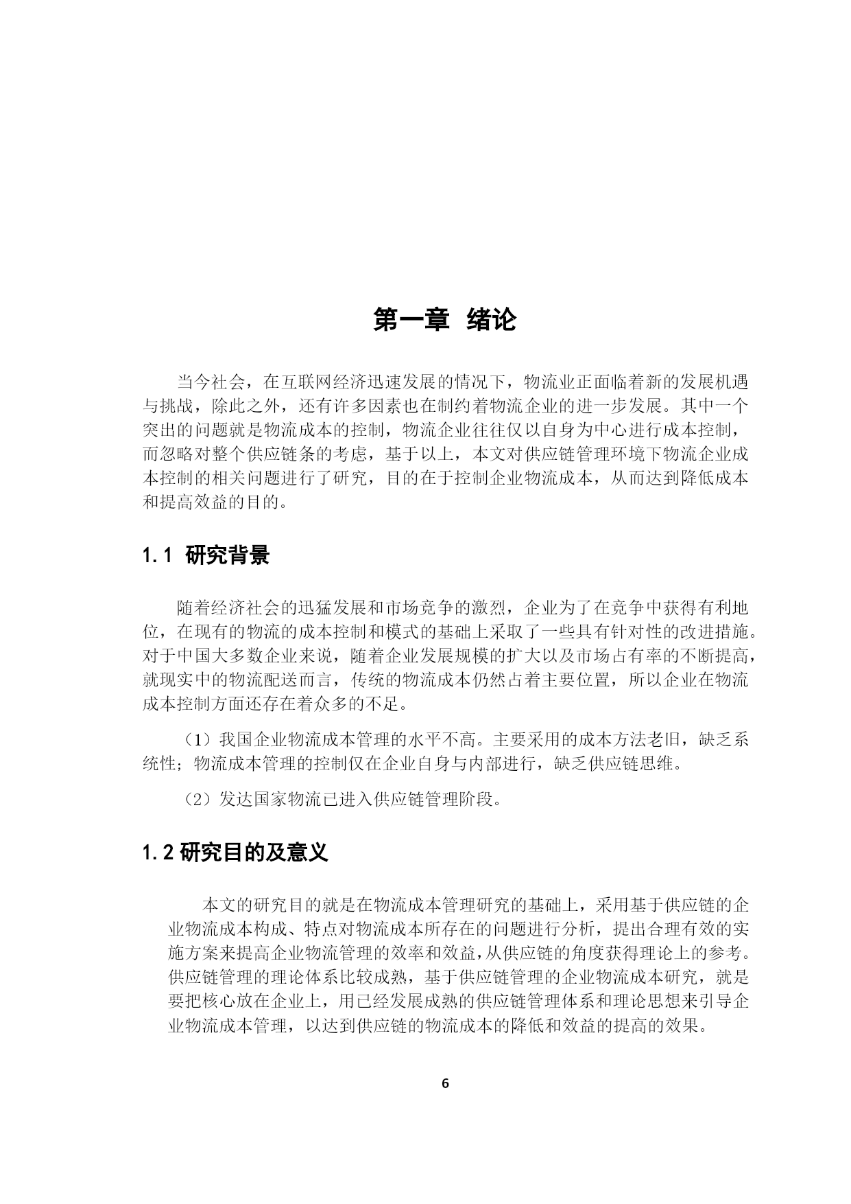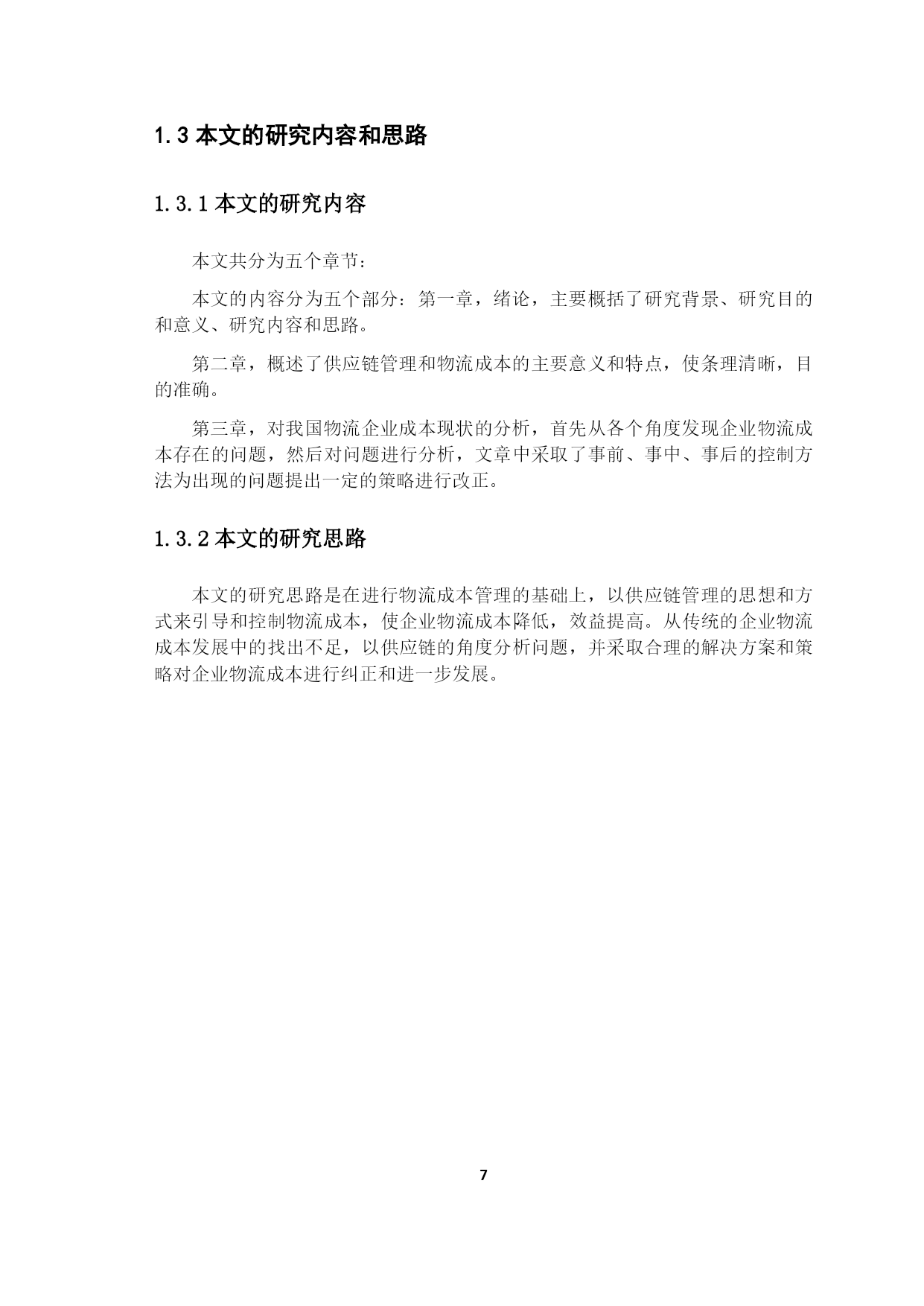PAGE\*MERGEFORMAT20天津职业大学毕业论文题目基于供应链管理的物流企业成本控制研究作者赵亚楠学院经济管理学院专业物流管理学号2016201041指导教师陈斌年月日目录TOC\o"1-3"\h\z\uHYPERLINK\l"_Toc6405204"第一章绪论PAGEREF_Toc6405204\h5HYPERLINK\l"_Toc6405205"1.1研究背景PAGEREF_Toc6405205\h5HYPERLINK\l"_Toc6405206"1.2研究目的及意义PAGEREF_Toc6405206\h5HYPERLINK\l"_Toc6405207"1.3本文的研究内容和思路PAGEREF_Toc6405207\h5HYPERLINK\l"_Toc6405208"1.3.1本文的研究内容PAGEREF_Toc6405208\h5HYPERLINK\l"_Toc6405209"1.3.2本文的研究思路PAGEREF_Toc6405209\h6HYPERLINK\l"_Toc6405210"第二章我国物流企业成本现状分析PAGEREF_Toc6405210\h7HYPERLINK\l"_Toc6405211"2.1我国物流企业成本现状与问题分析PAGEREF_Toc6405211\h7HYPERLINK\l"_Toc6405212"2.2我国物流成本过高的原因分析PAGEREF_Toc6405212\h7HYPERLINK\l"_Toc6405213"2.3我国物流成本过高的对策分析PAGEREF_Toc6405213\h8HYPERLINK\l"_Toc6405214"2.3.1改善物流产业成长的宏观环境降低物流成本PAGEREF_Toc6405214\h8HYPERLINK\l"_Toc6405215"2.3.2提高企业物流管理水平,有效降低成本PAGEREF_Toc6405215\h8HYPERLINK\l"_Toc6405216"2.4物流企业进行成本控制的对策PAGEREF_Toc6405216\h8HYPERLINK\l"_Toc6405217"2.4.1事前预算控制PAGEREF_Toc6405217\h8HYPERLINK\l"_Toc6405218"2.4.2事中成本控制PAGEREF_Toc6405218\h9HYPERLINK\l"_Toc6405219"2.4.3事后控制PAGEREF_Toc6405219\h9HYPERLINK\l"_Toc6405220"第三章我国物流成本管理存在的问题分析PAGEREF_Toc6405220\h11HYPERLINK\l"_Toc6405221"3.1企业物流成本管理存在的问题PAGEREF_Toc6405221\h11HYPERLINK\l"_Toc6405222"3.1.1物流成本控制战略意识薄弱PAGEREF_Toc6405222\h11HYPERLINK\l"_Toc6405223"3.1.2社会物流基础设施落后PAGEREF_Toc6405223\h11HYPERLINK\l"_Toc6405224"3.1.3物流企业整体水平相对落后,缺乏规模效应PAGEREF_Toc6405224\h11HYPERLINK\l"_Toc6405225"3.1.4对物流成本的计算和控制分散进行PAGEREF_Toc6405225\h12HYPERLINK\l"_Toc6405226"第四章降低企业物流成本的策略PAGEREF_Toc6405226\h13HYPERLINK\l"_Toc6405227"4.1明确企业物流总成本的构成PAGEREF_Toc6405227\h13HYPERLINK\l"_Toc6405228"4.2运用战略成本管理方法控制物流成本PAGEREF_Toc6405228\h13HYPERLINK\l"_Toc6405229"4.3降低企业物流总成本的基本途径PAGEREF_Toc6405229\h13HYPERLINK\l"_Toc6405230"4.4举例顺丰速运公司降低成本的办法PAGEREF_Toc6405230\h14HYPERLINK\l"_