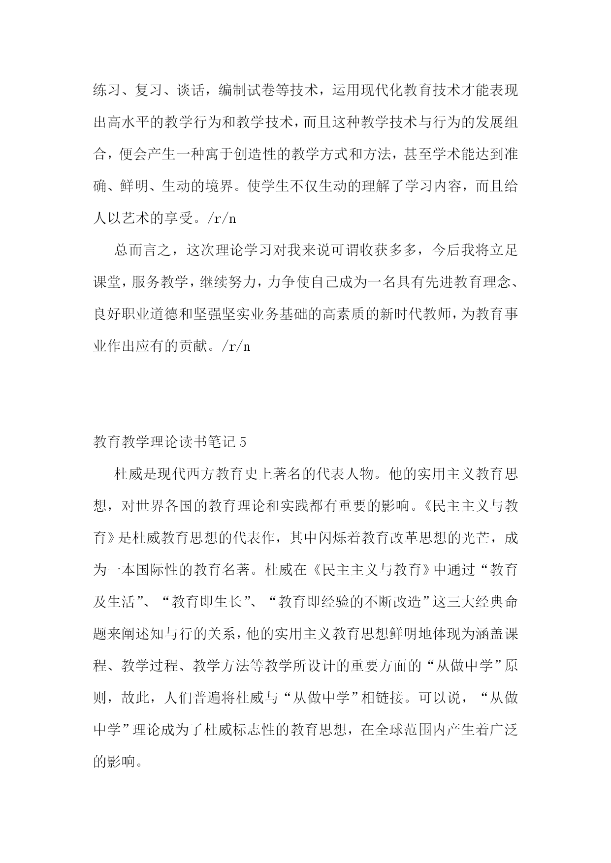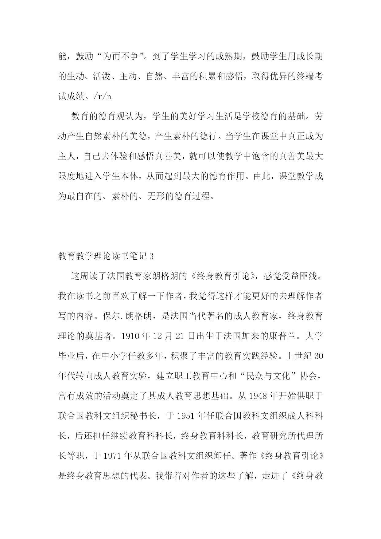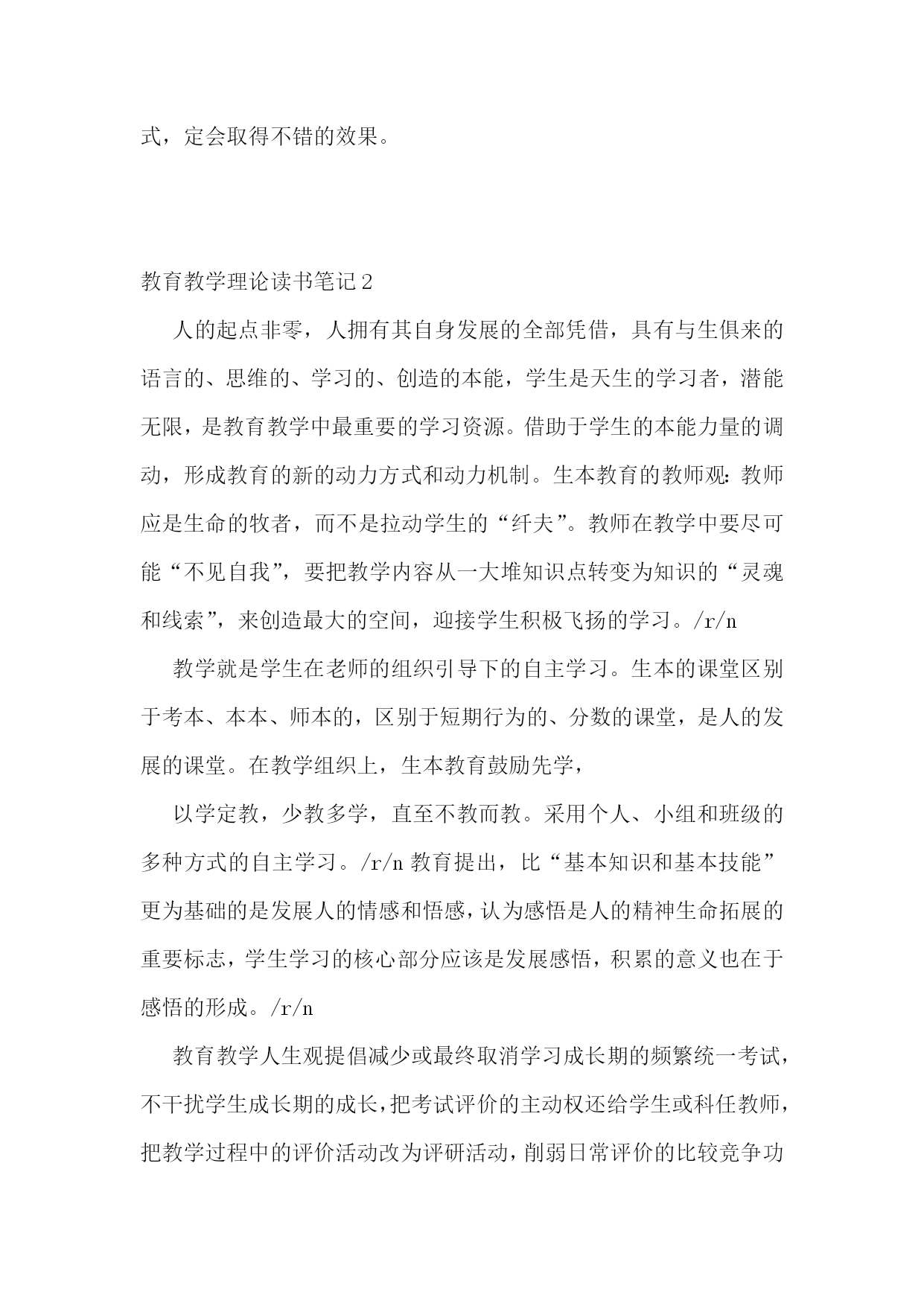 教育教学理论读书笔记教育教学理论读书笔记1读了《小学教育教学理论》一书,本人受益颇深,其中有关教学媒体那一节,印象非常深刻。教学媒体能给学生生动形象,给他们以更大的思维空间,使他们的学习兴趣增强了,学习变得主动起来。运用教学媒体,可以从各个渠道,,大大的提高教学效率。教学媒体不仅给教学过程增添了色彩,更为学习效果创造了良好的环境。《小学教育教学理论》用较通俗的语言对教育新理念进行了较全面的阐述,为我们教师提供一本具有全面性、启示性、解惑性和可操作性的学习用书。有关教与学的理念部分是更为具体、更具可操作性的教育理念,对指导我们教师开展日常教育教学活动,进行教育教学改革,具有直接的指导意义。。一、教学理念需要终身学习读了《小学教育教学理论》,使我体会到作为个体的人必须要进行终身的学习,作为教师必须把教育看作是贯穿与人的整个一生持续不断的过程。这就需要我们不断学习新的理念,充实自己的头脑,使自己的思想不断地更新,与时代同步。教育必须正视现实,适应新时代的要求,使其形式灵活多样,促进社会学习化、学习社会化。所以作为教师,最重要的是教育思想、教育理念的创新,教师必须树立正确的教育观念,学习和了解先进的教育理念,把那些教育理念内化为自己的思想。只有如此,才能用先进的教育教学理念通过思想的内化来指导实践;有了理念的更新,才能创造新的教育方法,适应学习时代的要求。二、教学理念需要不断实践没有获得实践的教育理念不过是教育的理想。要使理想变成现实,就要把教育理念应用到具体的教学中去,由实践来检验教育理念的可行性,并在实践中提炼出适合教学的教育理念。正如顾明远先生所说的那样:"一个成功的教师,首先是一个善于不断自我更新观念的学习者,只有在及时地汲取当代最新教育科研成果的基础上,才能立于不败之地。"我们应该努力学习、实践,做一个教育改革的身体力行者。现代的素质教育观要求面向全体学生,尊重每一位学生,发展每一位学生。课堂教学中也要面向全体学生,为每一个学生的学生创造条件,最大限度地开发每一个学生的潜能,教学媒体的选择也应遵循这一点,不同的学生应该拥有属于他们的最适合的媒体。作为一个从事一线教学的教师,我觉得自己特别有体会,记得在以前当学生的时候,那时候的老师上立体几每讲到一个概念、定理,数学老师总会提到木匠师傅,但没有具体的操作,从有些同学困惑的表情中,更从他们课后的埋怨中我能体会到,无论老师说得如何生动,总不如把现实的工具拿进课堂来得具体、形象、生动。那时我就在想,要是以后我做了一名教师,我会把木匠工具搬进课堂,让空间想象力贫乏的学生在实物的演示下,静与动的实践过程中豁然开朗。现在我已经踏上了教师的岗位,在课堂上对曾经我们视之为神话的木匠却只字不提,更不用说搬工具了,这就是选择教学媒体的可能性和针对性。通过制作各种模型和多媒体课件,使抽象的概念形象化、具体化,便成了我的奋斗目标。板书和投影也是教学媒体中很重要的一环,通过板书和投影,把教学内容一一呈现给学生,有助于学生更好的了解与体会。老师讲授的东西,学生最容易忘,而好的板书可给学生留下痕迹,有些逻辑性很强的概念原理是需要时间细细品味的,尤其是对一些学习有困难的学生,特别需要板书来帮助他们思考,在课后慢慢消化。这就对老师的板书提出了很高的要求。老师要事先设计好板书,板书不但要简明扼要,更要想好需要保留和无须保留的部分,做到合理利用。并且老师的板书需要艺术的美感,也要清晰自然,给学生们好的视觉享受。老师在板书的时候也可以适当修饰,增添色彩,从而激发学生的积极性。教师的板书形式可以多样化:提纲式的板书使内容简明扼要;表格式的板书使教学对象严谨而细密;图式的板书使内容更加清晰、直观形象;线索式的板书可以吸引学生的注意力;流程式的板书可以使学生的思路更好的展开;简图式的板书可以锻炼学生的思维,使学生生动活泼。因此老师只要根据不同的学生,在不同的阶段采用不同的板书形式,定会取得不错的效果。教育教学理论读书笔记2人的起点非零,人拥有其自身发展的全部凭借,具有与生俱来的语言的、思维的、学习的、创造的本能,学生是天生的学习者,潜能无限,是教育教学中最重要的学习资源。借助于学生的本能力量的调动,形成教育的新的动力方式和动力机制。生本教育的教师观:教师应是生命的牧者,而不是拉动学生的“纤夫”。教师在教学中要尽可能“不见自我”,要把教学内容从一大堆知识点转变为知识的“灵魂和线索”,来创造最大的空间,迎接学生积极飞扬的学习。/r/n教学就是学生在老师的组织引导下的自主学习。生本的课堂区别于考本、本本、师本的,区别于短期行为的、分数的课堂,是人的发展的课堂。在教学组织上,生本教育鼓励先学,以学定教,少教多学,直至不教而教。采用个人、小组和班级的多种方式的自主学习。/r/n教