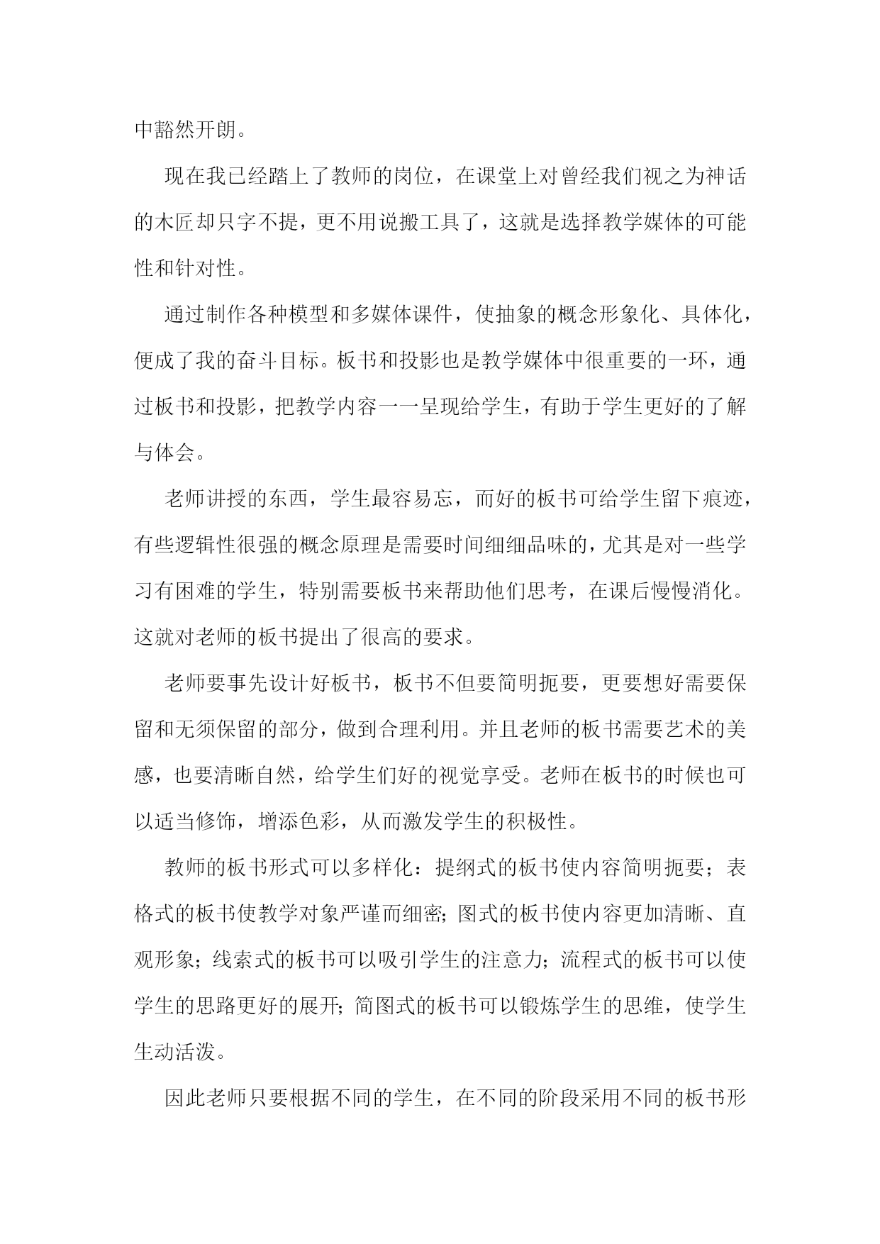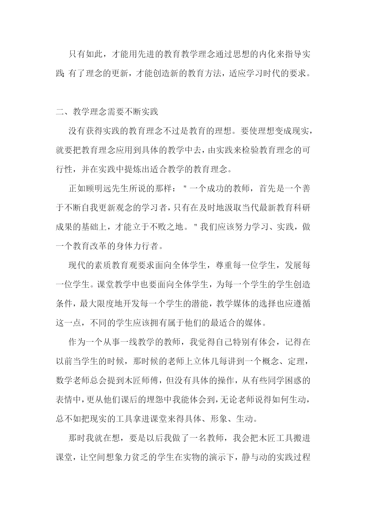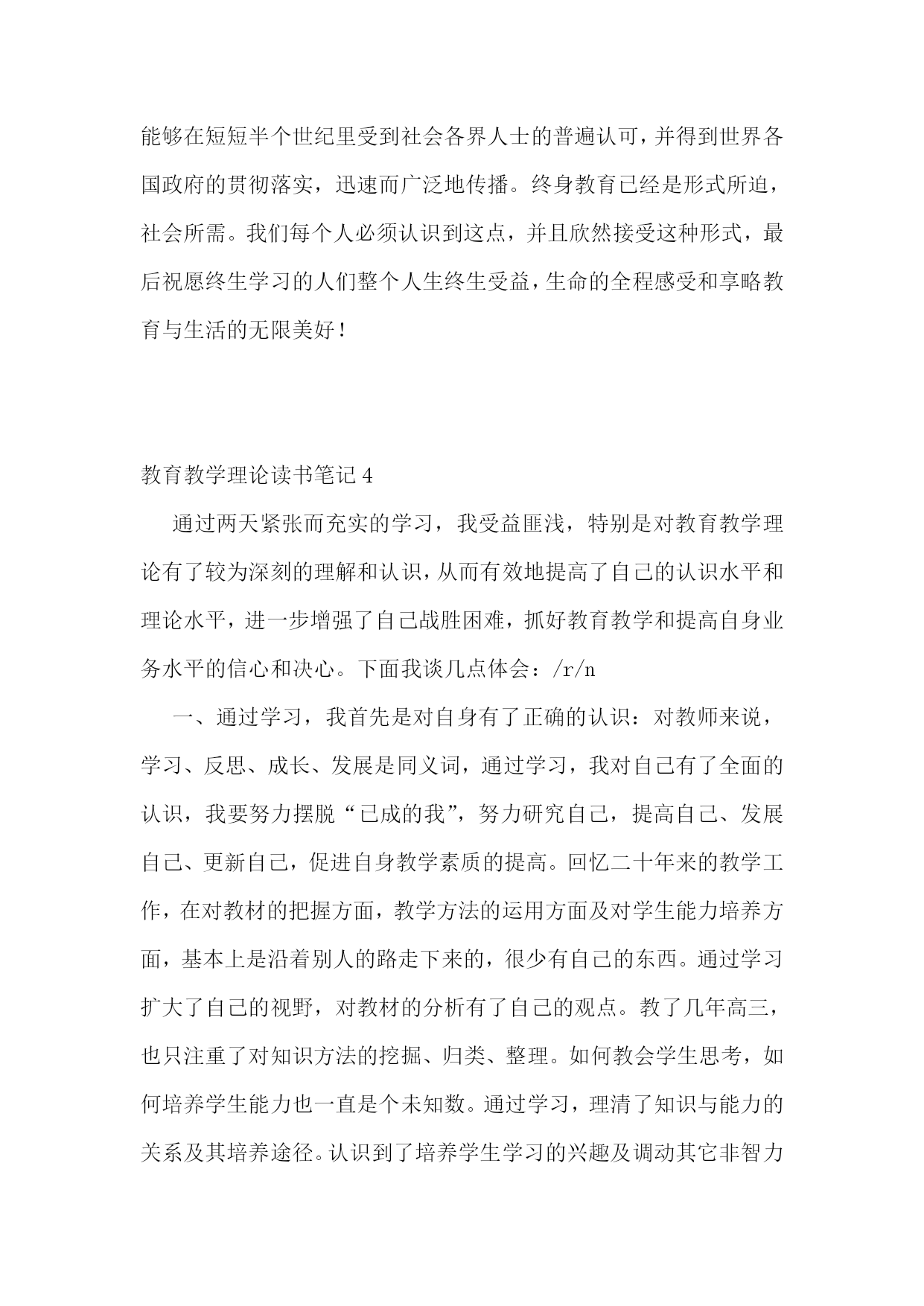 教育教学理论读书笔记教育教学理论读书笔记1读了《小学教育教学理论》一书,本人受益颇深,其中有关教学媒体那一节,印象非常深刻。教学媒体能给学生生动形象,给他们以更大的思维空间,使他们的学习兴趣增强了,学习变得主动起来。运用教学媒体,可以从各个渠道,,大大的提高教学效率。教学媒体不仅给教学过程增添了色彩,更为学习效果创造了良好的环境。《小学教育教学理论》用较通俗的语言对教育新理念进行了较全面的阐述,为我们教师提供一本具有全面性、启示性、解惑性和可操作性的学习用书。有关教与学的理念部分是更为具体、更具可操作性的教育理念,对指导我们教师开展日常教育教学活动,进行教育教学改革,具有直接的指导意义。。一、教学理念需要终身学习读了《小学教育教学理论》,使我体会到作为个体的人必须要进行终身的学习,作为教师必须把教育看作是贯穿与人的整个一生持续不断的过程。这就需要我们不断学习新的理念,充实自己的头脑,使自己的思想不断地更新,与时代同步。教育必须正视现实,适应新时代的要求,使其形式灵活多样,促进社会学习化、学习社会化。所以作为教师,最重要的是教育思想、教育理念的创新,教师必须树立正确的教育观念,学习和了解先进的教育理念,把那些教育理念内化为自己的思想。只有如此,才能用先进的教育教学理念通过思想的内化来指导实践;有了理念的更新,才能创造新的教育方法,适应学习时代的要求。二、教学理念需要不断实践没有获得实践的教育理念不过是教育的理想。要使理想变成现实,就要把教育理念应用到具体的教学中去,由实践来检验教育理念的可行性,并在实践中提炼出适合教学的教育理念。正如顾明远先生所说的那样:"一个成功的教师,首先是一个善于不断自我更新观念的学习者,只有在及时地汲取当代最新教育科研成果的基础上,才能立于不败之地。"我们应该努力学习、实践,做一个教育改革的身体力行者。现代的素质教育观要求面向全体学生,尊重每一位学生,发展每一位学生。课堂教学中也要面向全体学生,为每一个学生的学生创造条件,最大限度地开发每一个学生的潜能,教学媒体的选择也应遵循这一点,不同的学生应该拥有属于他们的最适合的媒体。作为一个从事一线教学的教师,我觉得自己特别有体会,记得在以前当学生的时候,那时候的老师上立体几每讲到一个概念、定理,数学老师总会提到木匠师傅,但没有具体的操作,从有些同学困惑的表情中,更从他们课后的埋怨中我能体会到,无论老师说得如何生动,总不如把现实的工具拿进课堂来得具体、形象、生动。那时我就在想,要是以后我做了一名教师,我会把木匠工具搬进课堂,让空间想象力贫乏的学生在实物的演示下,静与动的实践过程中豁然开朗。现在我已经踏上了教师的岗位,在课堂上对曾经我们视之为神话的木匠却只字不提,更不用说搬工具了,这就是选择教学媒体的可能性和针对性。通过制作各种模型和多媒体课件,使抽象的概念形象化、具体化,便成了我的奋斗目标。板书和投影也是教学媒体中很重要的一环,通过板书和投影,把教学内容一一呈现给学生,有助于学生更好的了解与体会。老师讲授的东西,学生最容易忘,而好的板书可给学生留下痕迹,有些逻辑性很强的概念原理是需要时间细细品味的,尤其是对一些学习有困难的学生,特别需要板书来帮助他们思考,在课后慢慢消化。这就对老师的板书提出了很高的要求。老师要事先设计好板书,板书不但要简明扼要,更要想好需要保留和无须保留的部分,做到合理利用。并且老师的板书需要艺术的美感,也要清晰自然,给学生们好的视觉享受。老师在板书的时候也可以适当修饰,增添色彩,从而激发学生的积极性。教师的板书形式可以多样化:提纲式的板书使内容简明扼要;表格式的板书使教学对象严谨而细密;图式的板书使内容更加清晰、直观形象;线索式的板书可以吸引学生的注意力;流程式的板书可以使学生的思路更好的展开;简图式的板书可以锻炼学生的思维,使学生生动活泼。因此老师只要根据不同的学生,在不同的阶段采用不同的板书形式,定会取得不错的效果。教育教学理论读书笔记2人的起点非零,人拥有其自身发展的全部凭借,具有与生俱来的语言的、思维的、学习的、创造的本能,学生是天生的学习者,潜能无限,是教育教学中最重要的学习资源。借助于学生的本能力量的调动,形成教育的新的动力方式和动力机制。生本教育的教师观:教师应是生命的牧者,而不是拉动学生的“纤夫”。教师在教学中要尽可能“不见自我”,要把教学内容从一大堆知识点转变为知识的“灵魂和线索”,来创造最大的空间,迎接学生积极飞扬的学习。/r/n教学就是学生在老师的组织引导下的自主学习。生本的课堂区别于考本、本本、师本的,区别于短期行为的、分数的课堂,是人的发展的课堂。在教学组织上,生本教育鼓励先学,以学定教,少教多学,直至不教而教。采用个人、小组和班级的多种方式的自主学习。/r/n教