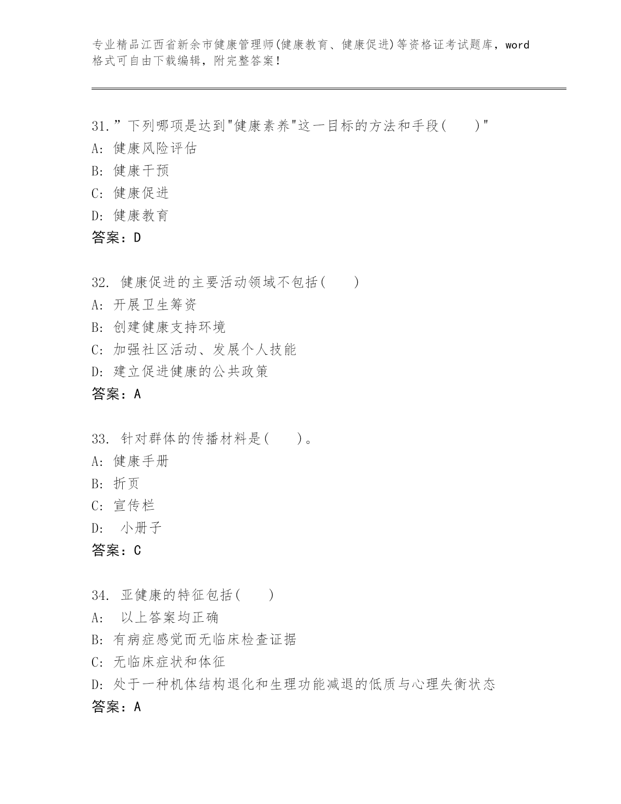 2024年江西省新余市健康管理师(健康教育、健康促进)等资格证考试内部题库(培优)
