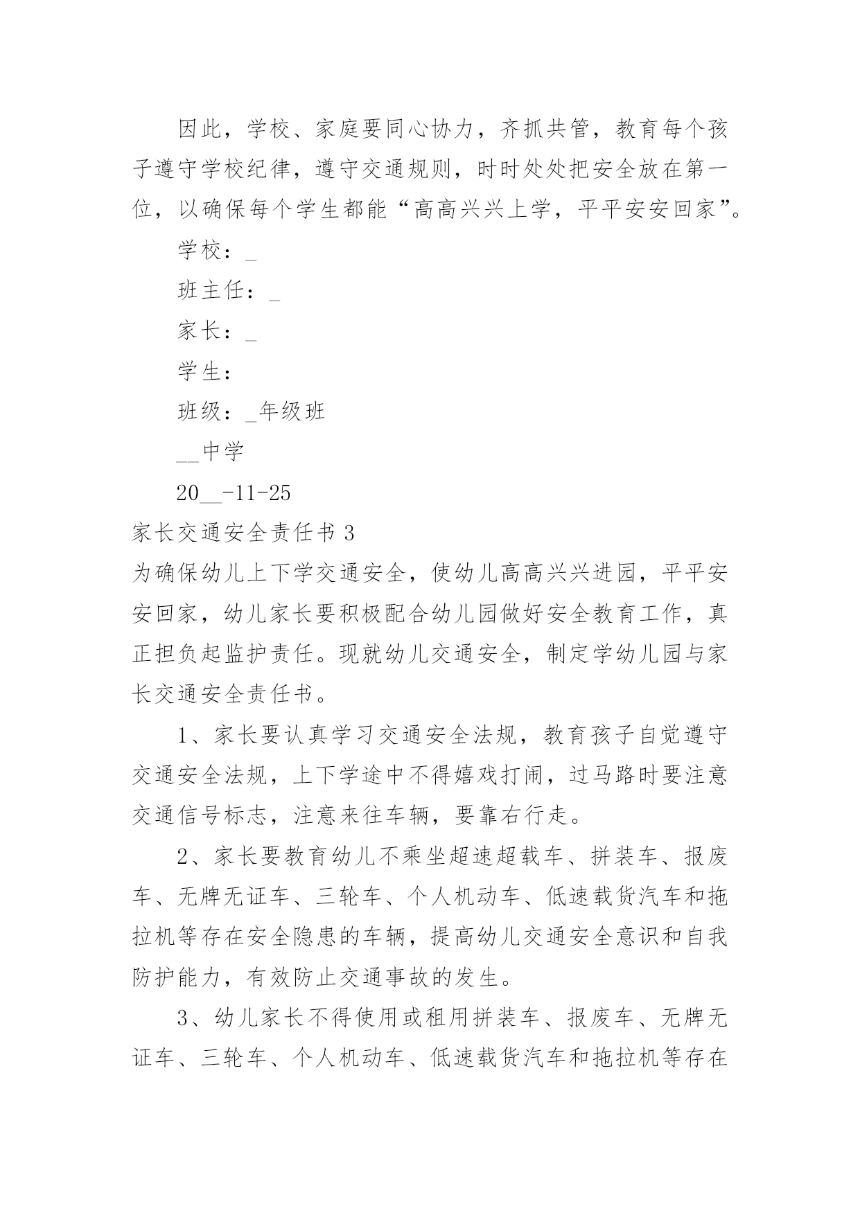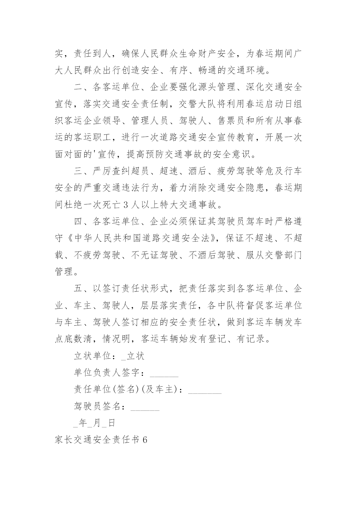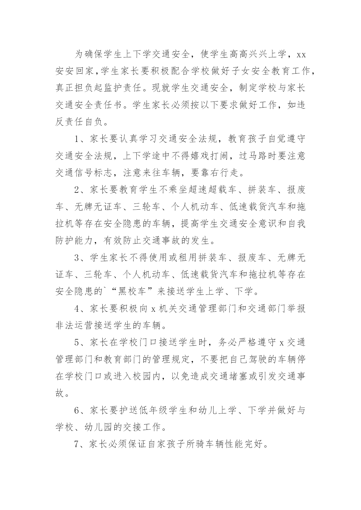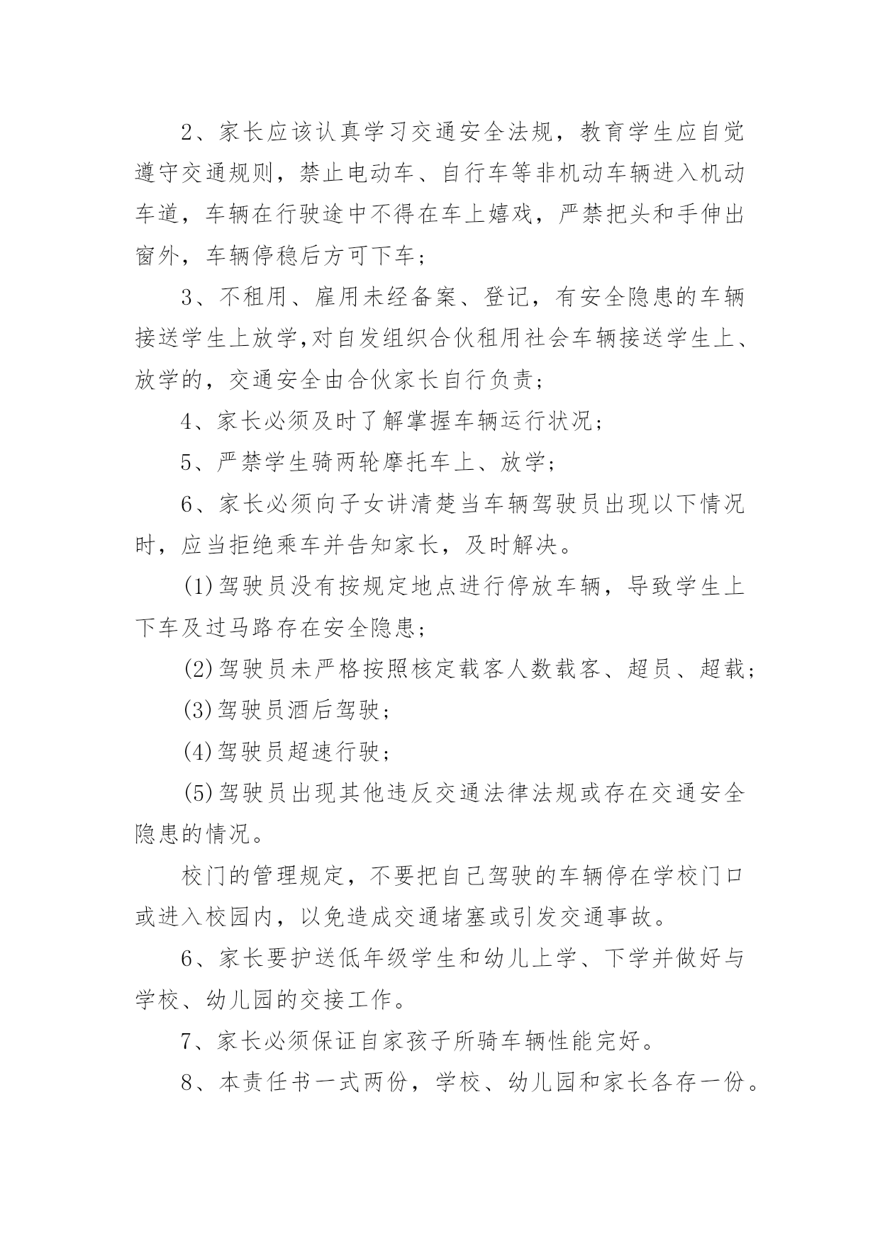 家长交通安全责任书家长交通安全责任书范例【14篇】在社会发展不断提速的今天,各种责任书频频出现,责任书是写明责任、针对不同的部门的文书。那么什么样的责任书才是有效的呢?下面是小编帮大家整理的家长交通安全责任书,希望对大家有所帮助。家长交通安全责任书1为有效预防交通事故的发生,确保道路交通安全,作为一名交通参与者,现本人承诺如下∶1.自觉遵守并教育孩子遵守交通法规,按照交通信号通行,走人行横道,不随意乱穿马路,不跨越道路隔离栏。教育孩子上下学途中不嬉戏打闹,注意来往车辆,不抢行、不逆行、不占用机动车道、不骑车带人,提高孩子的交通安全意识。2.驾乘二三轮摩托车、电动车佩戴好头盔,坚决做到不违法加装遮阳伞、不逆行、不闯红灯,二三轮电动车应在非机动车道内行驶,不随意乱停乱放,在划定的区域有序停放。3.驾驶机动车时按规定车道通行、礼让行人,不争道抢行、不乱鸣笛、不车窗抛物、不吸烟、不接打手机,坚决杜绝车辆乱停乱放,摒弃酒后驾驶、不系安全带等交通陋习,车辆要入位泊车,做到“依法停放、方向一致、守时停离、文明规范”。4.三轮“拐的'”遵守禁行规定,不乱停乱放、不闯红灯、不逆行,按规定车道行驶。5.为确保车辆、行人有序安全通行,决不违规占用车行道和人行道。6.禁止未满12周岁儿童骑自行车上学,禁止未满16周岁学生骑电动车上学,禁止未满18周岁学生骑摩托车、燃油助力车上学。我将按照以上承诺,以身作则,教育和引导孩子、身边的亲属、朋友,自觉遵守交通法规,用实际行动做文明交通的倡导者、传播者和践行者!责任人:日期:家长交通安全责任书2为了进一步加强学生的安全教育,使社会、学校、家庭都来关注学生的健康成长,确保学生的人身安全,强化学生交通安全意识,培养中学生养成自觉维护道路交通秩序,遵守交通法规,保护自身出行安全的良好习惯,杜绝交通事故的发生,特签订大桥镇中学学生交通安全责任书如下:一、学校负责对学生进行交通安全教育。学校每周工作安排中都有安全教育的内容,每周一为安全教育日,并通过班主任利用晨会、班会时间进行安全教育;学校通过各种宣传渠道,如宣传栏、黑板报、手抄报、图画展、广播站、法制教育报告会等加强安全教育,强化学生的交通安全意识;教育学生严格遵守交通规则,遵守路队纪律,不在路上追逐打闹,不随便横穿马路,放学按时回家,不在路上逗留、玩耍,不到沟河池塘等危险地方玩耍,不脱离路队单独行动,自觉排队到家。不进游戏厅、网吧等场所,不进小卖部乱花钱。听从交通管理人员指挥,注意避让车辆,以防止意外事故的发生。学校要求班主任及任课教师负责检查学生每节课到校情况,对无故不到校者,及时查清原因(两小时内与家长及时沟通)。二、家长负责监护学生按时到校上学,放学按时回家。因病因事不能到校者必须提前向班主任请假。家长本人要自觉遵守交通规则,给孩子做出榜样。要经常对孩子进行交通安全教育,教育孩子遵守交通规则,遵守路队纪律,不随便横穿马路,不在路上跑跳、打闹、玩耍逗留。不给孩子过多零花钱,不进网吧、游戏厅等场所,不轻信陌生人,要结合各自实际情况,教育孩子提高防范意识。家长保证孩子上放学乘座车辆的安全。不乘座违章车辆(如:无手续车辆、报废车辆、超员车辆等)及其他存在安全隐患的`车辆。家长接送学生车辆严禁在校门口乱停乱放,应在指定地点接送,不阻塞学生行走通道,保证学生路队畅通。家长行为自愿送孩子参加托管班及社会上其他团体组织的,要首先考虑安全问题,要负责保证孩子在此期间的安全。学生离开校园后的安全由家长负责。三、学校、家庭、社会都应该关心孩子的健康成长。因此,学校、家庭要同心协力,齐抓共管,教育每个孩子遵守学校纪律,遵守交通规则,时时处处把安全放在第一位,以确保每个学生都能“高高兴兴上学,平平安安回家”。学校:_班主任:_家长:_学生:班级:_年级班__中学20__-11-25家长交通安全责任书3为确保幼儿上下学交通安全,使幼儿高高兴兴进园,平平安安回家,幼儿家长要积极配合幼儿园做好安全教育工作,真正担负起监护责任。现就幼儿交通安全,制定学幼儿园与家长交通安全责任书。1、家长要认真学习交通安全法规,教育孩子自觉遵守交通安全法规,上下学途中不得嬉戏打闹,过马路时要注意交通信号标志,注意来往车辆,要靠右行走。2、家长要教育幼儿不乘坐超速超载车、拼装车、报废车、无牌无证车、三轮车、个人机动车、低速载货汽车和拖拉机等存在安全隐患的车辆,提高幼儿交通安全意识和自我防护能力,有效防止交通事故的发生。3、幼儿家长不得使用或租用拼装车、报废车、无牌无证车、三轮车、个人机动车、低速载货汽车和拖拉机等存在安全隐患的“黑校车”来接送幼儿上学、下学。4、家长要积极向公安机关交通管理部门和交通部门举报非法运营接送幼儿的车辆。5、家长在学校门口接送幼儿时,务必严格遵守公安交通管理部门和幼儿园的.管理规定