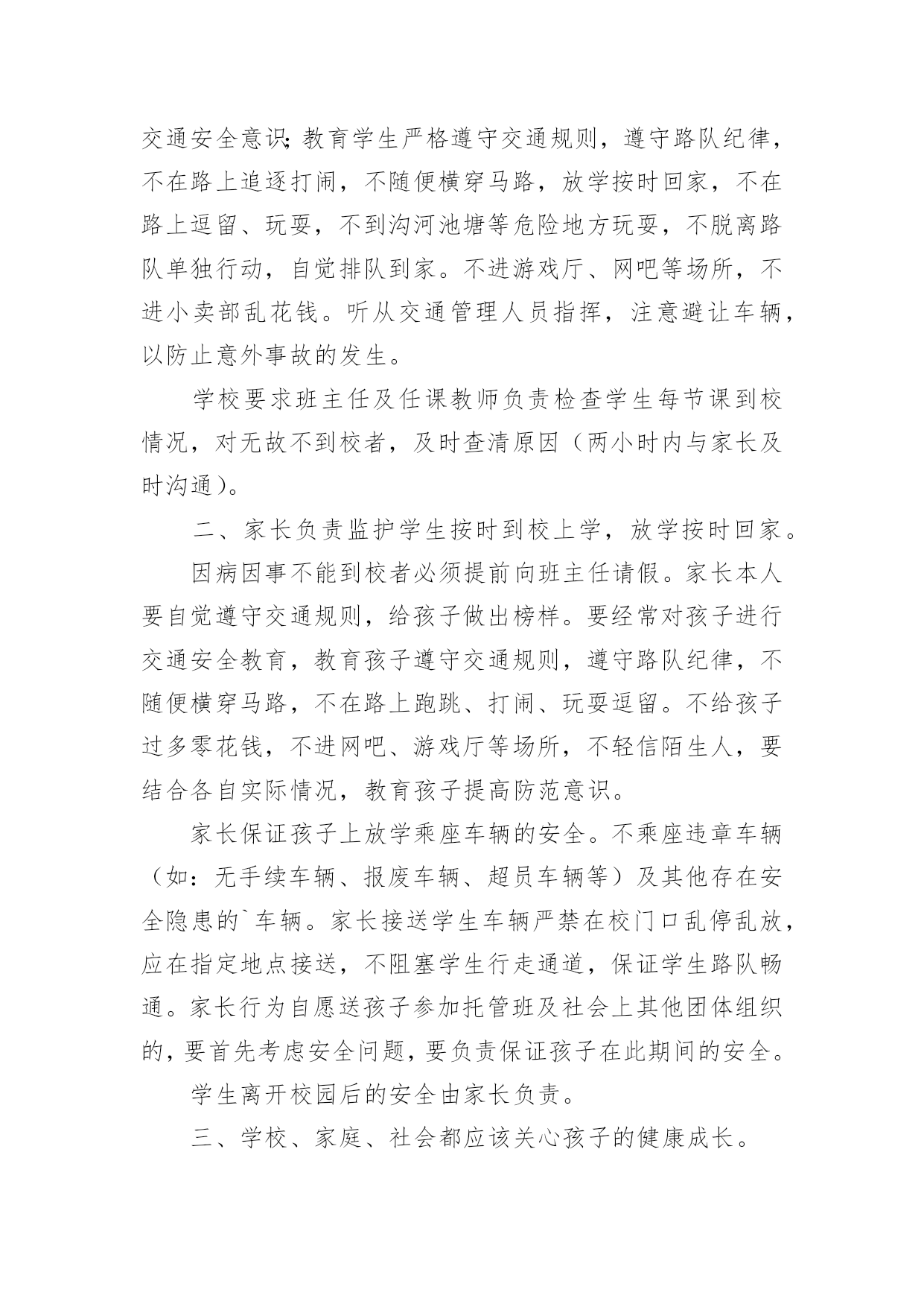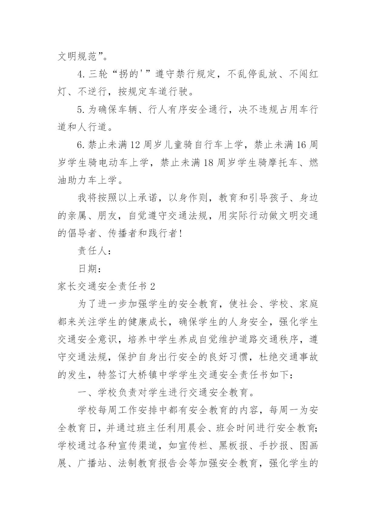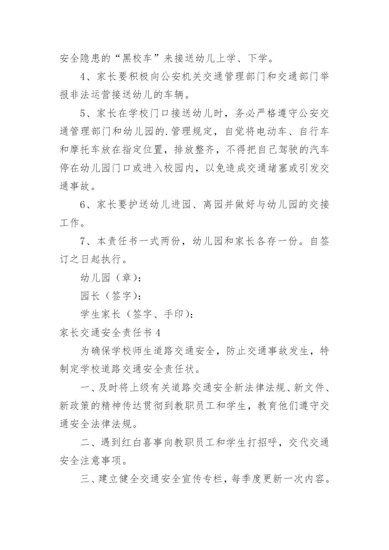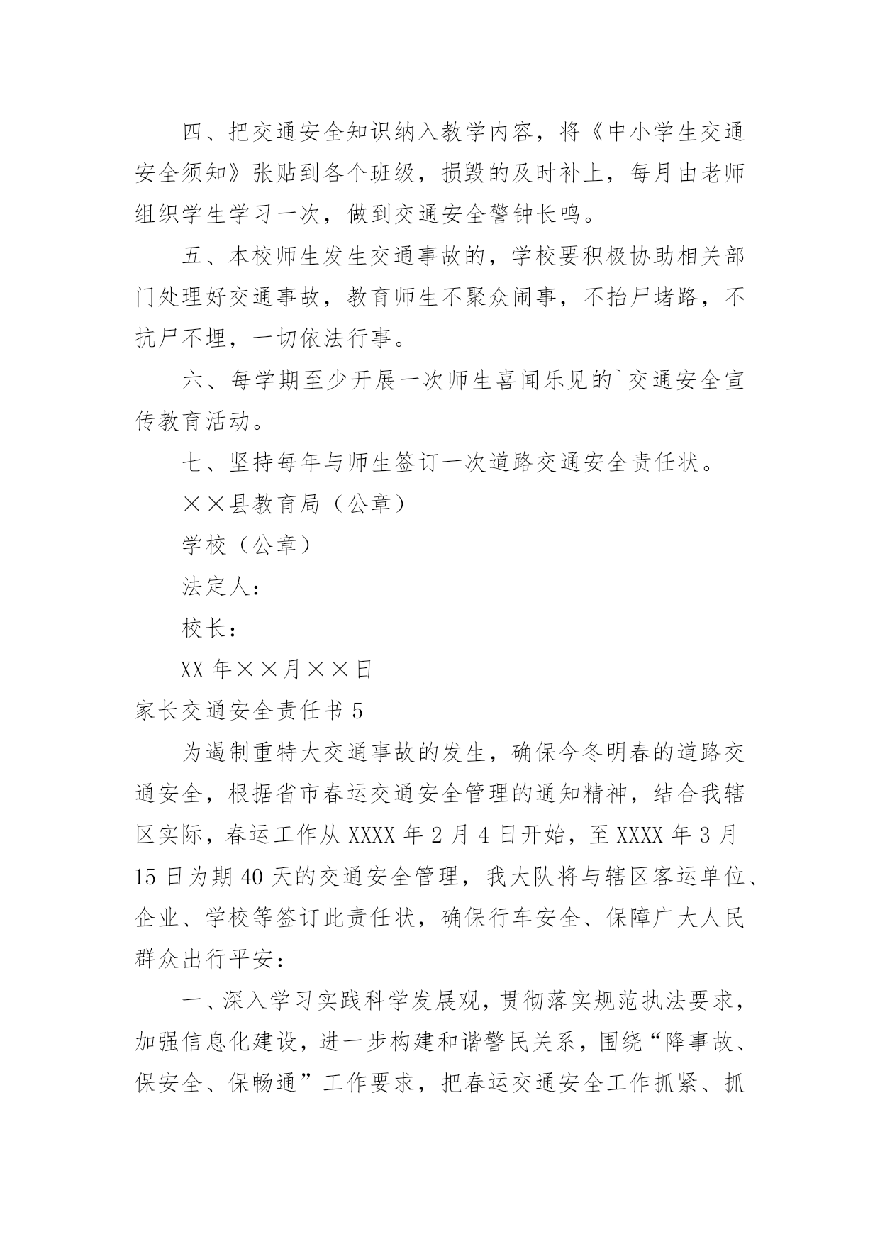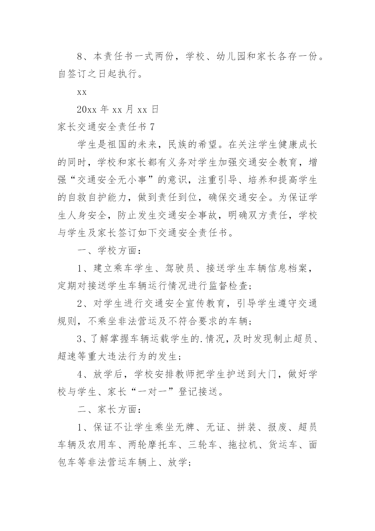 家长交通安全责任书家长交通安全责任书范例【14篇】在社会发展不断提速的今天,各种责任书频频出现,责任书是写明责任、针对不同的部门的文书。那么什么样的责任书才是有效的呢?下面是小编帮大家整理的家长交通安全责任书,希望对大家有所帮助。家长交通安全责任书1为有效预防交通事故的发生,确保道路交通安全,作为一名交通参与者,现本人承诺如下∶1.自觉遵守并教育孩子遵守交通法规,按照交通信号通行,走人行横道,不随意乱穿马路,不跨越道路隔离栏。教育孩子上下学途中不嬉戏打闹,注意来往车辆,不抢行、不逆行、不占用机动车道、不骑车带人,提高孩子的交通安全意识。2.驾乘二三轮摩托车、电动车佩戴好头盔,坚决做到不违法加装遮阳伞、不逆行、不闯红灯,二三轮电动车应在非机动车道内行驶,不随意乱停乱放,在划定的区域有序停放。3.驾驶机动车时按规定车道通行、礼让行人,不争道抢行、不乱鸣笛、不车窗抛物、不吸烟、不接打手机,坚决杜绝车辆乱停乱放,摒弃酒后驾驶、不系安全带等交通陋习,车辆要入位泊车,做到“依法停放、方向一致、守时停离、文明规范”。4.三轮“拐的'”遵守禁行规定,不乱停乱放、不闯红灯、不逆行,按规定车道行驶。5.为确保车辆、行人有序安全通行,决不违规占用车行道和人行道。6.禁止未满12周岁儿童骑自行车上学,禁止未满16周岁学生骑电动车上学,禁止未满18周岁学生骑摩托车、燃油助力车上学。我将按照以上承诺,以身作则,教育和引导孩子、身边的亲属、朋友,自觉遵守交通法规,用实际行动做文明交通的倡导者、传播者和践行者!责任人:日期:家长交通安全责任书2为了进一步加强学生的安全教育,使社会、学校、家庭都来关注学生的健康成长,确保学生的人身安全,强化学生交通安全意识,培养中学生养成自觉维护道路交通秩序,遵守交通法规,保护自身出行安全的良好习惯,杜绝交通事故的发生,特签订大桥镇中学学生交通安全责任书如下:一、学校负责对学生进行交通安全教育。学校每周工作安排中都有安全教育的内容,每周一为安全教育日,并通过班主任利用晨会、班会时间进行安全教育;学校通过各种宣传渠道,如宣传栏、黑板报、手抄报、图画展、广播站、法制教育报告会等加强安全教育,强化学生的交通安全意识;教育学生严格遵守交通规则,遵守路队纪律,不在路上追逐打闹,不随便横穿马路,放学按时回家,不在路上逗留、玩耍,不到沟河池塘等危险地方玩耍,不脱离路队单独行动,自觉排队到家。不进游戏厅、网吧等场所,不进小卖部乱花钱。听从交通管理人员指挥,注意避让车辆,以防止意外事故的发生。学校要求班主任及任课教师负责检查学生每节课到校情况,对无故不到校者,及时查清原因(两小时内与家长及时沟通)。二、家长负责监护学生按时到校上学,放学按时回家。因病因事不能到校者必须提前向班主任请假。家长本人要自觉遵守交通规则,给孩子做出榜样。要经常对孩子进行交通安全教育,教育孩子遵守交通规则,遵守路队纪律,不随便横穿马路,不在路上跑跳、打闹、玩耍逗留。不给孩子过多零花钱,不进网吧、游戏厅等场所,不轻信陌生人,要结合各自实际情况,教育孩子提高防范意识。家长保证孩子上放学乘座车辆的安全。不乘座违章车辆(如:无手续车辆、报废车辆、超员车辆等)及其他存在安全隐患的`车辆。家长接送学生车辆严禁在校门口乱停乱放,应在指定地点接送,不阻塞学生行走通道,保证学生路队畅通。家长行为自愿送孩子参加托管班及社会上其他团体组织的,要首先考虑安全问题,要负责保证孩子在此期间的安全。学生离开校园后的安全由家长负责。三、学校、家庭、社会都应该关心孩子的健康成长。因此,学校、家庭要同心协力,齐抓共管,教育每个孩子遵守学校纪律,遵守交通规则,时时处处把安全放在第一位,以确保每个学生都能“高高兴兴上学,平平安安回家”。学校:_班主任:_家长:_学生:班级:_年级班__中学20__-11-25家长交通安全责任书3为确保幼儿上下学交通安全,使幼儿高高兴兴进园,平平安安回家,幼儿家长要积极配合幼儿园做好安全教育工作,真正担负起监护责任。现就幼儿交通安全,制定学幼儿园与家长交通安全责任书。1、家长要认真学习交通安全法规,教育孩子自觉遵守交通安全法规,上下学途中不得嬉戏打闹,过马路时要注意交通信号标志,注意来往车辆,要靠右行走。2、家长要教育幼儿不乘坐超速超载车、拼装车、报废车、无牌无证车、三轮车、个人机动车、低速载货汽车和拖拉机等存在安全隐患的车辆,提高幼儿交通安全意识和自我防护能力,有效防止交通事故的发生。3、幼儿家长不得使用或租用拼装车、报废车、无牌无证车、三轮车、个人机动车、低速载货汽车和拖拉机等存在安全隐患的“黑校车”来接送幼儿上学、下学。4、家长要积极向公安机关交通管理部门和交通部门举报非法运营接送幼儿的车辆。5、家长在学校门口接送幼儿时,务必严格遵守公安交通管理部门和幼儿园的.管理规定