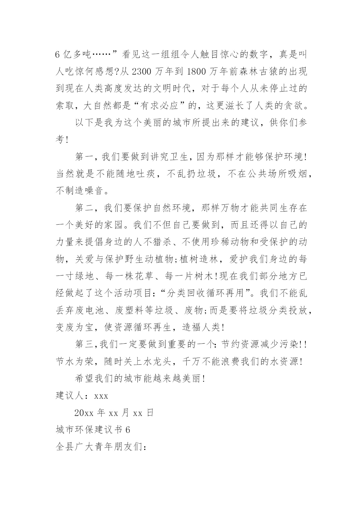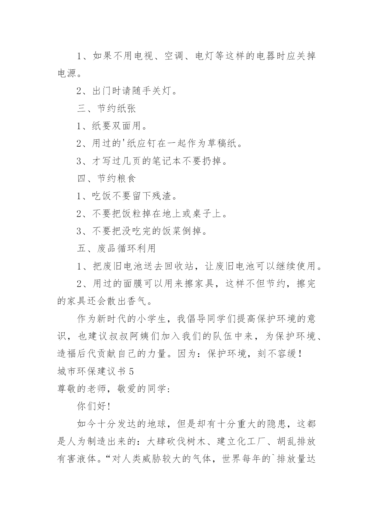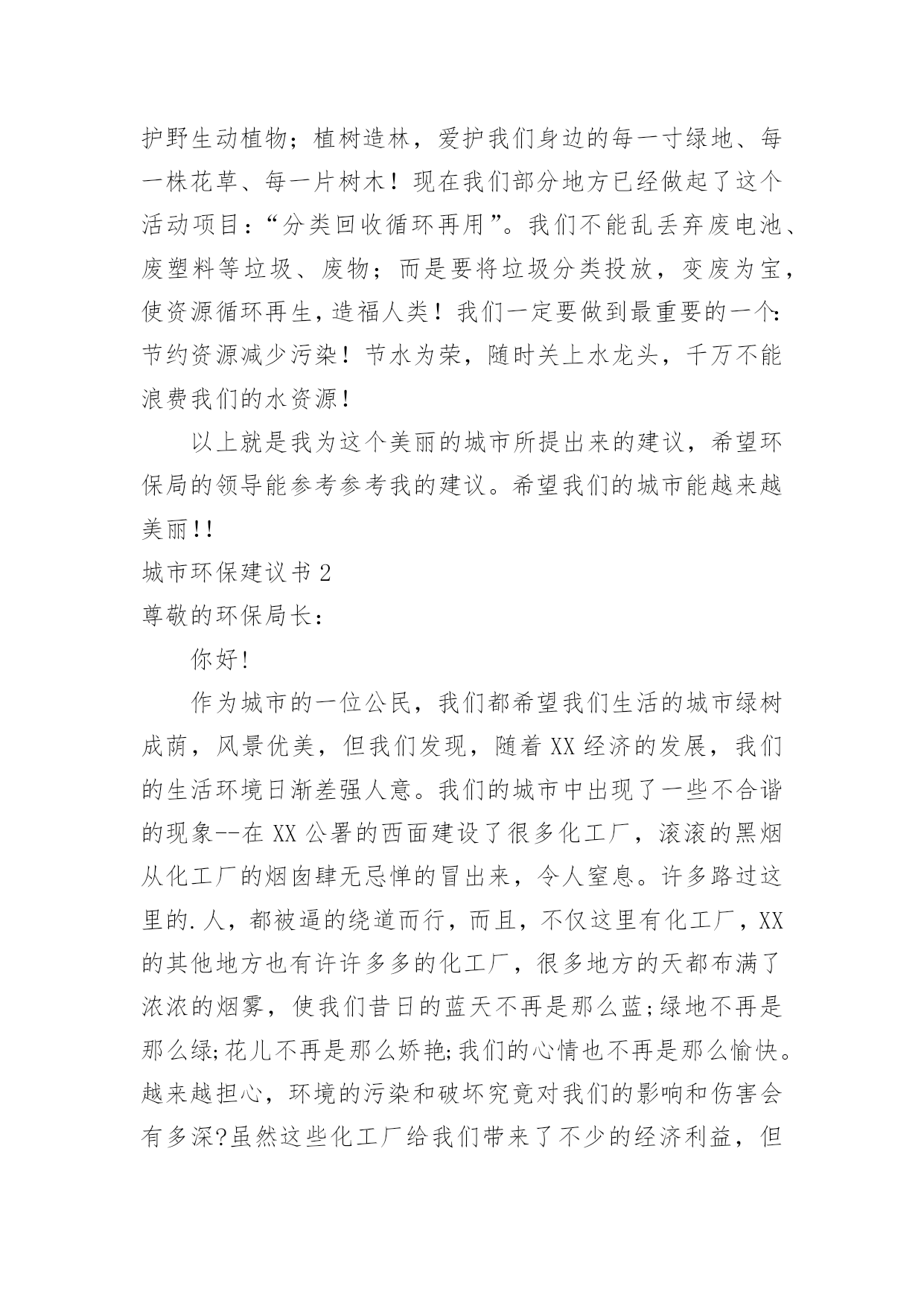 城市环保建议书城市环保建议书在快速变化和不断变革的新时代,建议书对我们的作用越来越大,建议书不是最终的定文形式,它可以被修改,被增删,甚至弃之不用,它具有较强的可塑性。来参考自己需要的建议书吧!以下是小编收集整理的城市环保建议书,欢迎大家借鉴与参考,希望对大家有所帮助。城市环保建议书1环保局领导:你们好!我是深圳市南山实验学校六年级的一名学生。如今十分发达的地球,但是却有十分重大的隐患,这都是人为制造出来的:大肆砍伐树木、建立化工厂、胡乱排放有害液体。“对人类威胁较大的气体,世界每年的排放量达6亿多吨……”看见这一组组令人触目惊心的数字,真是叫人吃惊何感想?从2300万年到1800万年前森林古猿的出现到现在人类高度发达的文明时代,对于每个人从未停止过的索取,大自然都是“有求必应”的,这更滋长了人类的贪欲。环保局的.各位领导,以下是我为这个美丽的城市所提出来的建议,供你们参考!保护自然环境,那样万物才能共同生存在一个美好的家园。我们不但自己要做到,而且还得以自己的力量来提倡身边的人不猎杀、不使用珍稀动物和受保护的动物,关爱与保护野生动植物;植树造林,爱护我们身边的每一寸绿地、每一株花草、每一片树木!现在我们部分地方已经做起了这个活动项目:“分类回收循环再用”。我们不能乱丢弃废电池、废塑料等垃圾、废物;而是要将垃圾分类投放,变废为宝,使资源循环再生,造福人类!我们一定要做到最重要的一个:节约资源减少污染!节水为荣,随时关上水龙头,千万不能浪费我们的水资源!以上就是我为这个美丽的城市所提出来的建议,希望环保局的领导能参考参考我的建议。希望我们的城市能越来越美丽!!城市环保建议书2尊敬的环保局长:你好!作为城市的一位公民,我们都希望我们生活的城市绿树成荫,风景优美,但我们发现,随着XX经济的发展,我们的生活环境日渐差强人意。我们的城市中出现了一些不合谐的现象--在XX公署的西面建设了很多化工厂,滚滚的黑烟从化工厂的烟囱肆无忌惮的冒出来,令人窒息。许多路过这里的.人,都被逼的绕道而行,而且,不仅这里有化工厂,XX的其他地方也有许许多多的化工厂,很多地方的天都布满了浓浓的烟雾,使我们昔日的蓝天不再是那么蓝;绿地不再是那么绿;花儿不再是那么娇艳;我们的心情也不再是那么愉快。越来越担心,环境的污染和破坏究竟对我们的影响和伤害会有多深?虽然这些化工厂给我们带来了不少的经济利益,但是却摧毁了我们的生态环境,我们没有了健康,拥有再多的金钱又有什么意义呢?因此,为了我们的环境不再受到污染,为了找回碧水蓝天,作为XX未来的建设者和主人,我向您郑重提出以下建议:1、请环保部门加强宣传和教育,引导化工厂增加环保设施,减少废气、废水的排放。2、加强对化工厂的监督和检查,使其达到国家规定的排放标准。3、增加对化工厂违反法律法规、肆意排放超标废气、废水违法行为的查处和处罚力度,一旦发现立即停止生产,关闭工厂。4、环保部门要提高环保审核标准,严禁在我市建设新的污染企业。希望有了有您的帮助,会让我们的城市更加美好。祝您身心健康!**月**日城市环保建议书3环保局的叔叔阿姨:您们好!我是龙口市市实验小学的一名小学生。在此,我向您们反映一件事情:现在城区有好多烧烤店,晚上每当路过,就会迎面扑来一阵阵刺鼻难闻的烧烤味,这时,我都会禁不住捏起鼻子来。原来,这些烧烤店是在店外面经营的,烧烤时,烟就会直接飞散到空气中,并且一直吵闹到后半夜。露天烧烤不仅造成周围空气和环境的污染,而且烧烤食品会对人们的.健康造成一定的危害。像这样的烧烤店数不胜数,每当我看到露天烧烤时,真想走上前去阻止他们,并告诉这些人们:“您们只知道挣钱,没有顾忌到周围人们的生活和环境卫生。”可我毕竟是个小孩子,也没有权利去阻止他们,因此,我向您们反映这件事情。在此,我想向您们提出以下建议:1、坚决杜绝露天烧烤。2、让这些“破坏环境的人们”受到一定的处罚。3、将分散在城市各个角落的露天烧烤集中到城外一个地方统一管理起来,尽可能地减少空气污染和给人们正常生活带来的不便。城市环保建议书4亲爱的同学们:如今,地球环境已亮起红灯,世界每年的排放量达6亿多吨……估计到下个世纪中,地球表面有三分之一的土地沙漠化,威胁着60多个国家……看见这一组组令人触目惊心的数字,你是否感到保护环境的重要性呢?因此,我提出以下建议:一、节约用水1、洗手打肥皂或涂洗手液时,不要打开水龙头。2、洗完菜或洗完米的水可以用来浇菜、浇花。3、用水时,水龙头不要开得太大。二、节约用电1、如果不用电视、空调、电灯等这样的电器时应关掉电源。2、出门时请随手关灯。三、节约纸张1、纸要双面用。2、用过的'纸应钉在一起作为草稿纸。3、才写过几页的笔记本不要扔掉。四、节约粮食1、吃饭不要留下残渣。2、不要把饭粒掉在地上或桌子上。3、不要把没吃完的饭菜倒掉。五、