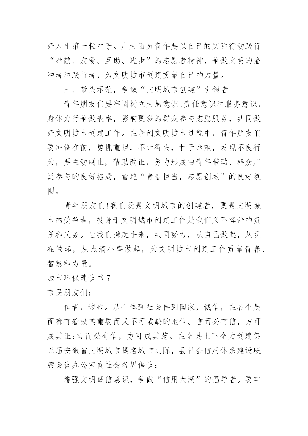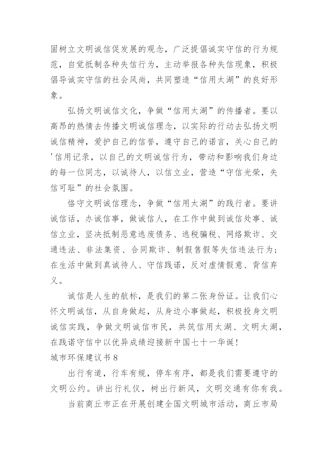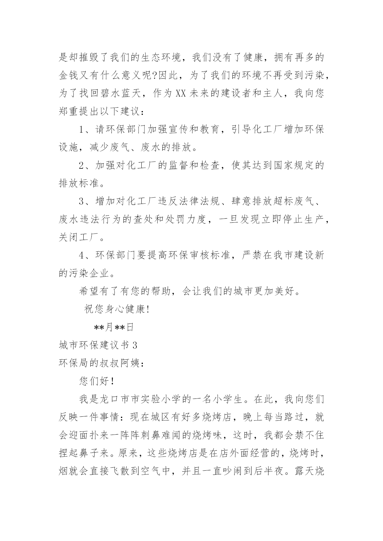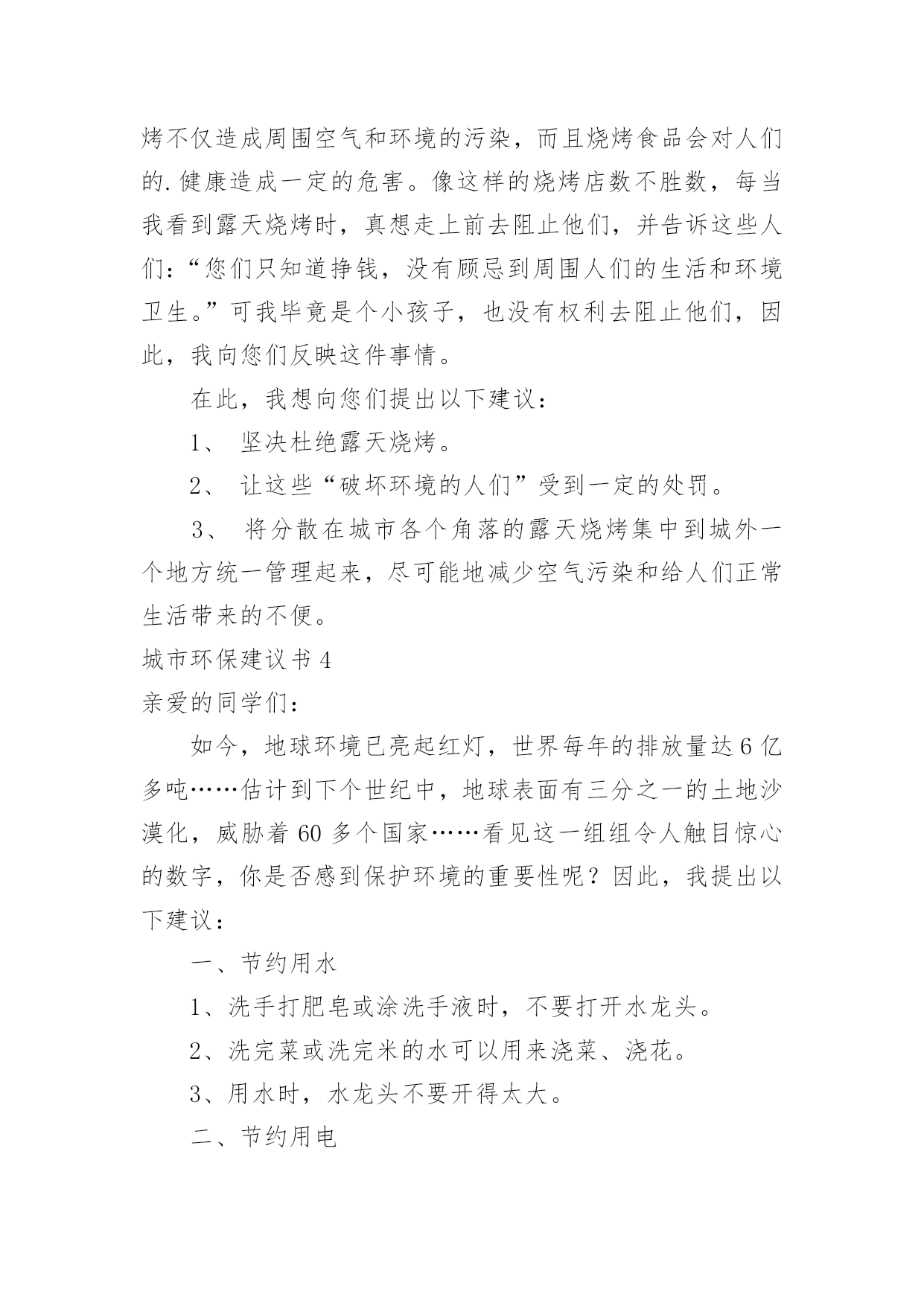 城市环保建议书城市环保建议书在快速变化和不断变革的新时代,建议书对我们的作用越来越大,建议书不是最终的定文形式,它可以被修改,被增删,甚至弃之不用,它具有较强的可塑性。来参考自己需要的建议书吧!以下是小编收集整理的城市环保建议书,欢迎大家借鉴与参考,希望对大家有所帮助。城市环保建议书1环保局领导:你们好!我是深圳市南山实验学校六年级的一名学生。如今十分发达的地球,但是却有十分重大的隐患,这都是人为制造出来的:大肆砍伐树木、建立化工厂、胡乱排放有害液体。“对人类威胁较大的气体,世界每年的排放量达6亿多吨……”看见这一组组令人触目惊心的数字,真是叫人吃惊何感想?从2300万年到1800万年前森林古猿的出现到现在人类高度发达的文明时代,对于每个人从未停止过的索取,大自然都是“有求必应”的,这更滋长了人类的贪欲。环保局的.各位领导,以下是我为这个美丽的城市所提出来的建议,供你们参考!保护自然环境,那样万物才能共同生存在一个美好的家园。我们不但自己要做到,而且还得以自己的力量来提倡身边的人不猎杀、不使用珍稀动物和受保护的动物,关爱与保护野生动植物;植树造林,爱护我们身边的每一寸绿地、每一株花草、每一片树木!现在我们部分地方已经做起了这个活动项目:“分类回收循环再用”。我们不能乱丢弃废电池、废塑料等垃圾、废物;而是要将垃圾分类投放,变废为宝,使资源循环再生,造福人类!我们一定要做到最重要的一个:节约资源减少污染!节水为荣,随时关上水龙头,千万不能浪费我们的水资源!以上就是我为这个美丽的城市所提出来的建议,希望环保局的领导能参考参考我的建议。希望我们的城市能越来越美丽!!城市环保建议书2尊敬的环保局长:你好!作为城市的一位公民,我们都希望我们生活的城市绿树成荫,风景优美,但我们发现,随着XX经济的发展,我们的生活环境日渐差强人意。我们的城市中出现了一些不合谐的现象--在XX公署的西面建设了很多化工厂,滚滚的黑烟从化工厂的烟囱肆无忌惮的冒出来,令人窒息。许多路过这里的.人,都被逼的绕道而行,而且,不仅这里有化工厂,XX的其他地方也有许许多多的化工厂,很多地方的天都布满了浓浓的烟雾,使我们昔日的蓝天不再是那么蓝;绿地不再是那么绿;花儿不再是那么娇艳;我们的心情也不再是那么愉快。越来越担心,环境的污染和破坏究竟对我们的影响和伤害会有多深?虽然这些化工厂给我们带来了不少的经济利益,但是却摧毁了我们的生态环境,我们没有了健康,拥有再多的金钱又有什么意义呢?因此,为了我们的环境不再受到污染,为了找回碧水蓝天,作为XX未来的建设者和主人,我向您郑重提出以下建议:1、请环保部门加强宣传和教育,引导化工厂增加环保设施,减少废气、废水的排放。2、加强对化工厂的监督和检查,使其达到国家规定的排放标准。3、增加对化工厂违反法律法规、肆意排放超标废气、废水违法行为的查处和处罚力度,一旦发现立即停止生产,关闭工厂。4、环保部门要提高环保审核标准,严禁在我市建设新的污染企业。希望有了有您的帮助,会让我们的城市更加美好。祝您身心健康!**月**日城市环保建议书3环保局的叔叔阿姨:您们好!我是龙口市市实验小学的一名小学生。在此,我向您们反映一件事情:现在城区有好多烧烤店,晚上每当路过,就会迎面扑来一阵阵刺鼻难闻的烧烤味,这时,我都会禁不住捏起鼻子来。原来,这些烧烤店是在店外面经营的,烧烤时,烟就会直接飞散到空气中,并且一直吵闹到后半夜。露天烧烤不仅造成周围空气和环境的污染,而且烧烤食品会对人们的.健康造成一定的危害。像这样的烧烤店数不胜数,每当我看到露天烧烤时,真想走上前去阻止他们,并告诉这些人们:“您们只知道挣钱,没有顾忌到周围人们的生活和环境卫生。”可我毕竟是个小孩子,也没有权利去阻止他们,因此,我向您们反映这件事情。在此,我想向您们提出以下建议:1、坚决杜绝露天烧烤。2、让这些“破坏环境的人们”受到一定的处罚。3、将分散在城市各个角落的露天烧烤集中到城外一个地方统一管理起来,尽可能地减少空气污染和给人们正常生活带来的不便。城市环保建议书4亲爱的同学们:如今,地球环境已亮起红灯,世界每年的排放量达6亿多吨……估计到下个世纪中,地球表面有三分之一的土地沙漠化,威胁着60多个国家……看见这一组组令人触目惊心的数字,你是否感到保护环境的重要性呢?因此,我提出以下建议:一、节约用水1、洗手打肥皂或涂洗手液时,不要打开水龙头。2、洗完菜或洗完米的水可以用来浇菜、浇花。3、用水时,水龙头不要开得太大。二、节约用电1、如果不用电视、空调、电灯等这样的电器时应关掉电源。2、出门时请随手关灯。三、节约纸张1、纸要双面用。2、用过的'纸应钉在一起作为草稿纸。3、才写过几页的笔记本不要扔掉。四、节约粮食1、吃饭不要留下残渣。2、不要把饭粒掉在地上或桌子上。3、不要把没吃完的饭菜倒掉。五、