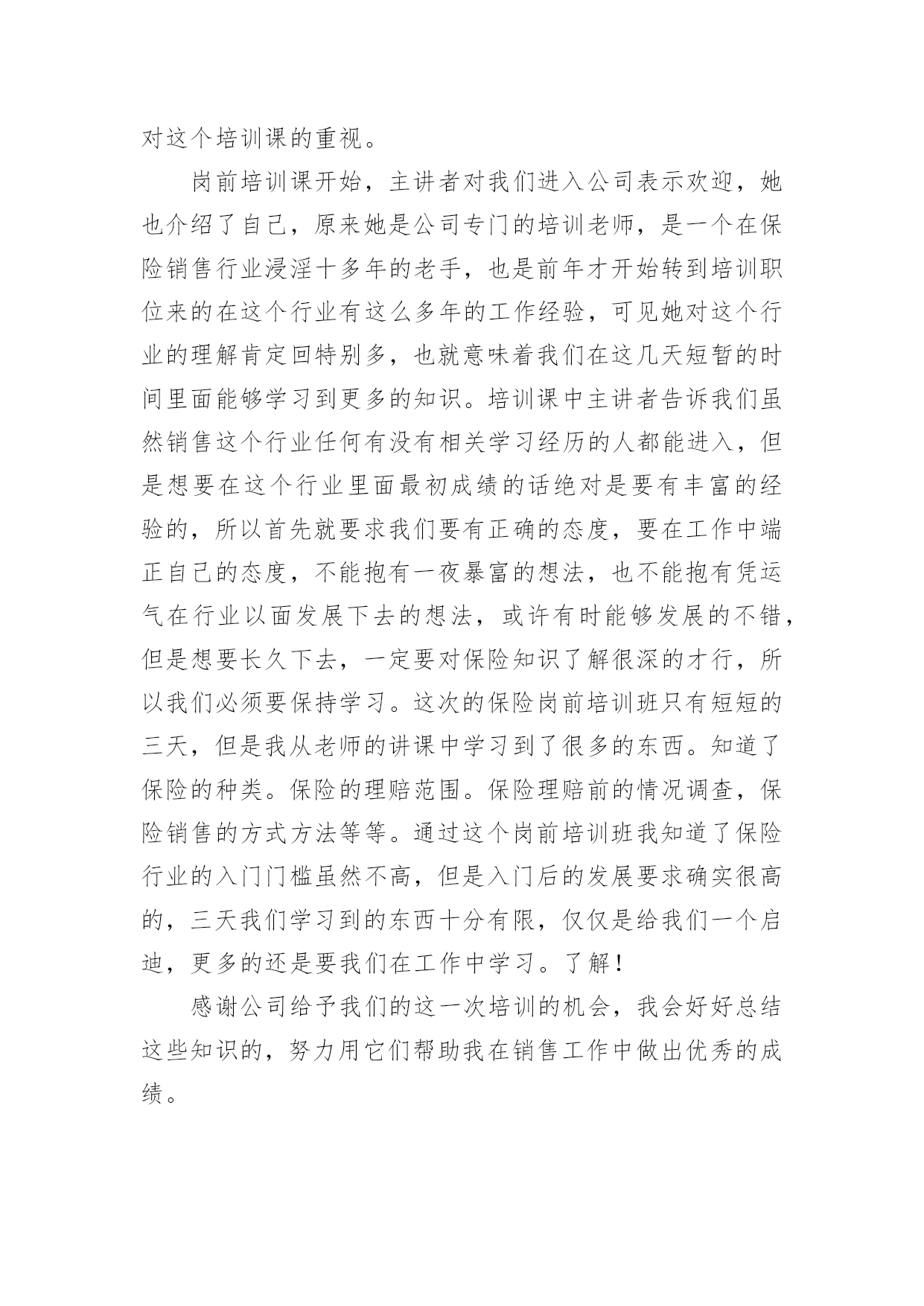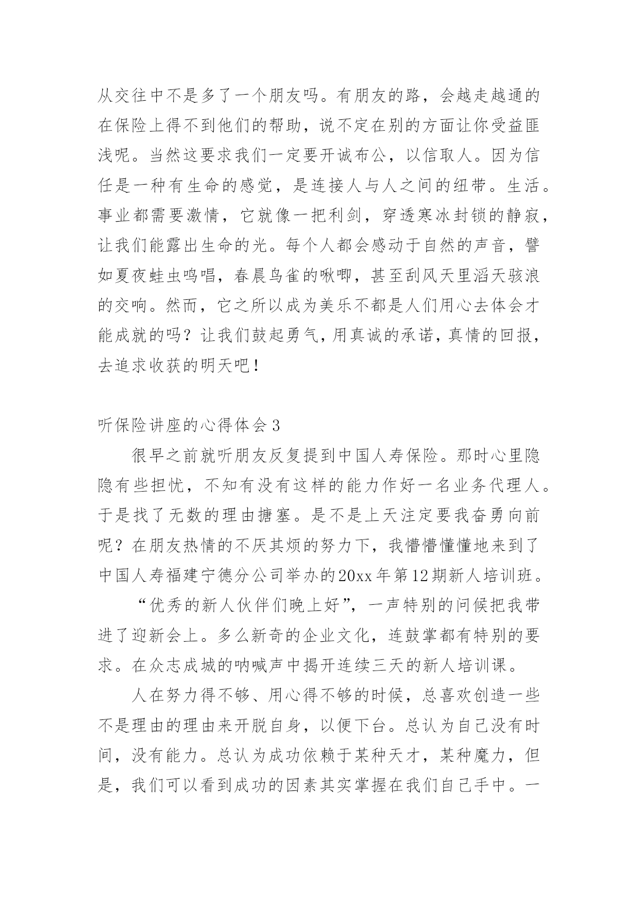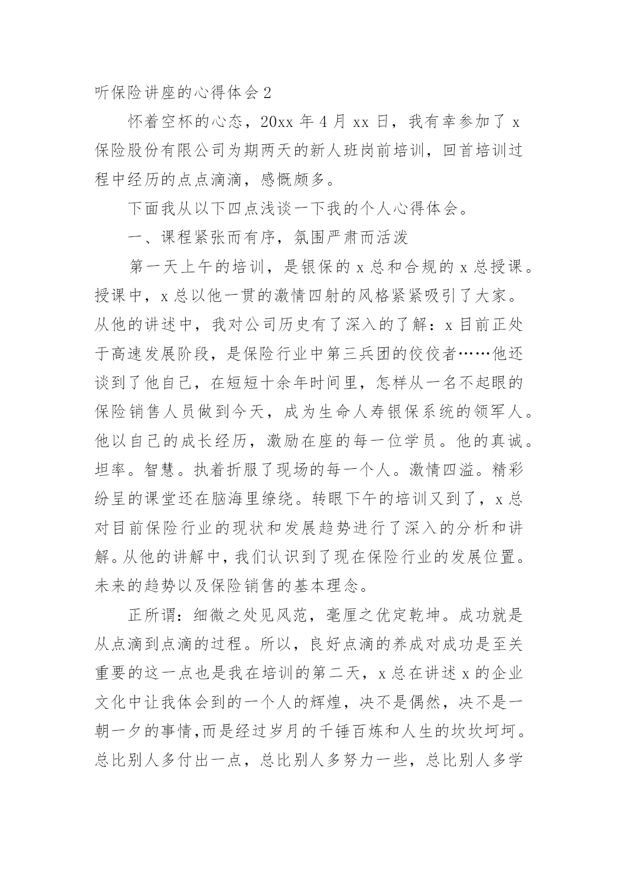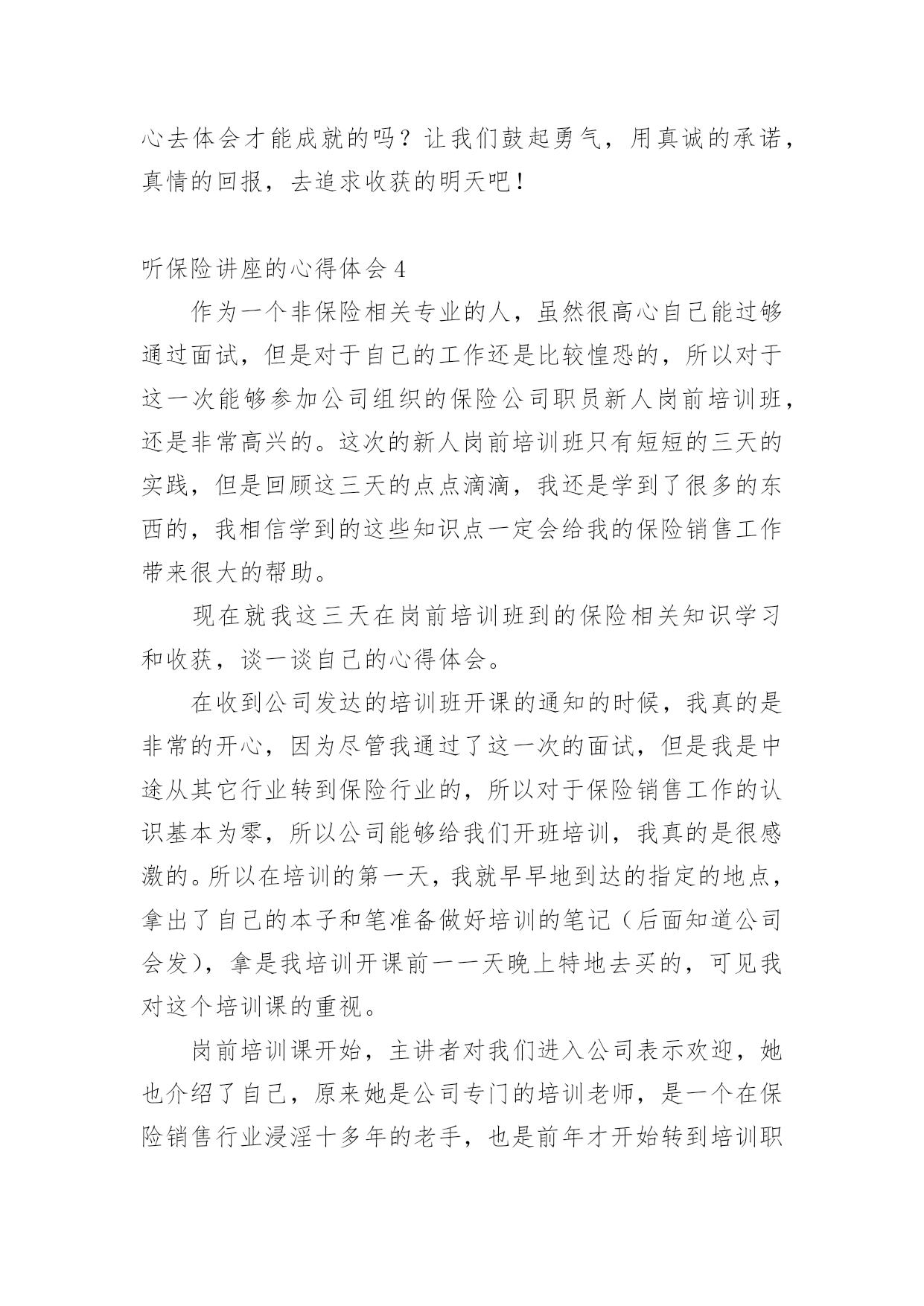 听保险讲座的心得体会当我们对人生或者事物有了新的思考时,马上将其记录下来,这样我们可以养成良好的总结方法。到底应如何写心得体会呢?以下是小编为大家整理的听保险讲座的心得体会,欢迎阅读,希望大家能够喜欢。听保险讲座的心得体会1作为一个非保险相关专业的人,虽然很高心自己能过够通过面试,但是对于自己的工作还是比较惶恐的,所以对于这一次能够参加公司组织的保险公司职员新人岗前培训班,还是非常高兴的这次的新人岗前培训班只有短短的三天的实践,但是回顾这三天的点点滴滴,我还是学到了很多的东西的,我相信学到的这些知识点一定会给我的保险销售工作带来很大的帮助。现在就我这三天在岗前培训班到的保险相关知识学习和收获,谈一谈自己的心得体会。在收到公司发达的培训班开课的.通知的时候,我真的是非常的开心,因为尽管我通过了这一次的面试,但是我是中途从其它行业转到保险行业的,所以对于保险销售工作的认识基本为零,所以公司能够给我们开班培训,我真的是很感激的所以在培训的第一天,我就早早地到达的指定的地点,拿出了自己的本子和笔准备做好培训的笔记(后面知道公司会发),拿是我培训开课前一一天晚上特地去买的,可见我对这个培训课的重视。岗前培训课开始,主讲者对我们进入公司表示欢迎,她也介绍了自己,原来她是公司专门的培训老师,是一个在保险销售行业浸淫十多年的老手,也是前年才开始转到培训职位来的在这个行业有这么多年的工作经验,可见她对这个行业的理解肯定回特别多,也就意味着我们在这几天短暂的时间里面能够学习到更多的知识。培训课中主讲者告诉我们虽然销售这个行业任何有没有相关学习经历的人都能进入,但是想要在这个行业里面最初成绩的话绝对是要有丰富的经验的,所以首先就要求我们要有正确的态度,要在工作中端正自己的态度,不能抱有一夜暴富的想法,也不能抱有凭运气在行业以面发展下去的想法,或许有时能够发展的不错,但是想要长久下去,一定要对保险知识了解很深的才行,所以我们必须要保持学习。这次的保险岗前培训班只有短短的三天,但是我从老师的讲课中学习到了很多的东西。知道了保险的种类。保险的理赔范围。保险理赔前的情况调查,保险销售的方式方法等等。通过这个岗前培训班我知道了保险行业的入门门槛虽然不高,但是入门后的发展要求确实很高的,三天我们学习到的东西十分有限,仅仅是给我们一个启迪,更多的还是要我们在工作中学习。了解!感谢公司给予我们的这一次培训的机会,我会好好总结这些知识的,努力用它们帮助我在销售工作中做出优秀的成绩。听保险讲座的心得体会2怀着空杯的心态,20xx年4月xx日,我有幸参加了x保险股份有限公司为期两天的新人班岗前培训,回首培训过程中经历的点点滴滴,感慨颇多。下面我从以下四点浅谈一下我的个人心得体会。一、课程紧张而有序,氛围严肃而活泼第一天上午的培训,是银保的x总和合规的x总授课。授课中,x总以他一贯的激情四射的风格紧紧吸引了大家。从他的讲述中,我对公司历史有了深入的了解:x目前正处于高速发展阶段,是保险行业中第三兵团的佼佼者……他还谈到了他自己,在短短十余年时间里,怎样从一名不起眼的保险销售人员做到今天,成为生命人寿银保系统的领军人。他以自己的成长经历,激励在座的每一位学员。他的真诚。坦率。智慧。执着折服了现场的每一个人。激情四溢。精彩纷呈的课堂还在脑海里缭绕。转眼下午的培训又到了,x总对目前保险行业的现状和发展趋势进行了深入的分析和讲解。从他的讲解中,我们认识到了现在保险行业的发展位置。未来的趋势以及保险销售的基本理念。正所谓:细微之处见风范,毫厘之优定乾坤。成功就是从点滴到点滴的过程。所以,良好点滴的养成对成功是至关重要的这一点也是我在培训的第二天,x总在讲述x的企业文化中让我体会到的一个人的辉煌,决不是偶然,决不是一朝一夕的事情,而是经过岁月的千锤百炼和人生的坎坎坷坷。总比别人多付出一点,总比别人多努力一些,总比别人多学习一分,离成功总会近些再近些。二、态度决定一切,理念产生力量。〝做保险就是做事业,我为成功而来,我为理想而来〞。从培训班一开始我就把它当作我的座右铭,时刻牢记在心,把端正态度作为成功与收获的起步。米卢曾说过:〝态度决定一切!〞只有从心里认同了学习的必要性和重要性,才能使行动变自发为自觉,才能产生良好和积极的效果。课程的第一天我认真思考这样的一个问题:在培训班过程中如何学习,想学到什么,学习后对自己有哪些期望?现在我找到了想要的答案。我觉得,首先要明确目标,树立信心,理论联系实际,严格遵守纪律。从一点一滴的小事情做起,踏踏实实朝大目标走去。一个公司请出多位日理万机的高管为新人授课,这样的机会,人生能有几回?有什么理由不去珍惜和努力呢?积极向上的态度是进步的根本保障,良好的心态本身就是一笔宝贵的财富。三、对目标执着,才能成功在握人要想实现自我的价值,就要有目标,并且要