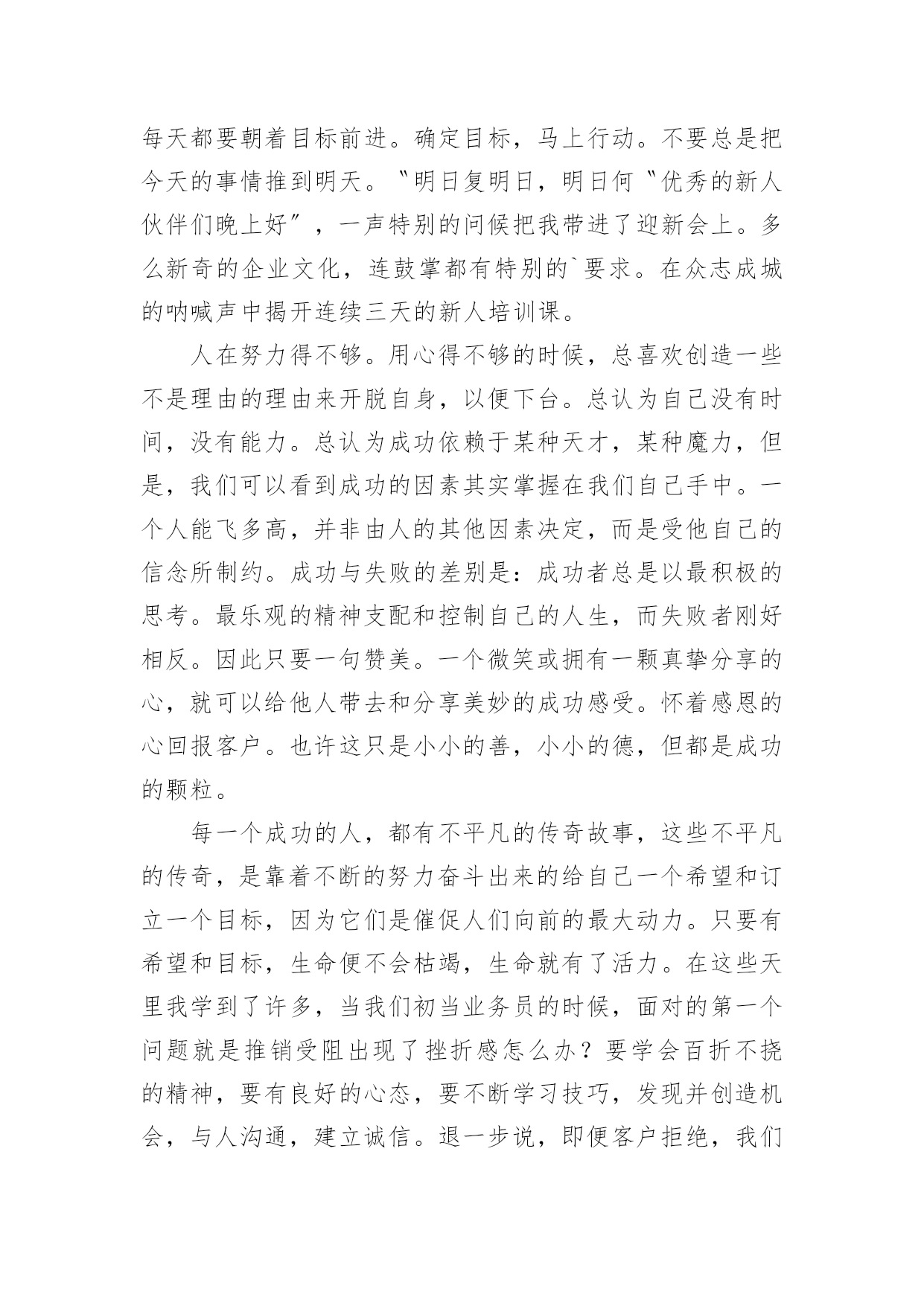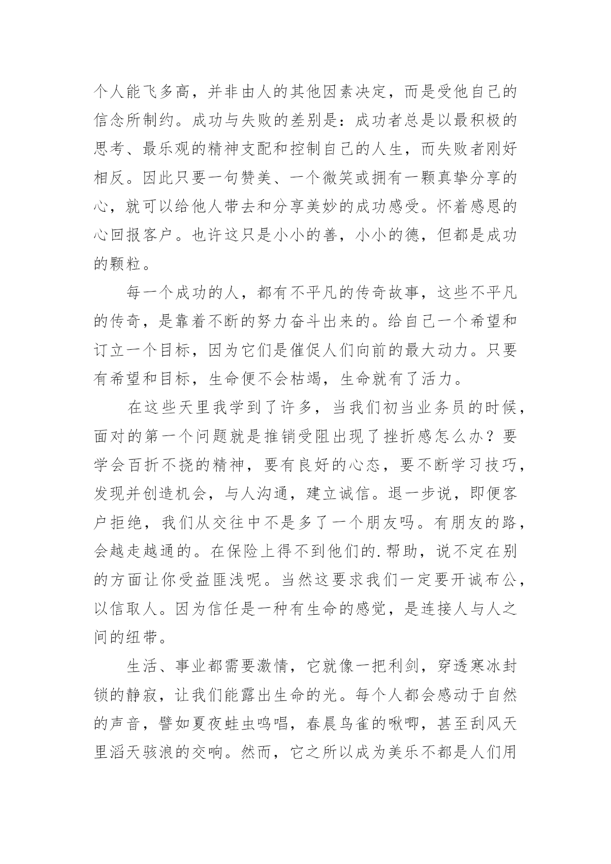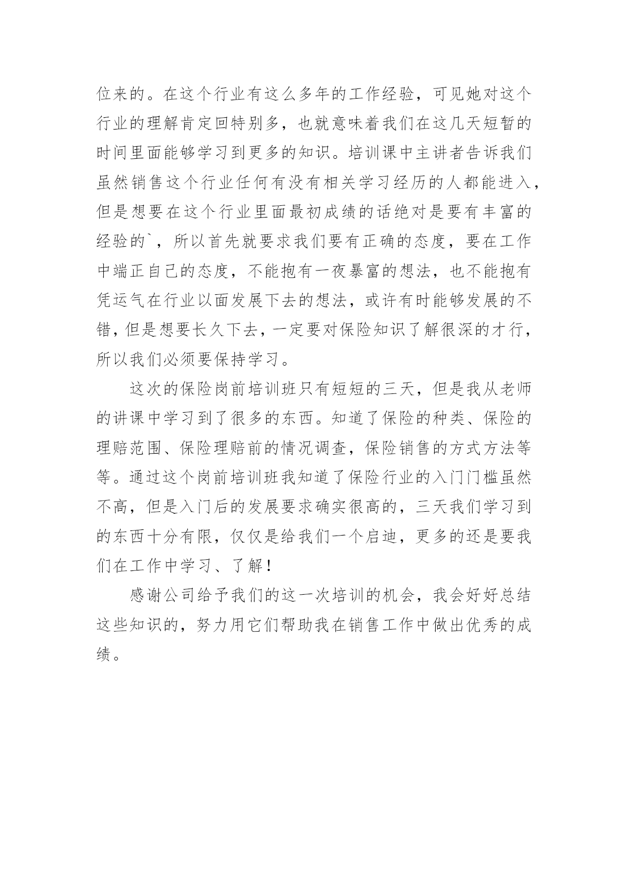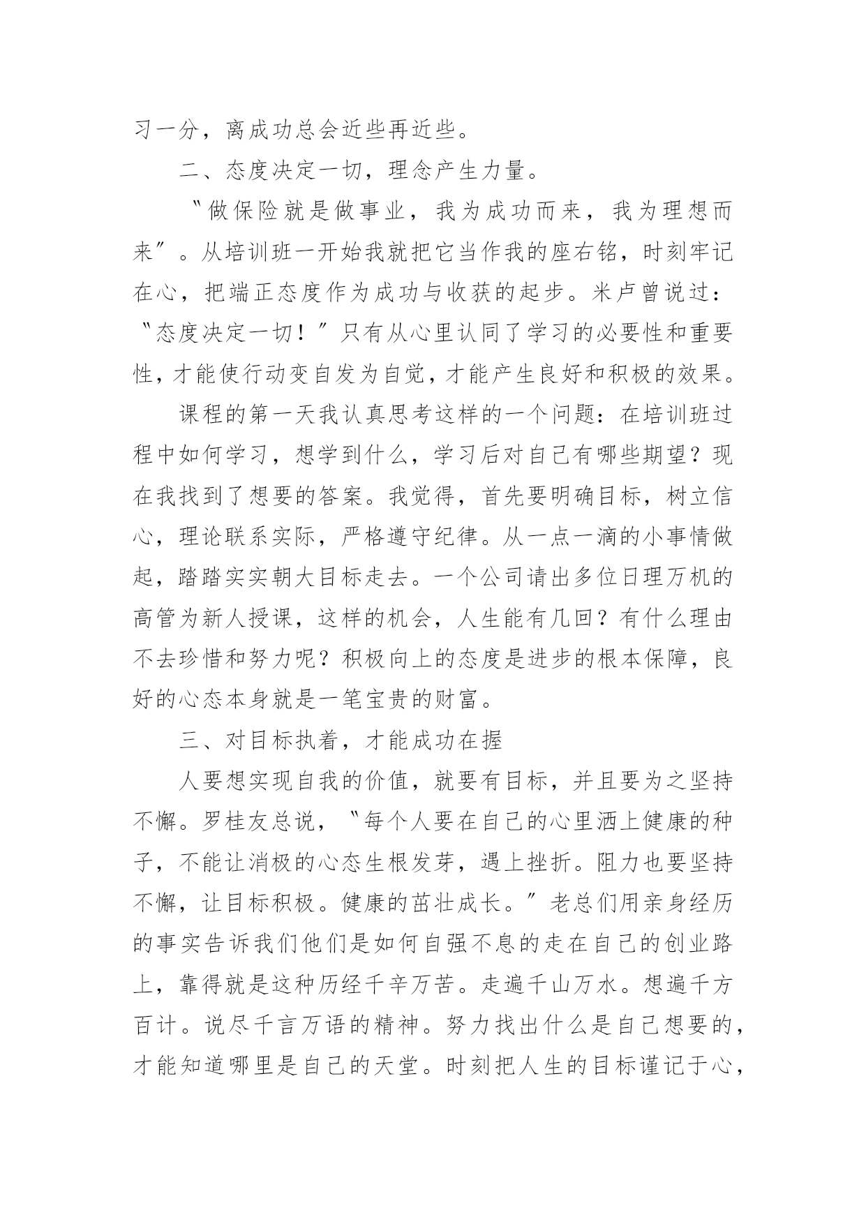 听保险讲座的心得体会当我们对人生或者事物有了新的思考时,马上将其记录下来,这样我们可以养成良好的总结方法。到底应如何写心得体会呢?以下是小编为大家整理的听保险讲座的心得体会,欢迎阅读,希望大家能够喜欢。听保险讲座的心得体会1作为一个非保险相关专业的人,虽然很高心自己能过够通过面试,但是对于自己的工作还是比较惶恐的,所以对于这一次能够参加公司组织的保险公司职员新人岗前培训班,还是非常高兴的这次的新人岗前培训班只有短短的三天的实践,但是回顾这三天的点点滴滴,我还是学到了很多的东西的,我相信学到的这些知识点一定会给我的保险销售工作带来很大的帮助。现在就我这三天在岗前培训班到的保险相关知识学习和收获,谈一谈自己的心得体会。在收到公司发达的培训班开课的.通知的时候,我真的是非常的开心,因为尽管我通过了这一次的面试,但是我是中途从其它行业转到保险行业的,所以对于保险销售工作的认识基本为零,所以公司能够给我们开班培训,我真的是很感激的所以在培训的第一天,我就早早地到达的指定的地点,拿出了自己的本子和笔准备做好培训的笔记(后面知道公司会发),拿是我培训开课前一一天晚上特地去买的,可见我对这个培训课的重视。岗前培训课开始,主讲者对我们进入公司表示欢迎,她也介绍了自己,原来她是公司专门的培训老师,是一个在保险销售行业浸淫十多年的老手,也是前年才开始转到培训职位来的在这个行业有这么多年的工作经验,可见她对这个行业的理解肯定回特别多,也就意味着我们在这几天短暂的时间里面能够学习到更多的知识。培训课中主讲者告诉我们虽然销售这个行业任何有没有相关学习经历的人都能进入,但是想要在这个行业里面最初成绩的话绝对是要有丰富的经验的,所以首先就要求我们要有正确的态度,要在工作中端正自己的态度,不能抱有一夜暴富的想法,也不能抱有凭运气在行业以面发展下去的想法,或许有时能够发展的不错,但是想要长久下去,一定要对保险知识了解很深的才行,所以我们必须要保持学习。这次的保险岗前培训班只有短短的三天,但是我从老师的讲课中学习到了很多的东西。知道了保险的种类。保险的理赔范围。保险理赔前的情况调查,保险销售的方式方法等等。通过这个岗前培训班我知道了保险行业的入门门槛虽然不高,但是入门后的发展要求确实很高的,三天我们学习到的东西十分有限,仅仅是给我们一个启迪,更多的还是要我们在工作中学习。了解!感谢公司给予我们的这一次培训的机会,我会好好总结这些知识的,努力用它们帮助我在销售工作中做出优秀的成绩。听保险讲座的心得体会2怀着空杯的心态,20xx年4月xx日,我有幸参加了x保险股份有限公司为期两天的新人班岗前培训,回首培训过程中经历的点点滴滴,感慨颇多。下面我从以下四点浅谈一下我的个人心得体会。一、课程紧张而有序,氛围严肃而活泼第一天上午的培训,是银保的x总和合规的x总授课。授课中,x总以他一贯的激情四射的风格紧紧吸引了大家。从他的讲述中,我对公司历史有了深入的了解:x目前正处于高速发展阶段,是保险行业中第三兵团的佼佼者……他还谈到了他自己,在短短十余年时间里,怎样从一名不起眼的保险销售人员做到今天,成为生命人寿银保系统的领军人。他以自己的成长经历,激励在座的每一位学员。他的真诚。坦率。智慧。执着折服了现场的每一个人。激情四溢。精彩纷呈的课堂还在脑海里缭绕。转眼下午的培训又到了,x总对目前保险行业的现状和发展趋势进行了深入的分析和讲解。从他的讲解中,我们认识到了现在保险行业的发展位置。未来的趋势以及保险销售的基本理念。正所谓:细微之处见风范,毫厘之优定乾坤。成功就是从点滴到点滴的过程。所以,良好点滴的养成对成功是至关重要的这一点也是我在培训的第二天,x总在讲述x的企业文化中让我体会到的一个人的辉煌,决不是偶然,决不是一朝一夕的事情,而是经过岁月的千锤百炼和人生的坎坎坷坷。总比别人多付出一点,总比别人多努力一些,总比别人多学习一分,离成功总会近些再近些。二、态度决定一切,理念产生力量。〝做保险就是做事业,我为成功而来,我为理想而来〞。从培训班一开始我就把它当作我的座右铭,时刻牢记在心,把端正态度作为成功与收获的起步。米卢曾说过:〝态度决定一切!〞只有从心里认同了学习的必要性和重要性,才能使行动变自发为自觉,才能产生良好和积极的效果。课程的第一天我认真思考这样的一个问题:在培训班过程中如何学习,想学到什么,学习后对自己有哪些期望?现在我找到了想要的答案。我觉得,首先要明确目标,树立信心,理论联系实际,严格遵守纪律。从一点一滴的小事情做起,踏踏实实朝大目标走去。一个公司请出多位日理万机的高管为新人授课,这样的机会,人生能有几回?有什么理由不去珍惜和努力呢?积极向上的态度是进步的根本保障,良好的心态本身就是一笔宝贵的财富。三、对目标执着,才能成功在握人要想实现自我的价值,就要有目标,并且要