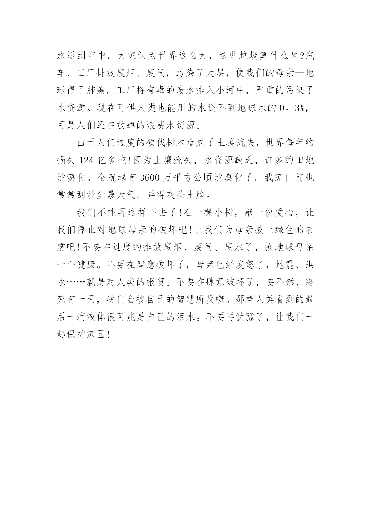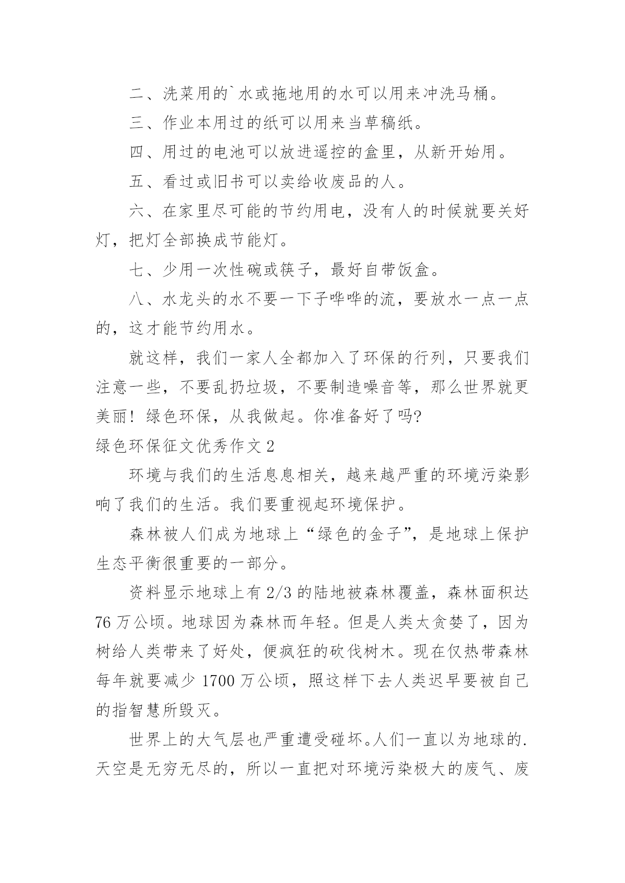 绿色环保征文优秀作文绿色环保征文优秀作文在学习、工作乃至生活中,许多人都写过作文吧,作文是人们以书面形式表情达意的言语活动。一篇什么样的作文才能称之为优秀作文呢?下面是小编精心整理的绿色环保征文优秀作文,仅供参考,欢迎大家阅读。绿色环保征文优秀作文1在21世纪的今天,无论是网络上还是生活上都和环保这个“热词”息息相关,当今世界上都在提倡环保,共同保护这个美丽的地球,而我作为一名中国人当然要从开始自身环保了。说起环保,每个人都可以做到,哪怕是看到街上有垃圾,把垃圾扔到垃圾桶这种小事都可以。当我把我的环保计划告诉妈妈,妈妈和全家人都鼎力支持,让我的心情激动不已。环保在我家逐渐流行,每当我放学回家,在以前我一定第一时间打开电视或打开电脑,可现在我就不再像以前一样浪费电资源,尽可能的减少用电视或电脑,节省电资源。而姐姐,也加入了环保系列,在过去姐姐总是大量的浪费水资源,洗手或洗澡都要洗很久,但现在不但缩短了时间,还能环保。不仅是我们,最厉害的是妈妈,还规定了一些环保小技巧。一、煮饭留下的洗米水,我们可以用来洗菜或浇花。二、洗菜用的`水或拖地用的水可以用来冲洗马桶。三、作业本用过的纸可以用来当草稿纸。四、用过的电池可以放进遥控的盒里,从新开始用。五、看过或旧书可以卖给收废品的人。六、在家里尽可能的节约用电,没有人的时候就要关好灯,把灯全部换成节能灯。七、少用一次性碗或筷子,最好自带饭盒。八、水龙头的水不要一下子哗哗的流,要放水一点一点的,这才能节约用水。就这样,我们一家人全都加入了环保的行列,只要我们注意一些,不要乱扔垃圾,不要制造噪音等,那么世界就更美丽!绿色环保,从我做起。你准备好了吗?绿色环保征文优秀作文2环境与我们的生活息息相关,越来越严重的环境污染影响了我们的生活。我们要重视起环境保护。森林被人们成为地球上“绿色的金子”,是地球上保护生态平衡很重要的一部分。资料显示地球上有2/3的陆地被森林覆盖,森林面积达76万公顷。地球因为森林而年轻。但是人类太贪婪了,因为树给人类带来了好处,便疯狂的砍伐树木。现在仅热带森林每年就要减少1700万公顷,照这样下去人类迟早要被自己的指智慧所毁灭。世界上的大气层也严重遭受碰坏。人们一直以为地球的.天空是无穷无尽的,所以一直把对环境污染极大的废气、废水送到空中。大家认为世界这么大,这些垃圾算什么呢?汽车、工厂排放废烟、废气,污染了大层,使我们的母亲—地球得了肺癌。工厂将有毒的废水排入小河中,严重的污染了水资源。现在可供人类也能用的水还不到地球水的0。3%,可是人们还在放肆的浪费水资源。由于人们过度的砍伐树木造成了土壤流失,世界每年约损失124亿多吨!因为土壤流失,水资源缺乏,许多的田地沙漠化。全就越有3600万平方公顷沙漠化了。我家门前也常常刮沙尘暴天气,弄得灰头土脸。我们不能再这样下去了!在一棵小树,献一份爱心,让我们停止对地球母亲的破坏吧!让我们为母亲披上绿色的衣裳吧!不要在过度的排放废烟、废气、废水了,换地球母亲一个健康。不要在肆意破坏了,母亲已经发怒了,地震、洪水……就是对人类的报复。不要在肆意破坏了,要不然,终究有一天,我们会被自己的智慧所反噬。那样人类看到的最后一滴液体很可能是自己的泪水。不要再犹豫了,让我们一起保护家园!