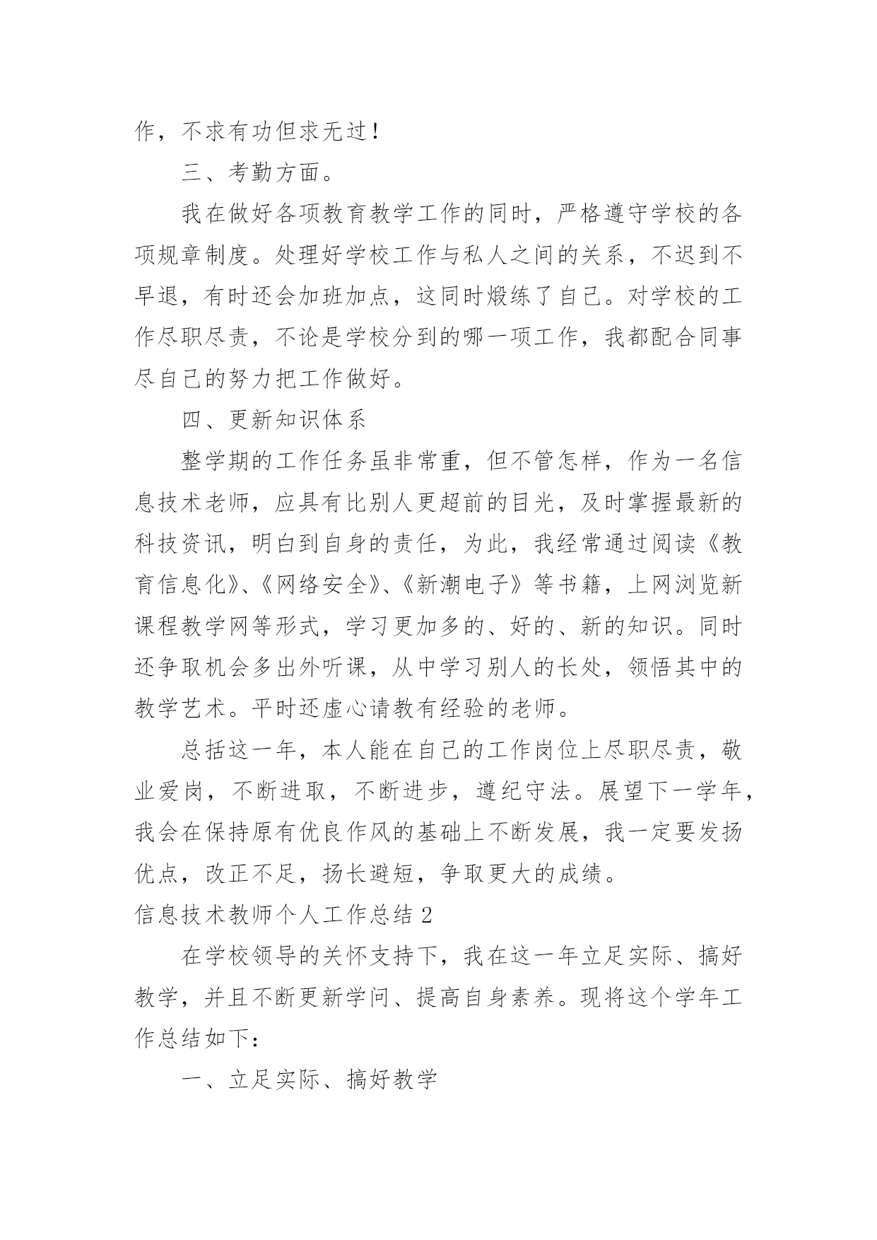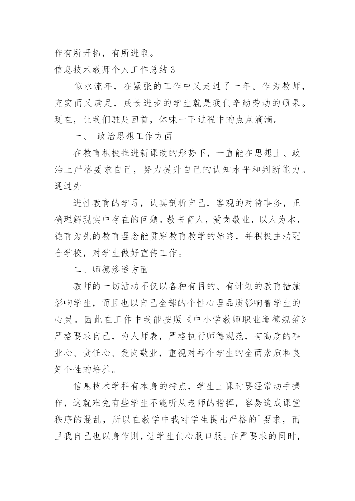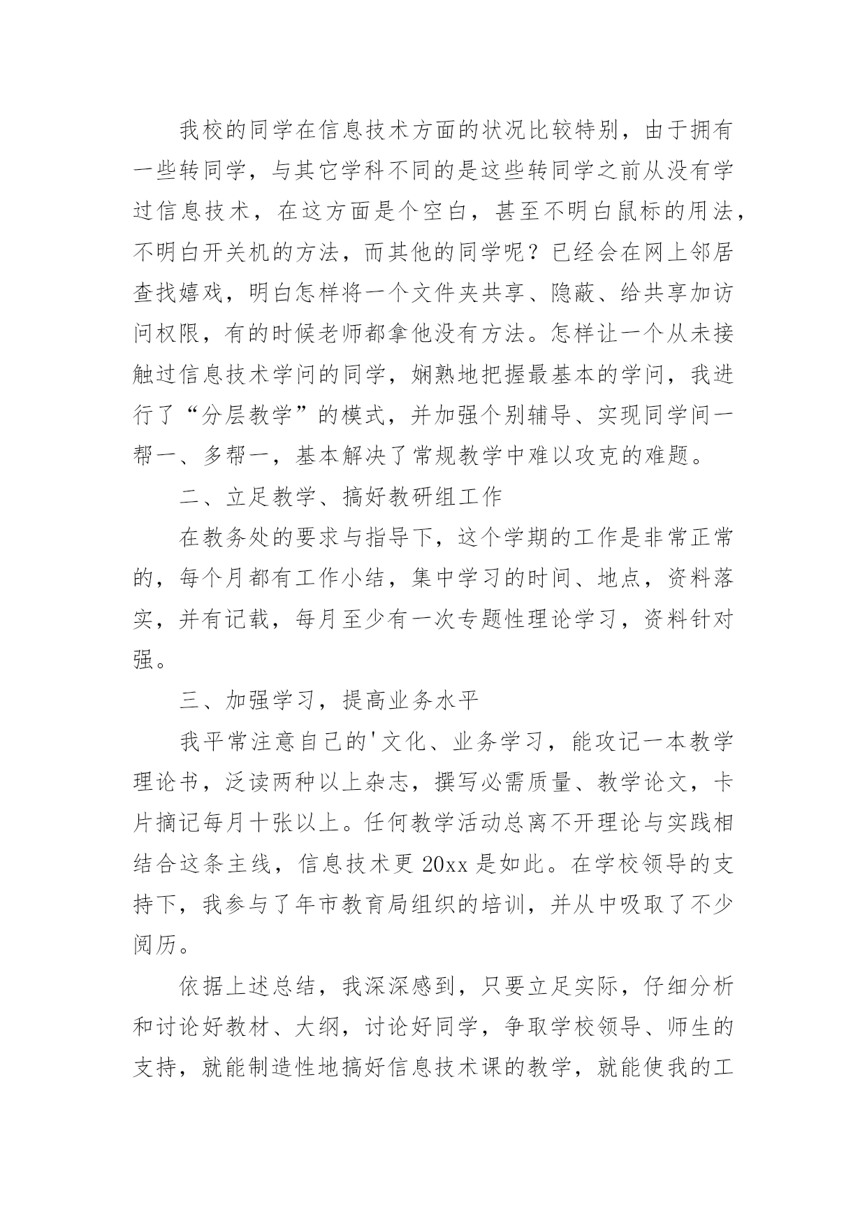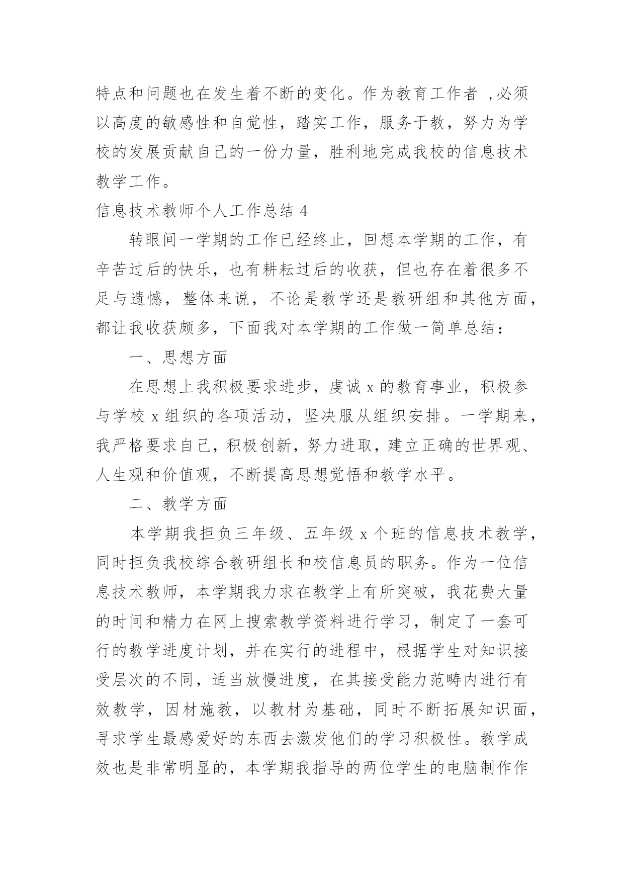 信息技术教师个人工作总结(必备)信息技术教师个人工作总结总结是事后对某一阶段的学习、工作或其完成情况加以回顾和分析的一种书面材料,它可以帮助我们总结以往思想,发扬成绩,让我们一起认真地写一份总结吧。总结怎么写才不会流于形式呢?下面是小编帮大家整理的信息技术教师个人工作总结,欢迎阅读,希望大家能够喜欢。信息技术教师个人工作总结1不知不觉中一个学年结束了,回顾这个学年所从事的信息技术教学工作,基本上是比较顺利地完成任务。当然在工作中我享受到收获喜悦,也在工作中发现一些存在的问题。我所享有的收获,我会用于下一年的工作中,我所碰到的问题我会认真思考,想办法解决。在这个学年中,本人能在保持原有良好工作态度的基础上,不断进步,不断进取,不断学习,虚心向有经验的老师学习。为了保持优良的工作姿态,以使下一学年能以更优秀的面貌去继续工作,现将本人该学期的工作情况进行全面的总结,总结如下:一、思想方面在这一年里,我在思想上严于律己,热爱教育事业,各方面约束自己,鞭策自己,对自己要求更为严格,力争在思想上、工作上在同事、学生的心目中树立良好的形象,使自己的思想再上一个新的台阶,同时也对自己思想上有了更加高的要求。一年来,我还积极参加各业务培训学习,努力提高自己的教学水平和业务水平,提高自身的思想觉悟。服从学校的工作安排,默默无声地配合领导和老师们做好校内外的各项工作,得到了领导和同事的肯定。这些肯定使我在以后的工作中变得更有信心、有动力去做好每一样工作。二、工作方面这学年我主要担任八年级的信息技术教学和学校电教设备的检修、维护等工作。相对于上一年,无论是工作方法、工作经验、还是工作效率都有了明显的改善。虽然工作量比较大,但为了提高教学水平和提高业务水平,本人在大量收集别人优秀设计,优秀架构,向有经验老师请教的基础上,利用本人有限的时间建立教育网博客,这有利于同行同事间的交流和学习,方便学生与我的交流,这大大有利于我教学的提高和及时掌握学生的动向,有利于引导学生的学习。在教学之余,我也注重自身发展进步。除了听课,评课,参加教研组教研活动外,我还注意到要自学。从思想上,利用行评机会端正自己;从行动上学电脑技术,学教学技能等;在生活上注意形象,为人师表。在学校设备管理方面,本学年,本人对自己负责的电教设备进行了全面的检修、保养,力求它们能够正常的工作,为学生创造一个良好的学习环境。在学籍管理方面,本学年本人兢兢业业。加班加点的完成了初一新生的基本情况汇总,初二的会考报名,初三中考的网上报名及网上志愿填报工作,我做的.是一些繁琐的工作,不求有功但求无过!三、考勤方面。我在做好各项教育教学工作的同时,严格遵守学校的各项规章制度。处理好学校工作与私人之间的关系,不迟到不早退,有时还会加班加点,这同时煅练了自己。对学校的工作尽职尽责,不论是学校分到的哪一项工作,我都配合同事尽自己的努力把工作做好。四、更新知识体系整学期的工作任务虽非常重,但不管怎样,作为一名信息技术老师,应具有比别人更超前的目光,及时掌握最新的科技资讯,明白到自身的责任,为此,我经常通过阅读《教育信息化》、《网络安全》、《新潮电子》等书籍,上网浏览新课程教学网等形式,学习更加多的、好的、新的知识。同时还争取机会多出外听课,从中学习别人的长处,领悟其中的教学艺术。平时还虚心请教有经验的老师。总括这一年,本人能在自己的工作岗位上尽职尽责,敬业爱岗,不断进取,不断进步,遵纪守法。展望下一学年,我会在保持原有优良作风的基础上不断发展,我一定要发扬优点,改正不足,扬长避短,争取更大的成绩。信息技术教师个人工作总结2在学校领导的关怀支持下,我在这一年立足实际、搞好教学,并且不断更新学问、提高自身素养。现将这个学年工作总结如下:一、立足实际、搞好教学我校的同学在信息技术方面的状况比较特别,由于拥有一些转同学,与其它学科不同的是这些转同学之前从没有学过信息技术,在这方面是个空白,甚至不明白鼠标的用法,不明白开关机的方法,而其他的同学呢?已经会在网上邻居查找嬉戏,明白怎样将一个文件夹共享、隐蔽、给共享加访问权限,有的时候老师都拿他没有方法。怎样让一个从未接触过信息技术学问的同学,娴熟地把握最基本的学问,我进行了“分层教学”的模式,并加强个别辅导、实现同学间一帮一、多帮一,基本解决了常规教学中难以攻克的难题。二、立足教学、搞好教研组工作在教务处的要求与指导下,这个学期的工作是非常正常的,每个月都有工作小结,集中学习的时间、地点,资料落实,并有记载,每月至少有一次专题性理论学习,资料针对强。三、加强学习,提高业务水平我平常注意自己的'文化、业务学习,能攻记一本教学理论书,泛读两种以上杂志,撰写必需质量、教学论文,卡片摘记每月十张以上。任何教学活动总离不开理论与实践相结合这条主线,信息技术更20xx是如此。在学校领