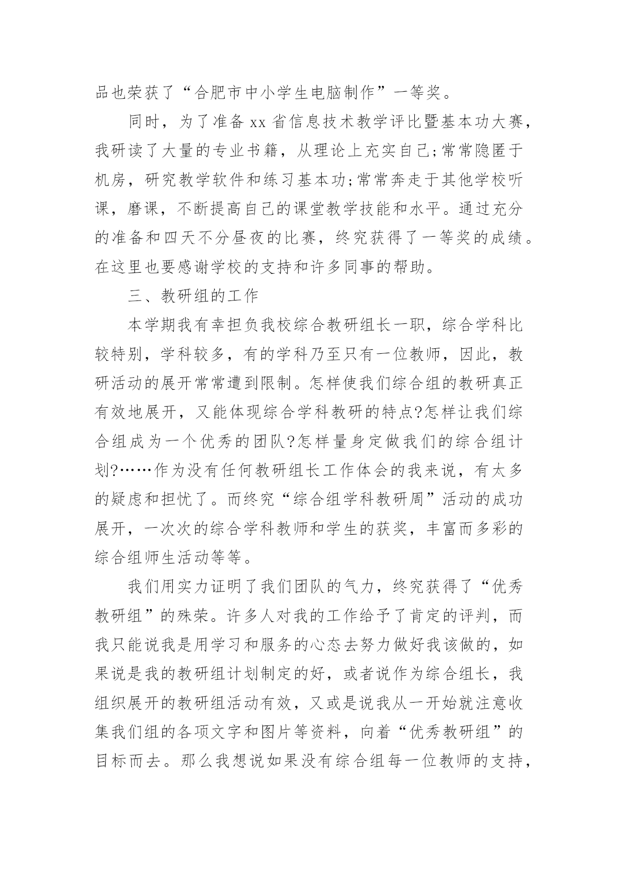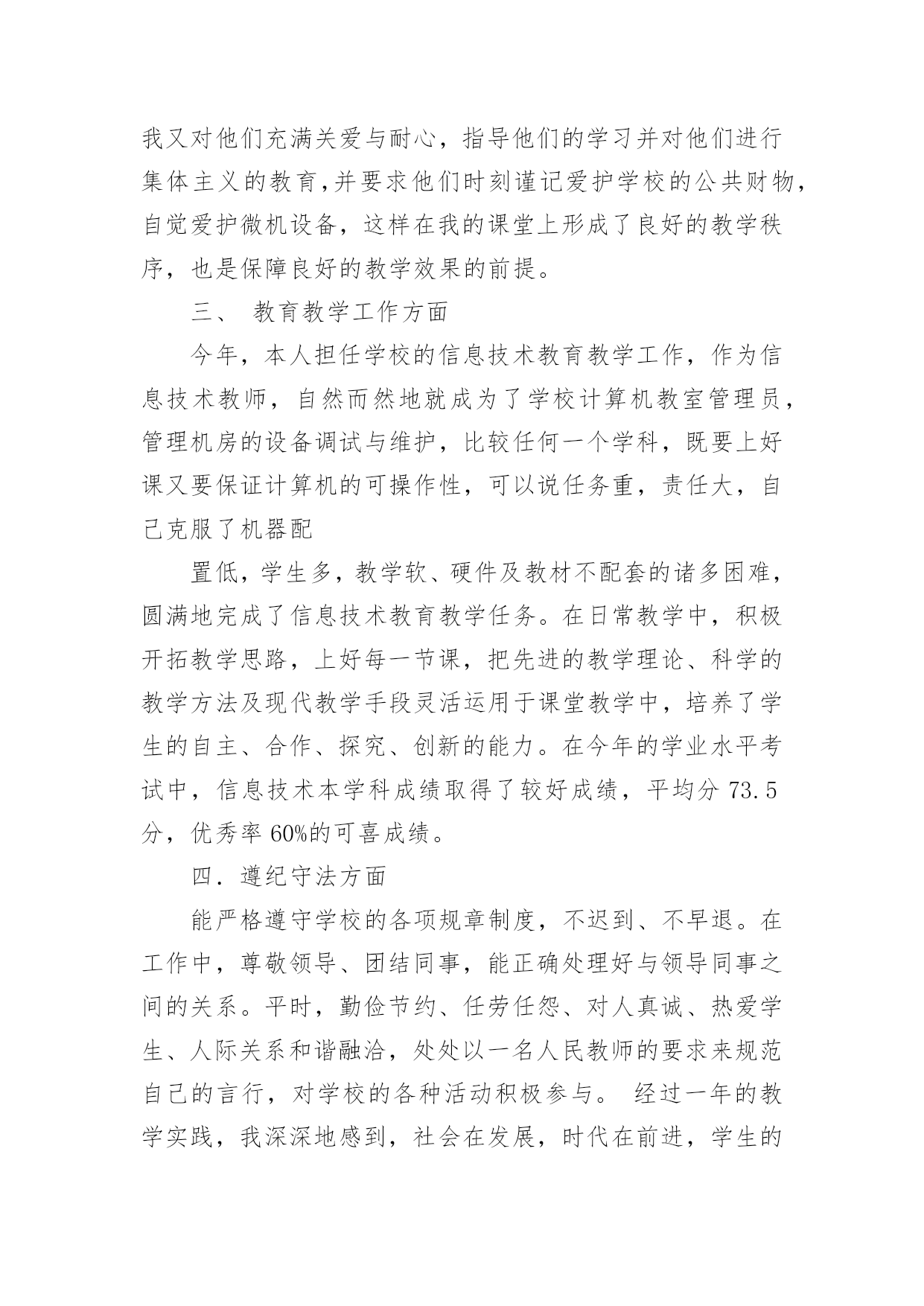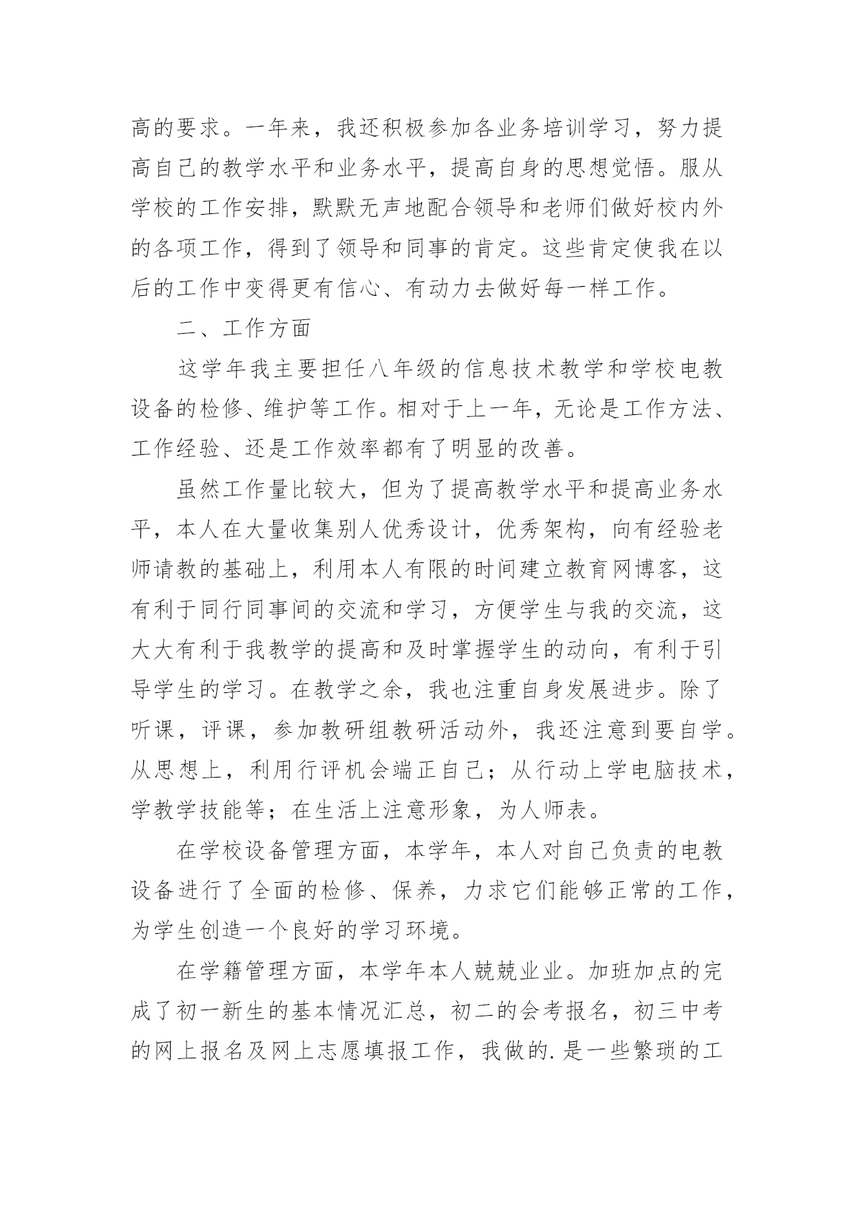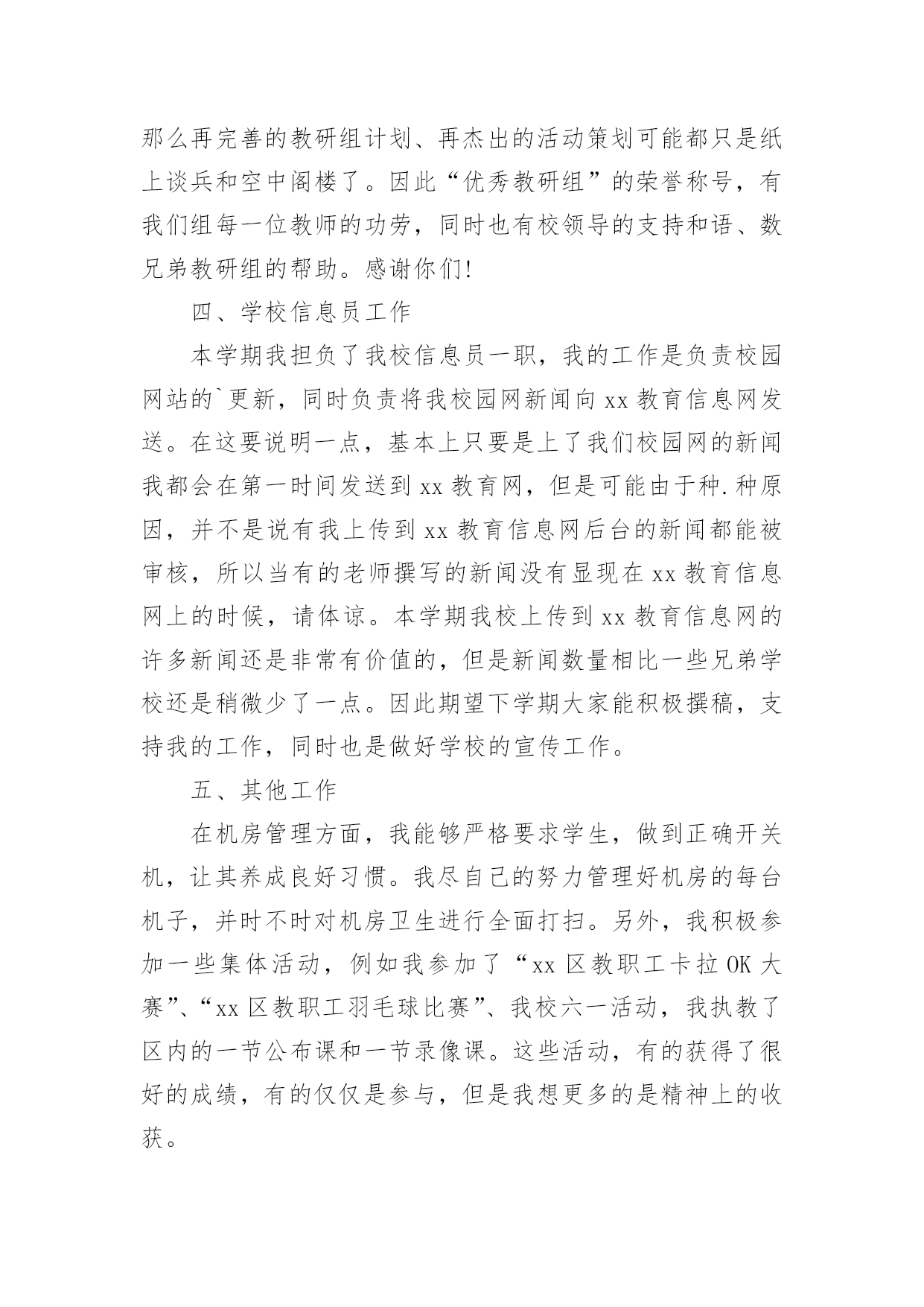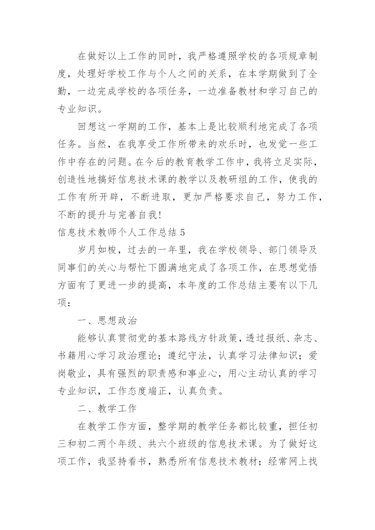 信息技术教师个人工作总结(必备)信息技术教师个人工作总结总结是事后对某一阶段的学习、工作或其完成情况加以回顾和分析的一种书面材料,它可以帮助我们总结以往思想,发扬成绩,让我们一起认真地写一份总结吧。总结怎么写才不会流于形式呢?下面是小编帮大家整理的信息技术教师个人工作总结,欢迎阅读,希望大家能够喜欢。信息技术教师个人工作总结1不知不觉中一个学年结束了,回顾这个学年所从事的信息技术教学工作,基本上是比较顺利地完成任务。当然在工作中我享受到收获喜悦,也在工作中发现一些存在的问题。我所享有的收获,我会用于下一年的工作中,我所碰到的问题我会认真思考,想办法解决。在这个学年中,本人能在保持原有良好工作态度的基础上,不断进步,不断进取,不断学习,虚心向有经验的老师学习。为了保持优良的工作姿态,以使下一学年能以更优秀的面貌去继续工作,现将本人该学期的工作情况进行全面的总结,总结如下:一、思想方面在这一年里,我在思想上严于律己,热爱教育事业,各方面约束自己,鞭策自己,对自己要求更为严格,力争在思想上、工作上在同事、学生的心目中树立良好的形象,使自己的思想再上一个新的台阶,同时也对自己思想上有了更加高的要求。一年来,我还积极参加各业务培训学习,努力提高自己的教学水平和业务水平,提高自身的思想觉悟。服从学校的工作安排,默默无声地配合领导和老师们做好校内外的各项工作,得到了领导和同事的肯定。这些肯定使我在以后的工作中变得更有信心、有动力去做好每一样工作。二、工作方面这学年我主要担任八年级的信息技术教学和学校电教设备的检修、维护等工作。相对于上一年,无论是工作方法、工作经验、还是工作效率都有了明显的改善。虽然工作量比较大,但为了提高教学水平和提高业务水平,本人在大量收集别人优秀设计,优秀架构,向有经验老师请教的基础上,利用本人有限的时间建立教育网博客,这有利于同行同事间的交流和学习,方便学生与我的交流,这大大有利于我教学的提高和及时掌握学生的动向,有利于引导学生的学习。在教学之余,我也注重自身发展进步。除了听课,评课,参加教研组教研活动外,我还注意到要自学。从思想上,利用行评机会端正自己;从行动上学电脑技术,学教学技能等;在生活上注意形象,为人师表。在学校设备管理方面,本学年,本人对自己负责的电教设备进行了全面的检修、保养,力求它们能够正常的工作,为学生创造一个良好的学习环境。在学籍管理方面,本学年本人兢兢业业。加班加点的完成了初一新生的基本情况汇总,初二的会考报名,初三中考的网上报名及网上志愿填报工作,我做的.是一些繁琐的工作,不求有功但求无过!三、考勤方面。我在做好各项教育教学工作的同时,严格遵守学校的各项规章制度。处理好学校工作与私人之间的关系,不迟到不早退,有时还会加班加点,这同时煅练了自己。对学校的工作尽职尽责,不论是学校分到的哪一项工作,我都配合同事尽自己的努力把工作做好。四、更新知识体系整学期的工作任务虽非常重,但不管怎样,作为一名信息技术老师,应具有比别人更超前的目光,及时掌握最新的科技资讯,明白到自身的责任,为此,我经常通过阅读《教育信息化》、《网络安全》、《新潮电子》等书籍,上网浏览新课程教学网等形式,学习更加多的、好的、新的知识。同时还争取机会多出外听课,从中学习别人的长处,领悟其中的教学艺术。平时还虚心请教有经验的老师。总括这一年,本人能在自己的工作岗位上尽职尽责,敬业爱岗,不断进取,不断进步,遵纪守法。展望下一学年,我会在保持原有优良作风的基础上不断发展,我一定要发扬优点,改正不足,扬长避短,争取更大的成绩。信息技术教师个人工作总结2在学校领导的关怀支持下,我在这一年立足实际、搞好教学,并且不断更新学问、提高自身素养。现将这个学年工作总结如下:一、立足实际、搞好教学我校的同学在信息技术方面的状况比较特别,由于拥有一些转同学,与其它学科不同的是这些转同学之前从没有学过信息技术,在这方面是个空白,甚至不明白鼠标的用法,不明白开关机的方法,而其他的同学呢?已经会在网上邻居查找嬉戏,明白怎样将一个文件夹共享、隐蔽、给共享加访问权限,有的时候老师都拿他没有方法。怎样让一个从未接触过信息技术学问的同学,娴熟地把握最基本的学问,我进行了“分层教学”的模式,并加强个别辅导、实现同学间一帮一、多帮一,基本解决了常规教学中难以攻克的难题。二、立足教学、搞好教研组工作在教务处的要求与指导下,这个学期的工作是非常正常的,每个月都有工作小结,集中学习的时间、地点,资料落实,并有记载,每月至少有一次专题性理论学习,资料针对强。三、加强学习,提高业务水平我平常注意自己的'文化、业务学习,能攻记一本教学理论书,泛读两种以上杂志,撰写必需质量、教学论文,卡片摘记每月十张以上。任何教学活动总离不开理论与实践相结合这条主线,信息技术更20xx是如此。在学校领